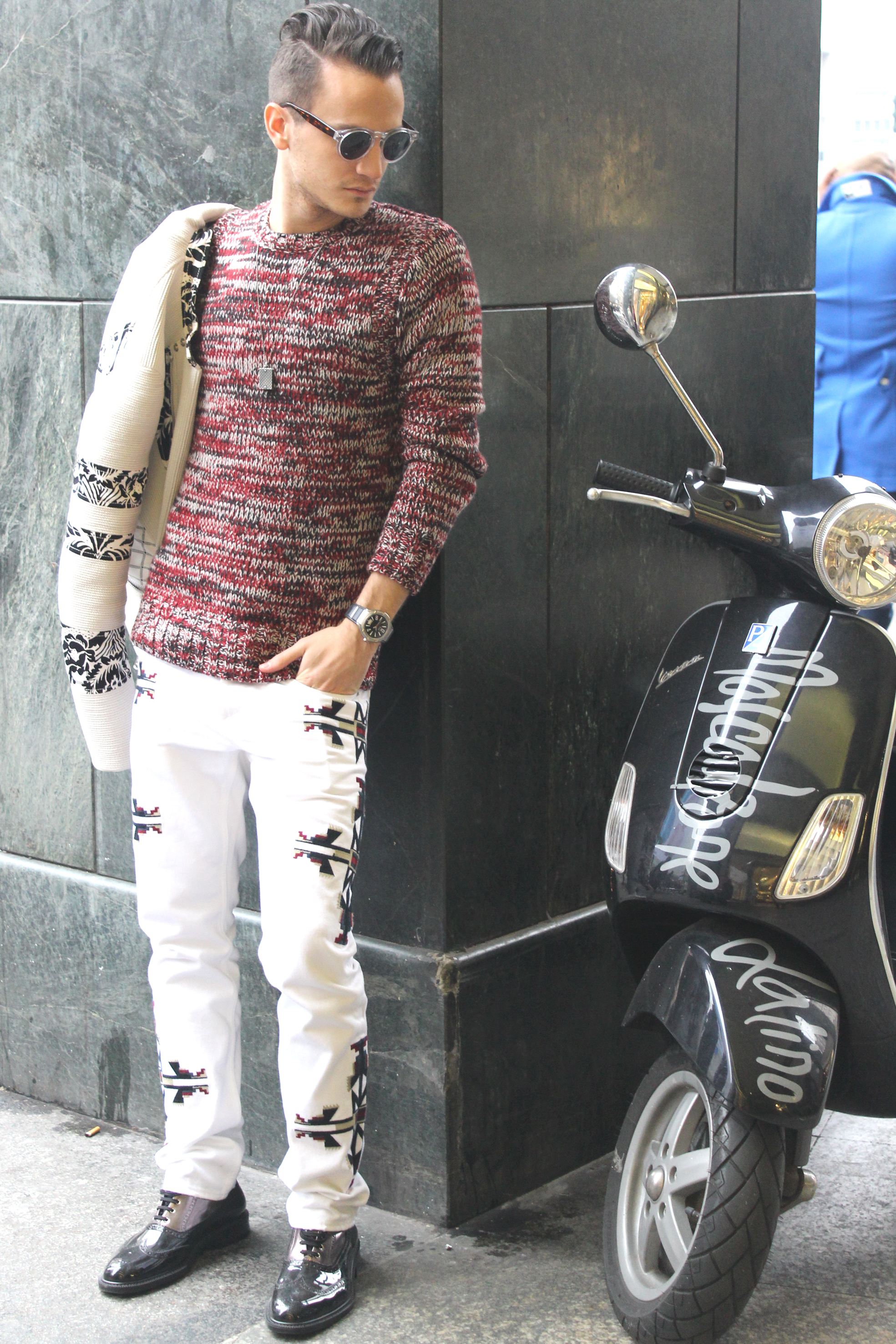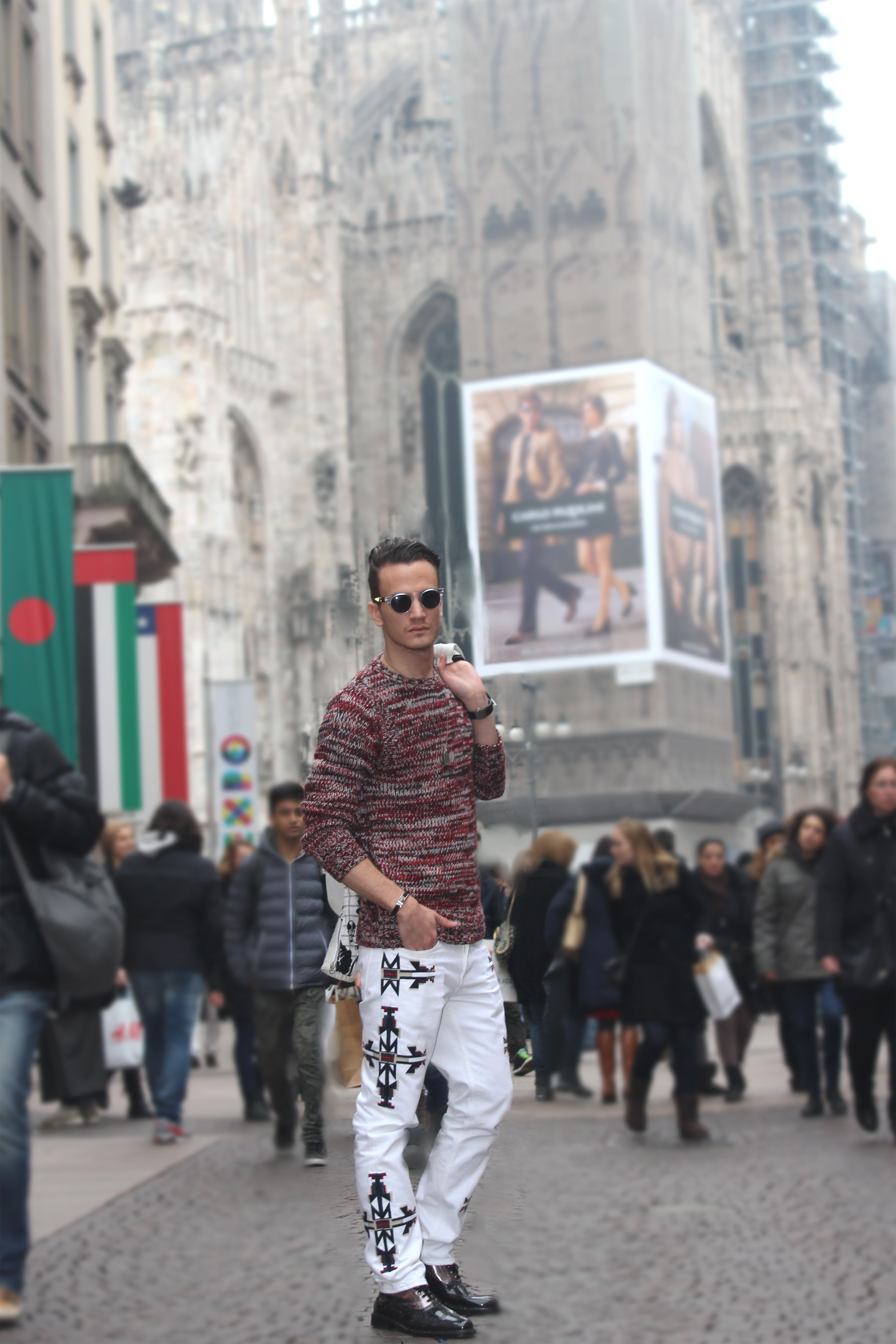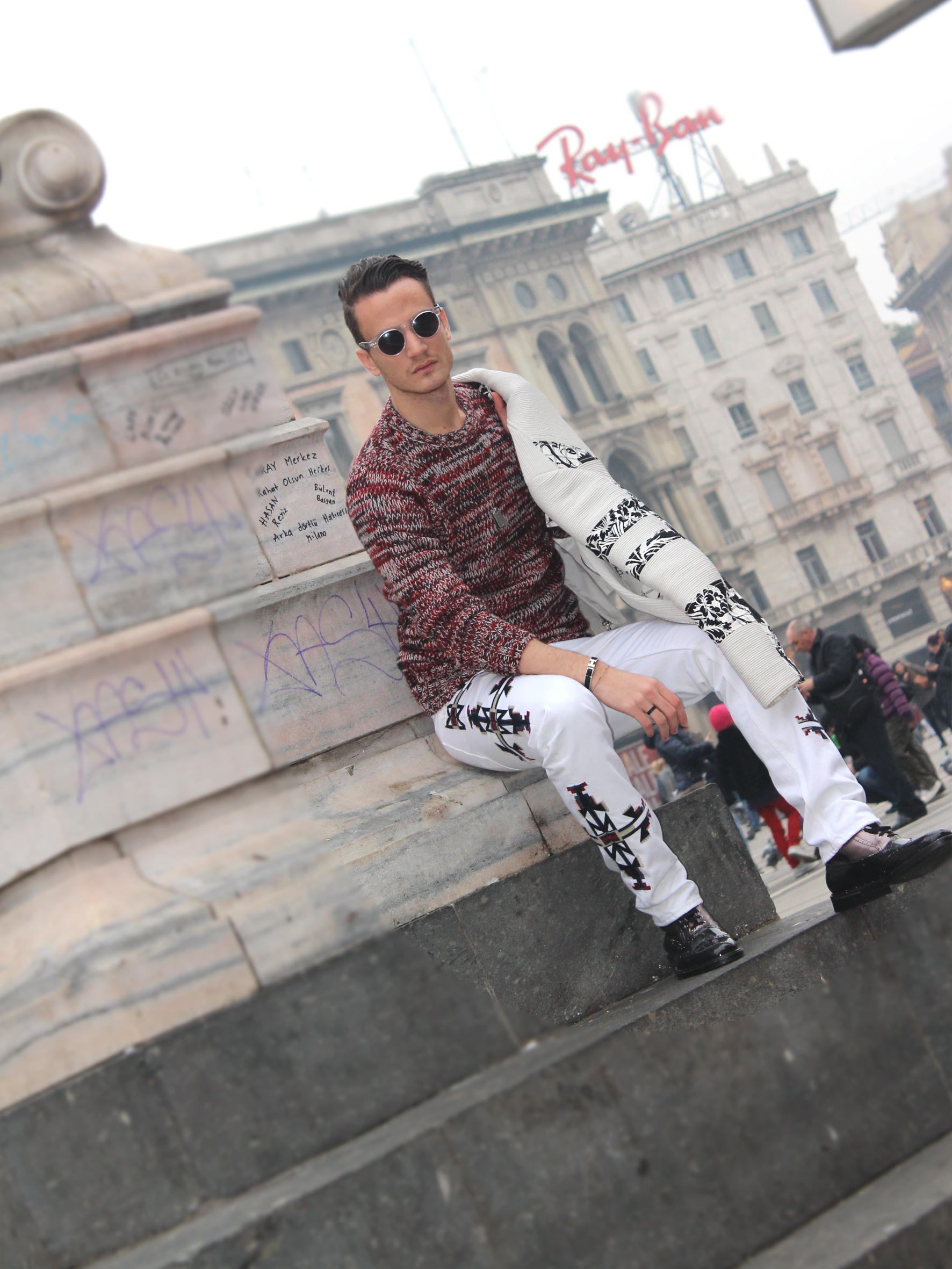 I wanted to fight againt winter by wearing light colors, therefore I went for this pinkish wool sweater by H&M which I paired with the very cool Isabel Marant x H&M white patterned jeans. The look was completed with my favorite floral print biker jacket by 3.1 Phillip Lim (more about this designer soon in the Designer Focus section), my brogue boots by Vivienne Westwood and the Illesteva Leonard Clear shades.