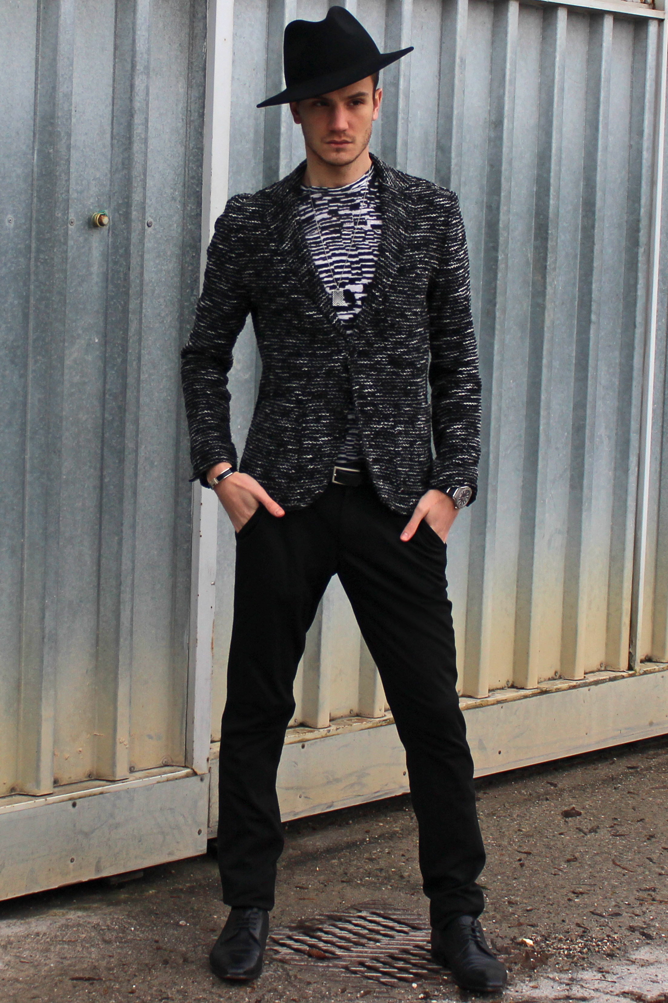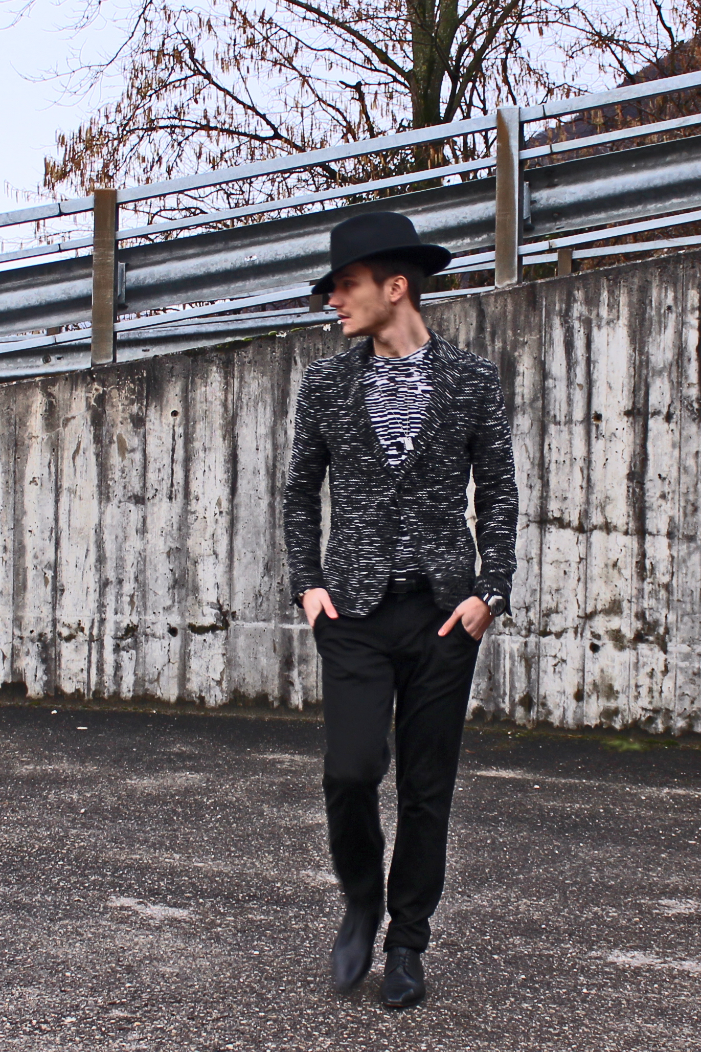 I went for black and white which is always the best way to create a simple elegant look. The sophistication comes from the juxtaposition of print on print , from the t shirt and the blazer. I went back to some pointy Hugo Boss shoes (and matching belt) that I had not worn for a while, but which I felt completed the look well.