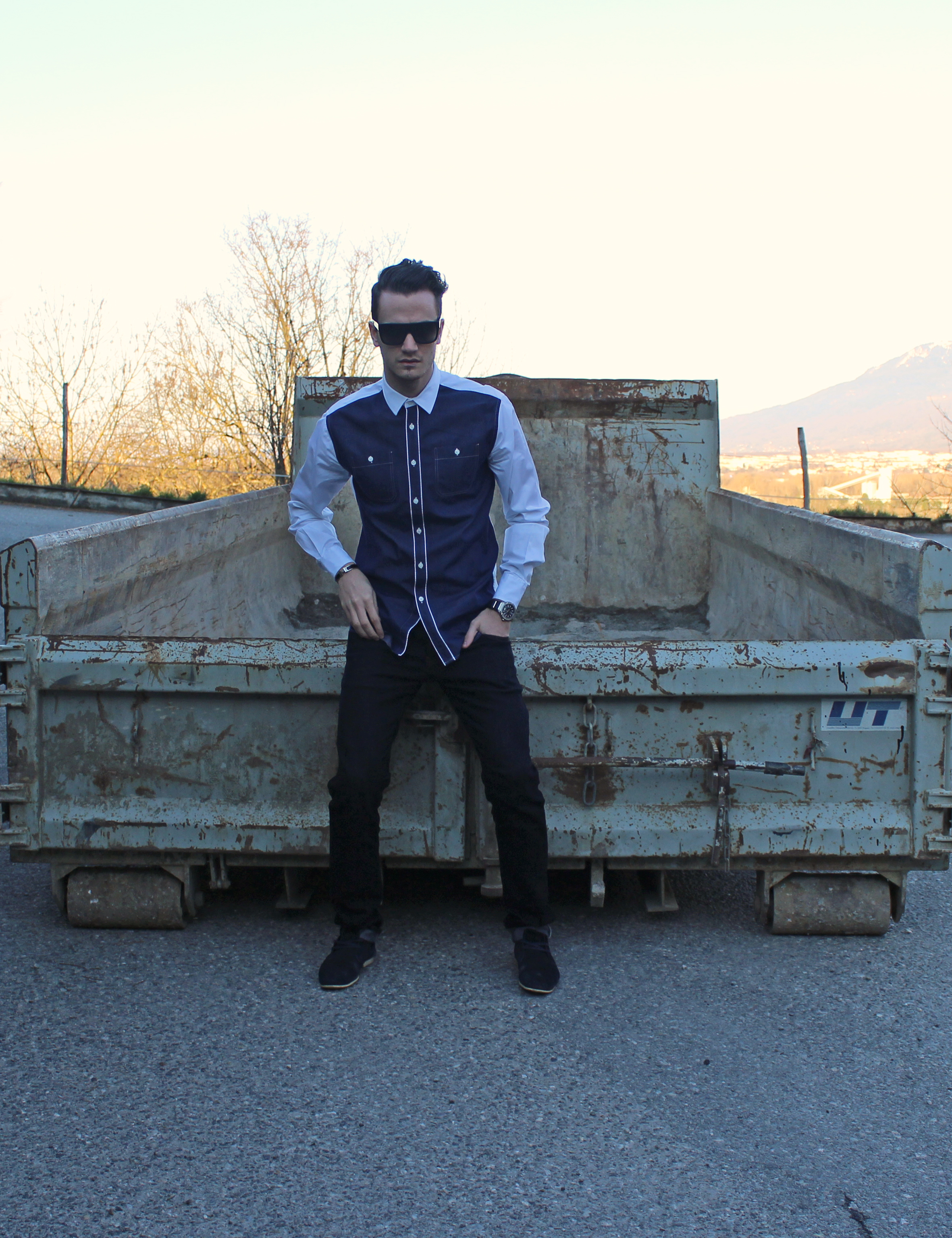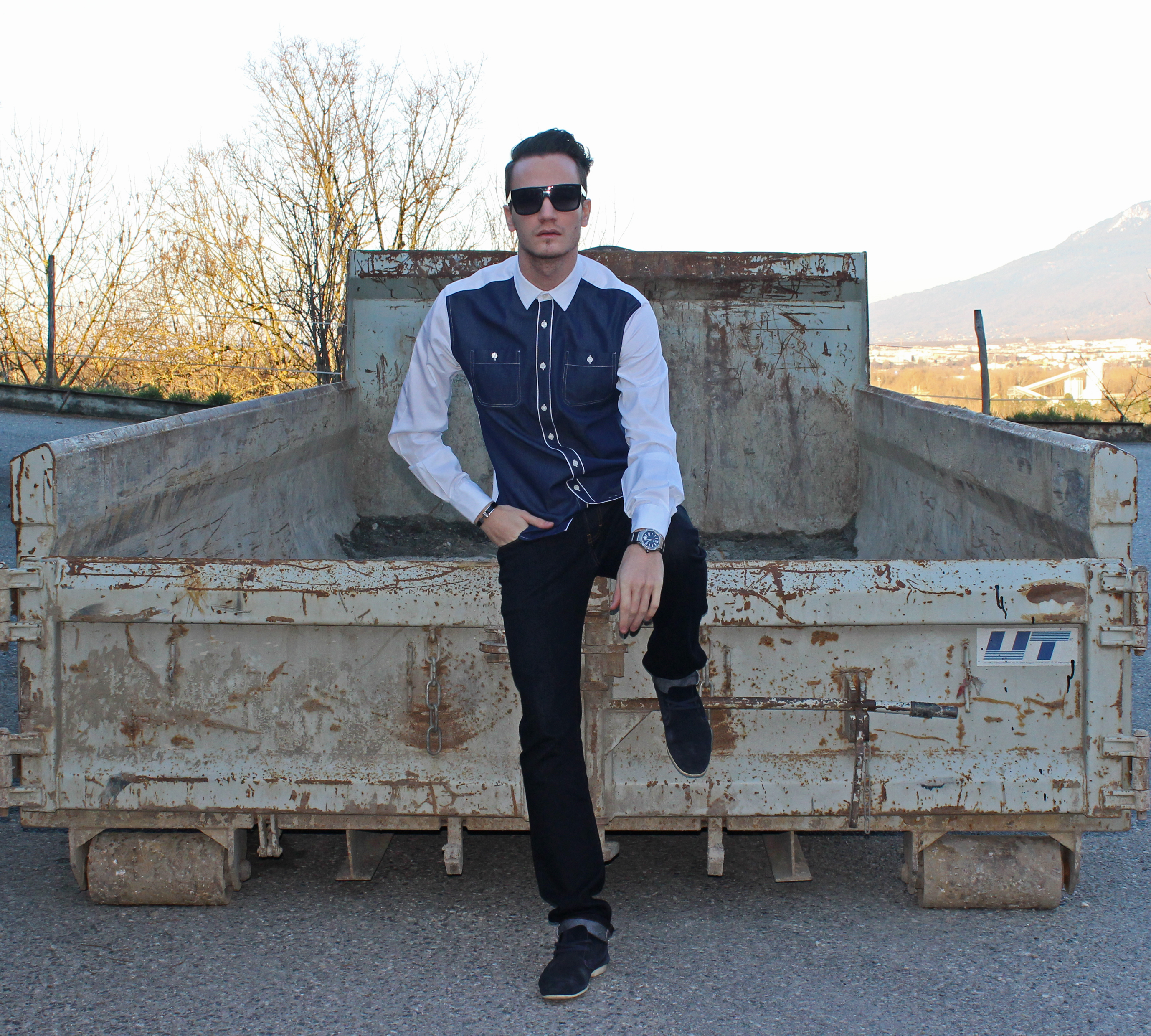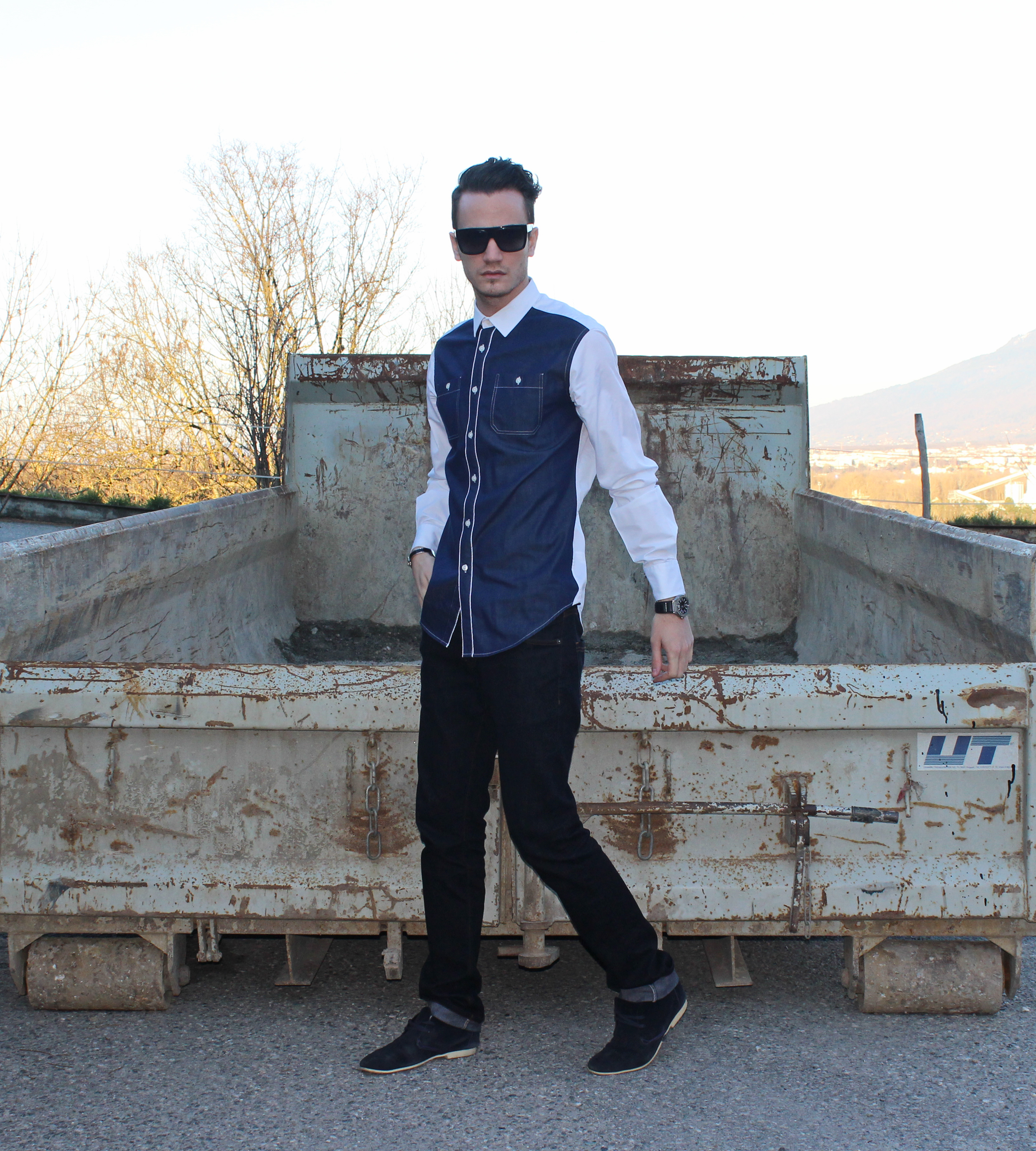 This look is laid back and casual yet sophisticated enough thanks to the faux-jeans shirt (Zara) paired with my favorite Galliano jeans, and Hugo Boss boots.