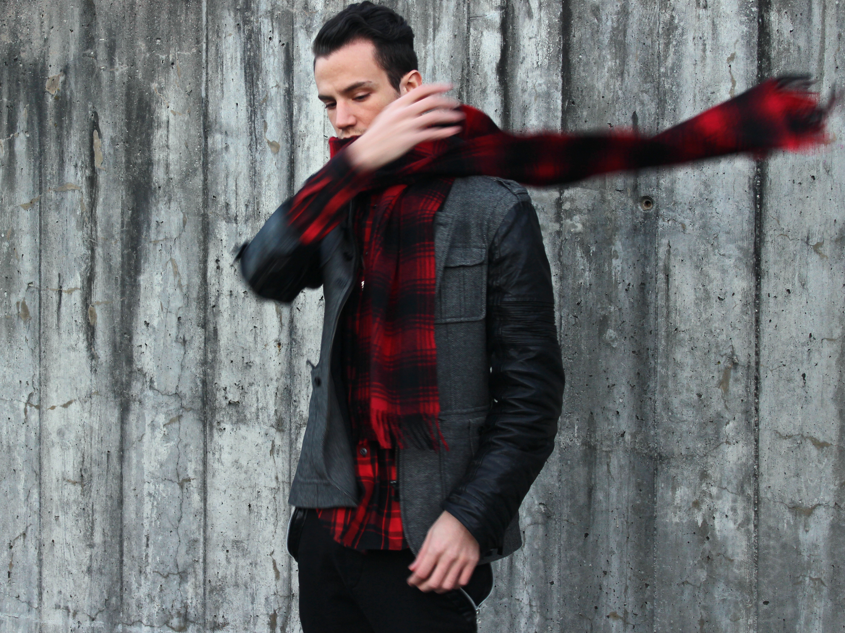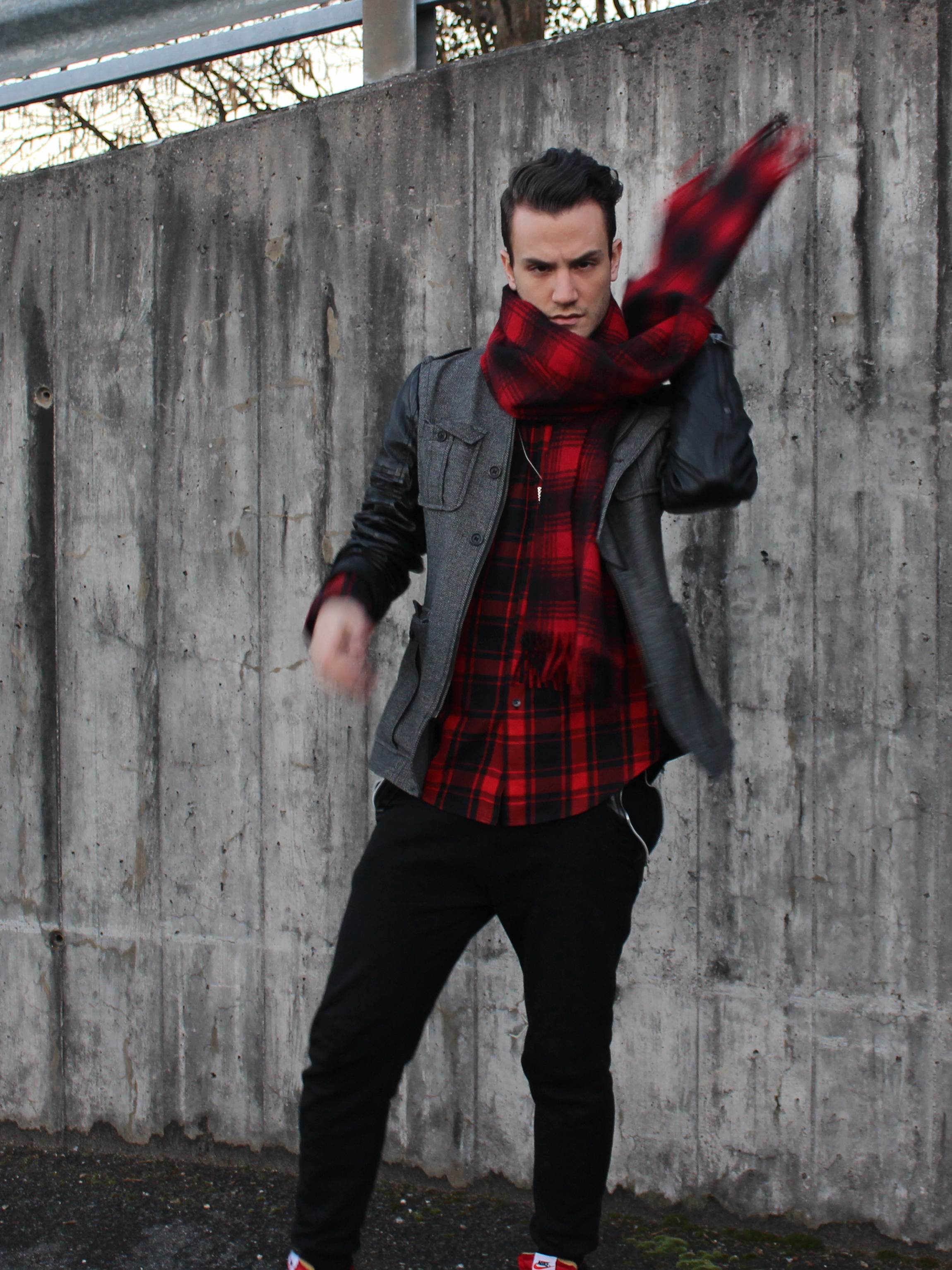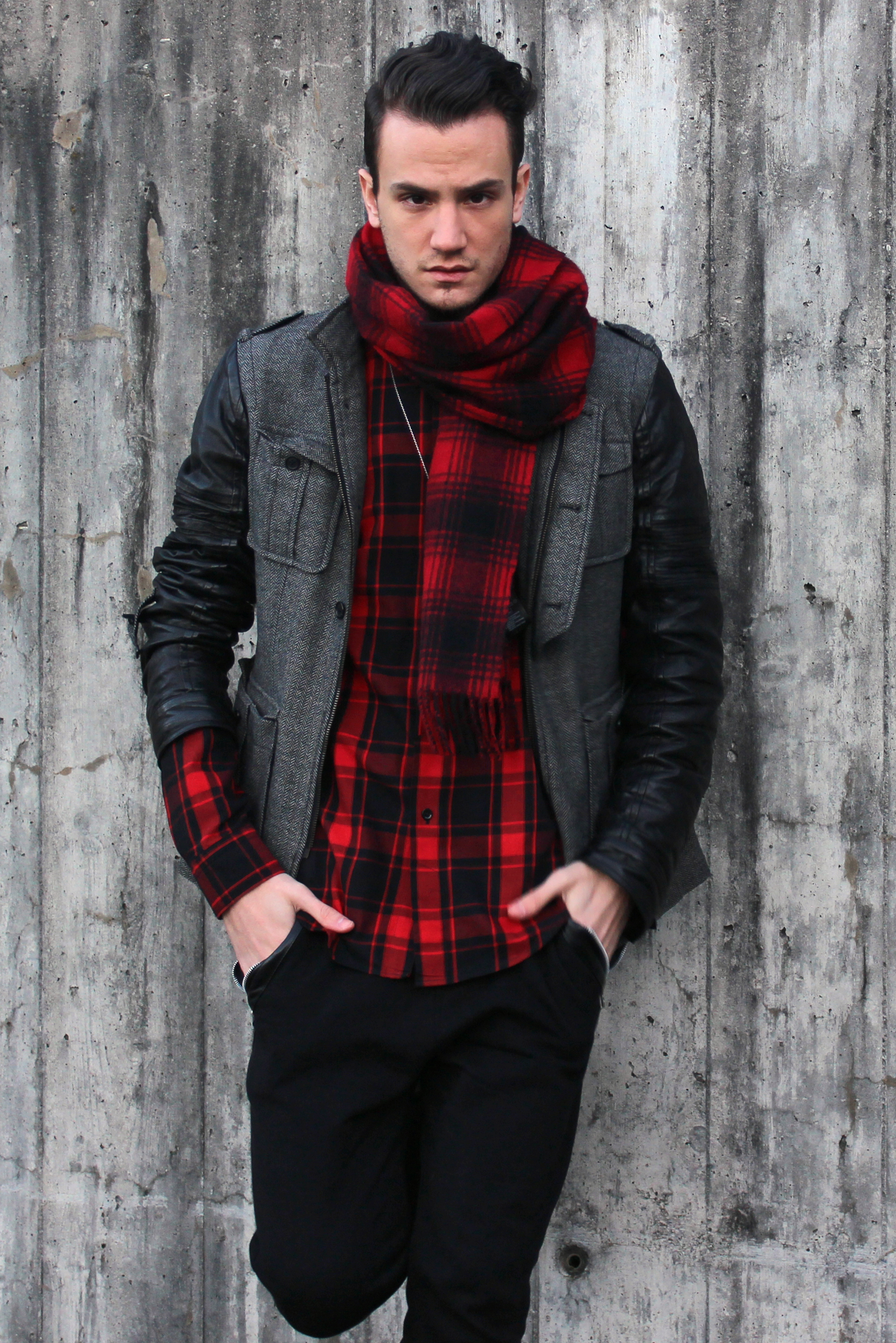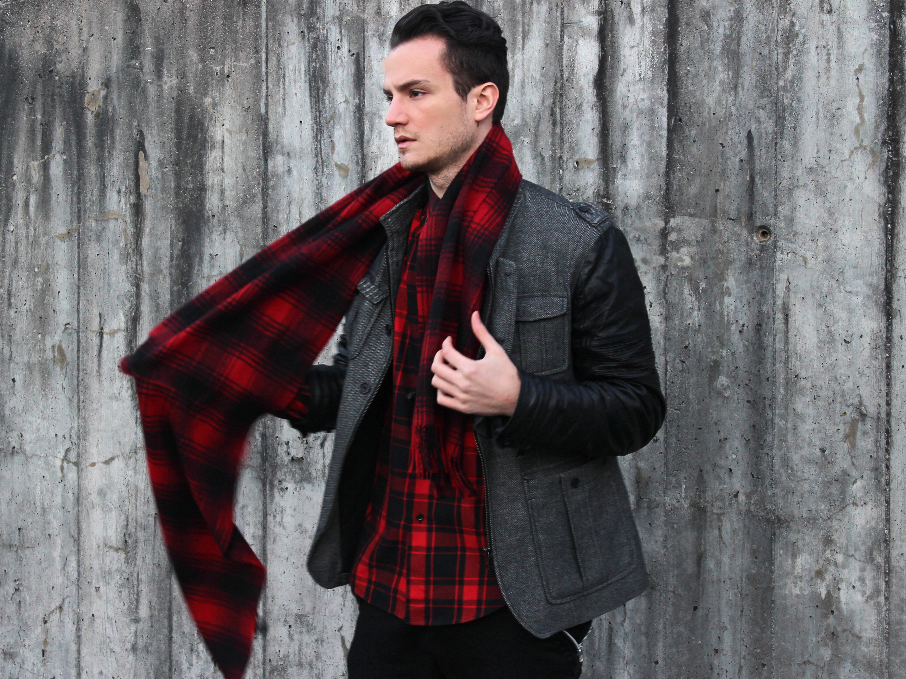 Adding a little bit more attitude I completed the look with ths amazing leather-sleeved jacket from italian brand Gazzarrini and repeated the tartan motif with a scarf.
