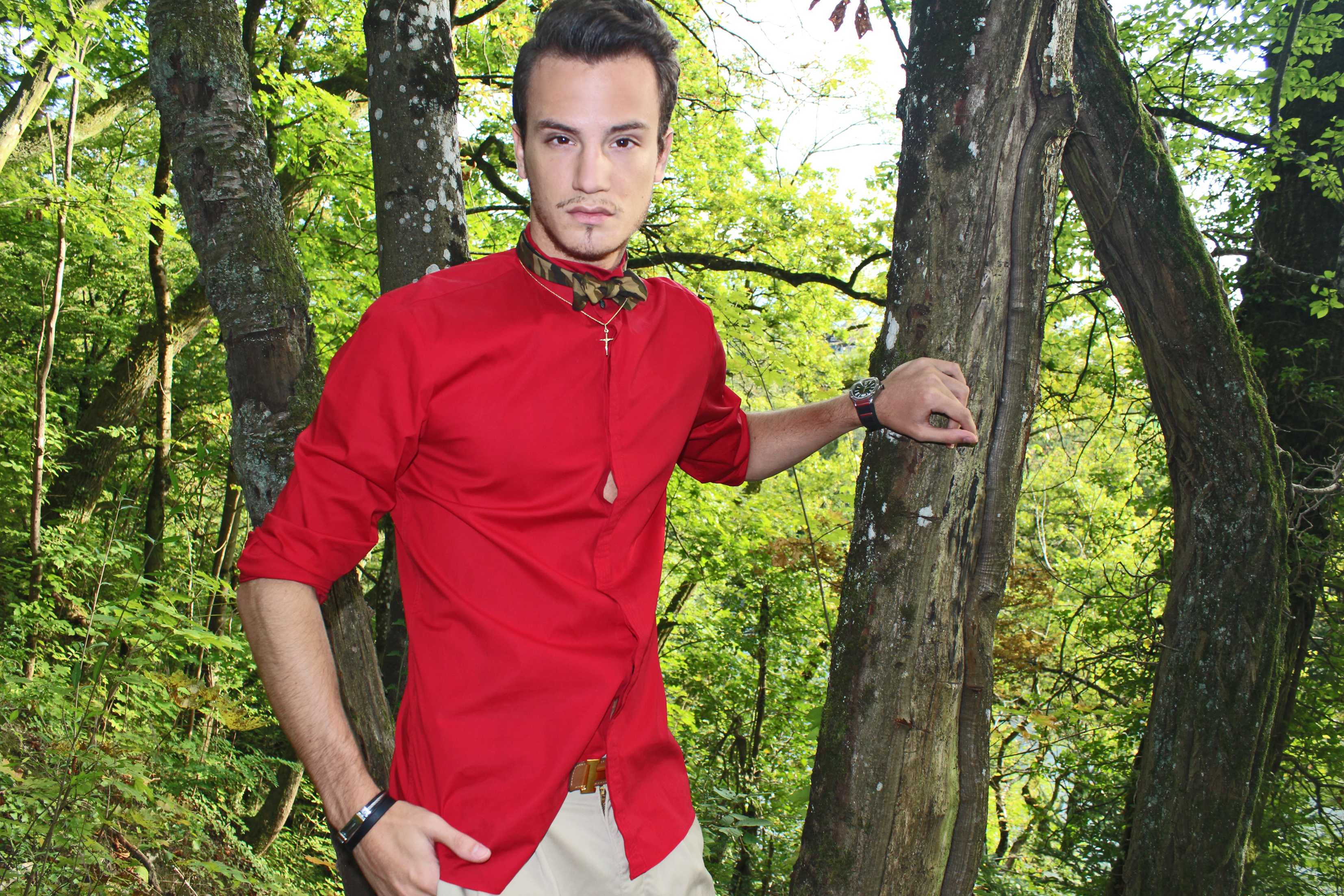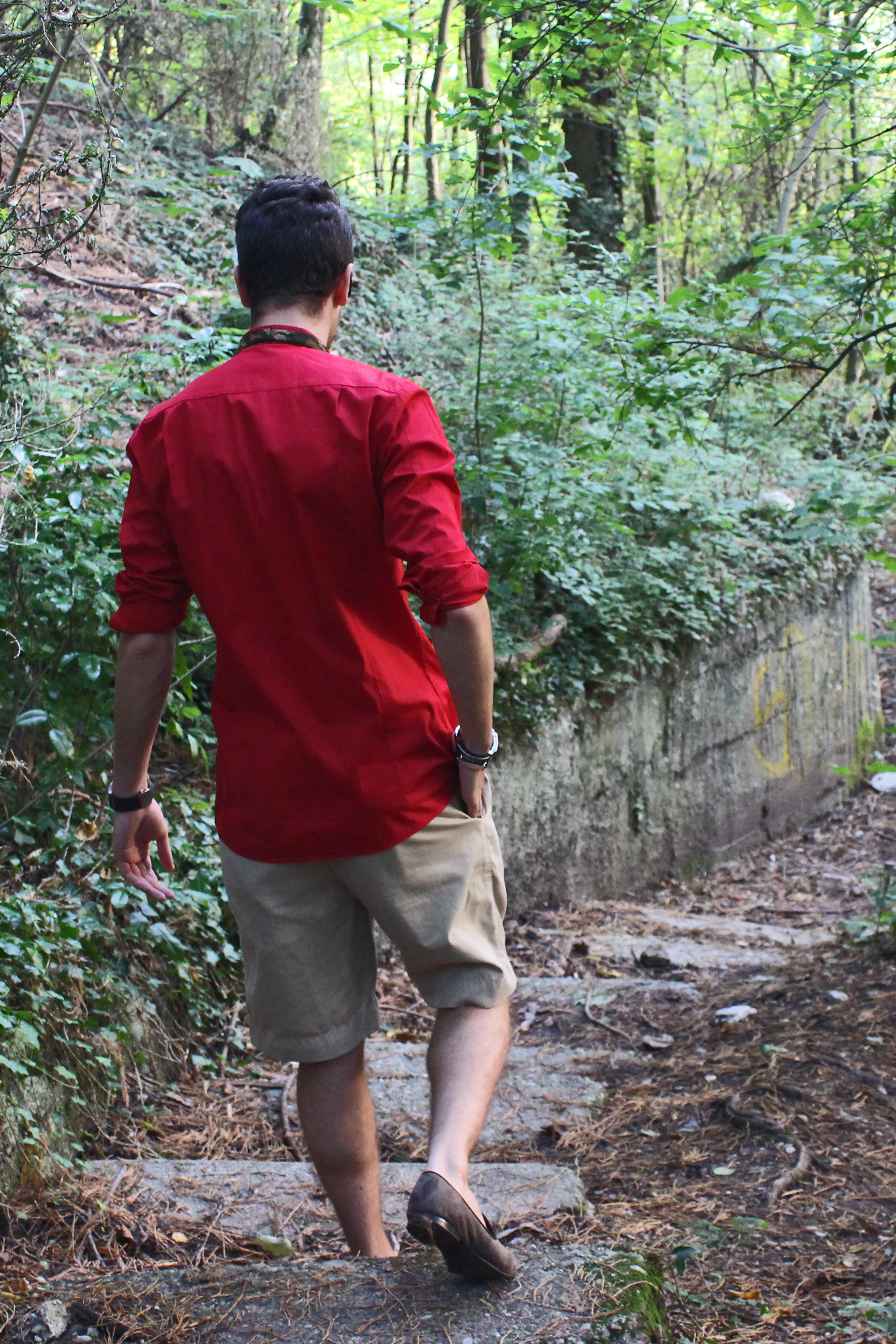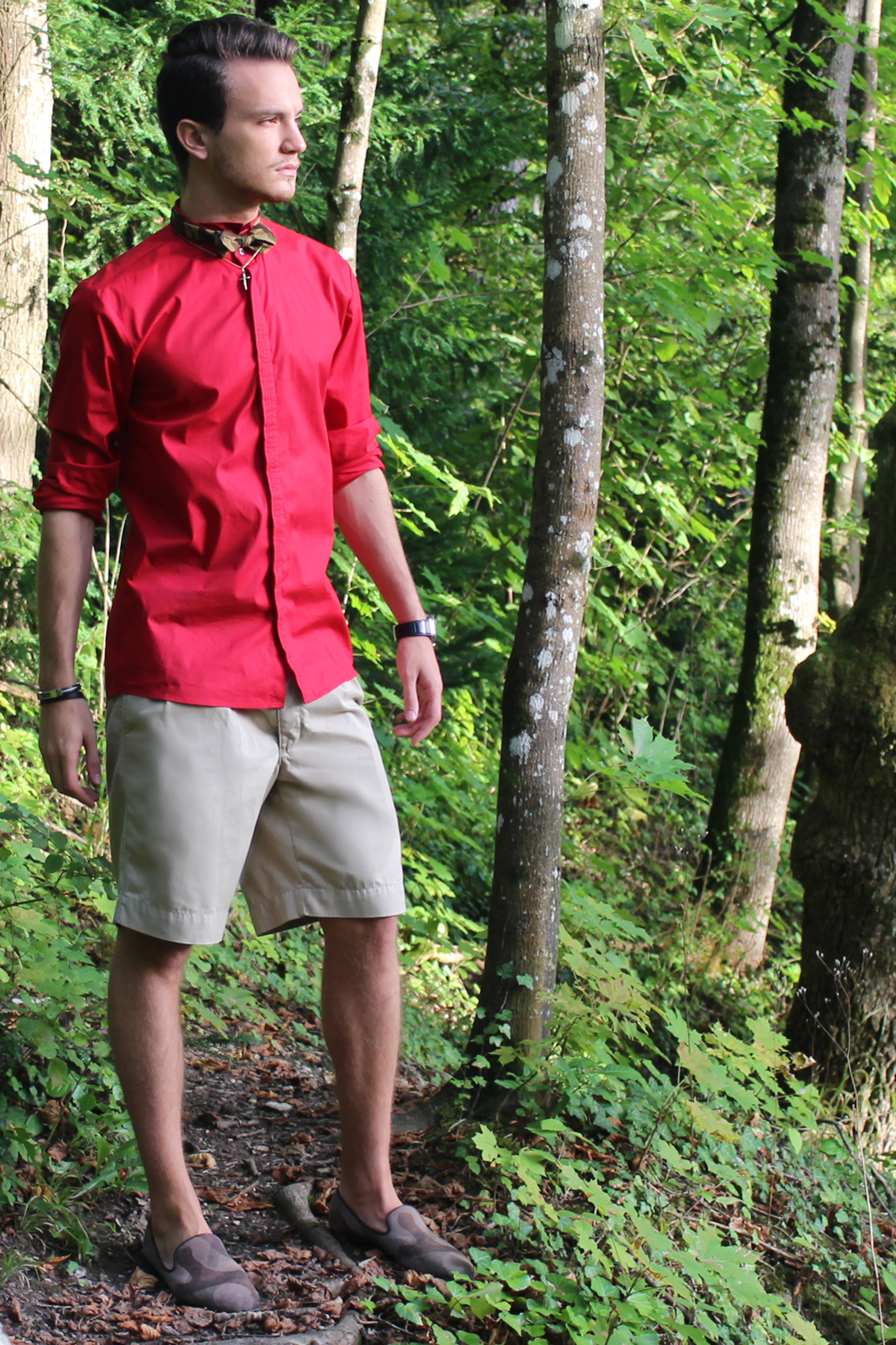 It was a beautiful summer day, the beginning of summer when the weather starts to be really great but not suffocating. I felt like wearing shorts but you know me, I always feel the need to add a sophisticated touch to my outfits. I went for this bright red Hugo by Hugo Boss shorts, and a matching camo combo, with this Beams Plus bow tie and Giuseppe Zanotti loafers.
