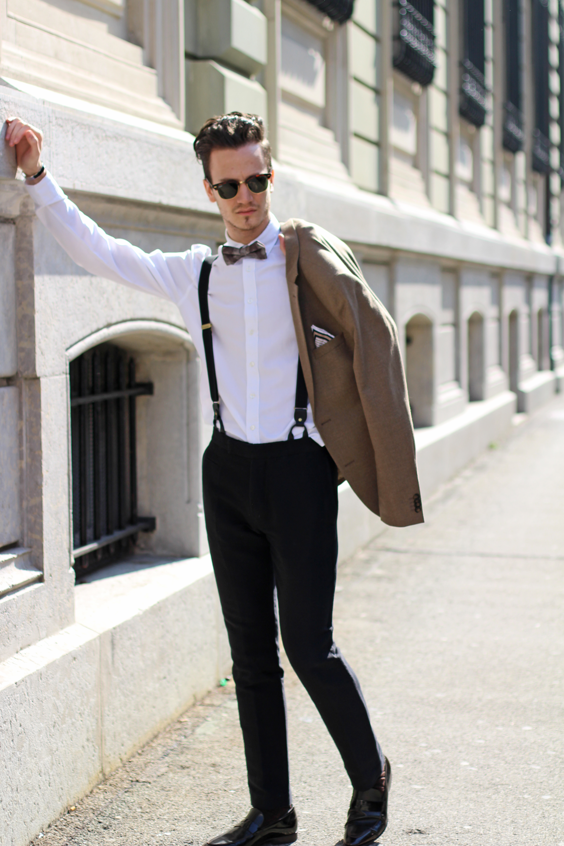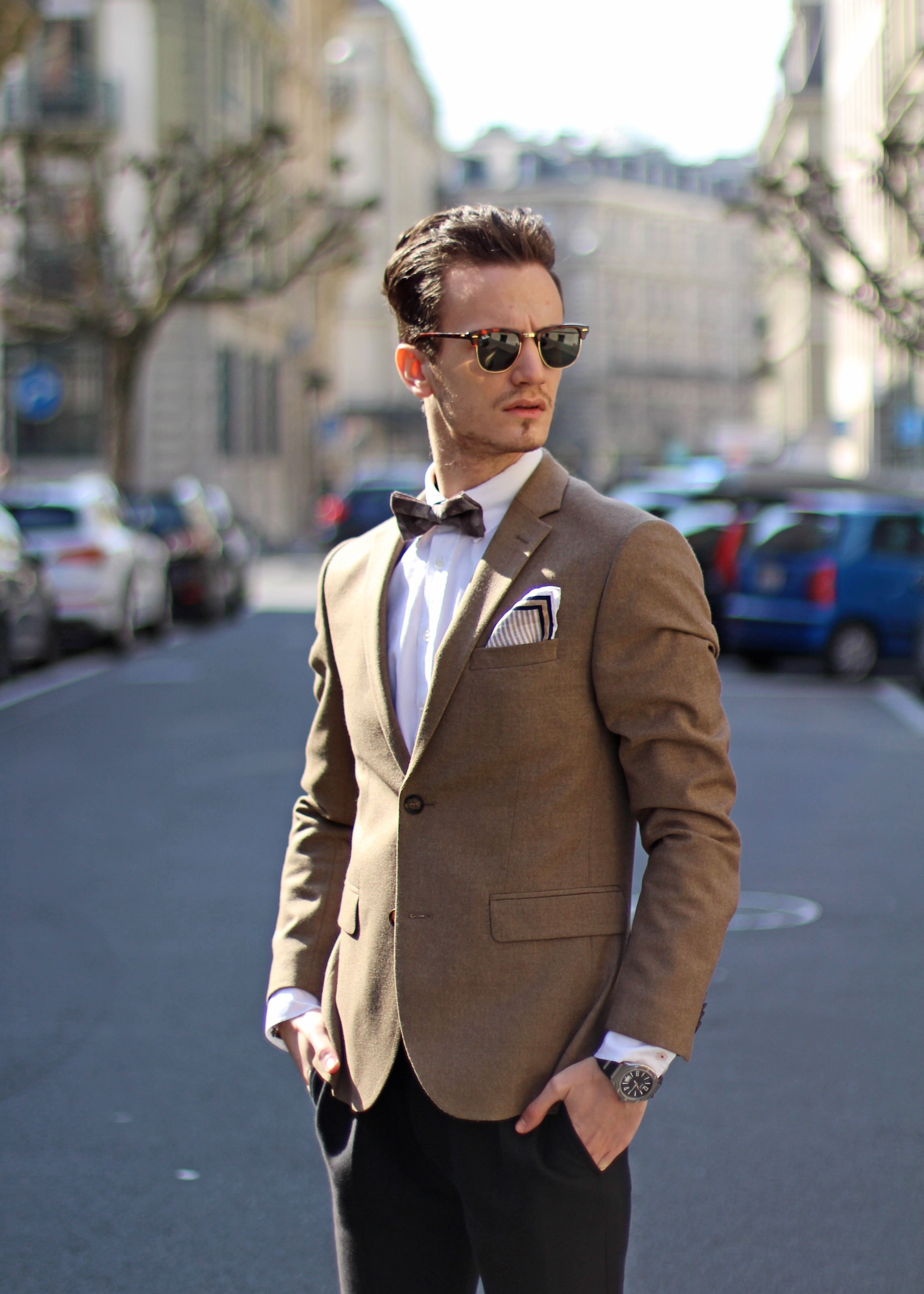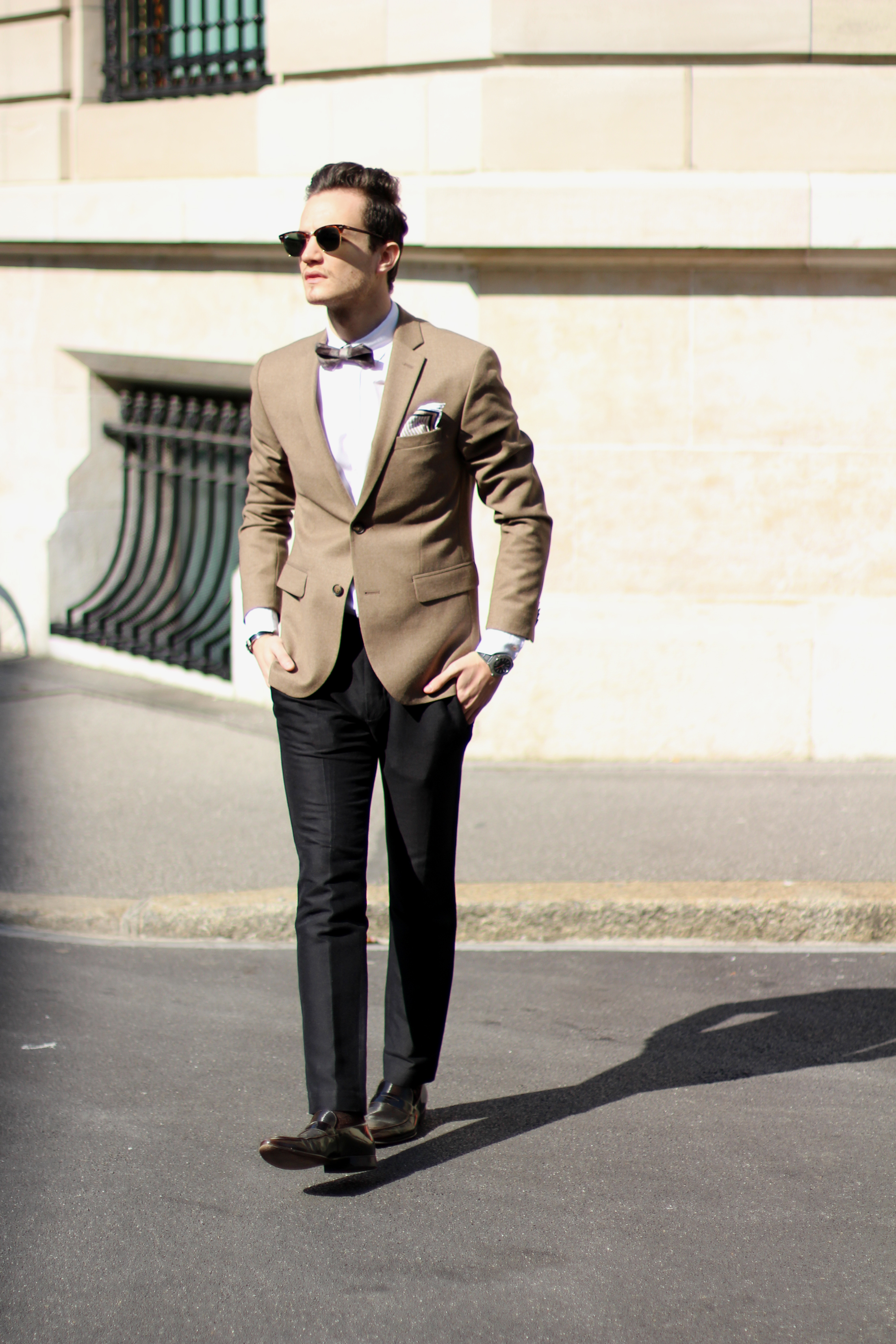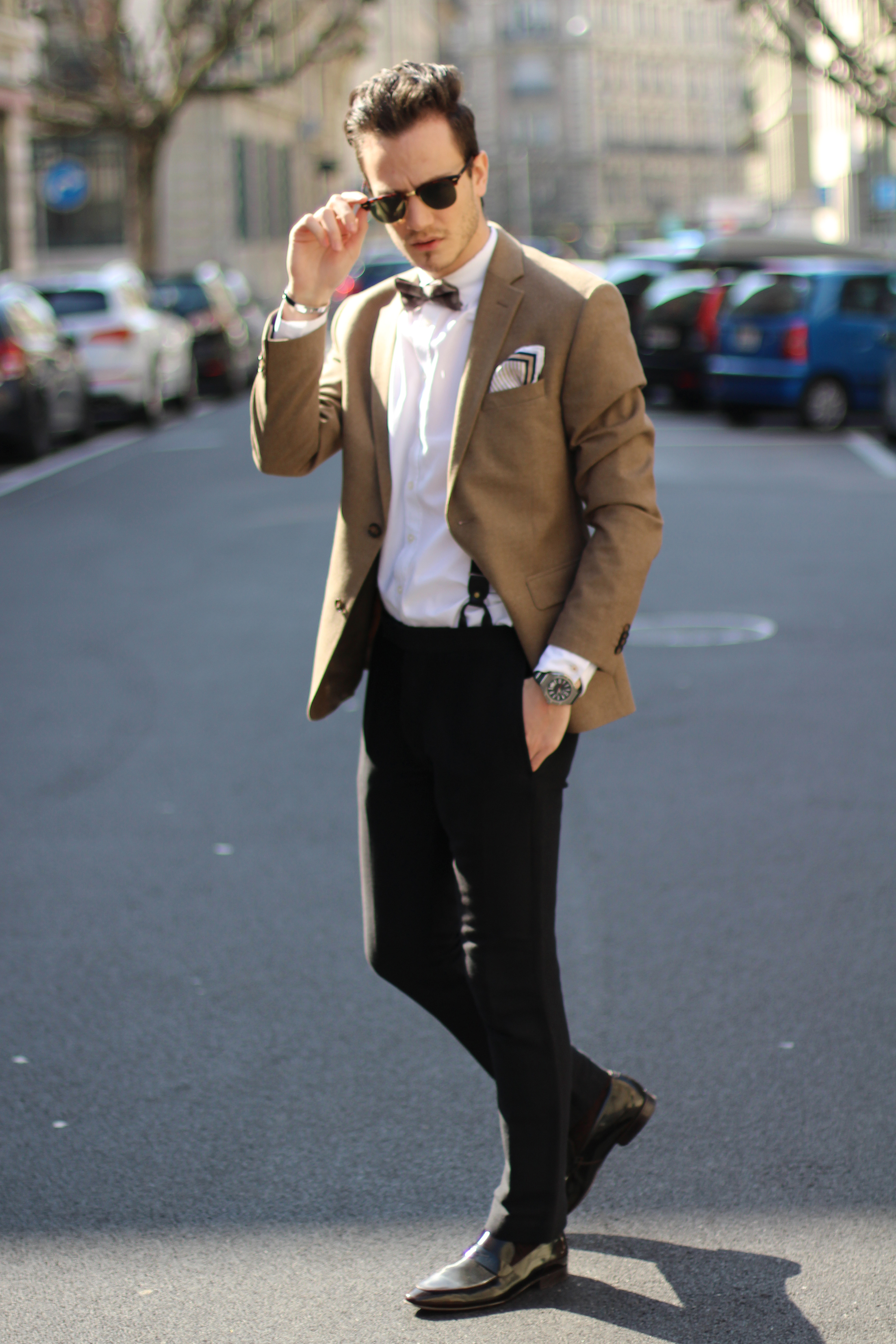 The look is also a lot about mix & matching, as (believe it or not) the jacket, bow, trousers and suspenders all simply come from H&M. I underestimated the store for a long time but have recently developped a new-found respect for some of their pieces. Indeed this jacket’s wool fabric is of pretty good quality, well-cut, and I really liked the color. In addition to the Burberry Brit classic oxford shirt and Massimo Dutti pocketsquare, I finished the look with a pair of Ray Ban’s turtoise clubmaster, which has been my favorite model for years, even when the huge Wayfarer storm hit and everybody was wearing them.