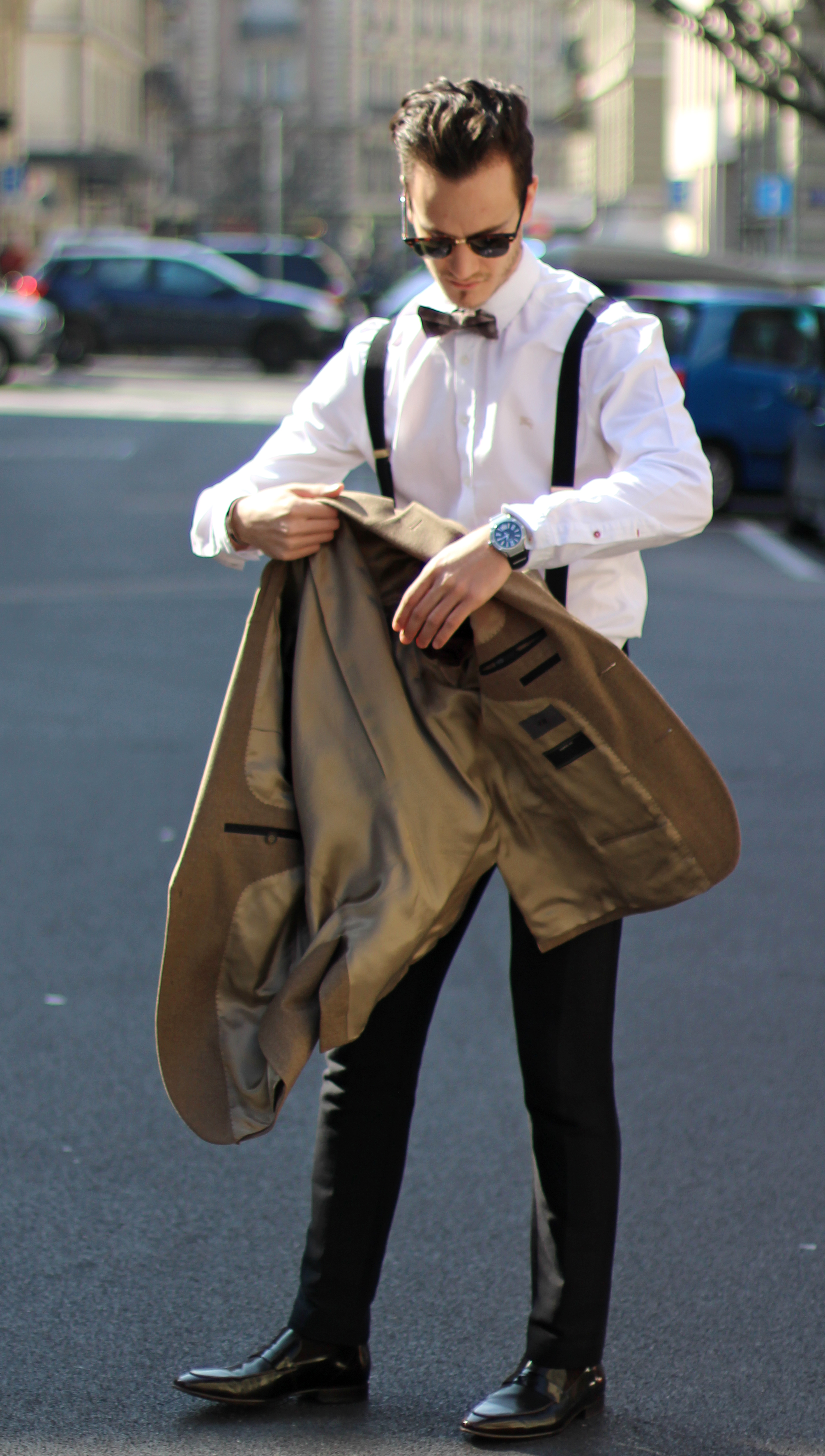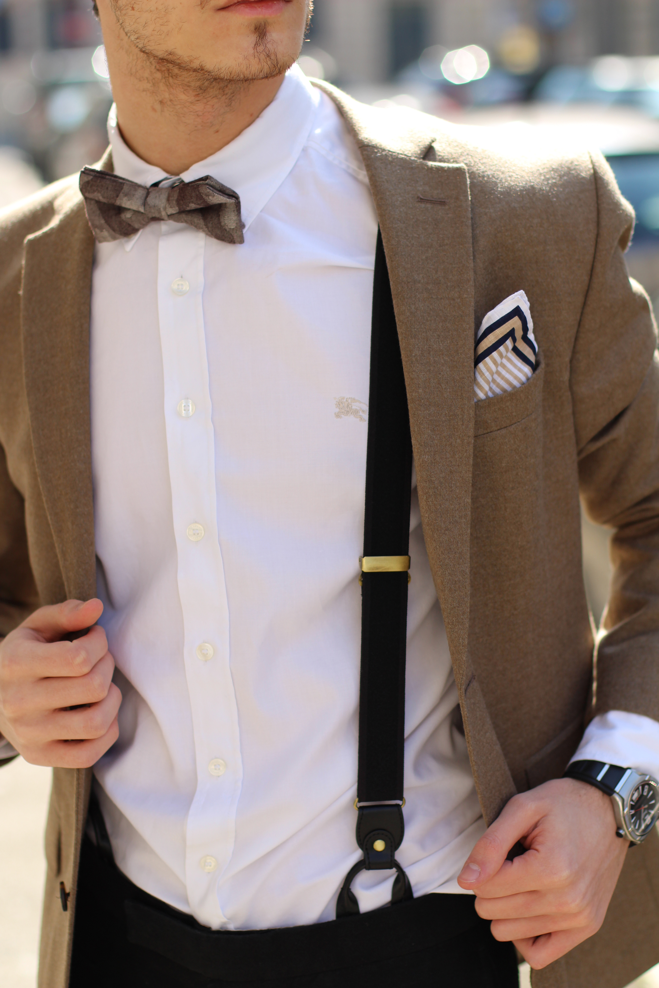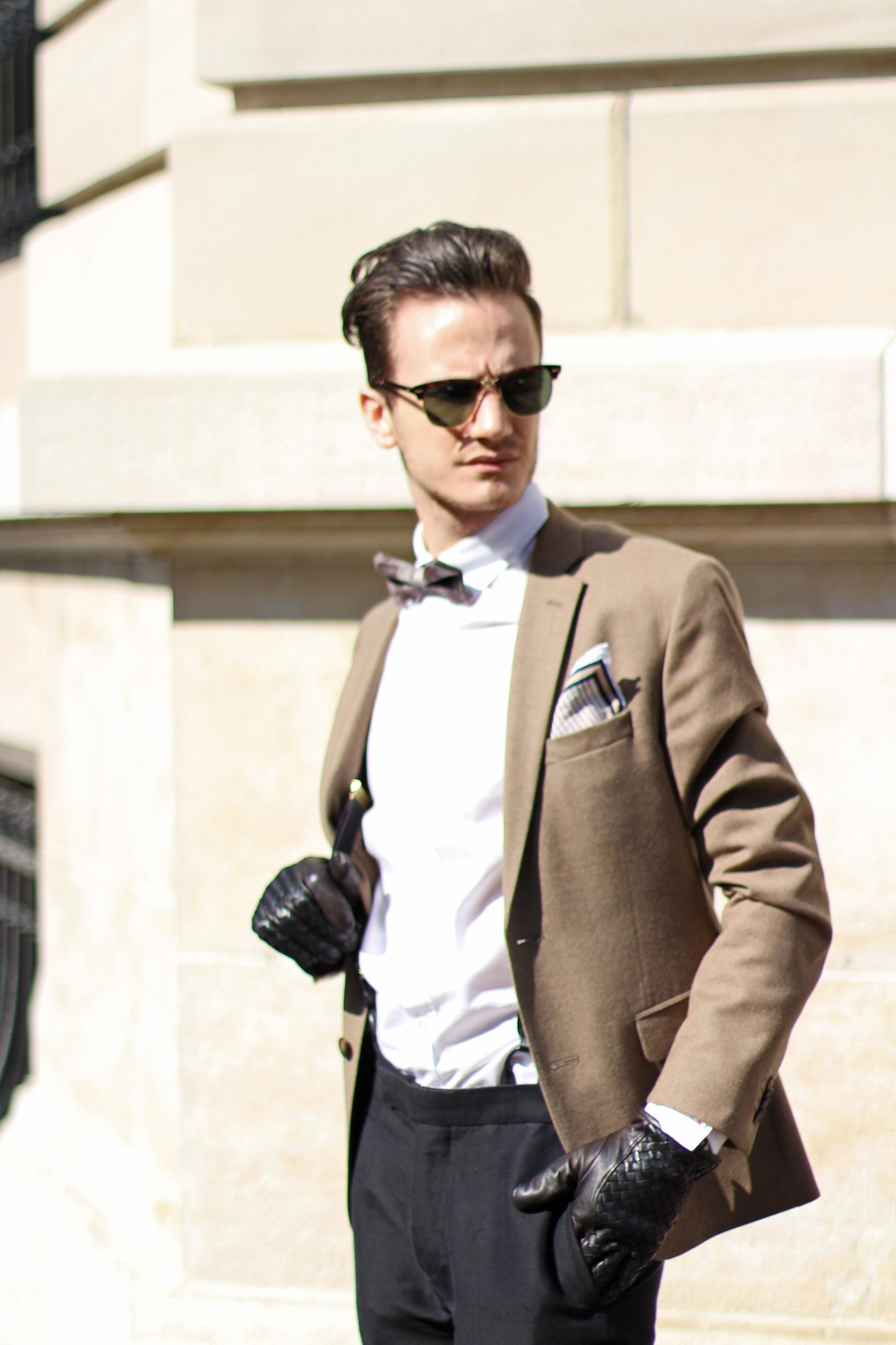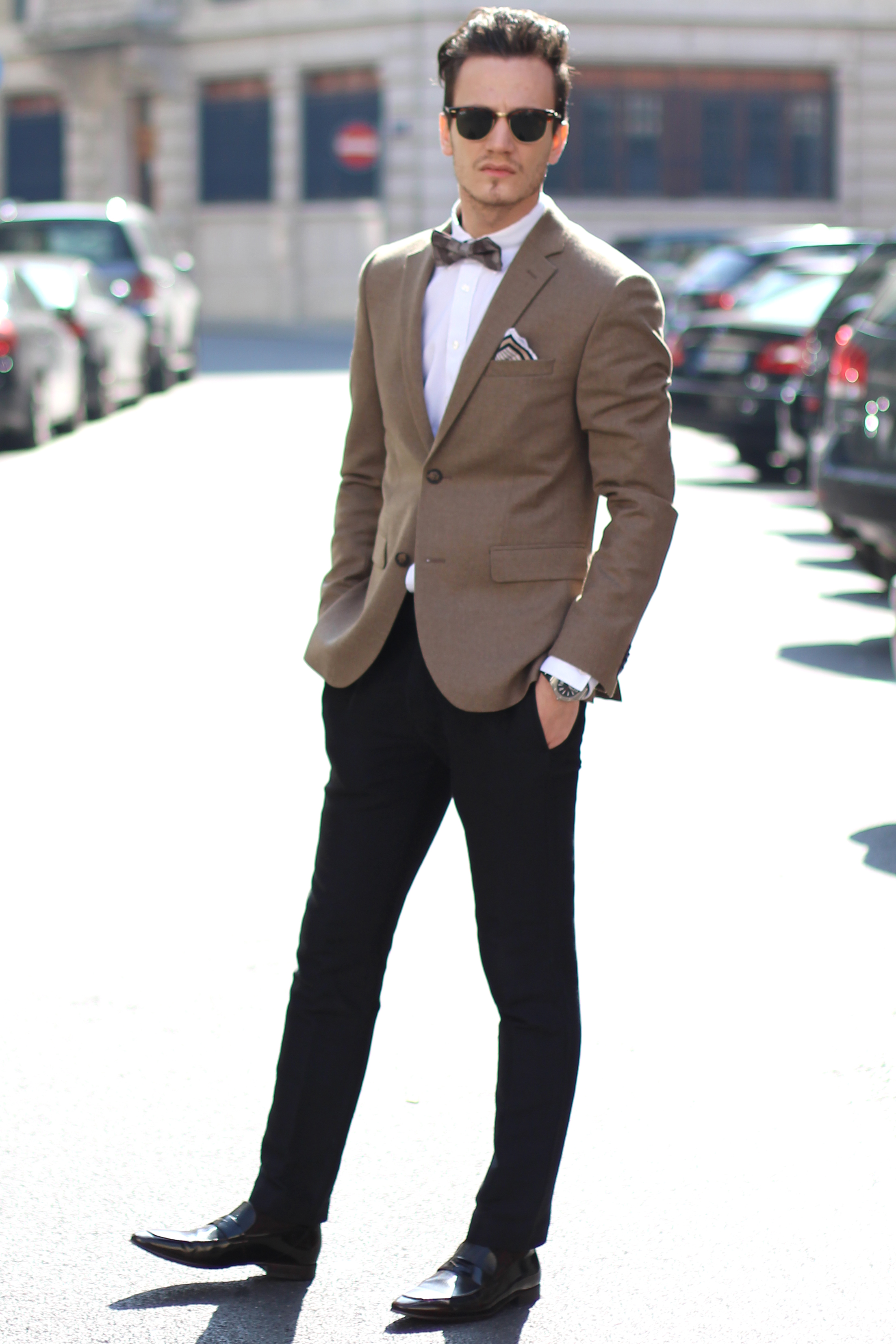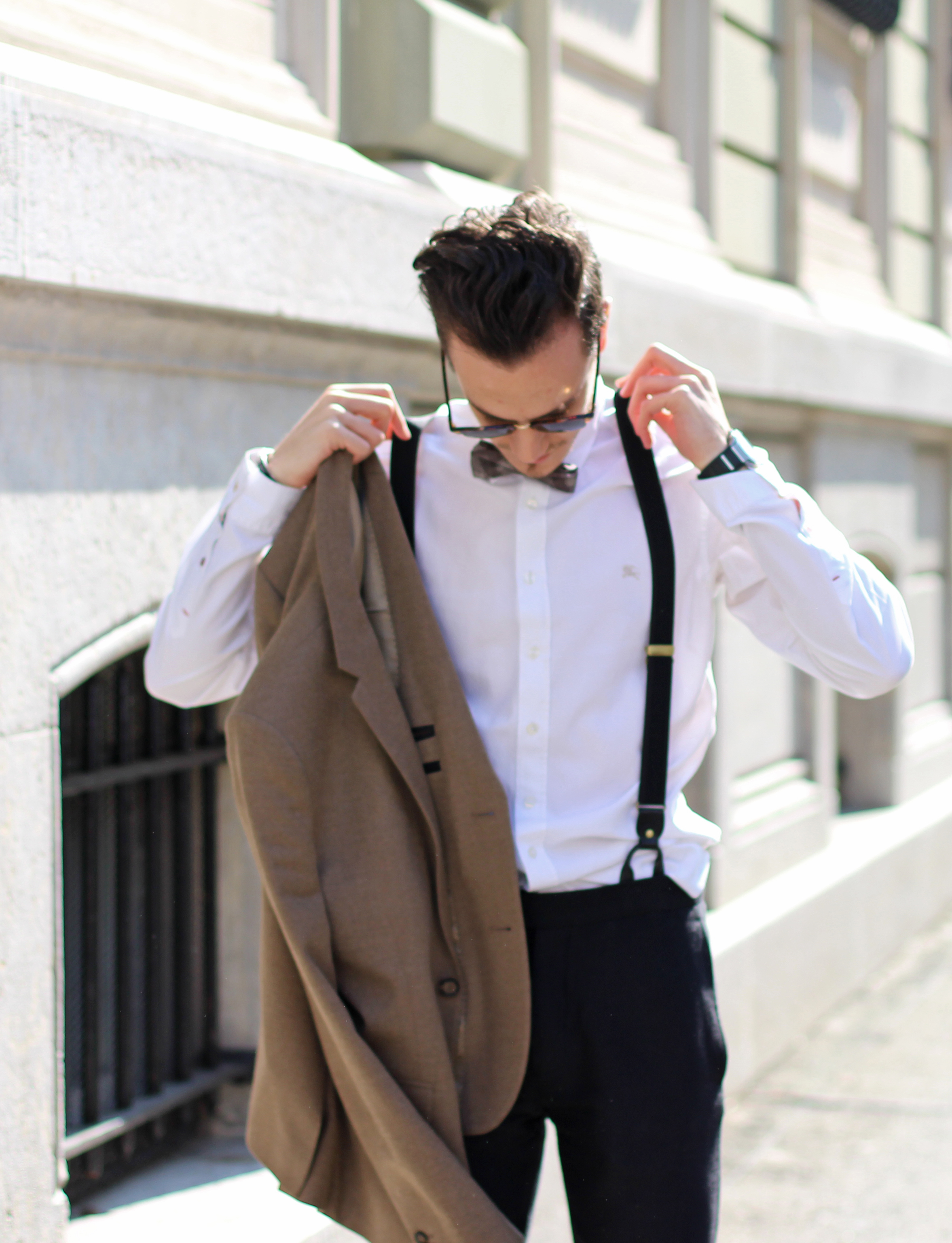 The look is also a lot about mix & matching, as (believe it or not) the jacket, bow, trousers and suspenders all simply come from H&M. I underestimated the store for a long time but have recently developped a new-found respect for some of their pieces. Indeed this jacket’s wool fabric is of pretty good quality, well-cut, and I really liked the color. In addition to the Burberry Brit classic oxford shirt and Massimo Dutti pocketsquare, I finished the look with a pair of Ray Ban’s turtoise clubmaster, which has been my favorite model for years, even when the huge Wayfarer storm hit and everybody was wearing them.