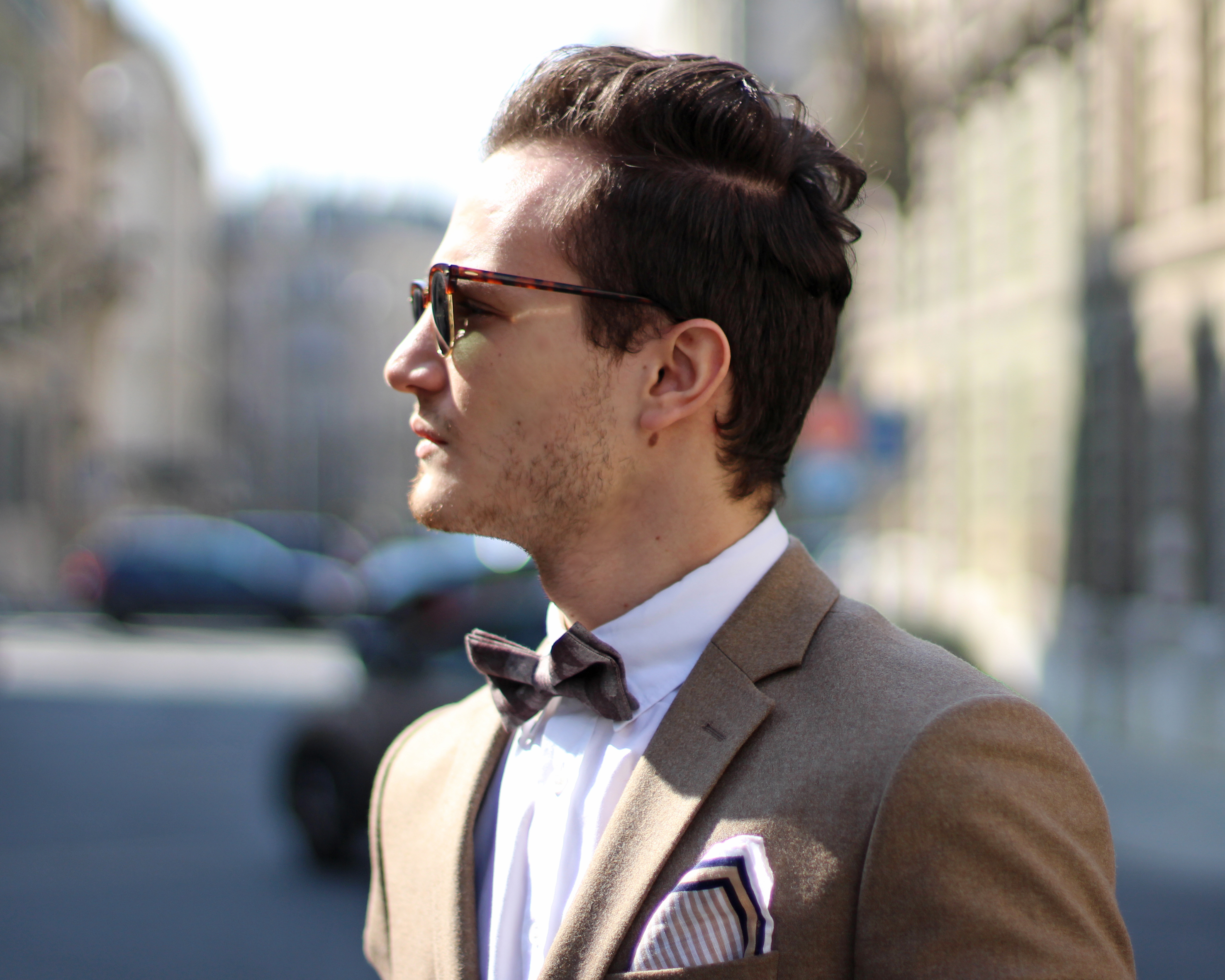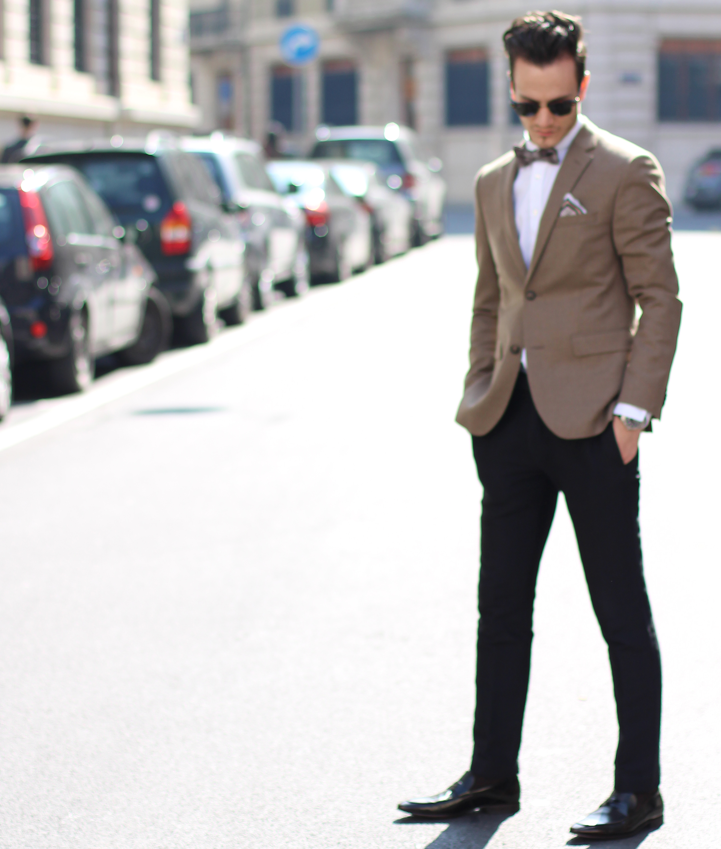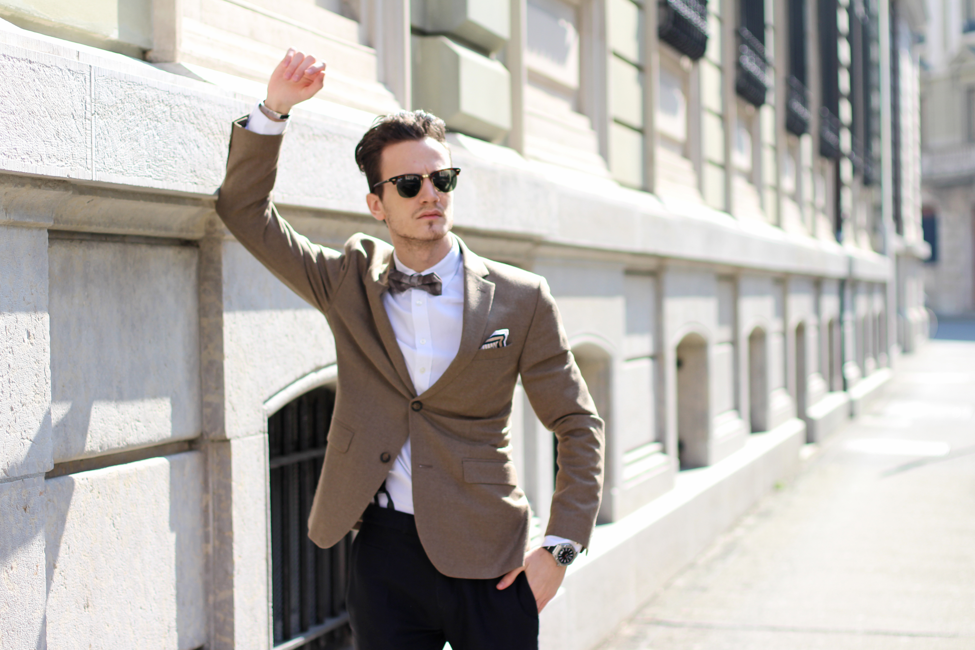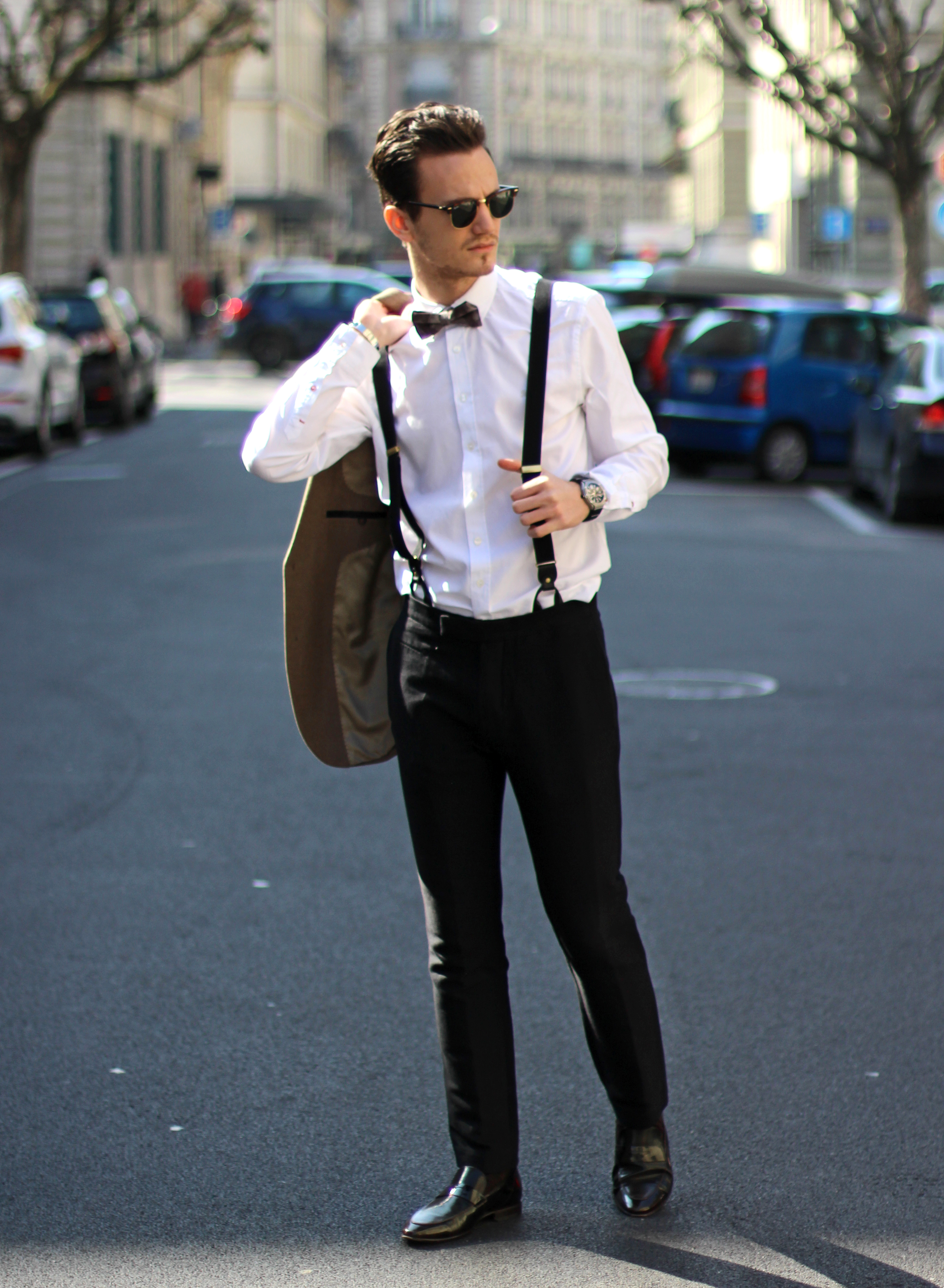 The look is also a lot about mix & matching, as (believe it or not) the jacket, bow, trousers and suspenders all simply come from H&M. I underestimated the store for a long time but have recently developped a new-found respect for some of their pieces. Indeed this jacket’s wool fabric is of pretty good quality, well-cut, and I really liked the color. In addition to the Burberry Brit classic oxford shirt and Massimo Dutti pocketsquare, I finished the look with a pair of Ray Ban’s turtoise clubmaster, which has been my favorite model for years, even when the huge Wayfarer storm hit and everybody was wearing them.