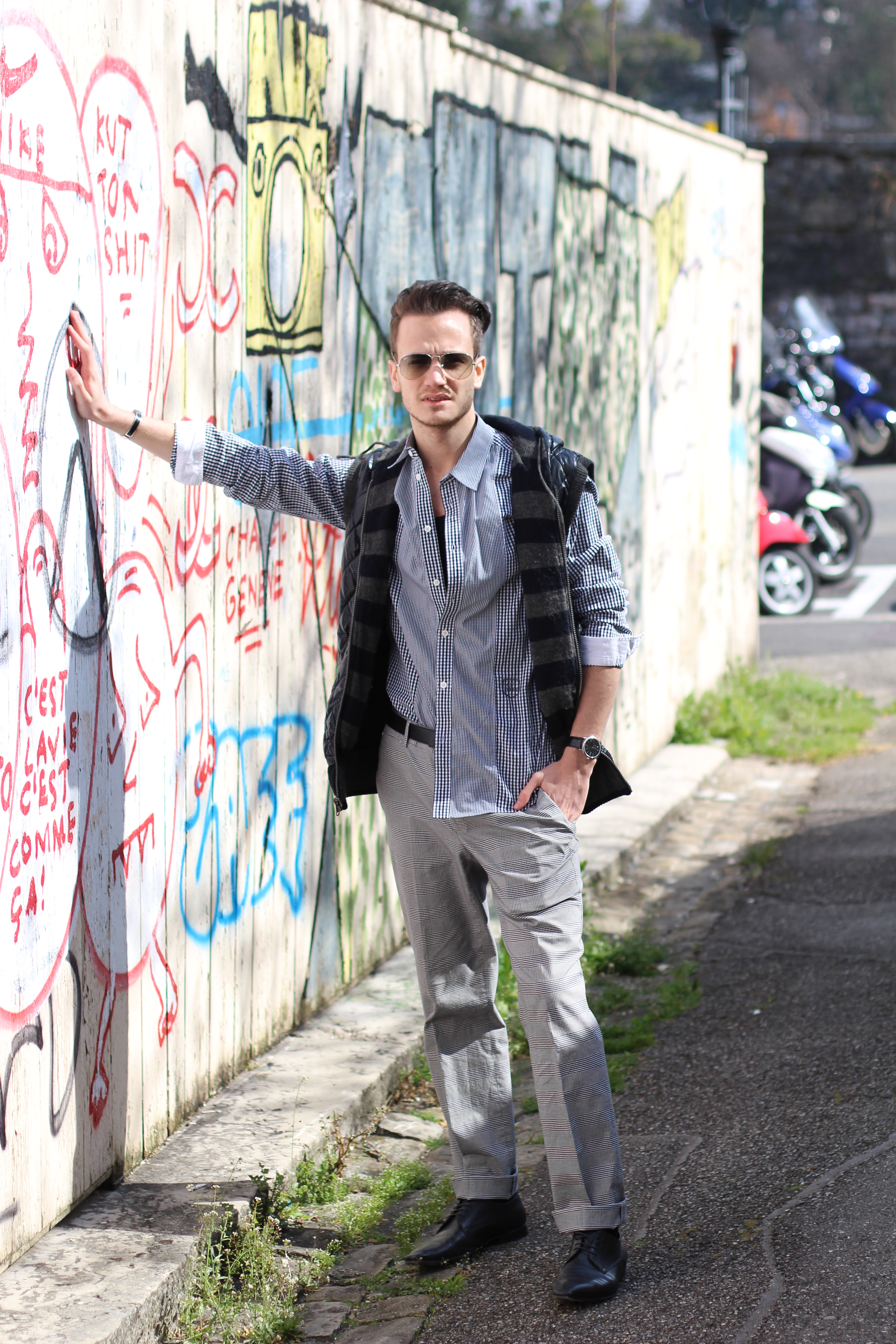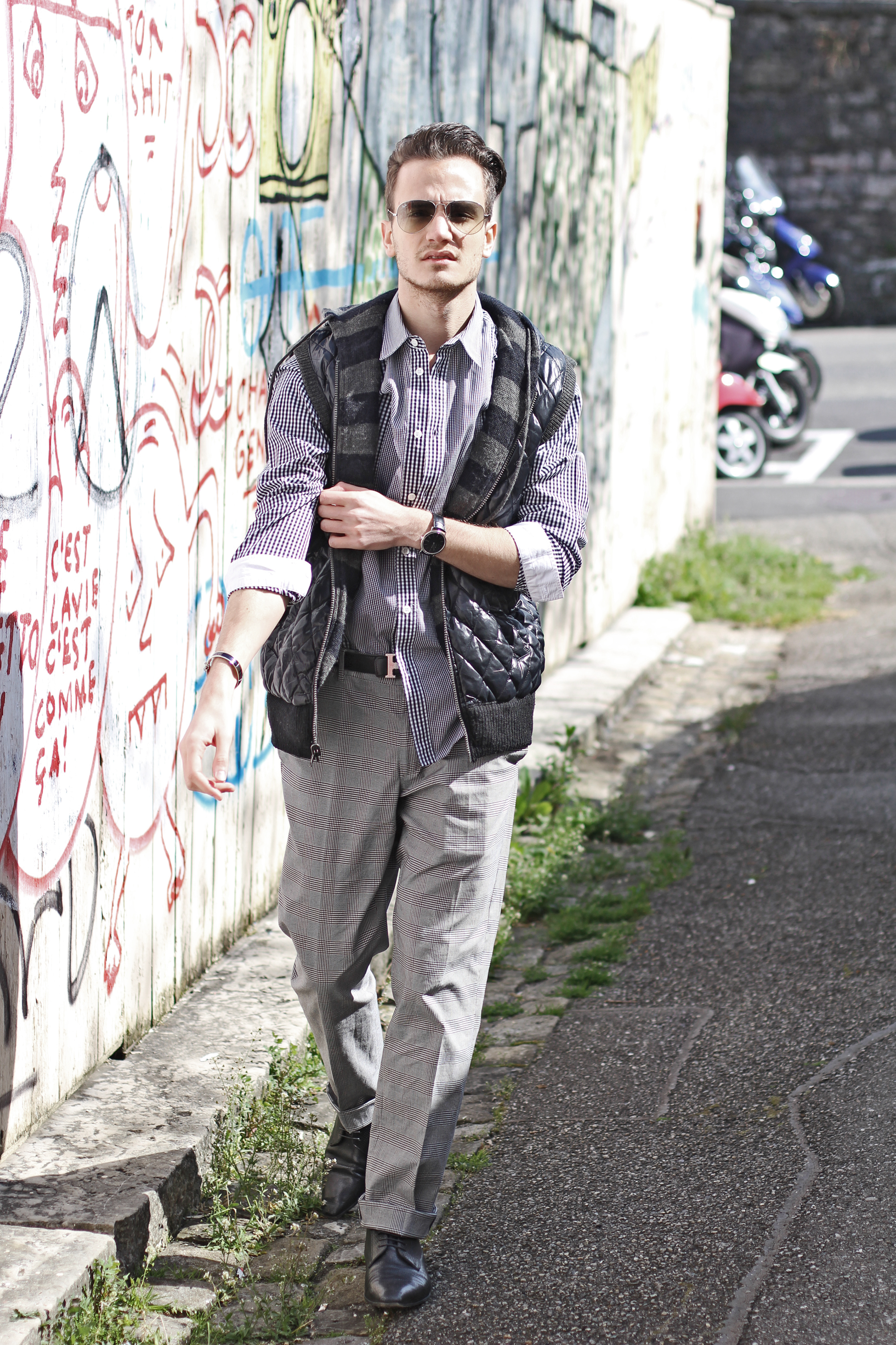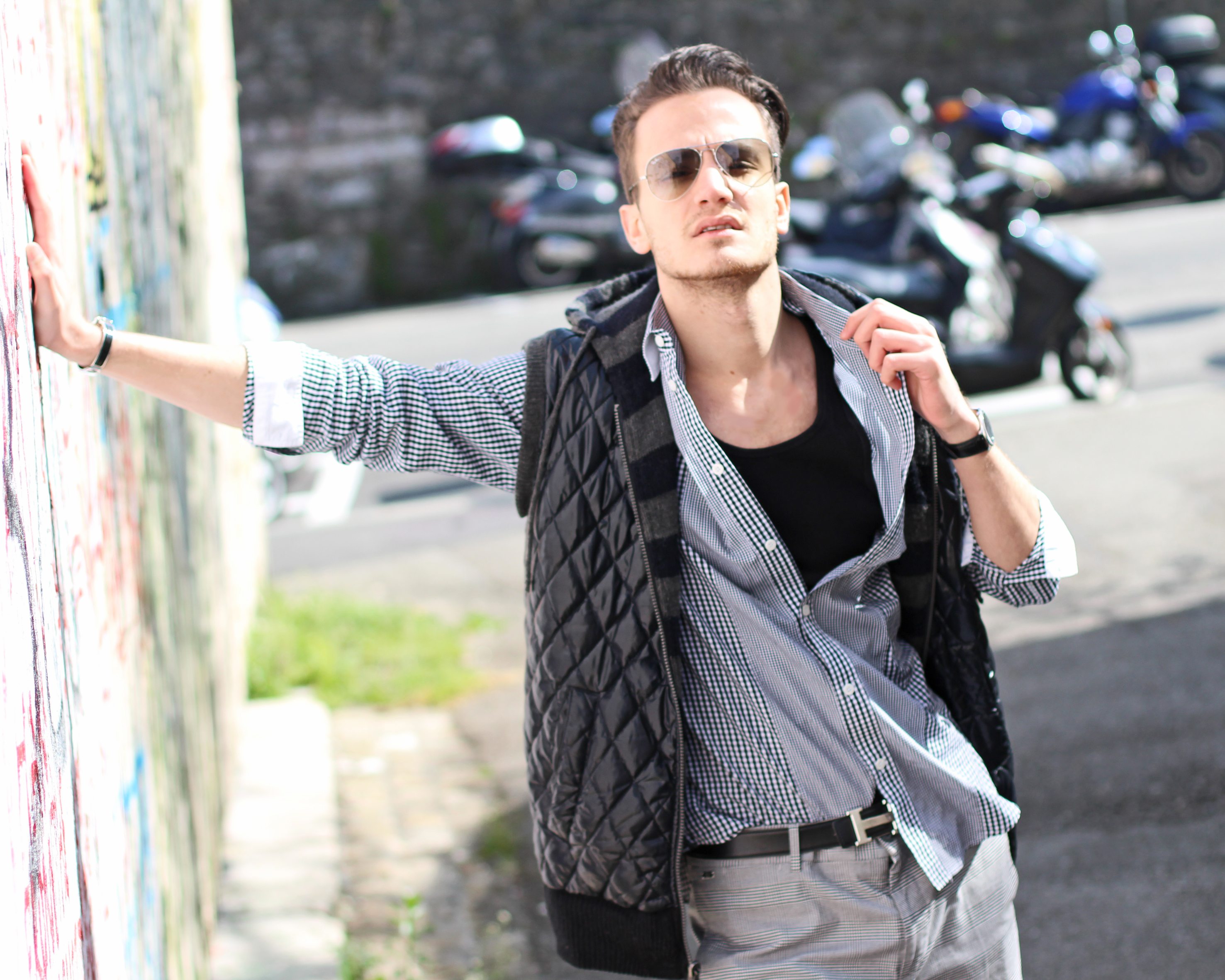 My favorite “H” accessories (it is my name..! ) and a pair of aviators and I was ready to shoot in front of this cool graffiti wall.