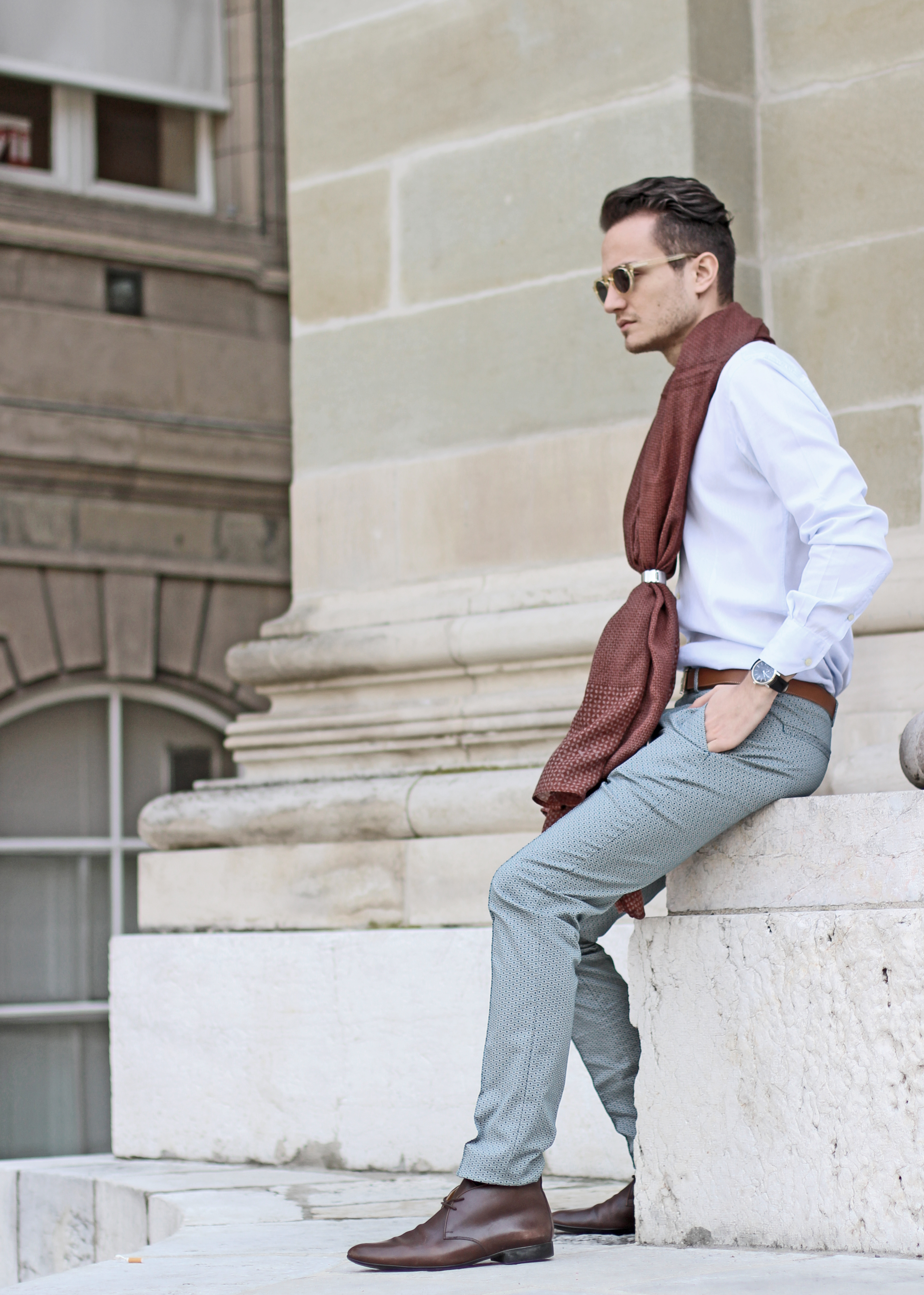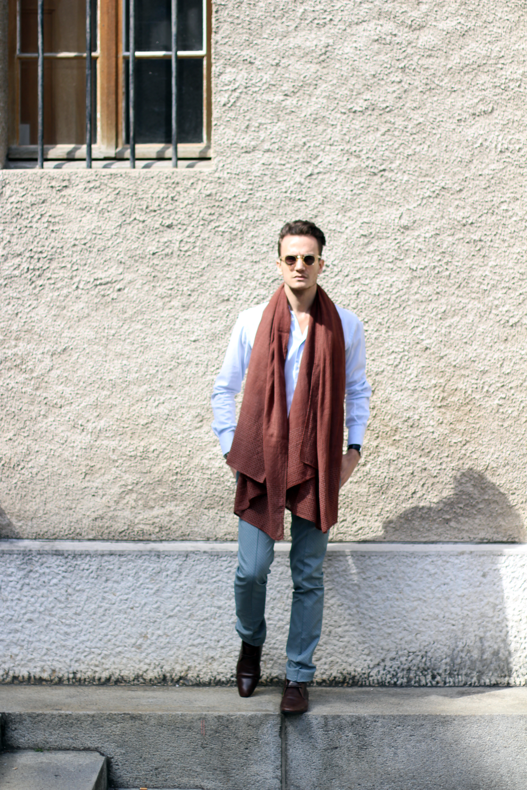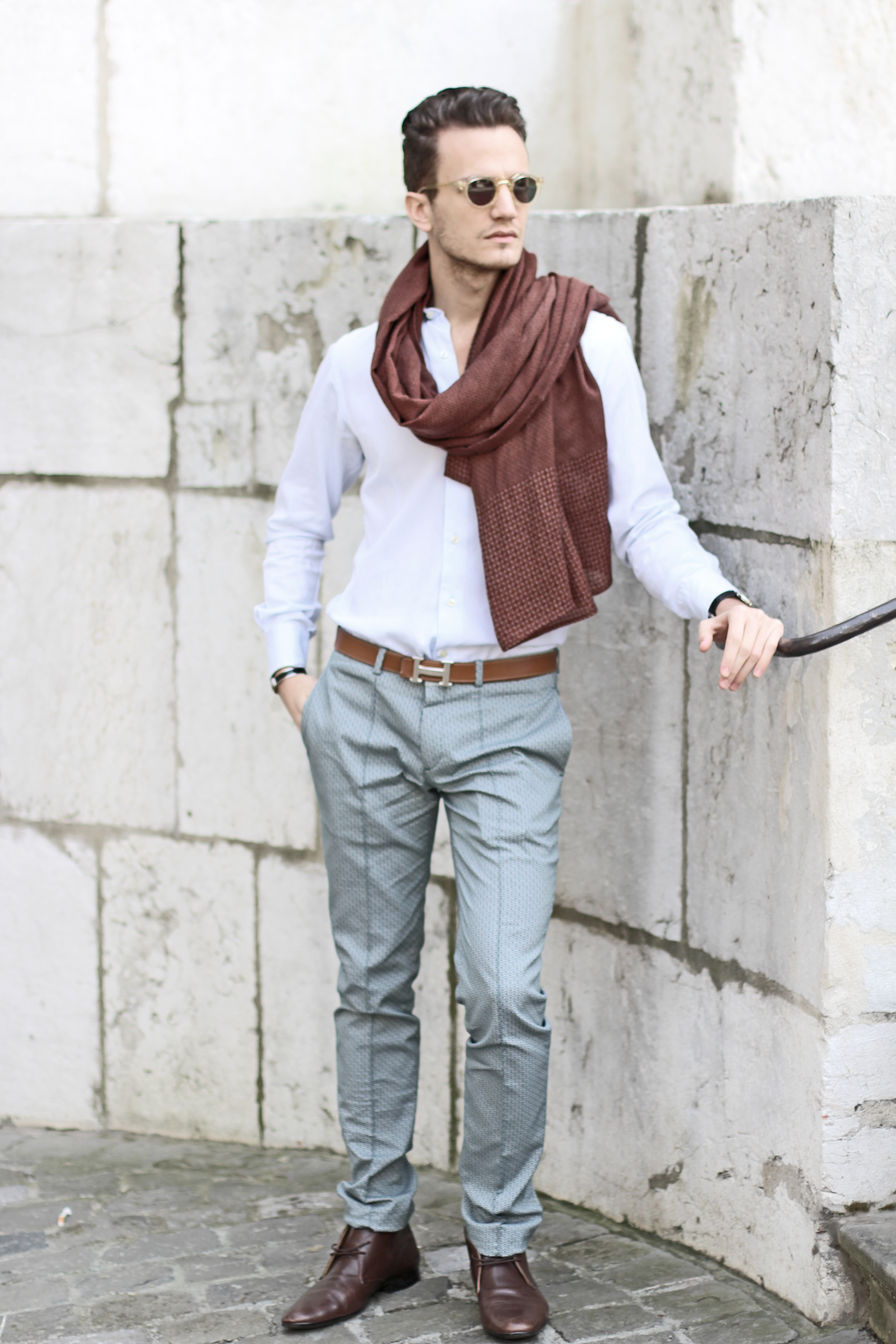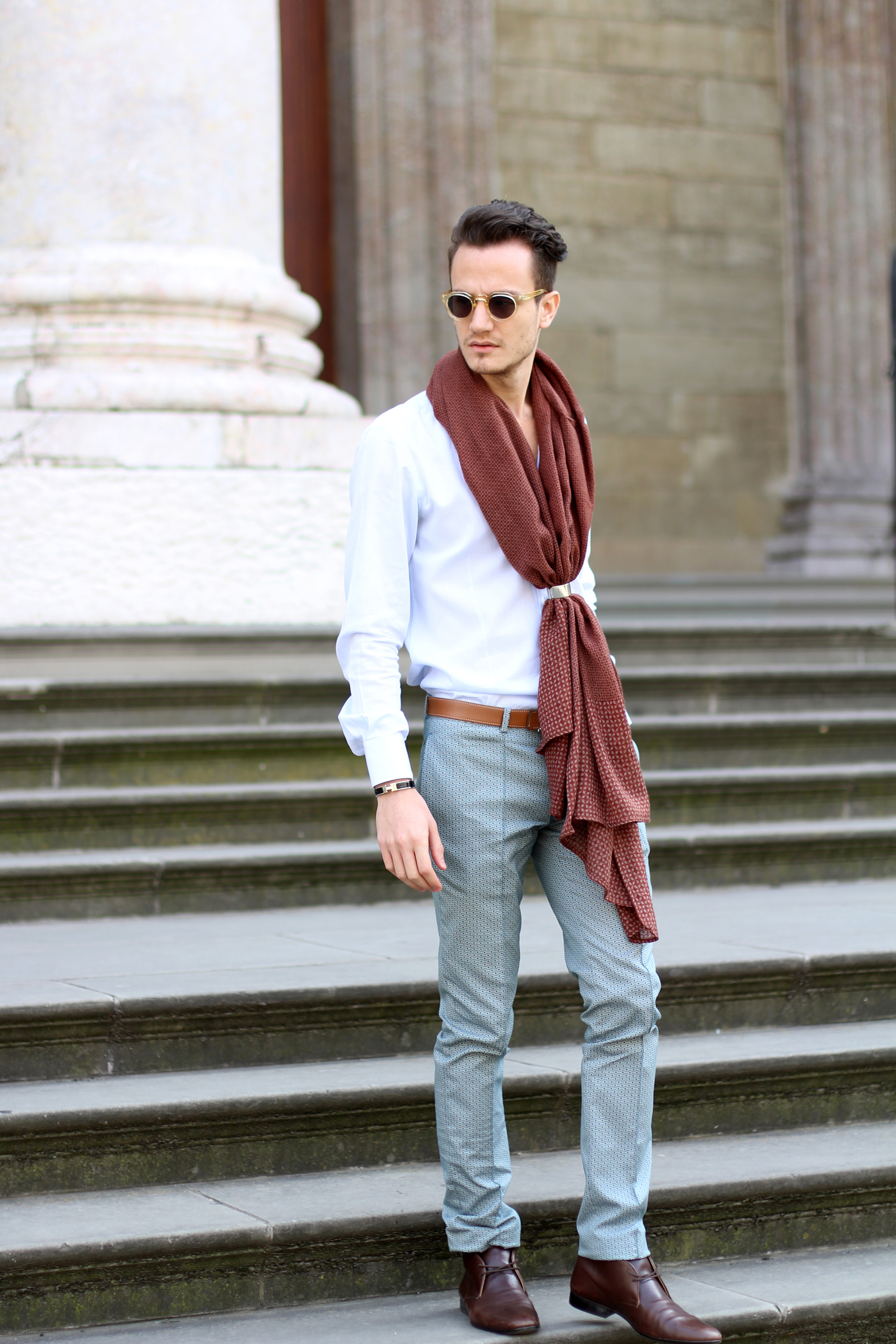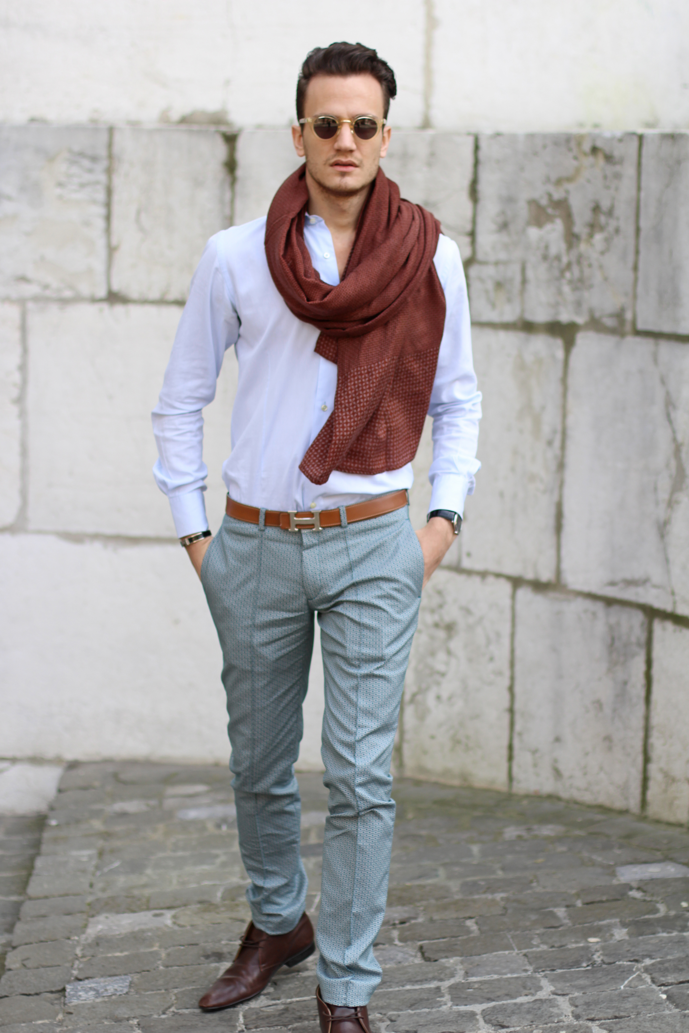 For the upper body, I found a shirt that matched the light tones of the trousers, but then I broke the color uniformity with brown leather boots, light brown leather belt and a gorgeous brown scarf with another beautiful print, perfectly fitting my spring print theme.