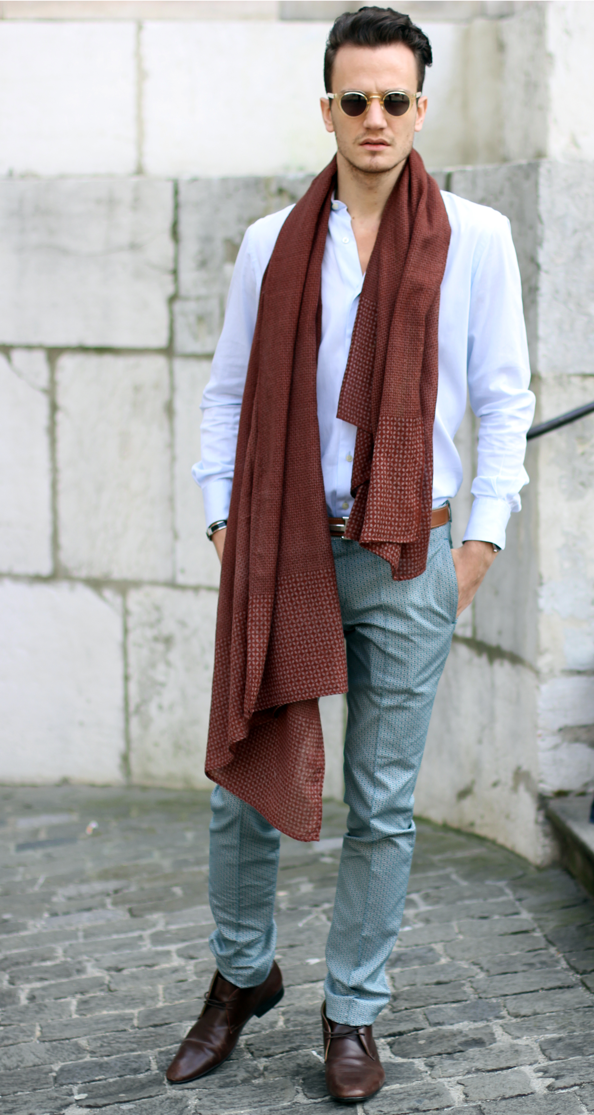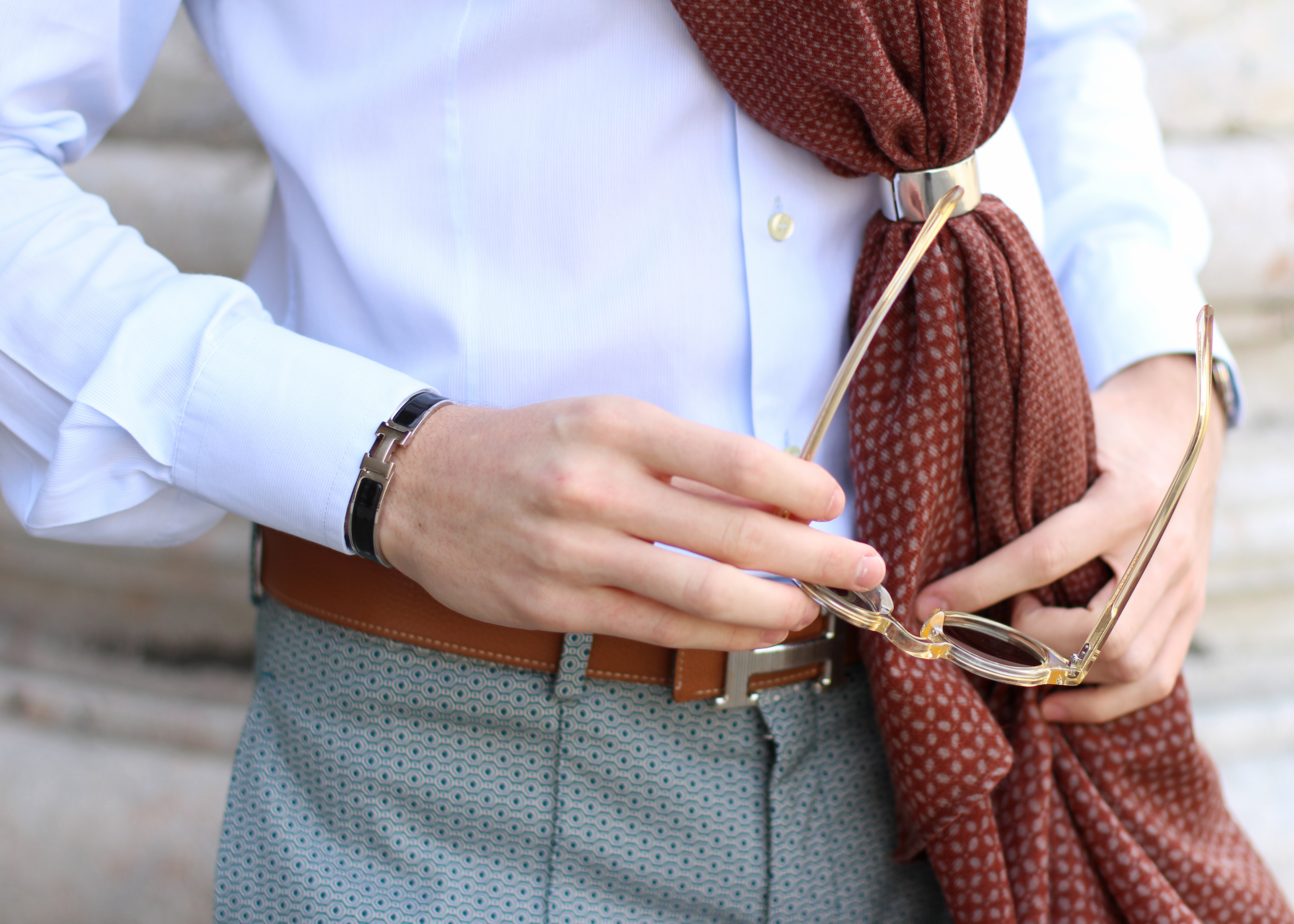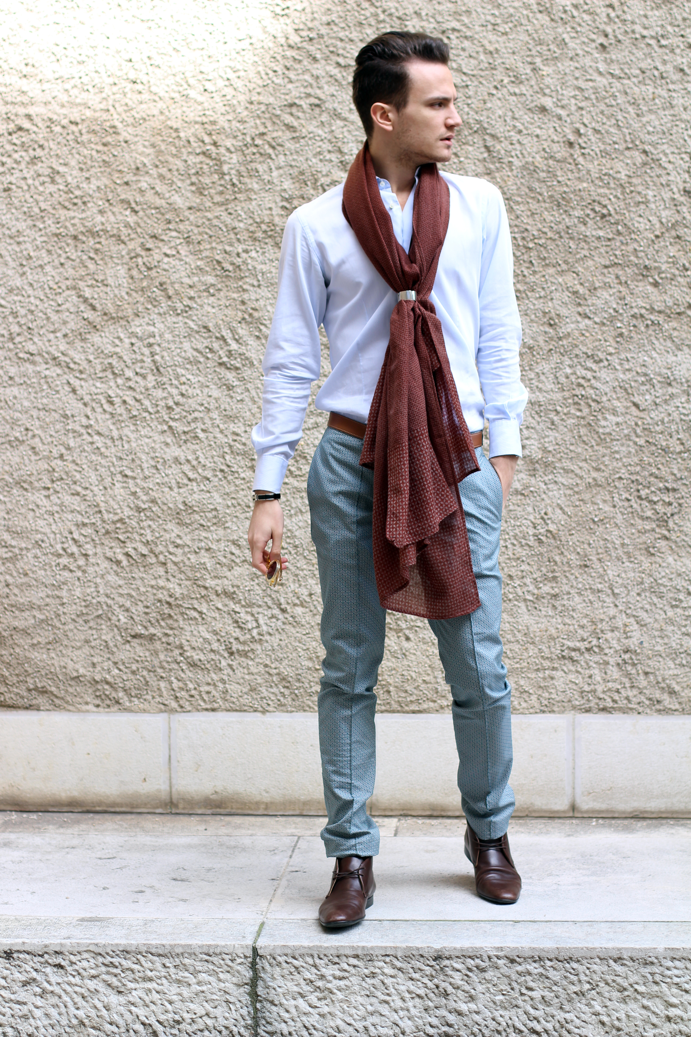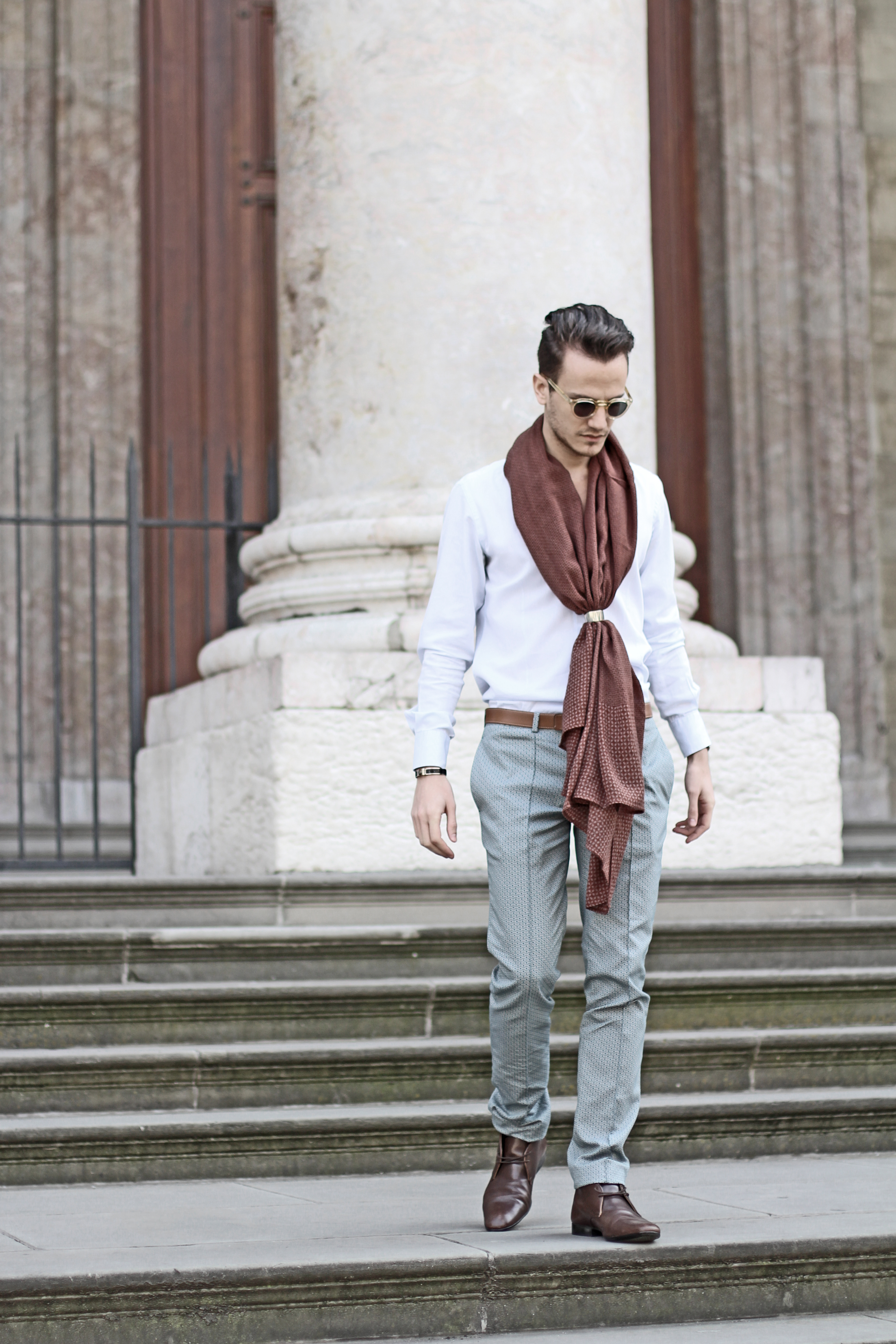 For the upper body, I found a shirt that matched the light tones of the trousers, but then I broke the color uniformity with brown leather boots, light brown leather belt and a gorgeous brown scarf with another beautiful print, perfectly fitting my spring print theme.