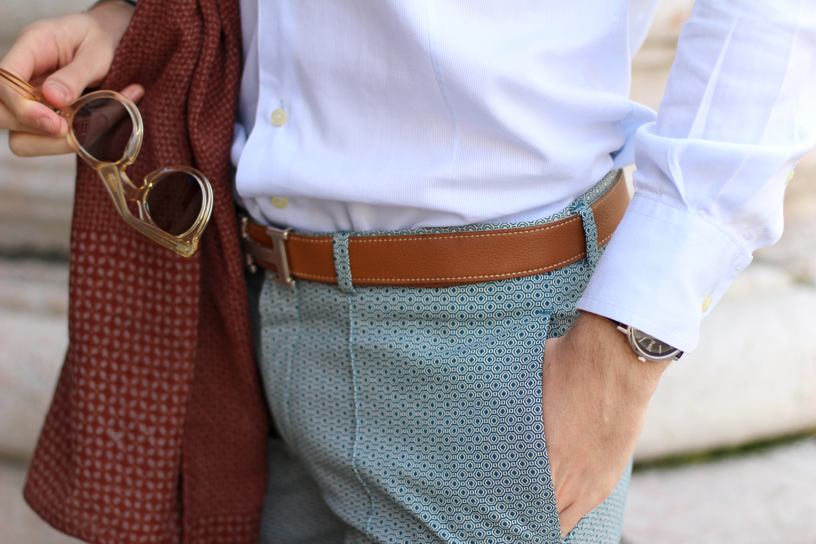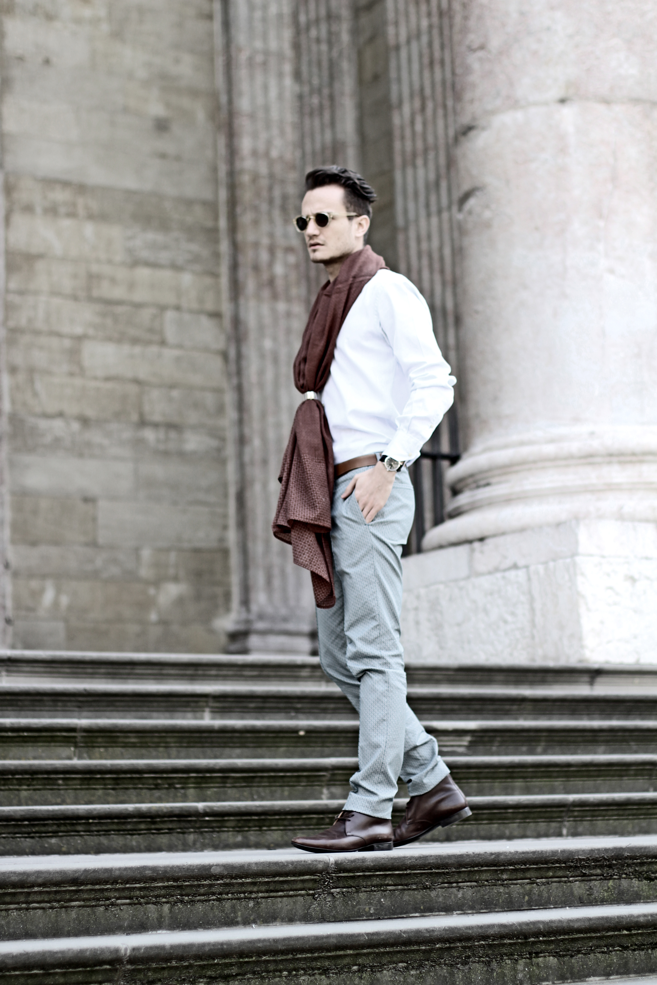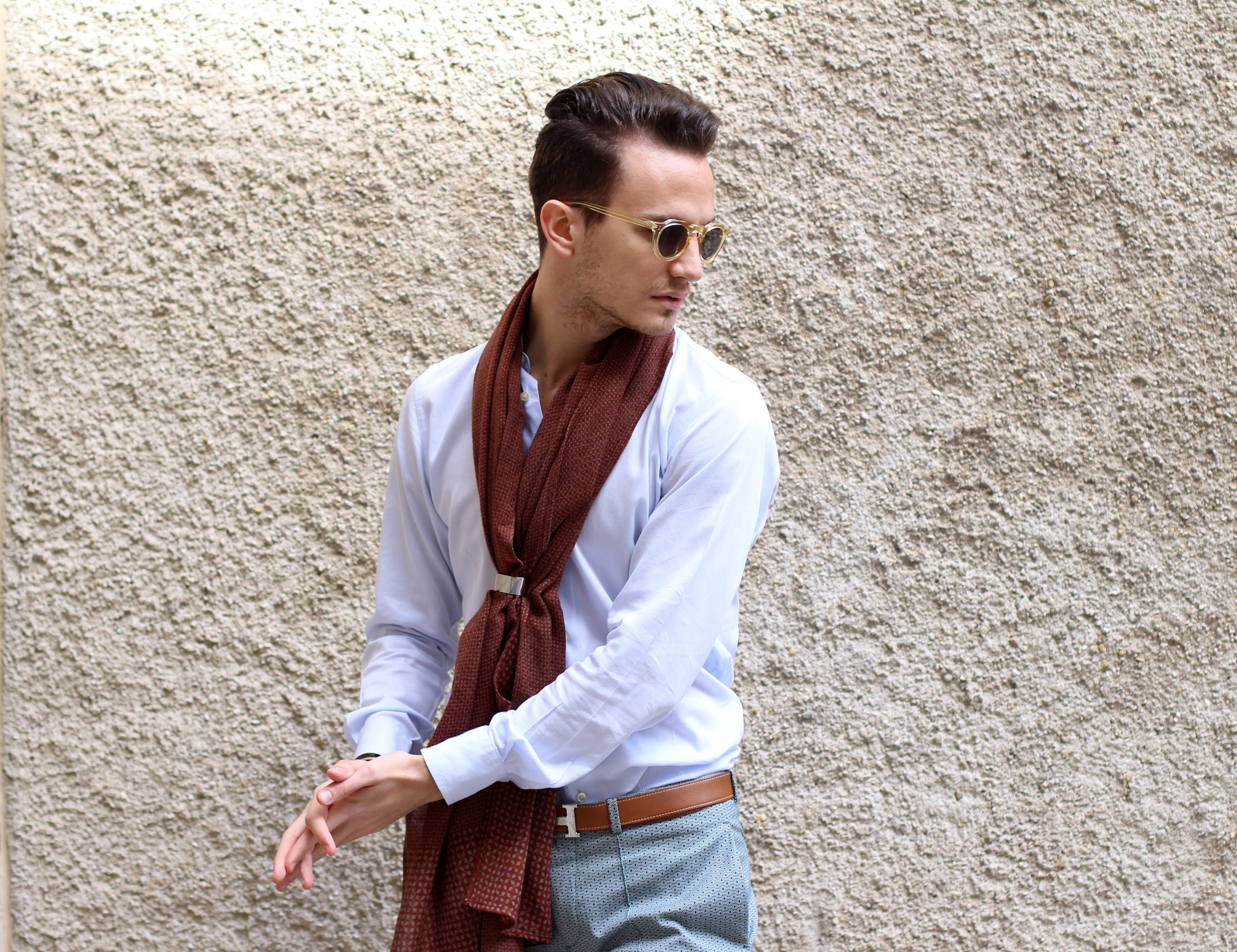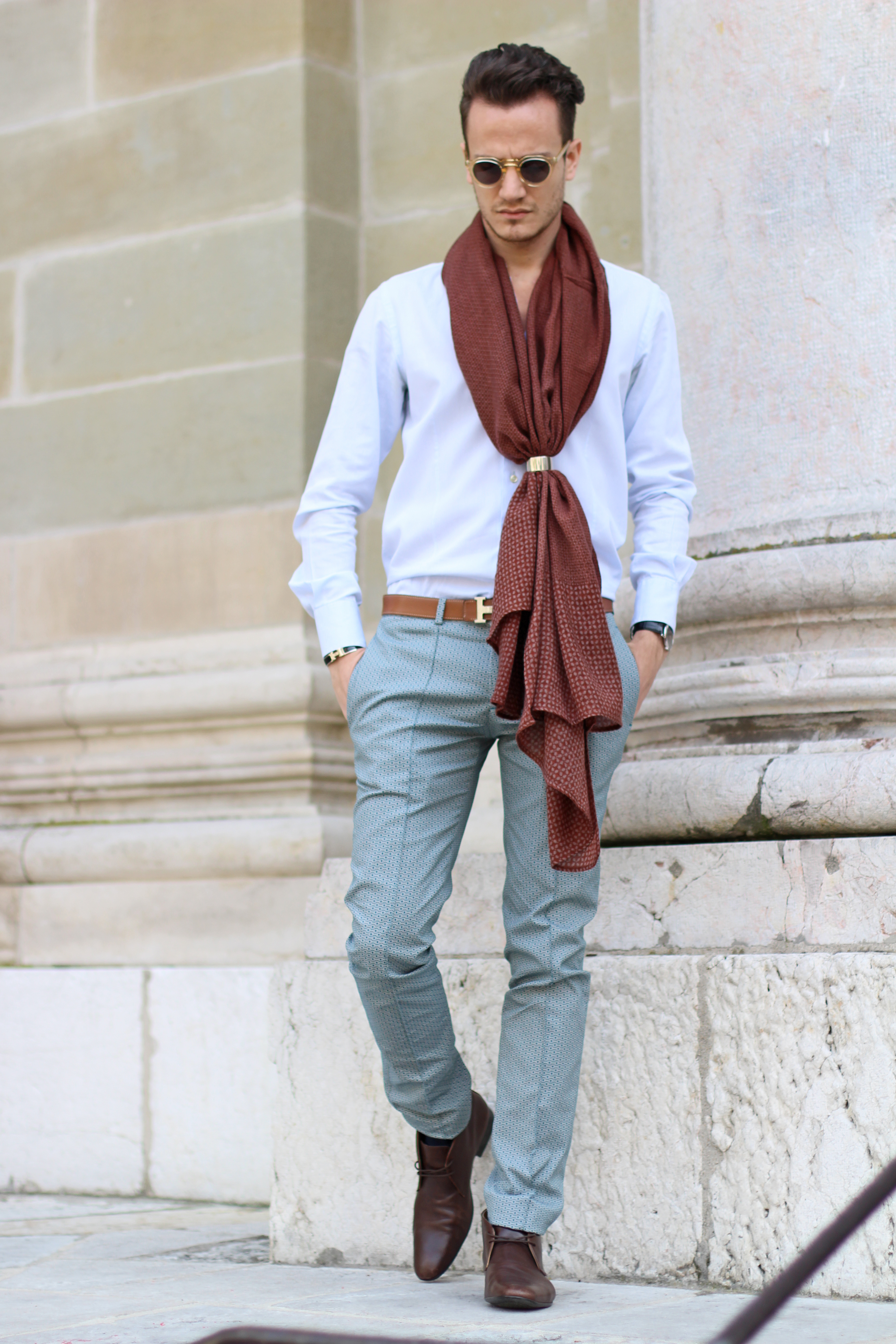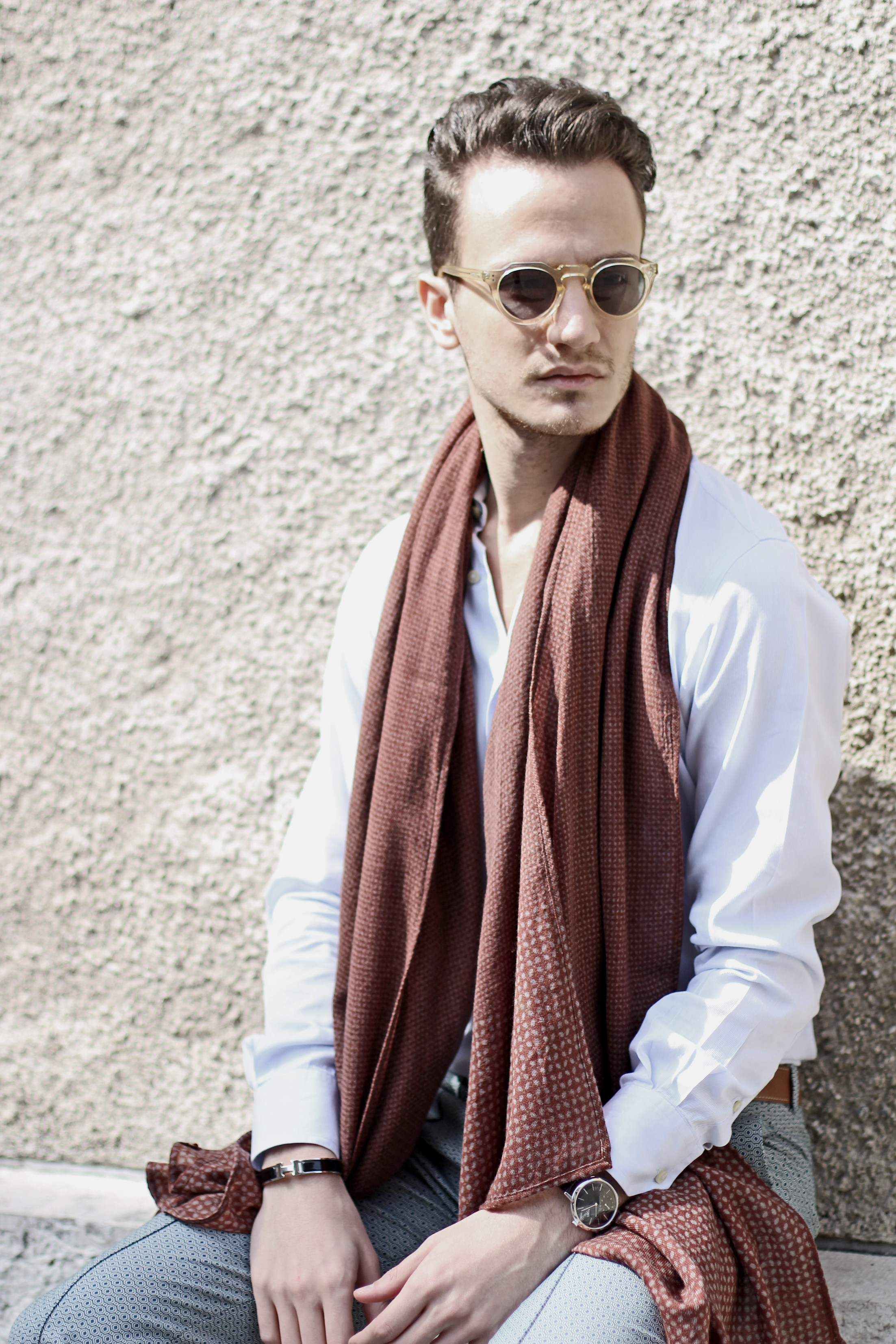 For the upper body, I found a shirt that matched the light tones of the trousers, but then I broke the color uniformity with brown leather boots, light brown leather belt and a gorgeous brown scarf with another beautiful print, perfectly fitting my spring print theme.