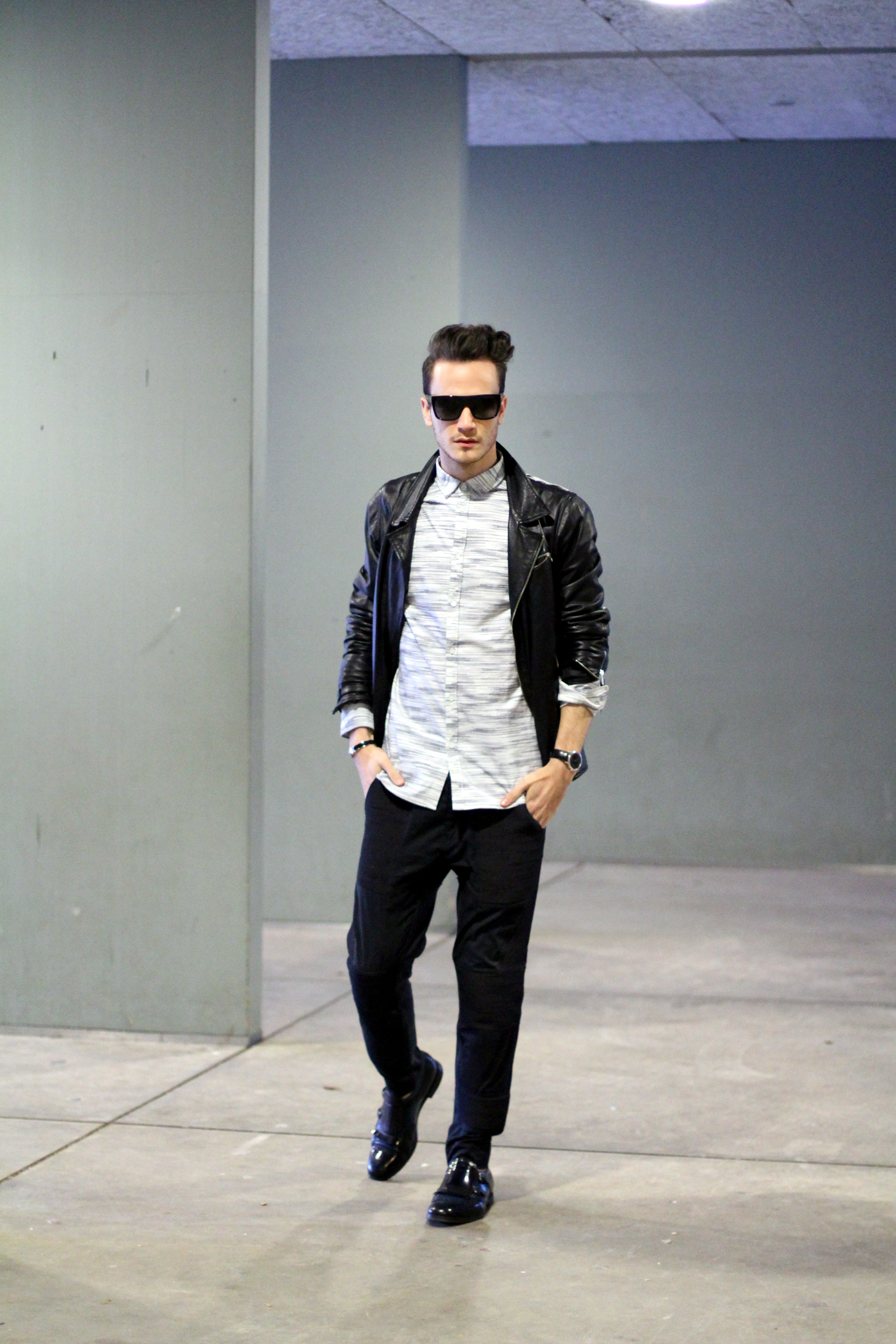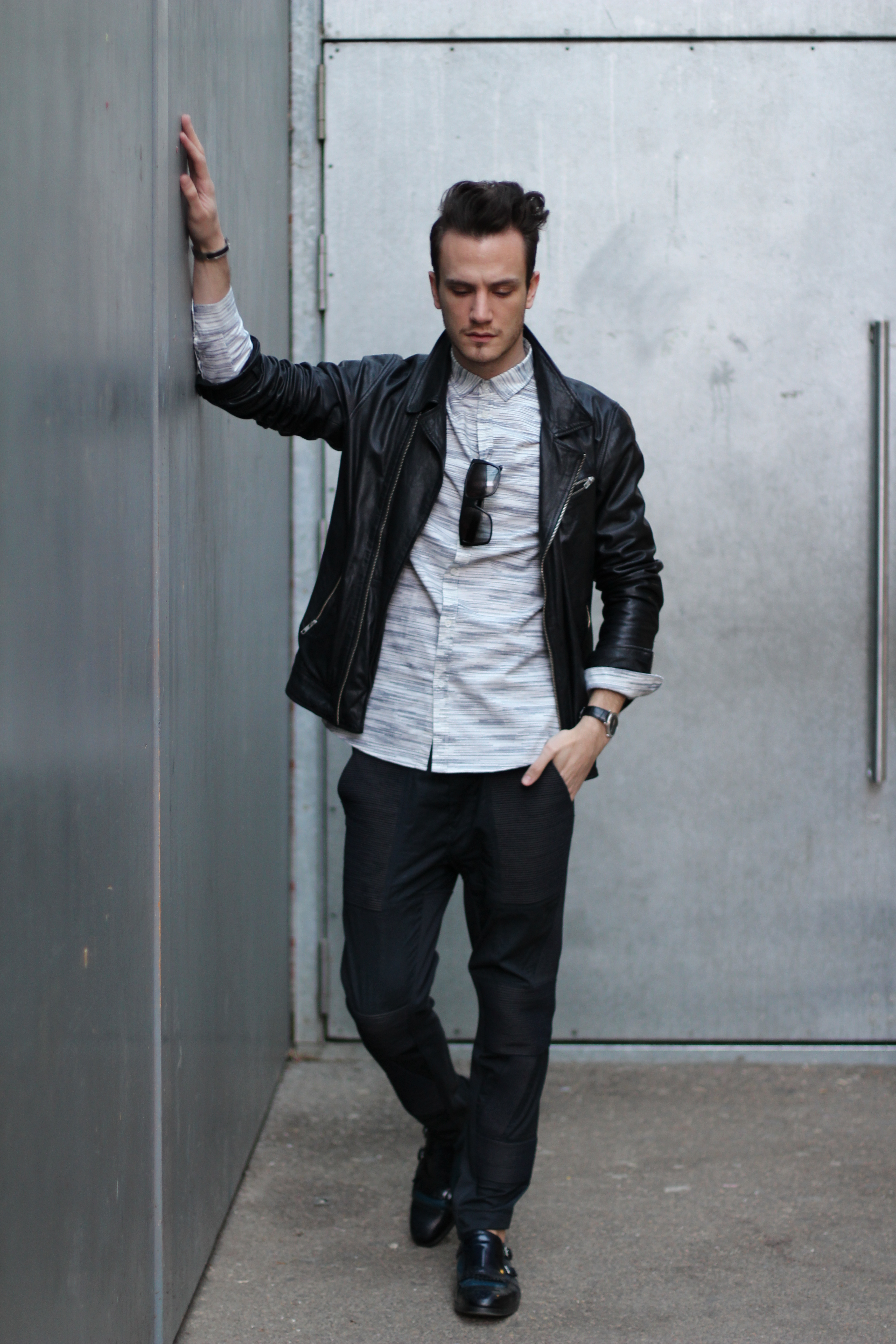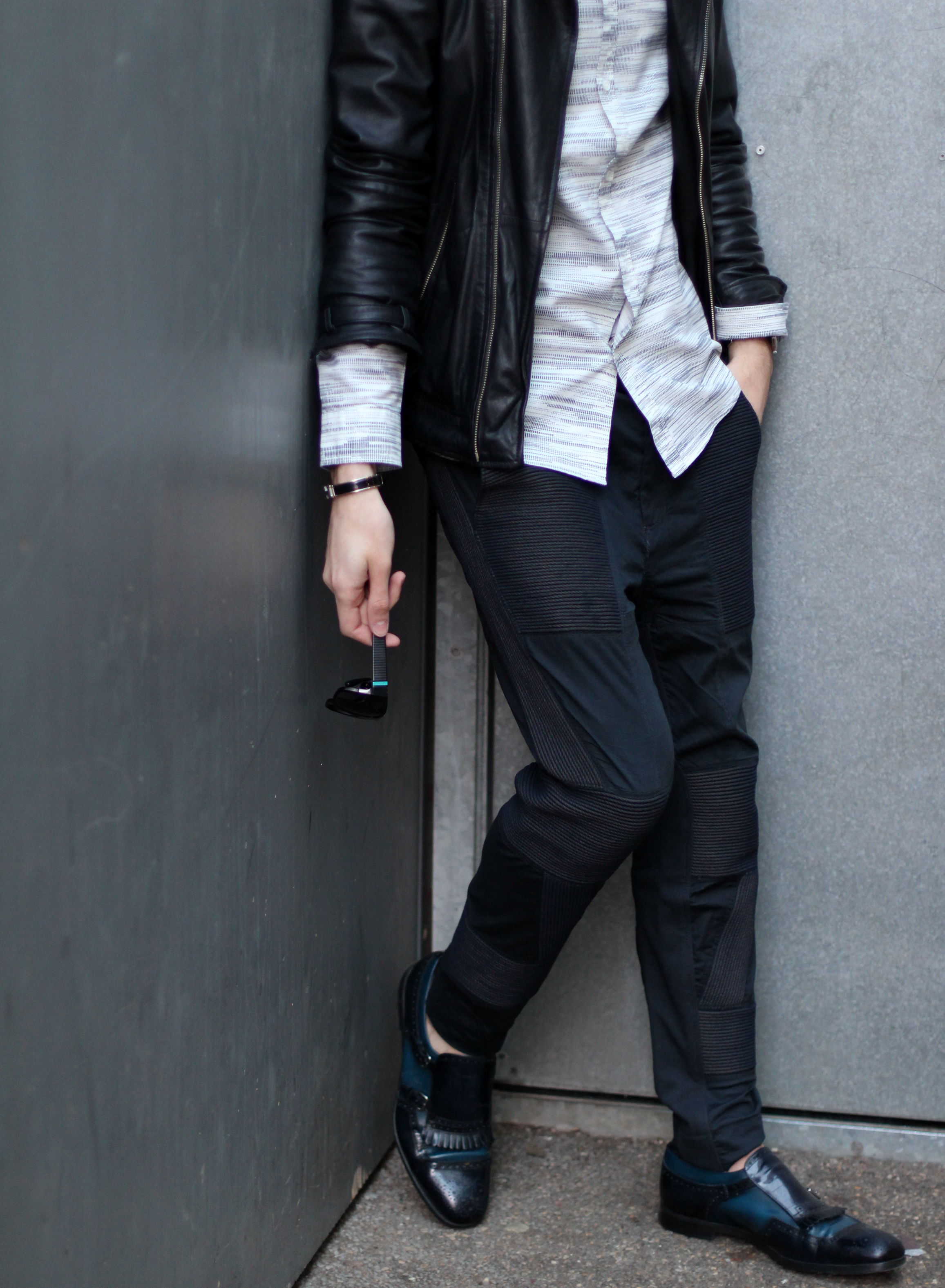 I added leather touches with this The Kooples dark blue leather jacket and my favorite Prada Loafers.