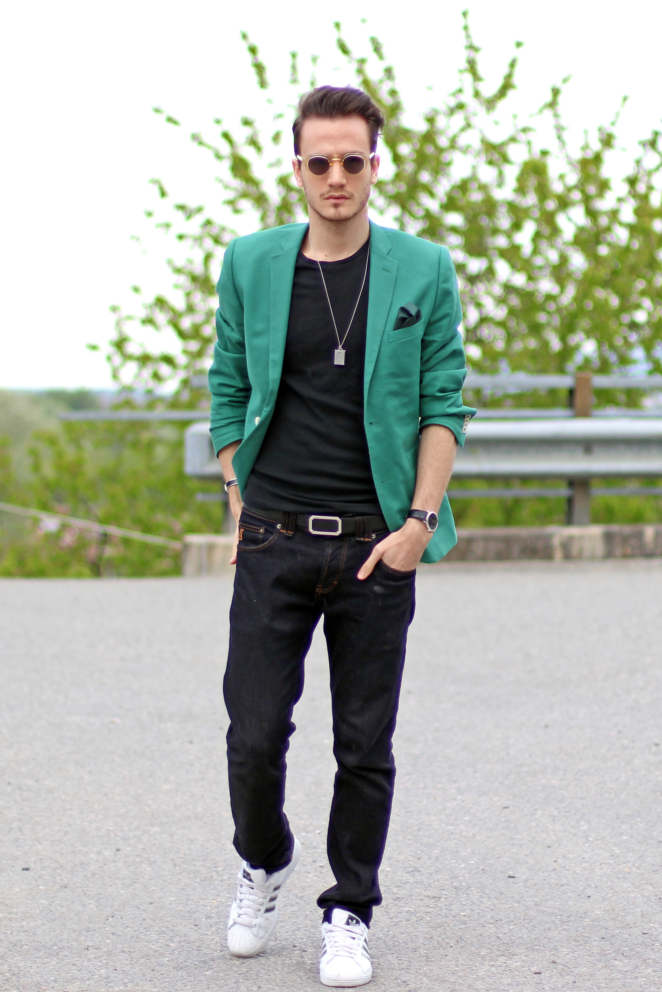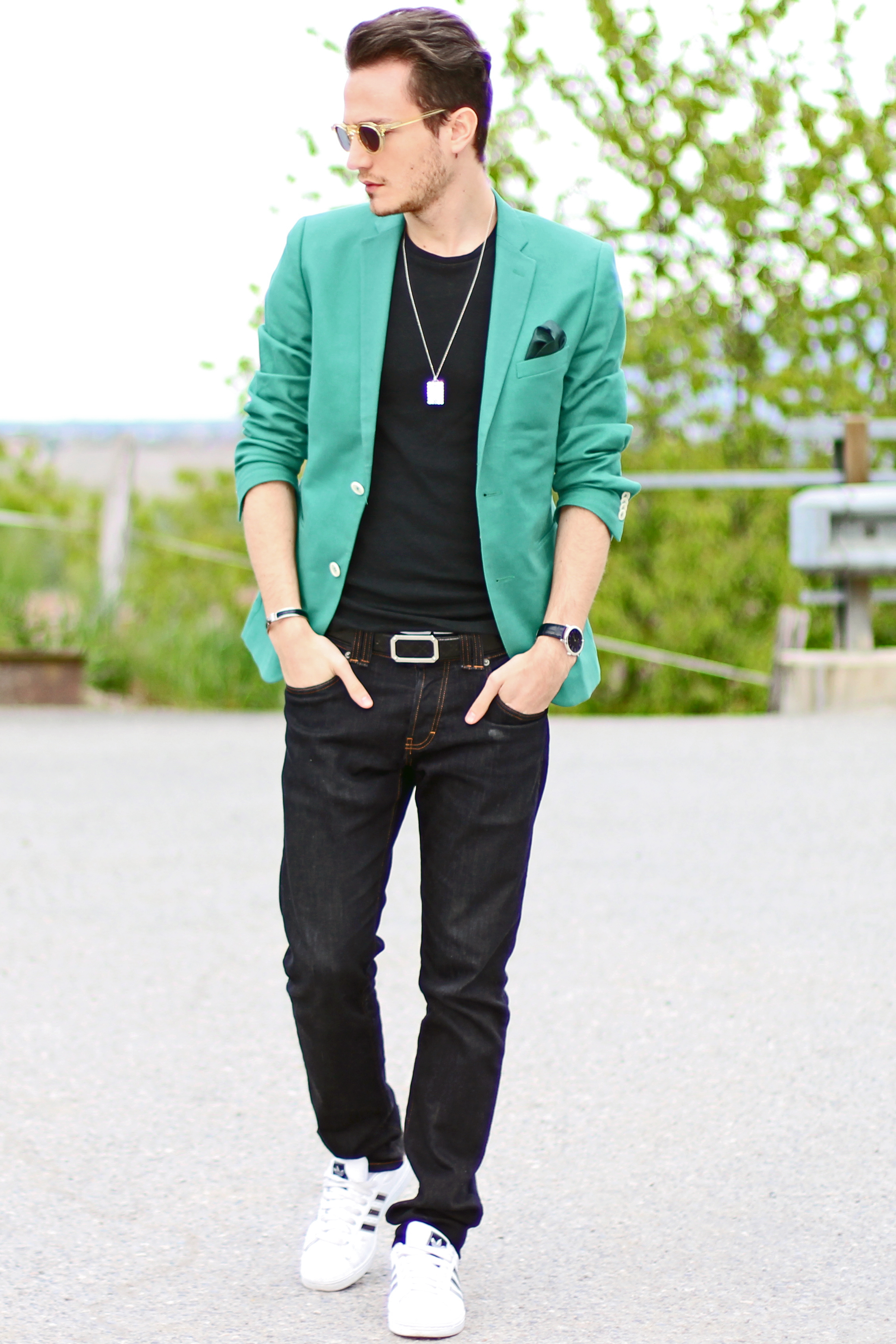 Today’s look is about upgrading a very basic and casual look: black t-shirt – jeans – classic Adidas sneakers – with a color twist thanks to this bright green blazer that I got last summer at H&M !
