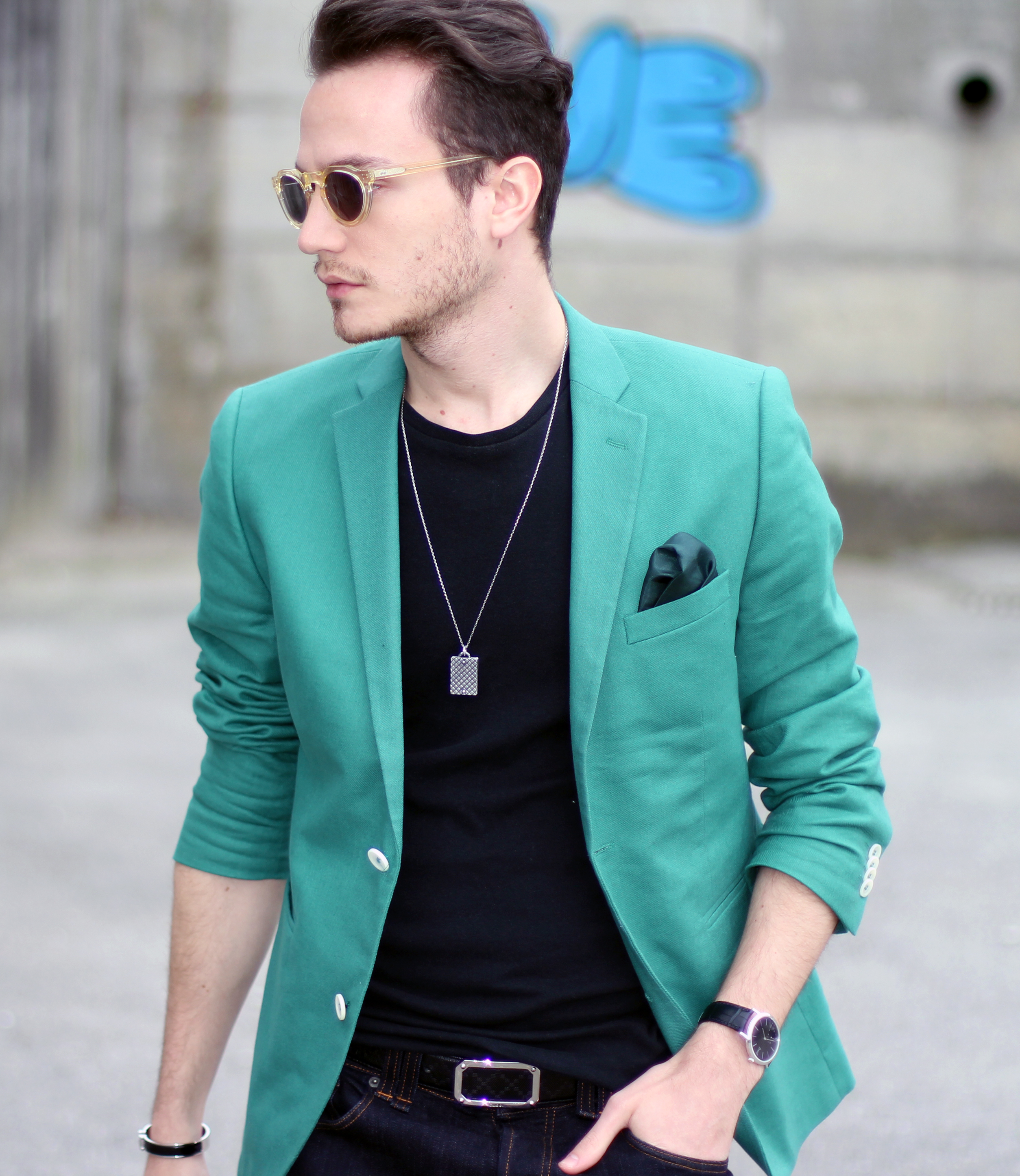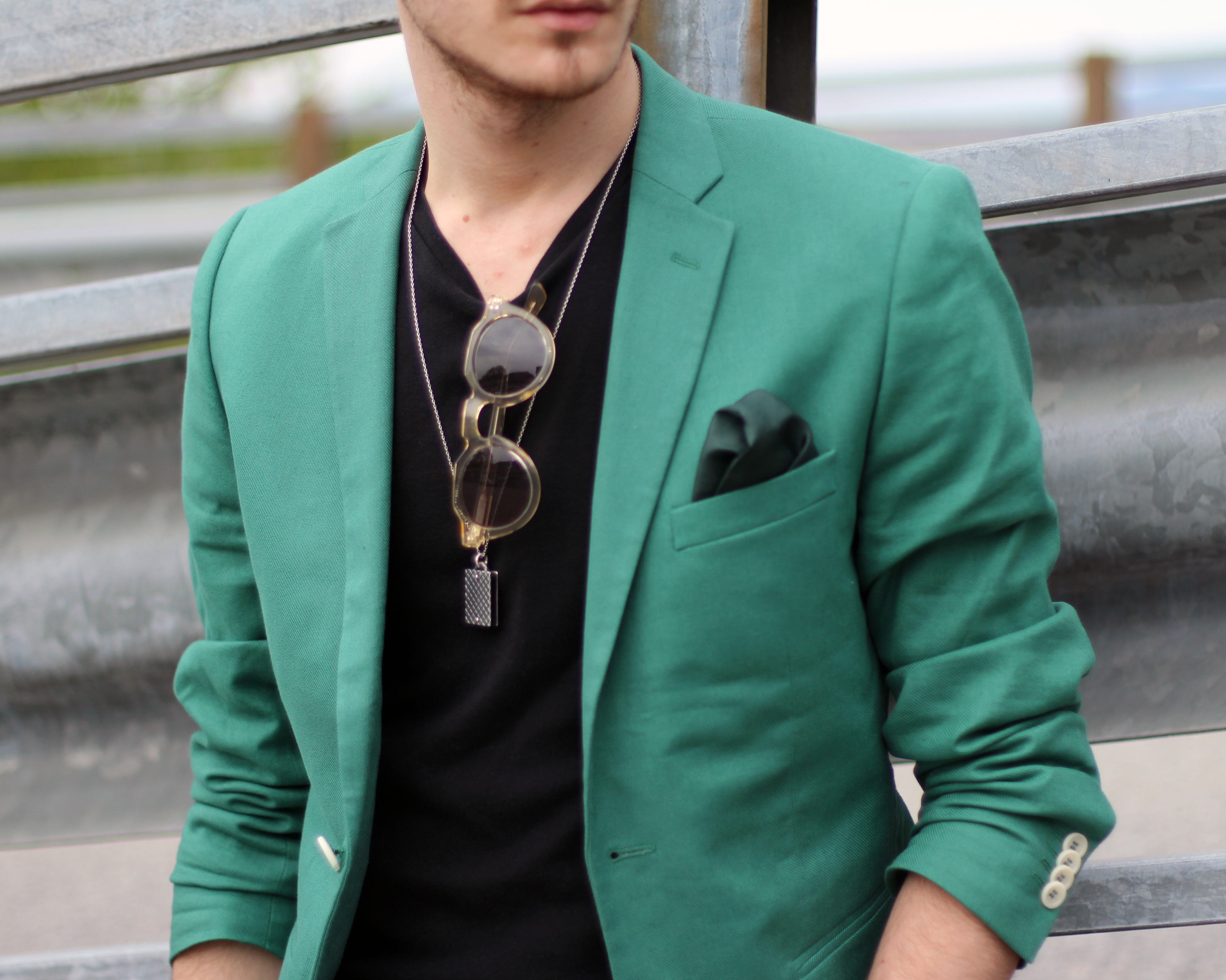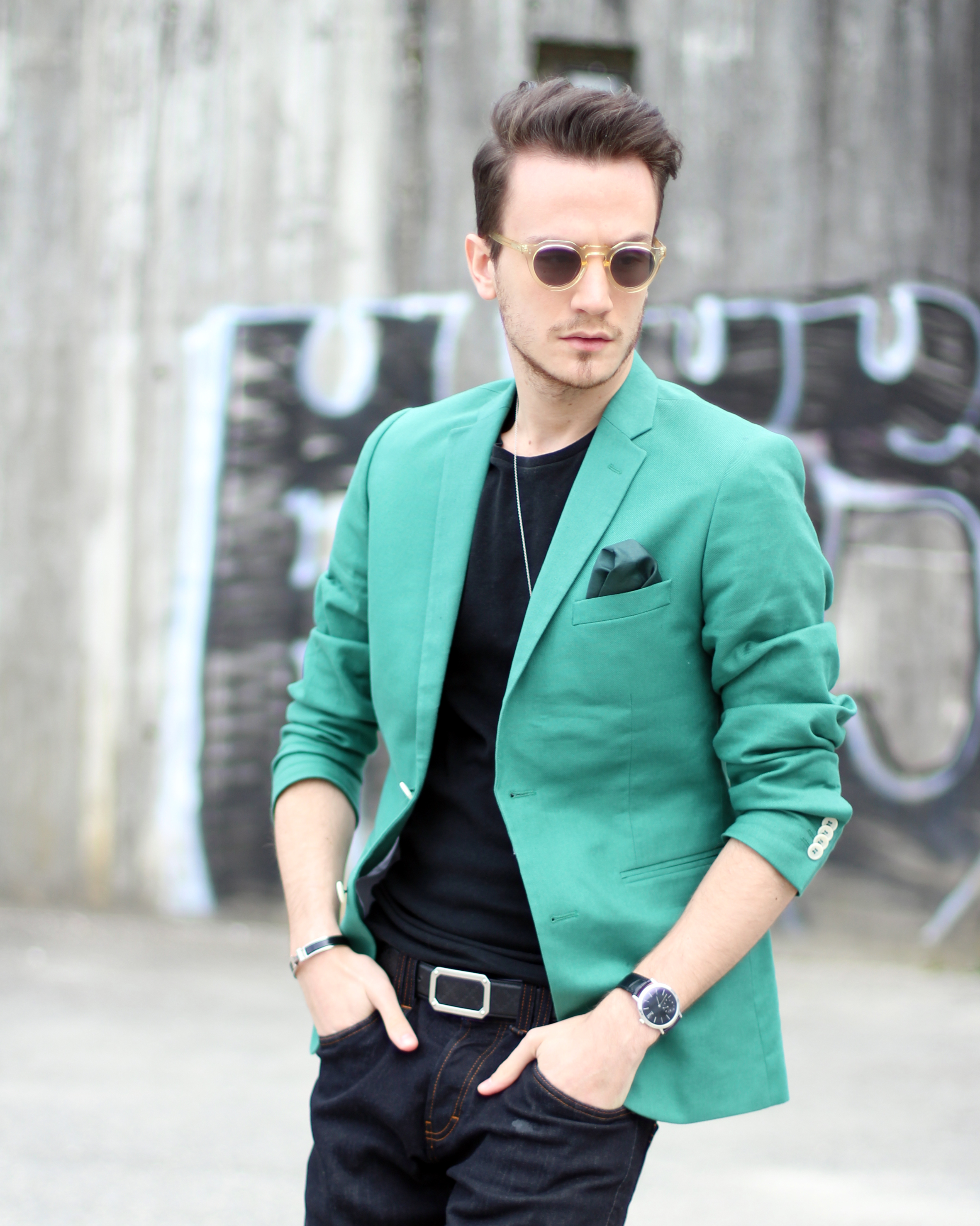 Once again, accessories make the outfit stand out, therefore I added an emerald green pocketsquare, my new favorite shades from LESCA Lunetier, bought at LeLABO in Geneva, for a retro/vintage touch, and my Bottega Veneta necklace.