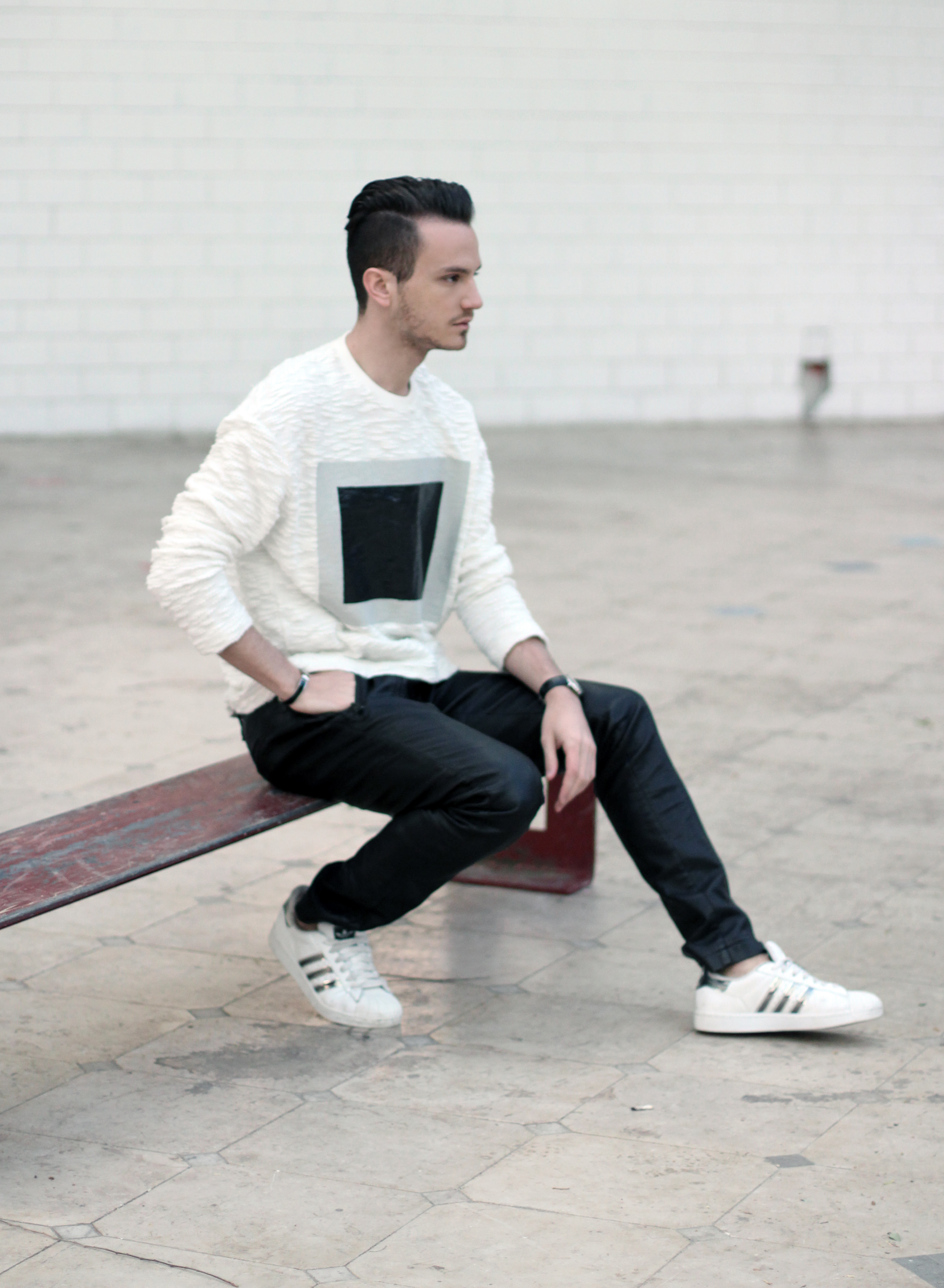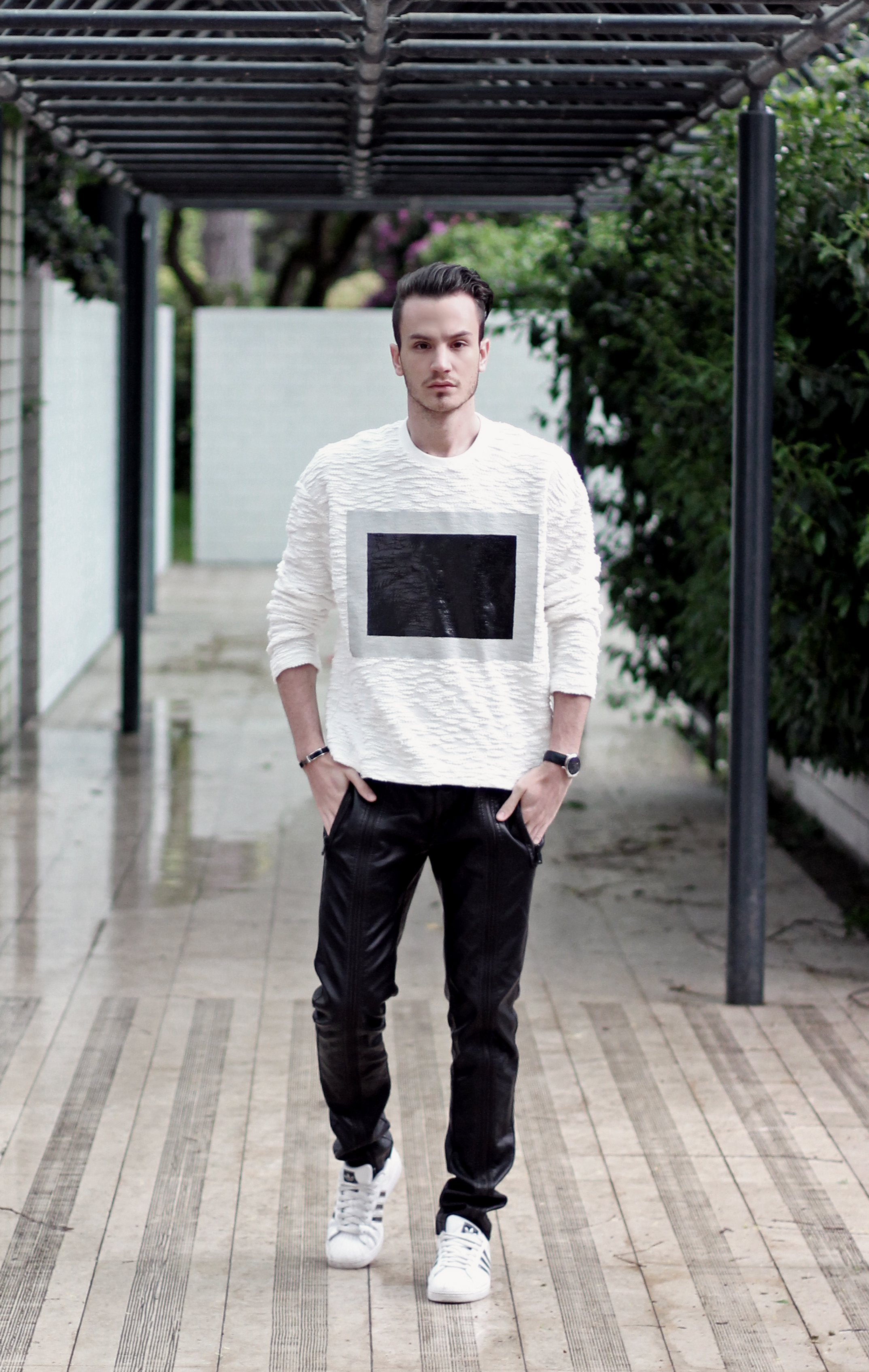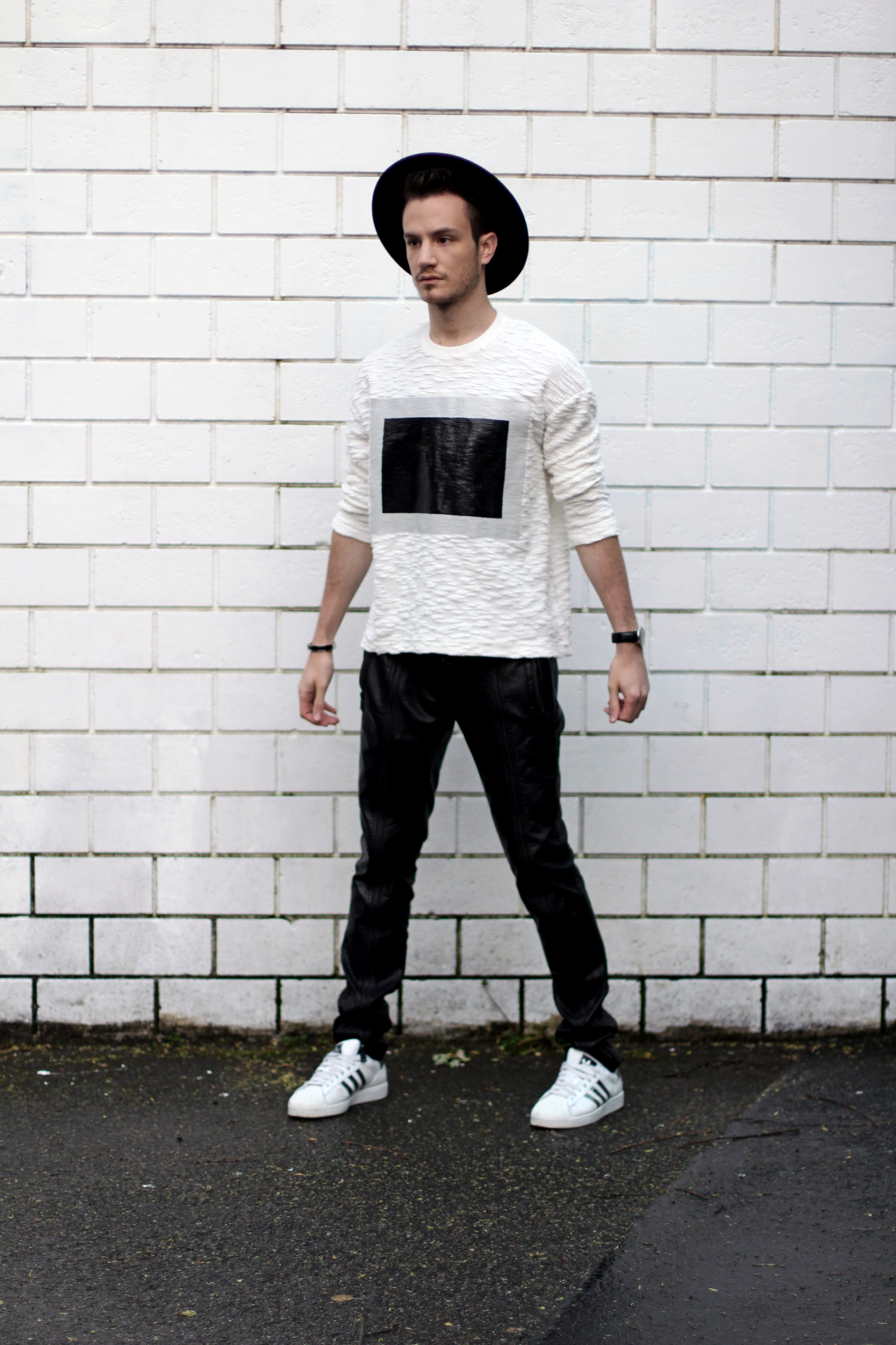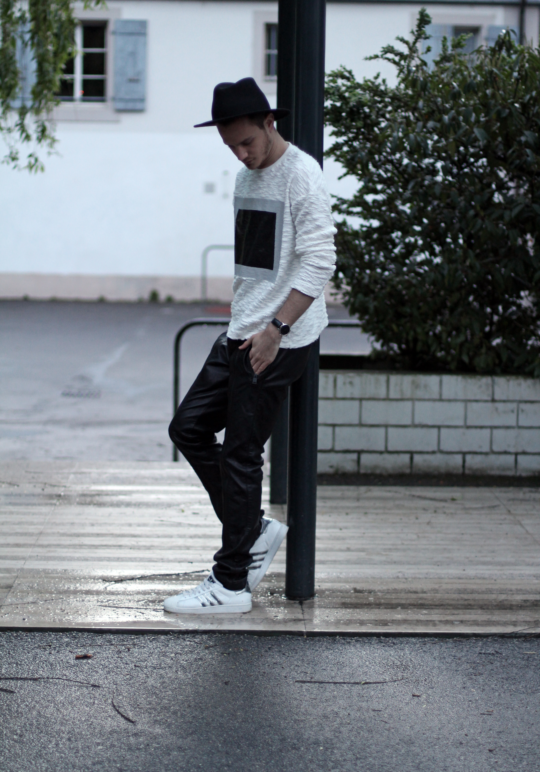 I wanted to keep the sporty feel of the sweater but also play with the idea of texture. Since the center part of the rectangle looks like leather, I echoed this aspect with these (fake) leather pants from Zara. I completed the look with Adidas classic superstar sneakers and a black hat.
