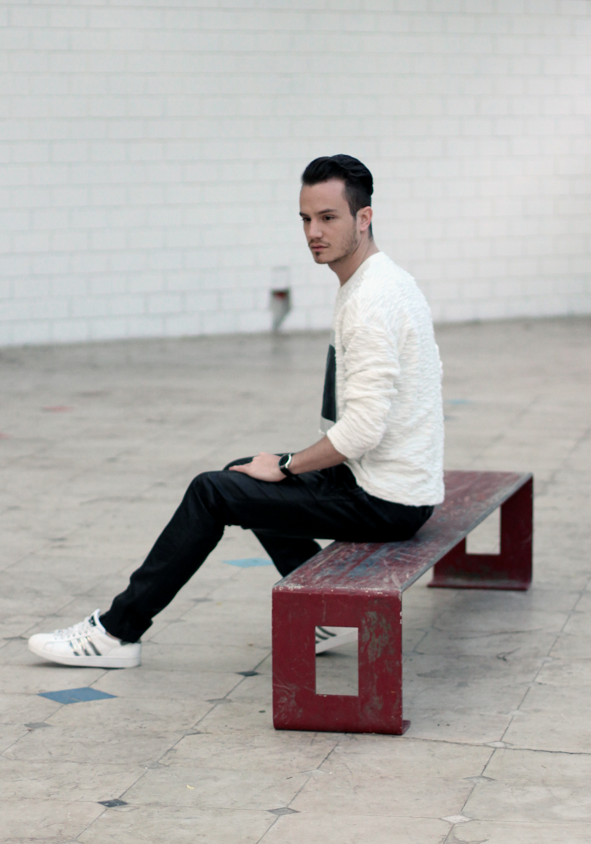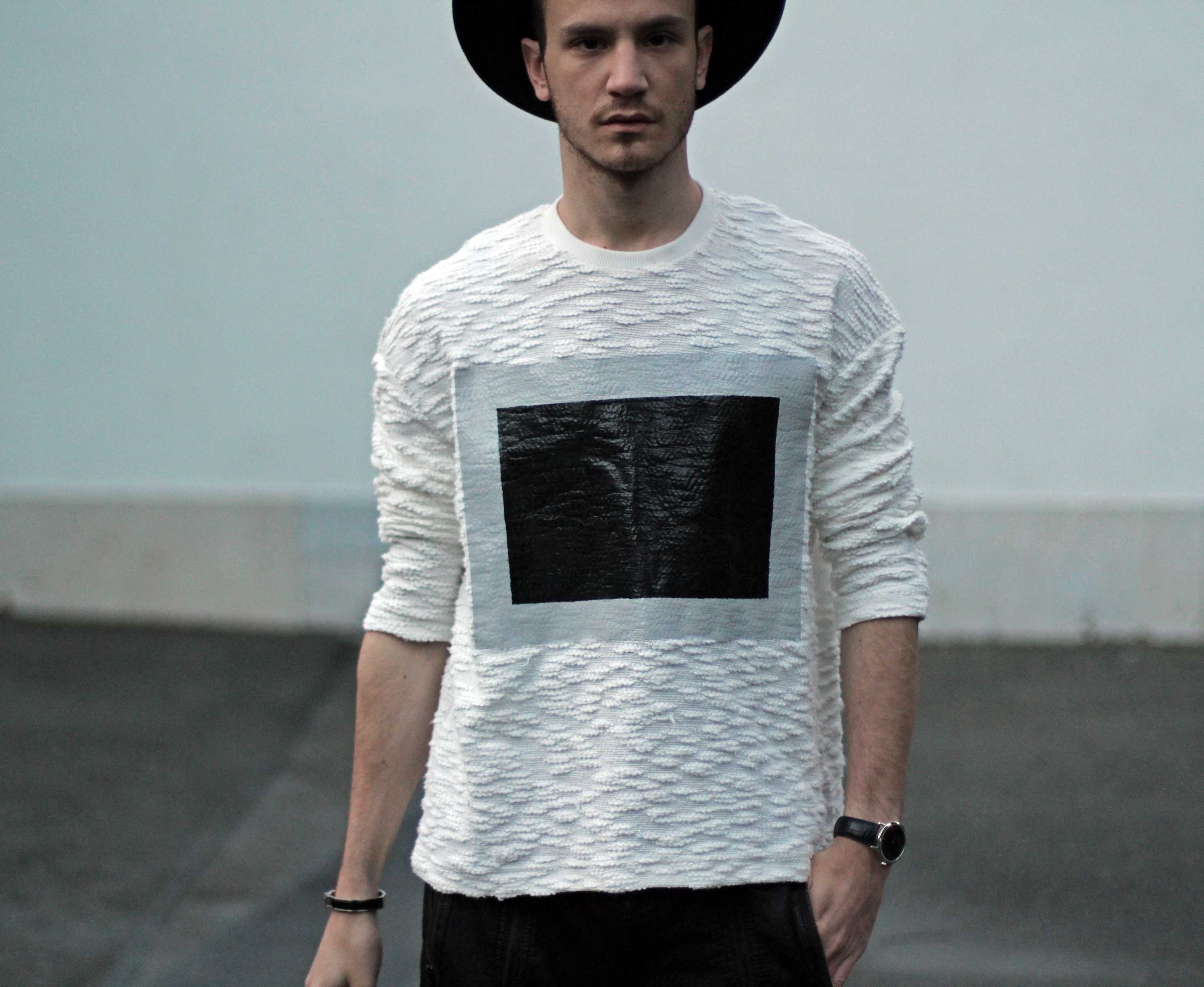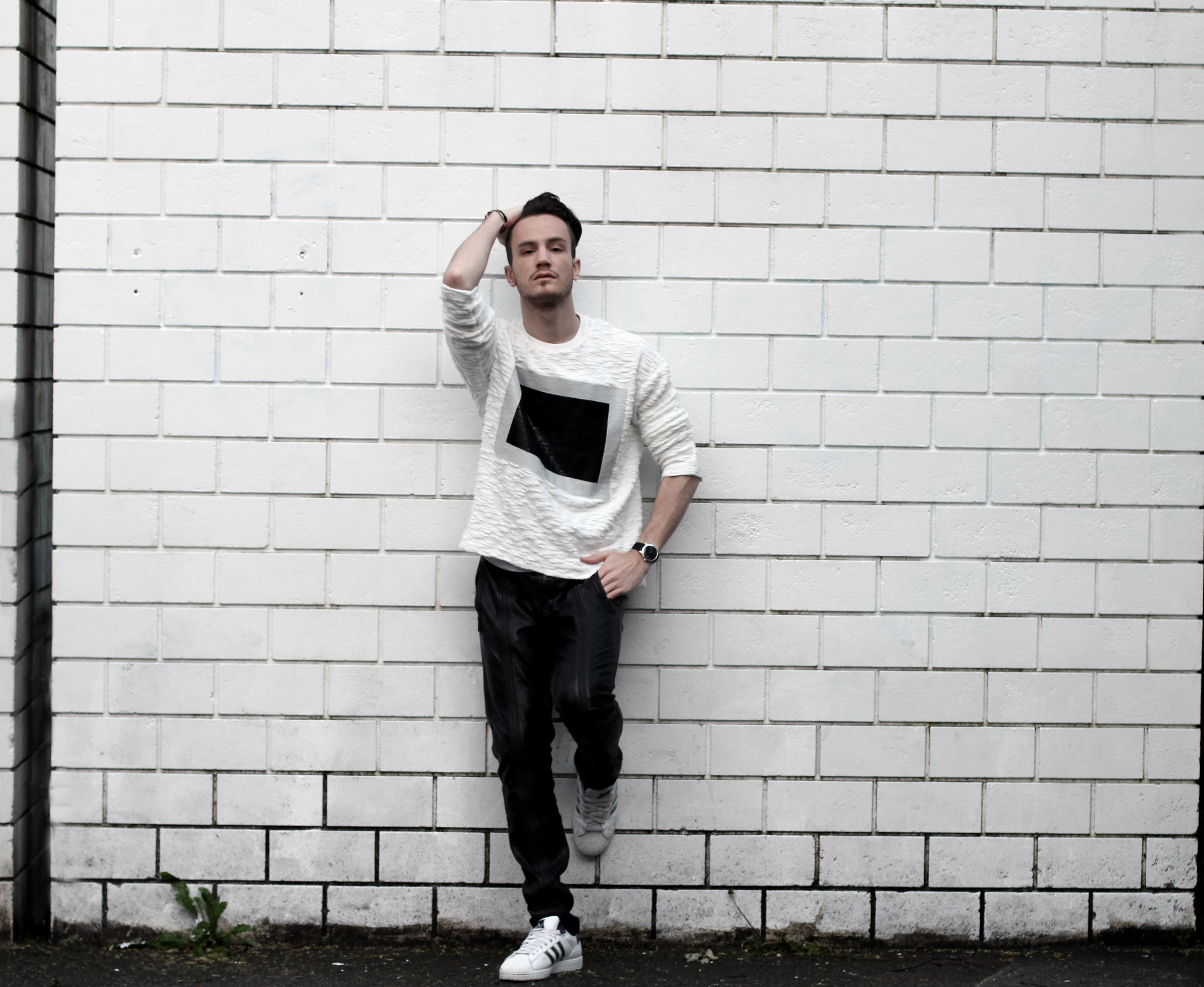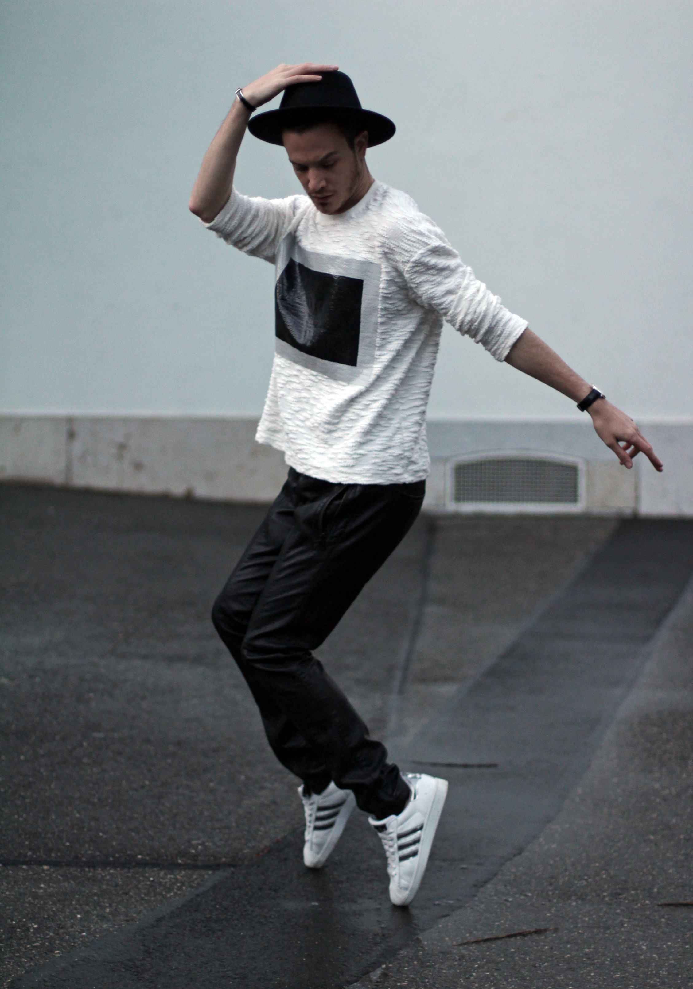 I wanted to keep the sporty feel of the sweater but also play with the idea of texture. Since the center part of the rectangle looks like leather, I echoed this aspect with these (fake) leather pants from Zara. I completed the look with Adidas classic superstar sneakers and a black hat.
