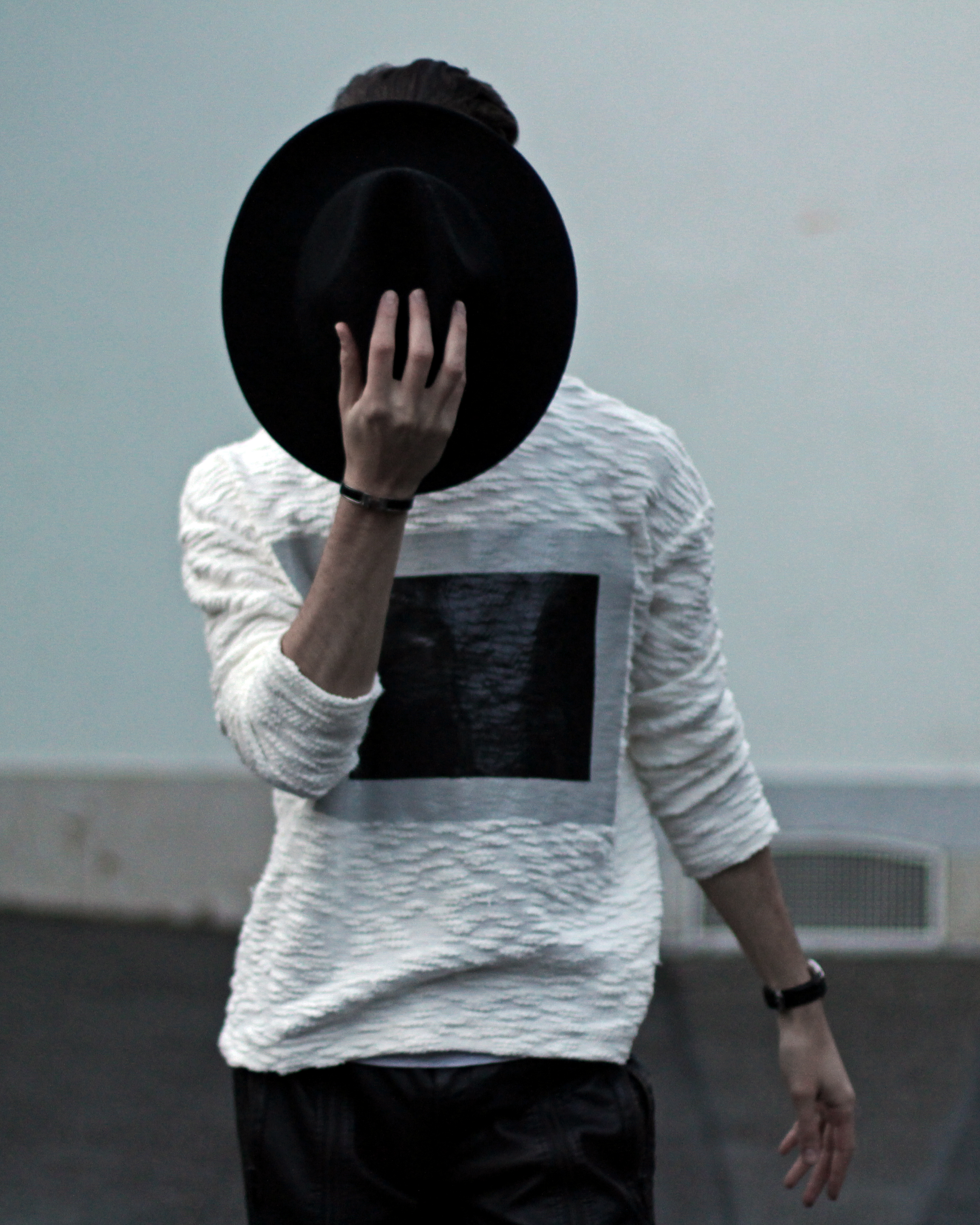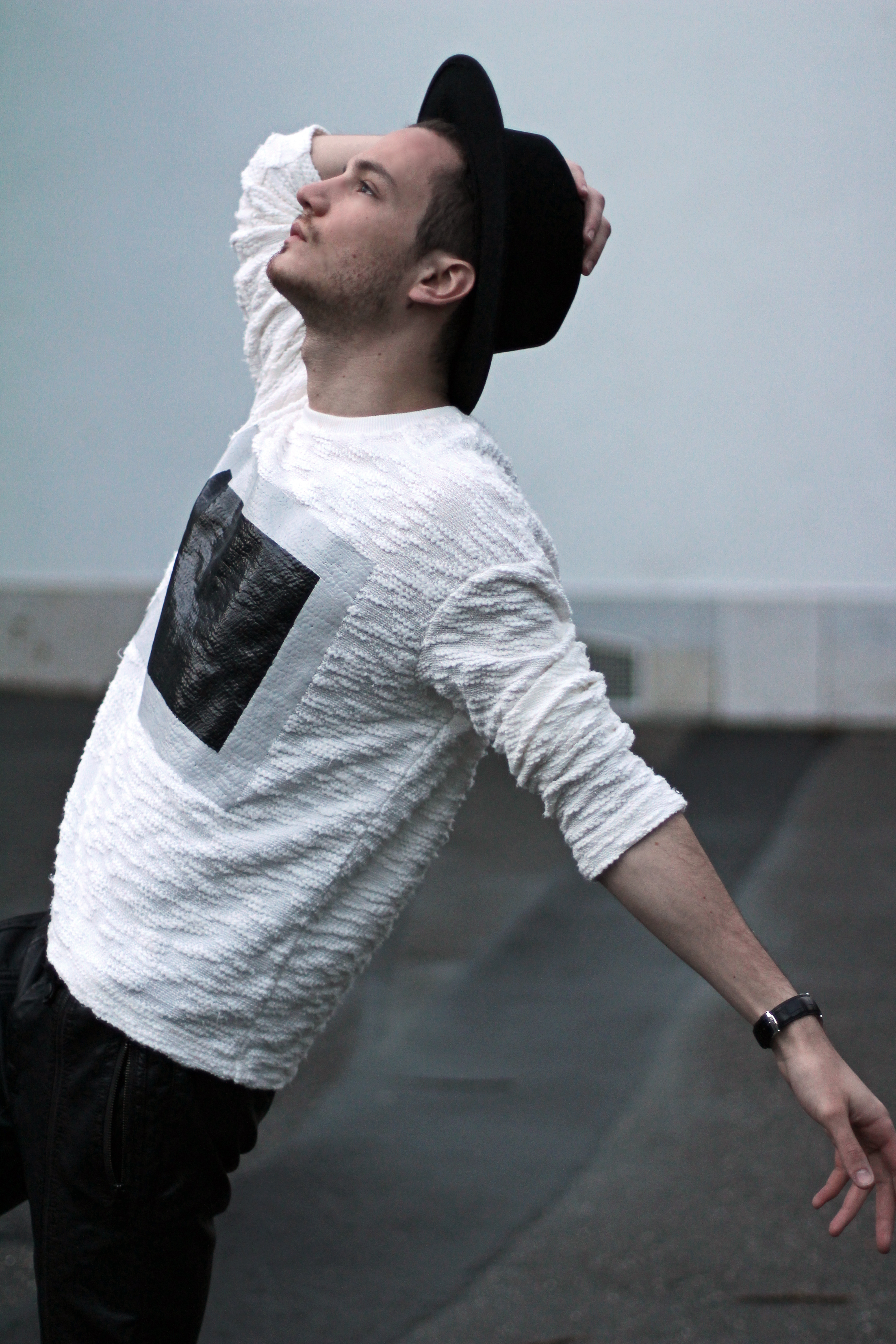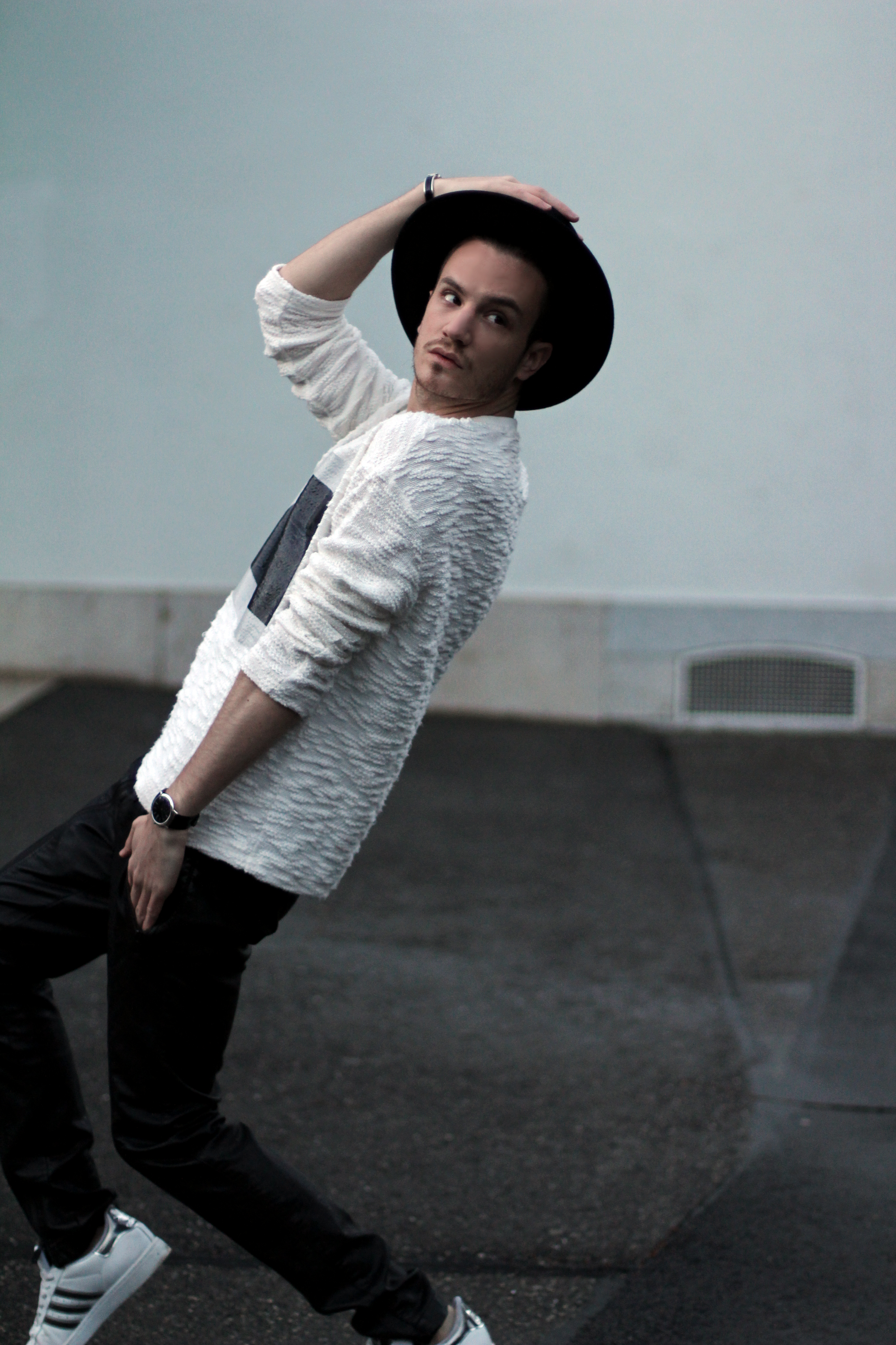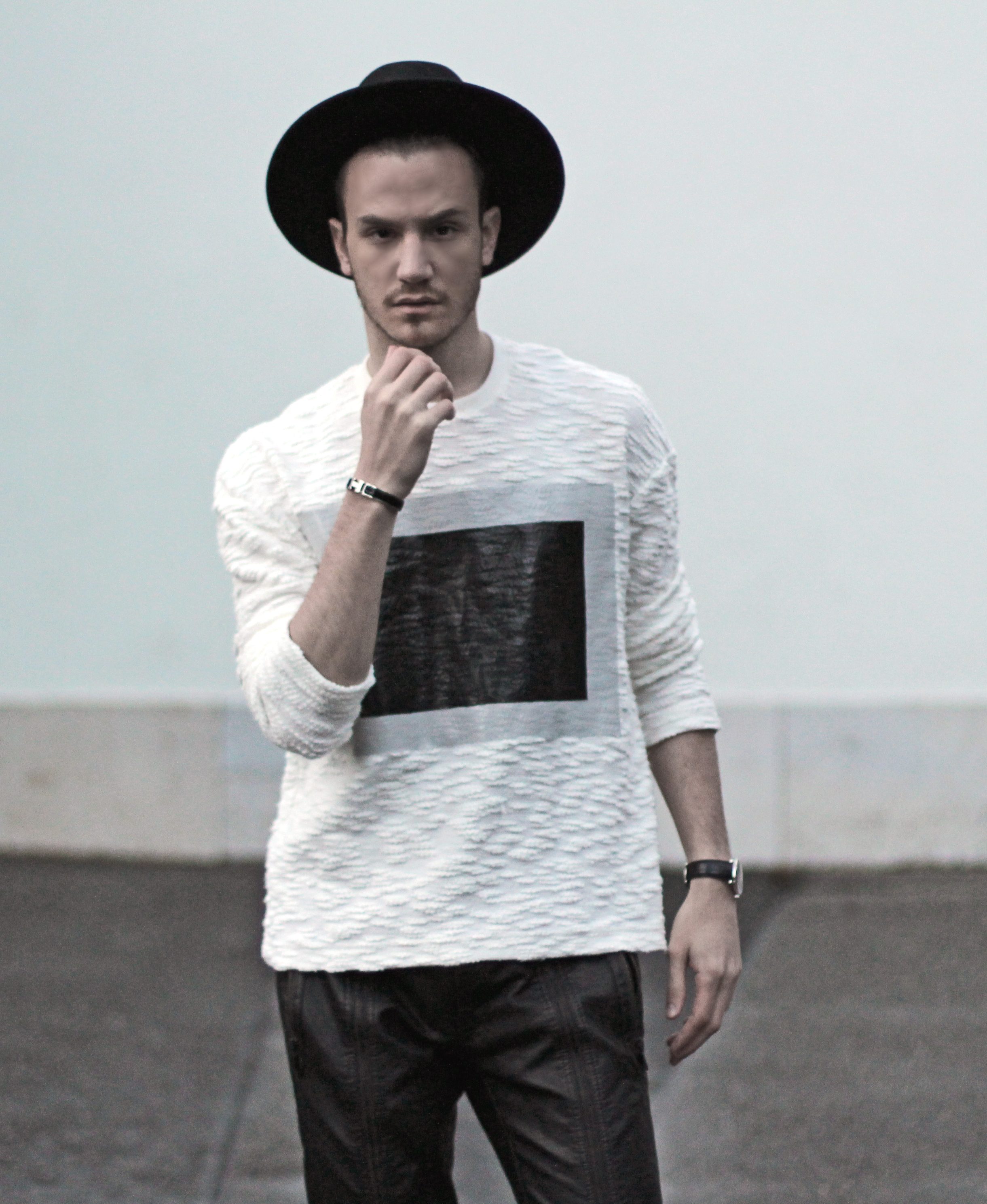 I wanted to keep the sporty feel of the sweater but also play with the idea of texture. Since the center part of the rectangle looks like leather, I echoed this aspect with these (fake) leather pants from Zara. I completed the look with Adidas classic superstar sneakers and a black hat.