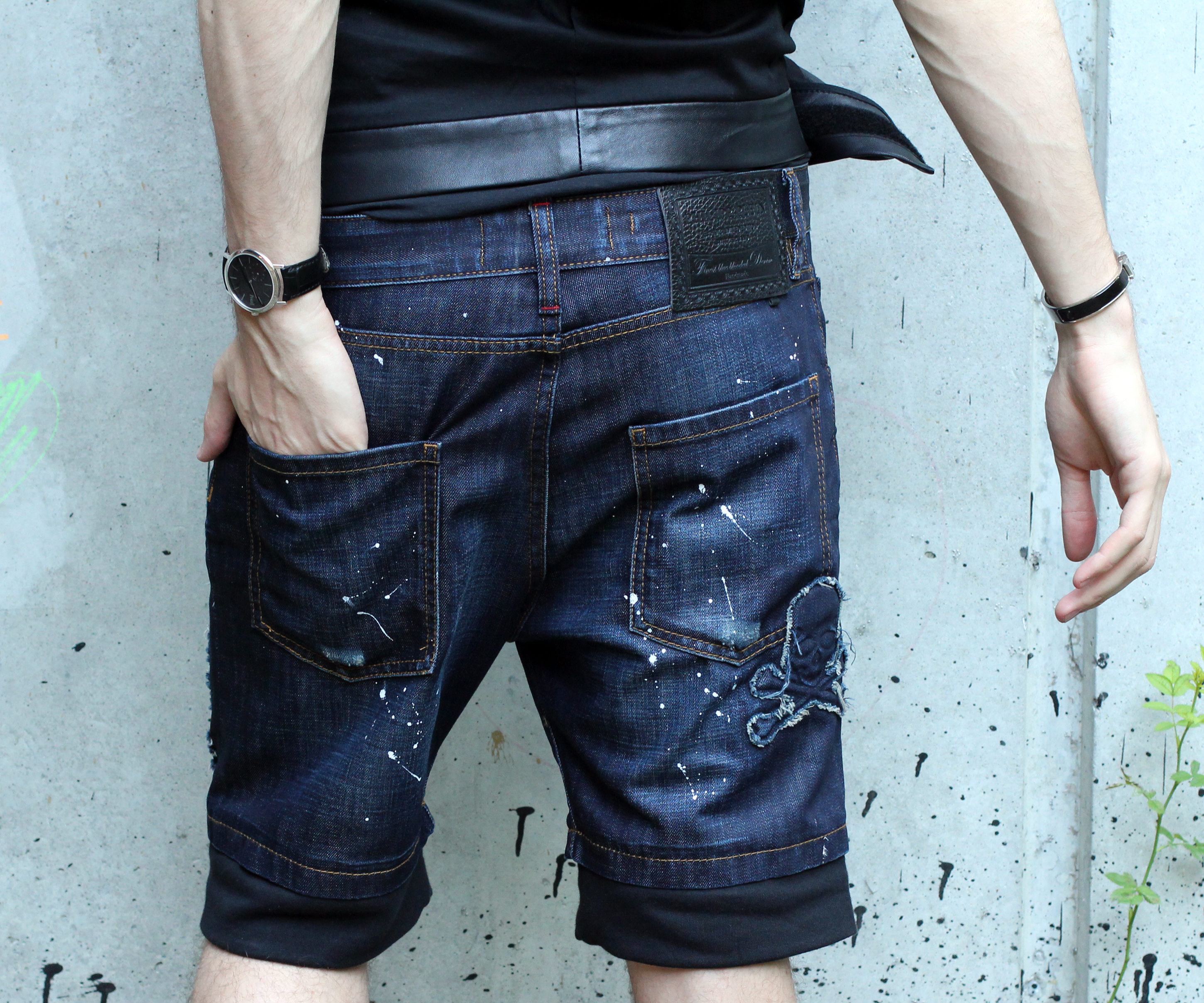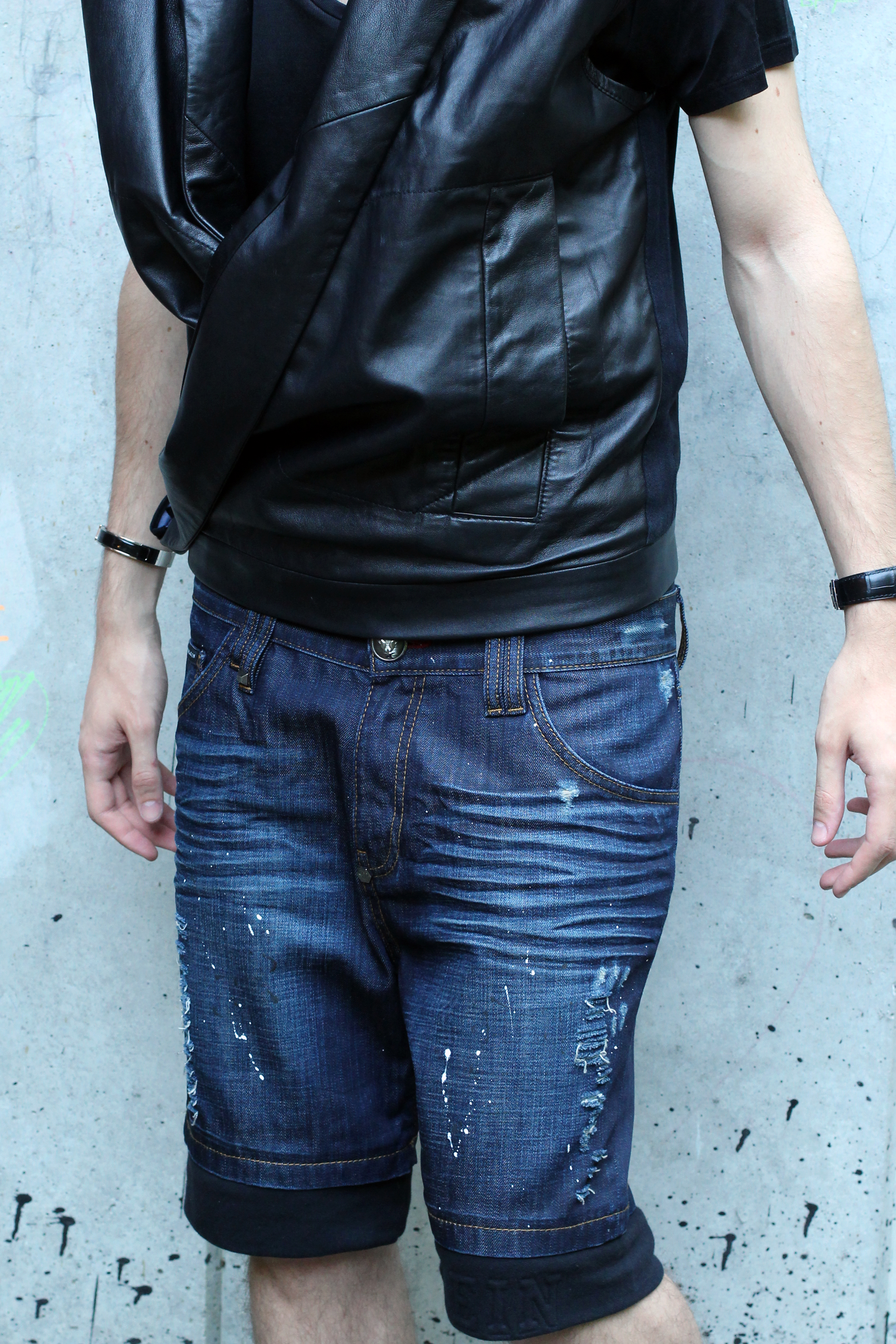 I fell in love with these destroyed denim shorts by Philipp Plein (find another model here) . They’re really fun, mixing denim and sweatpants fabrics, and a lot of work has been done on it to give this “destroyed” and painted on aspect.