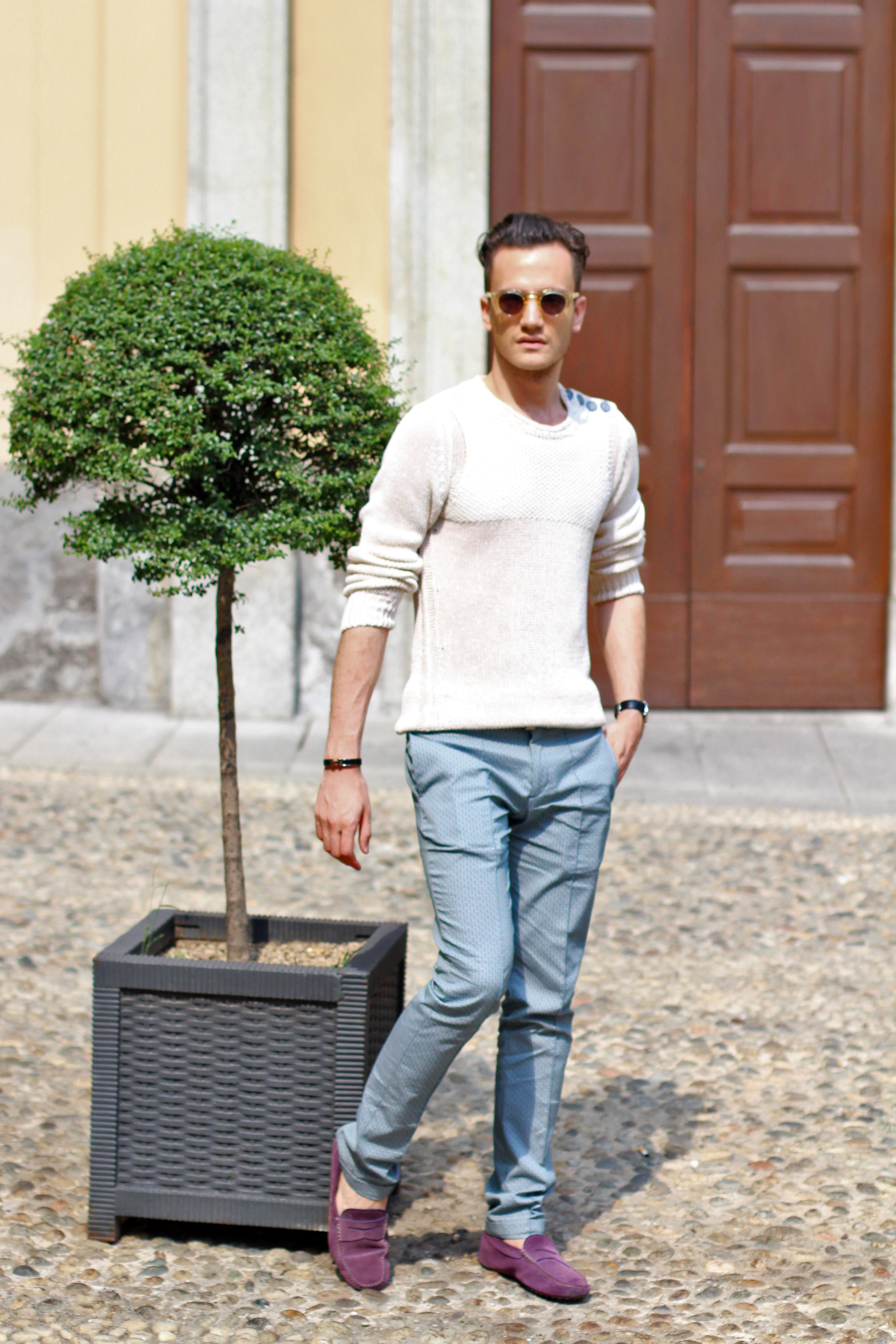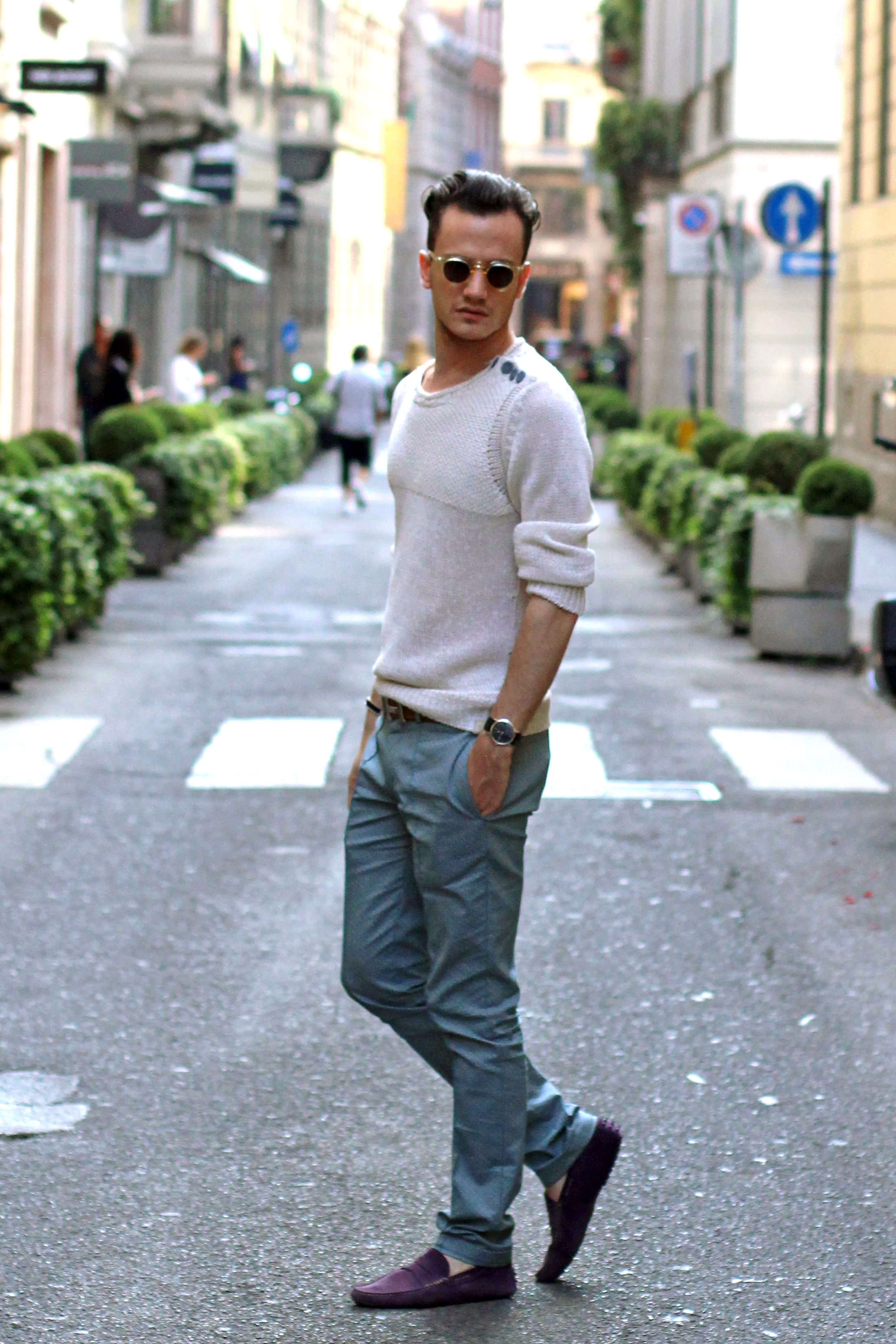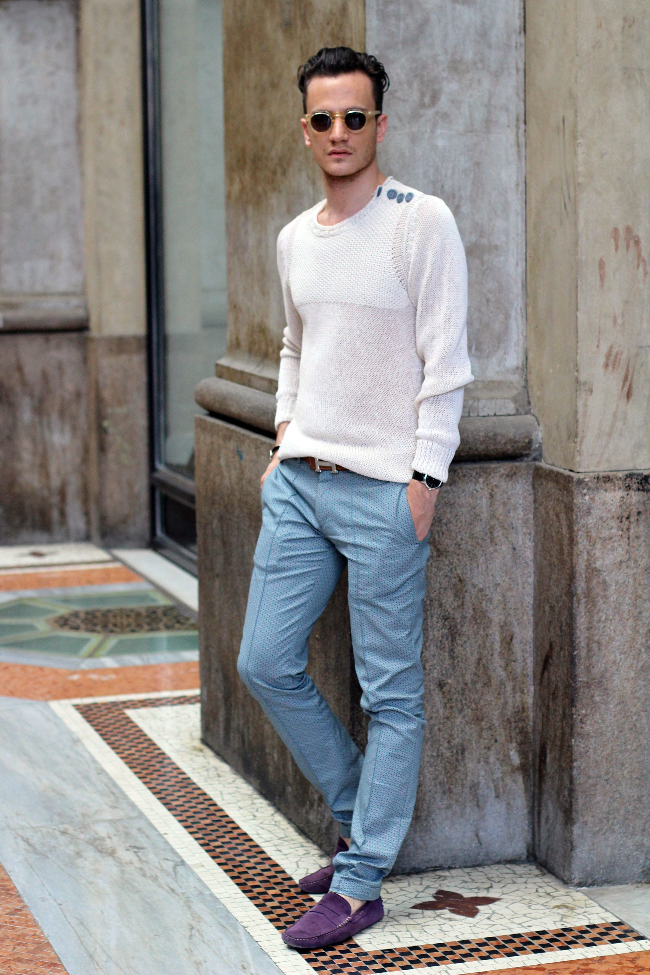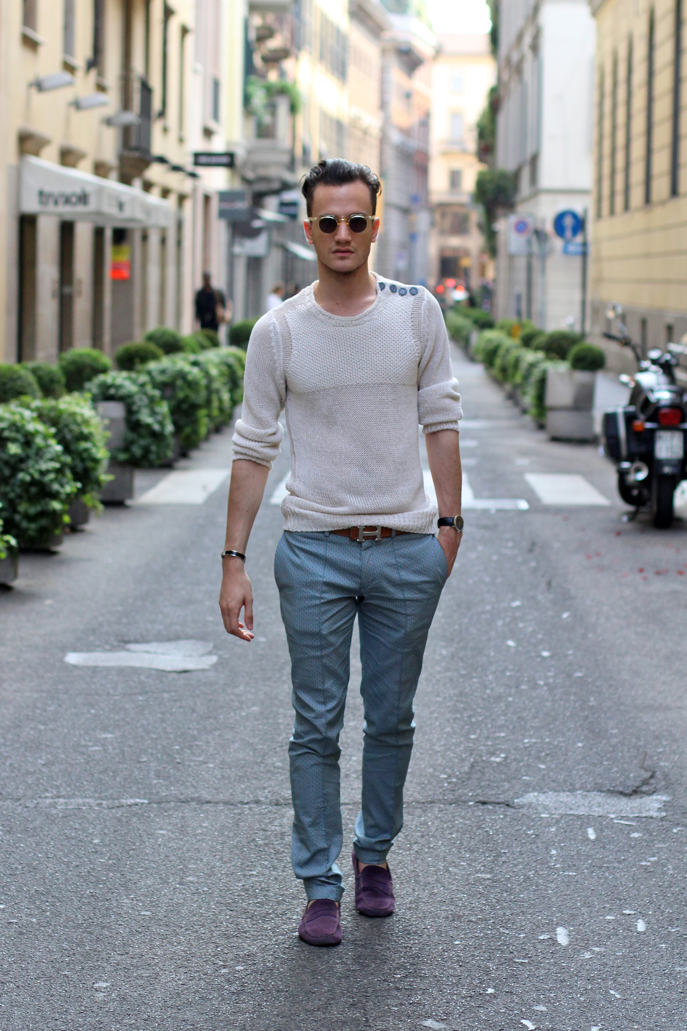 Diesel mesh sweater paired with these Zara limited edition print trousers, and purple Tod’s for a nice and summery touch of color.
