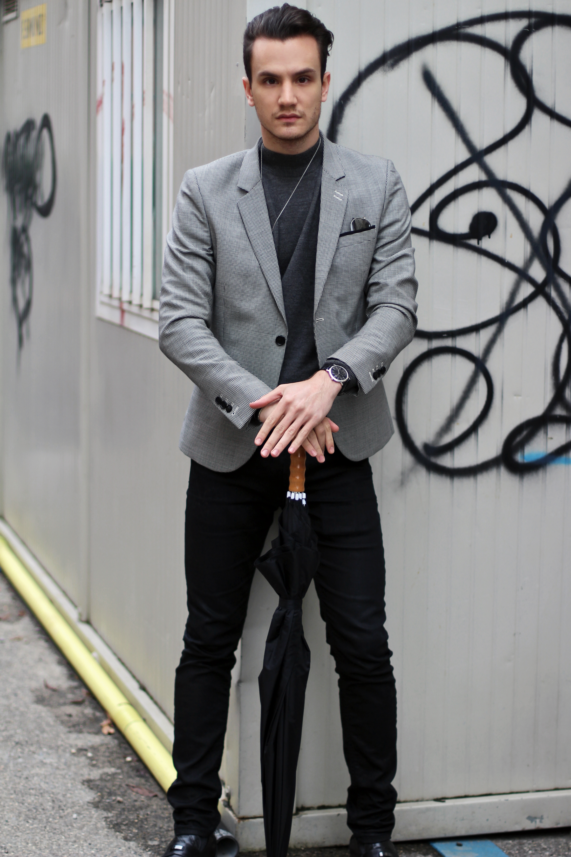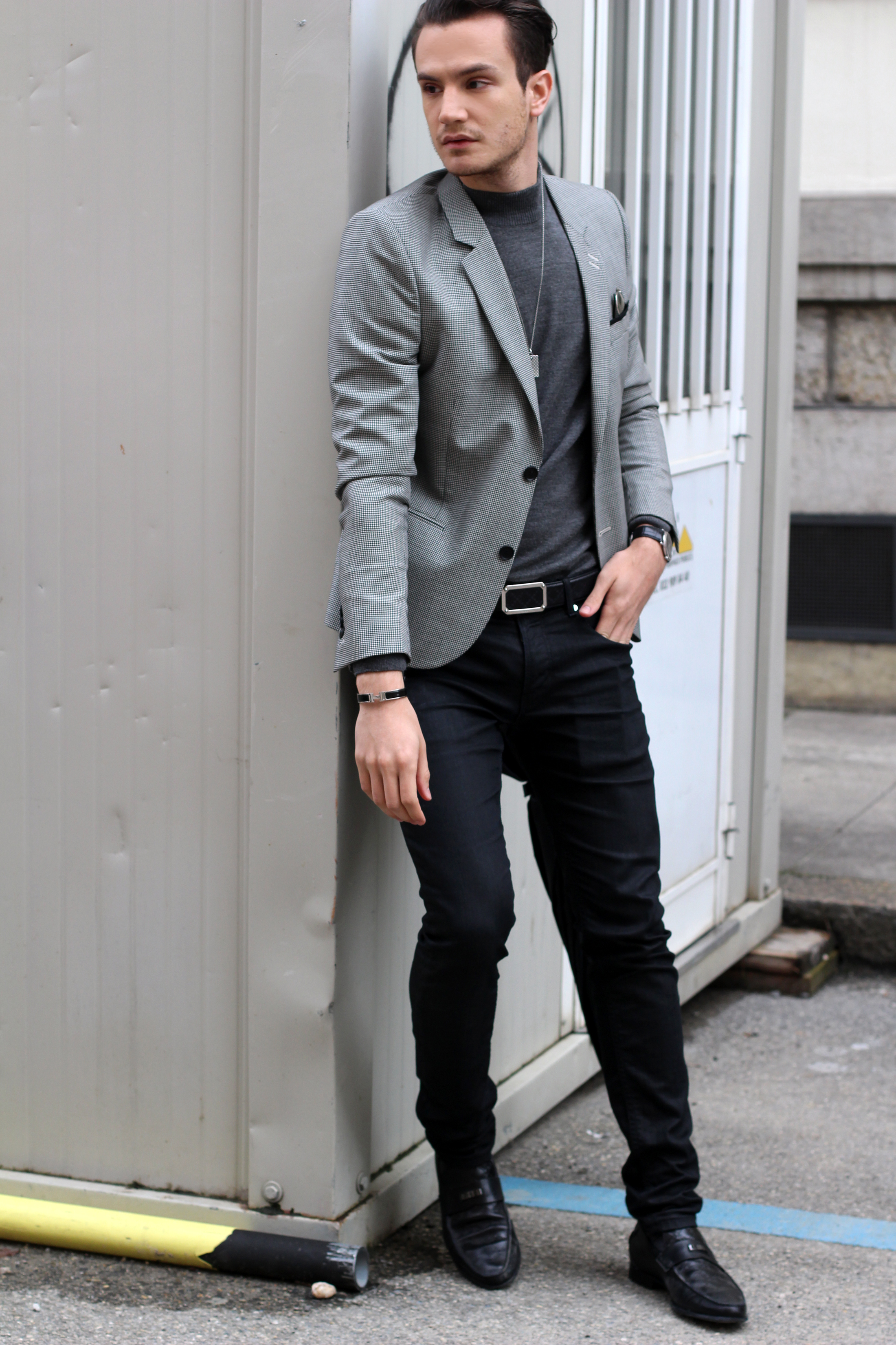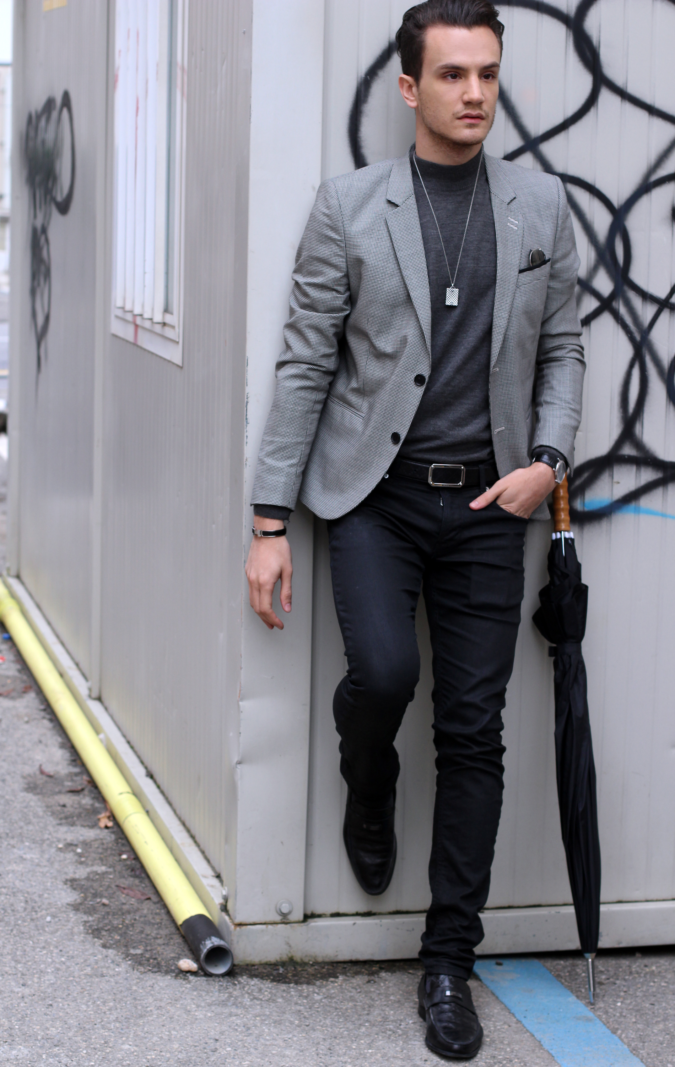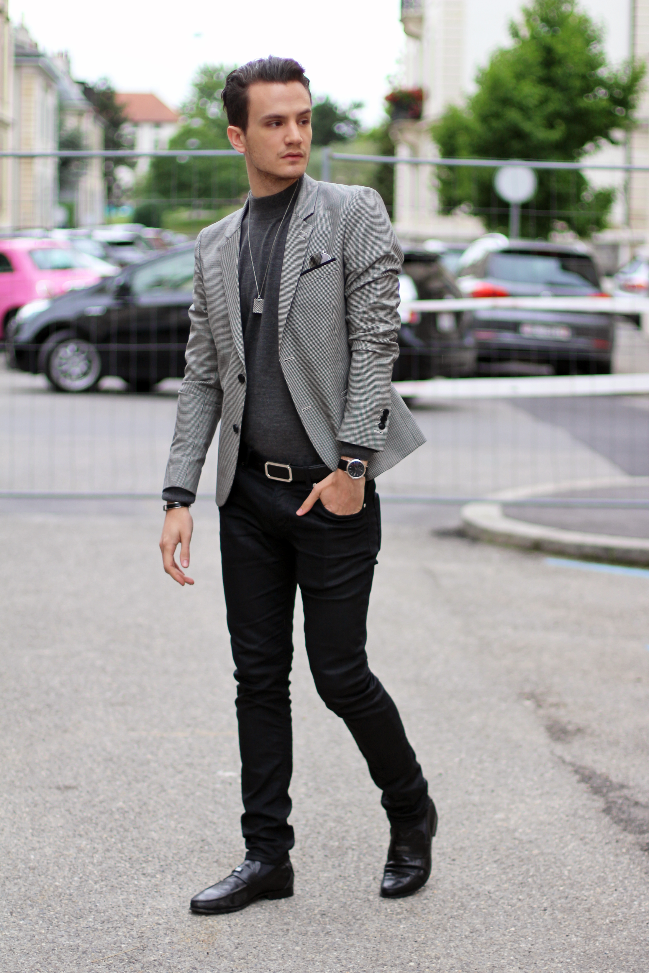 I never thought I’d be wearing this grey wool turtleneck in July… I styled it with these slim-fit dark black ZARA jeans. I made the jeans look more formal thanks to this pair of Versace loafers. I threw in this The Kooples micro houndstooth print jacket, for a chich sophisticated touch. The Bottega Veneta silver necklace lights up the darker shade of the turtleneck.