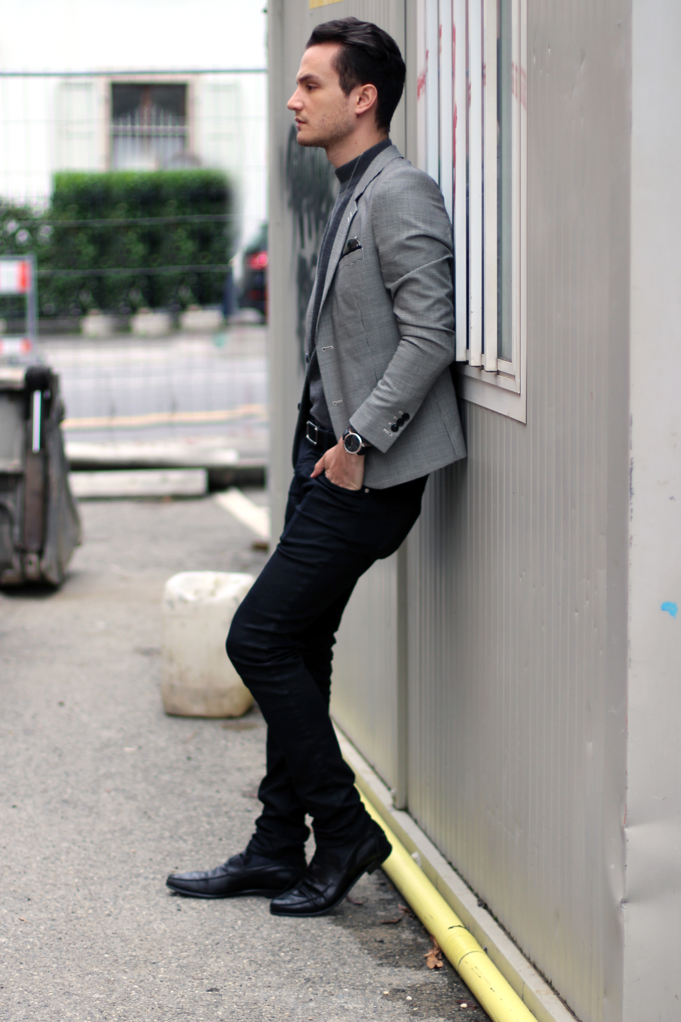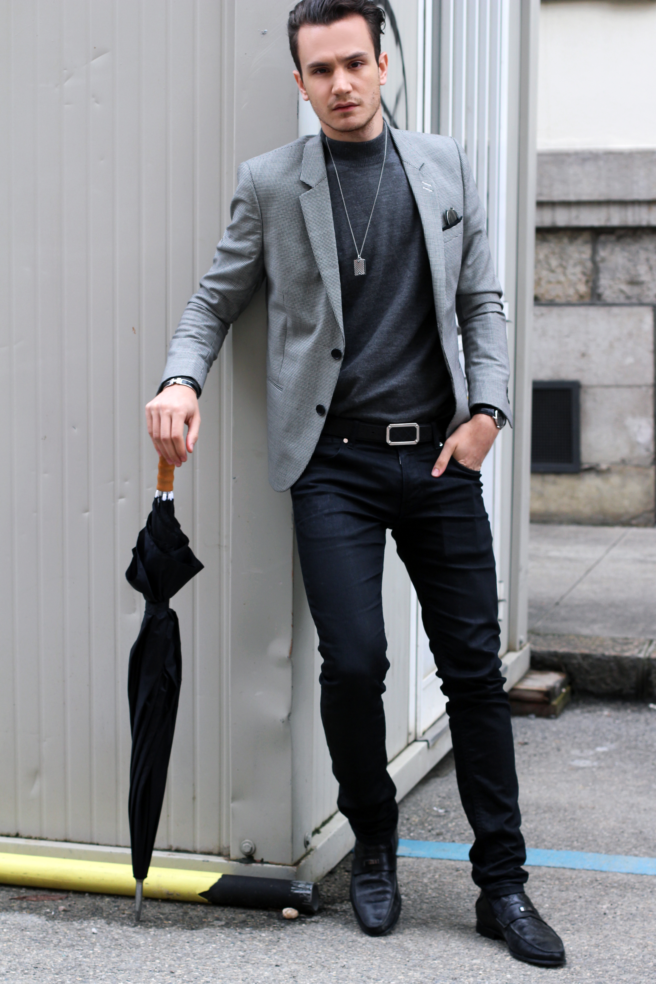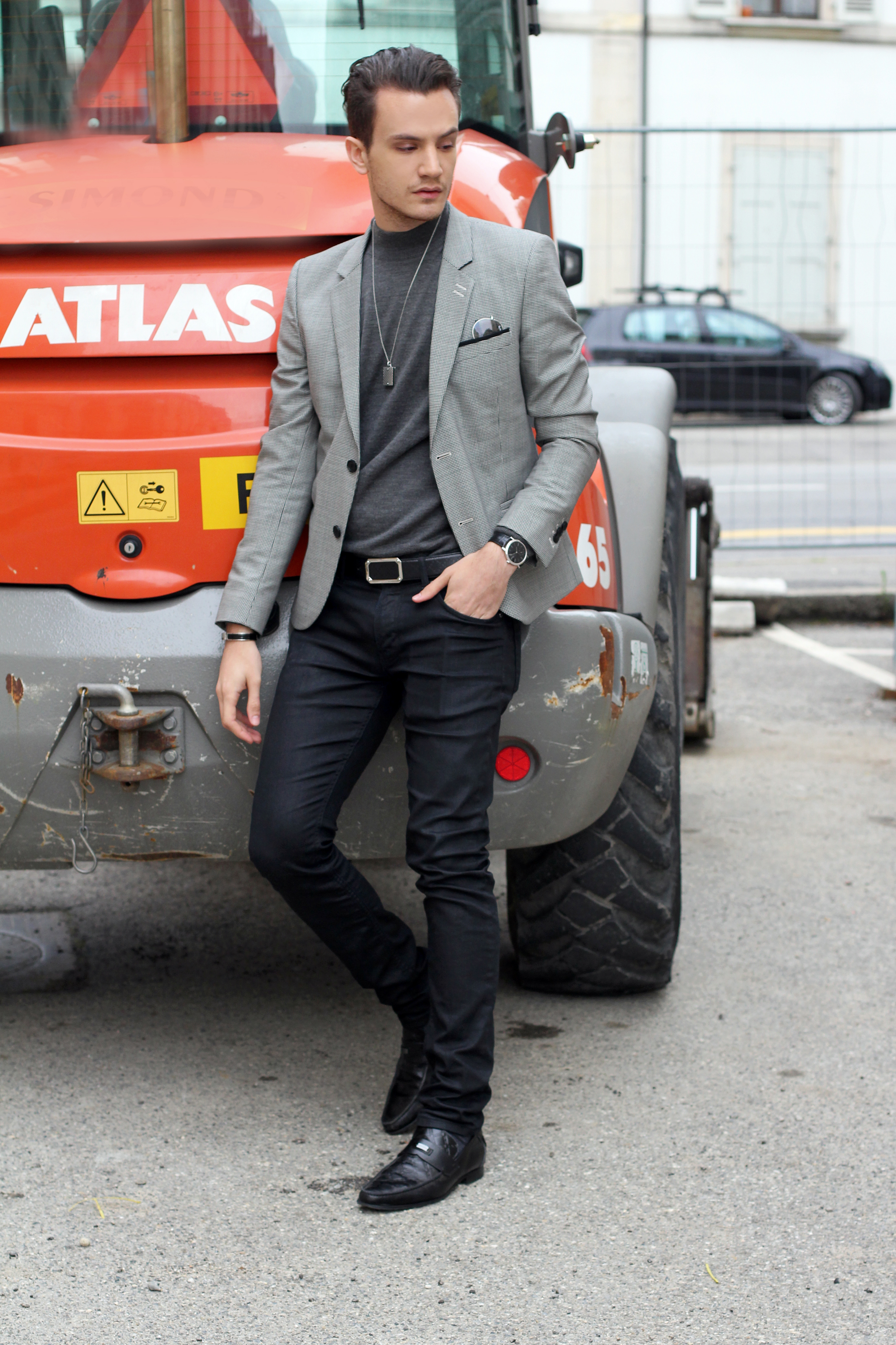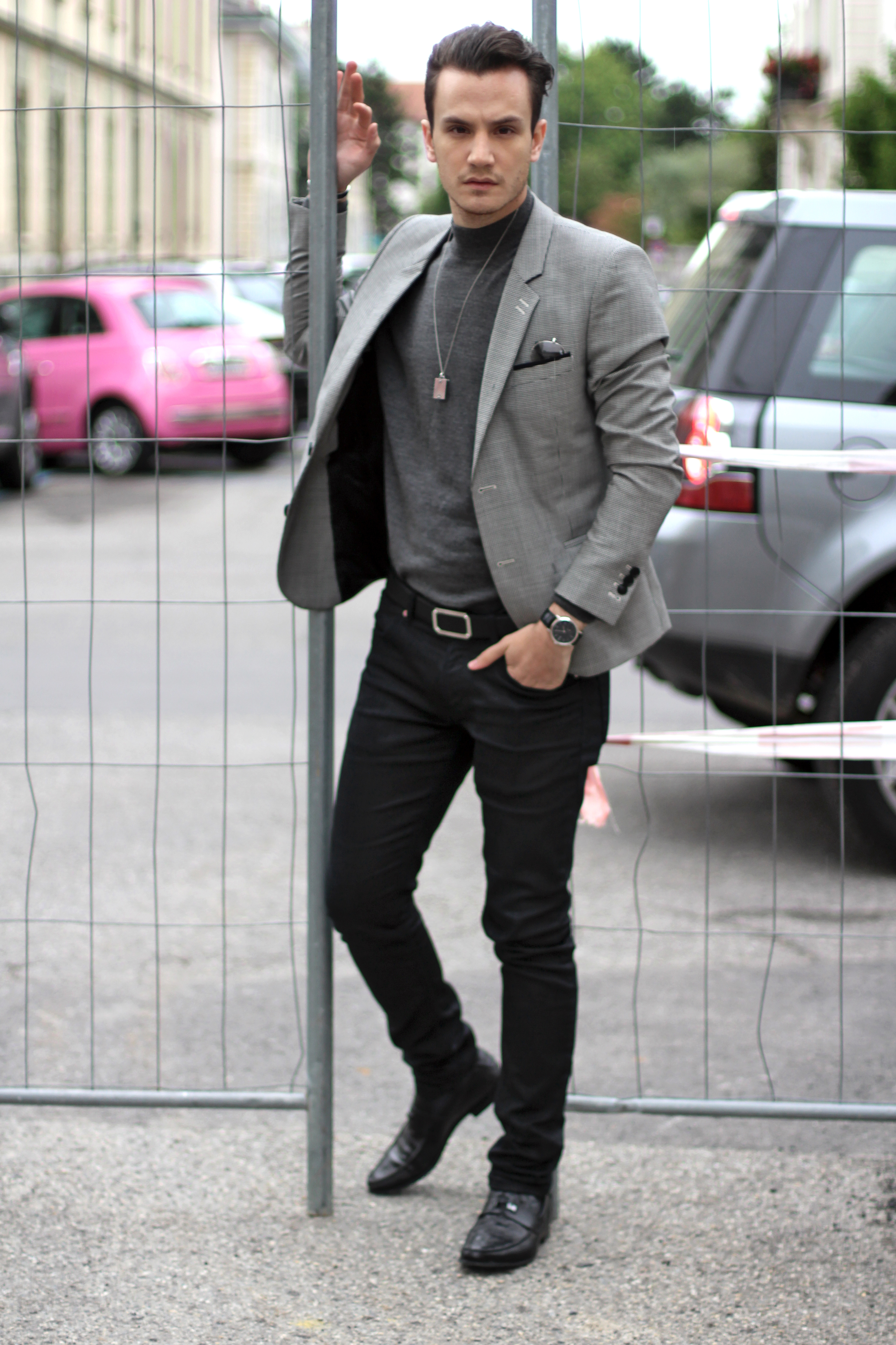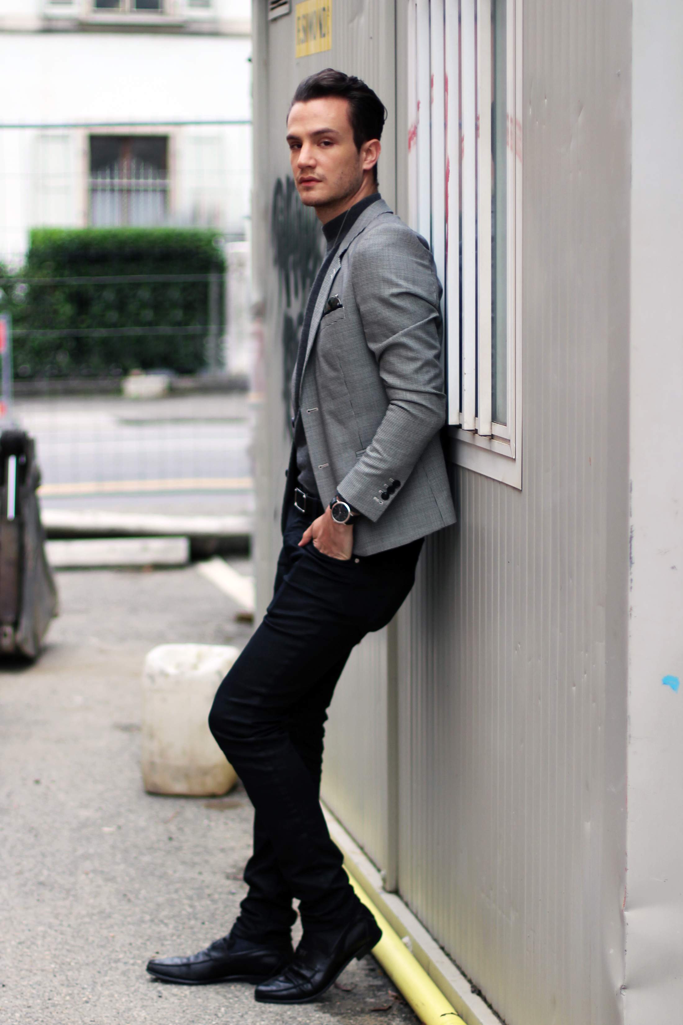 I never thought I’d be wearing this grey wool turtleneck in July… I styled it with these slim-fit dark black ZARA jeans. I made the jeans look more formal thanks to this pair of Versace loafers. I threw in this The Kooples micro houndstooth print jacket, for a chich sophisticated touch. The Bottega Veneta silver necklace lights up the darker shade of the turtleneck.