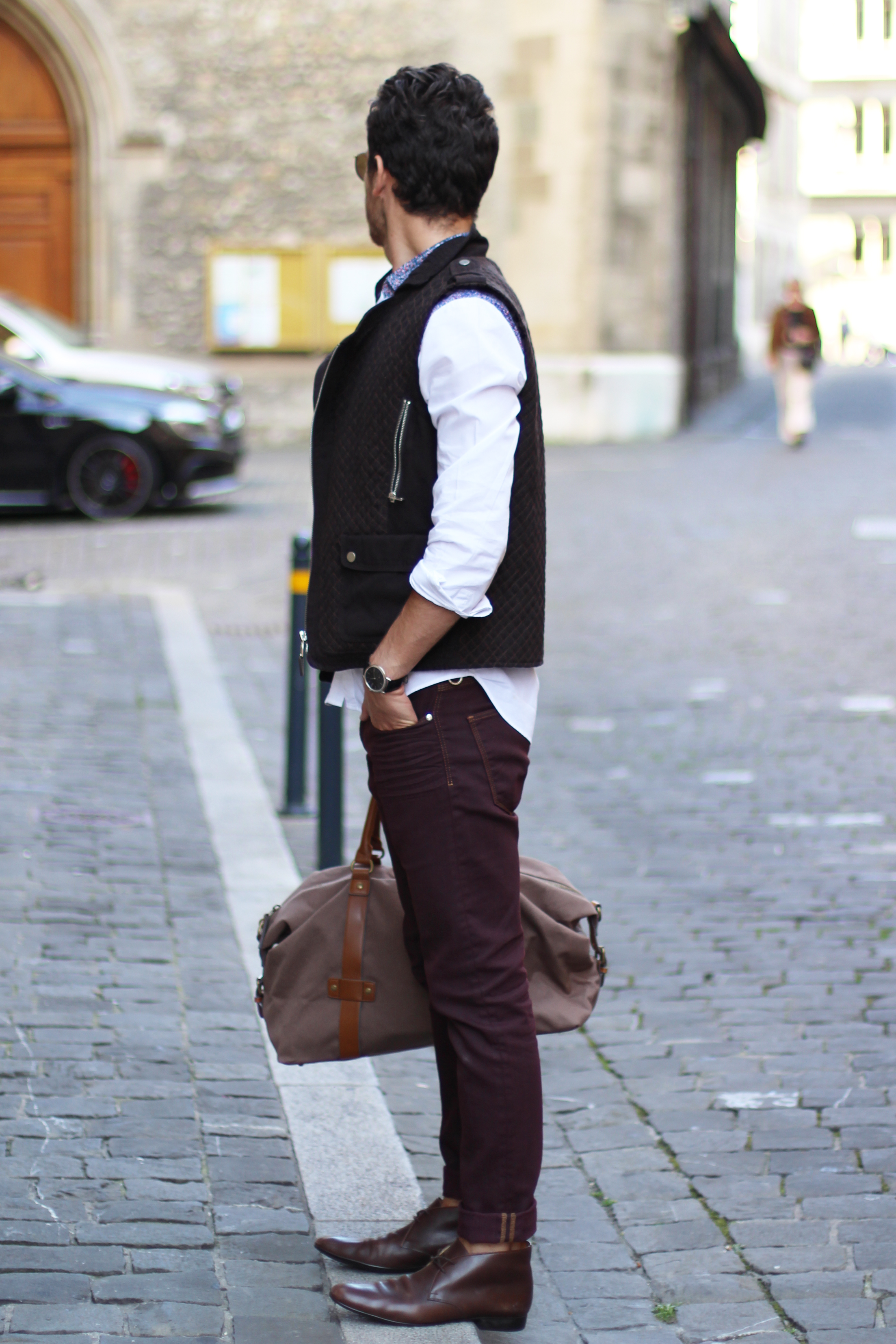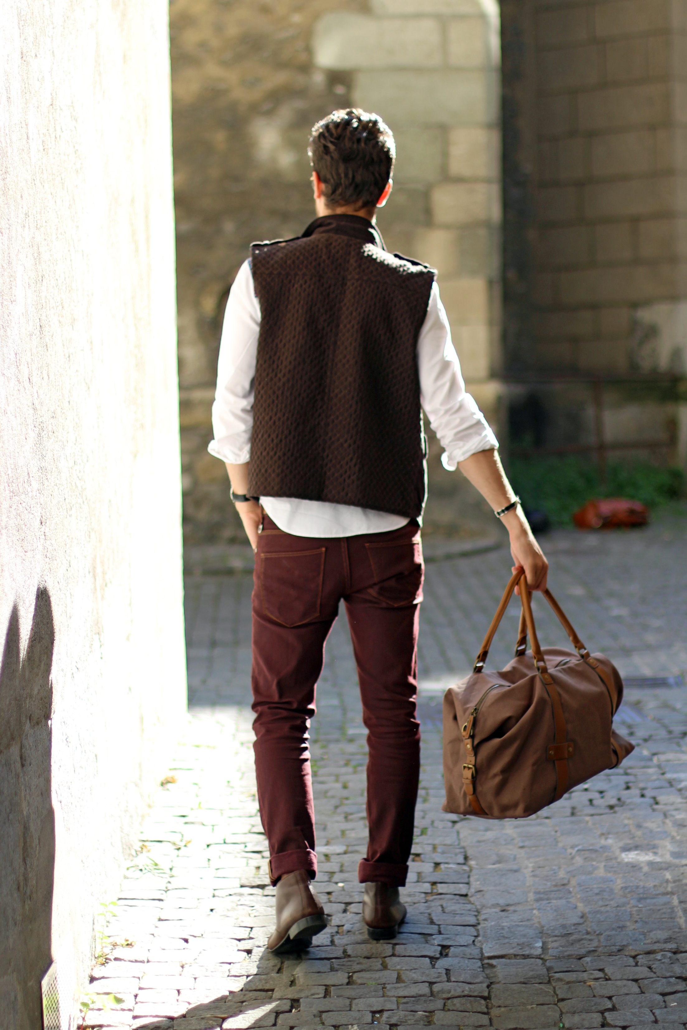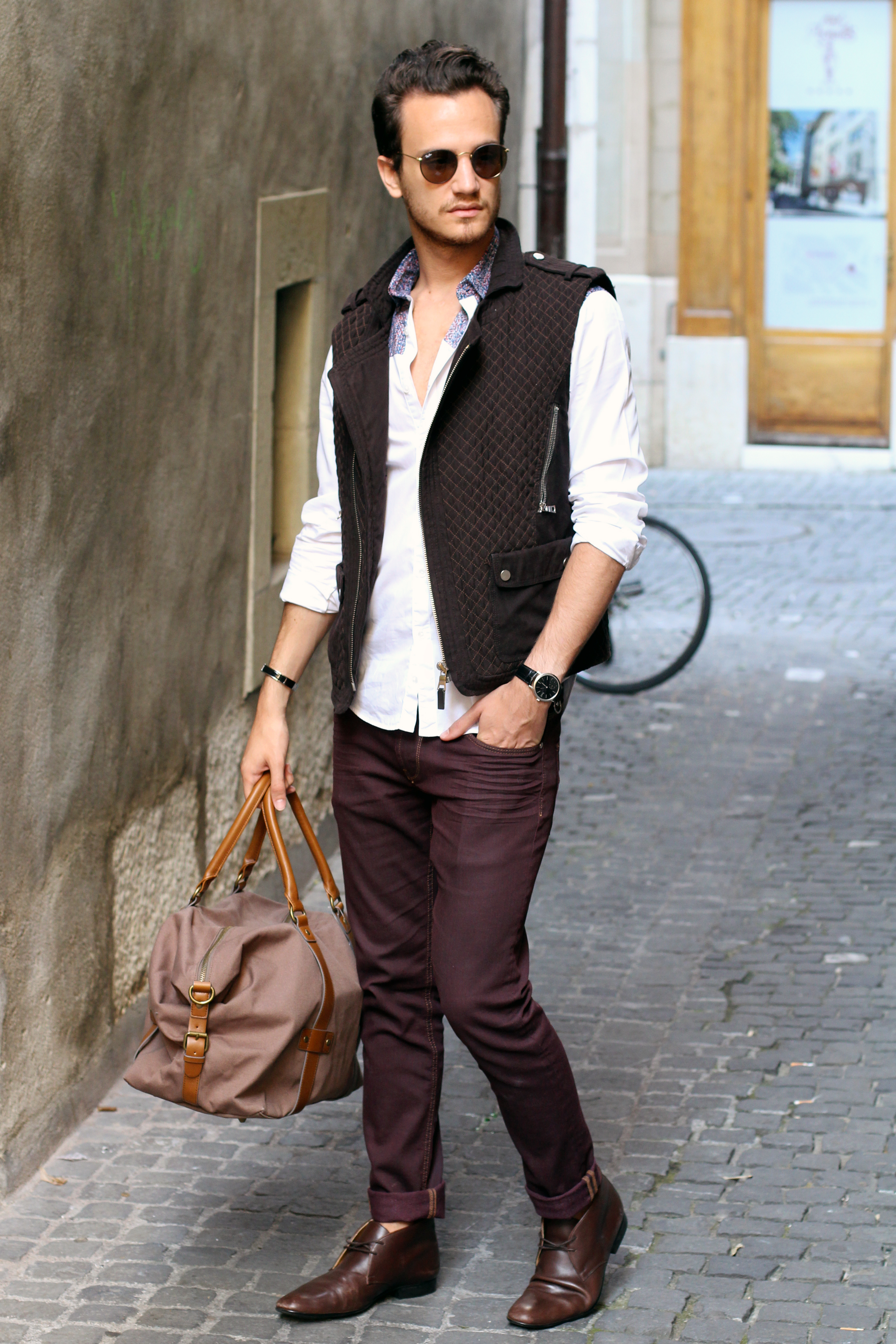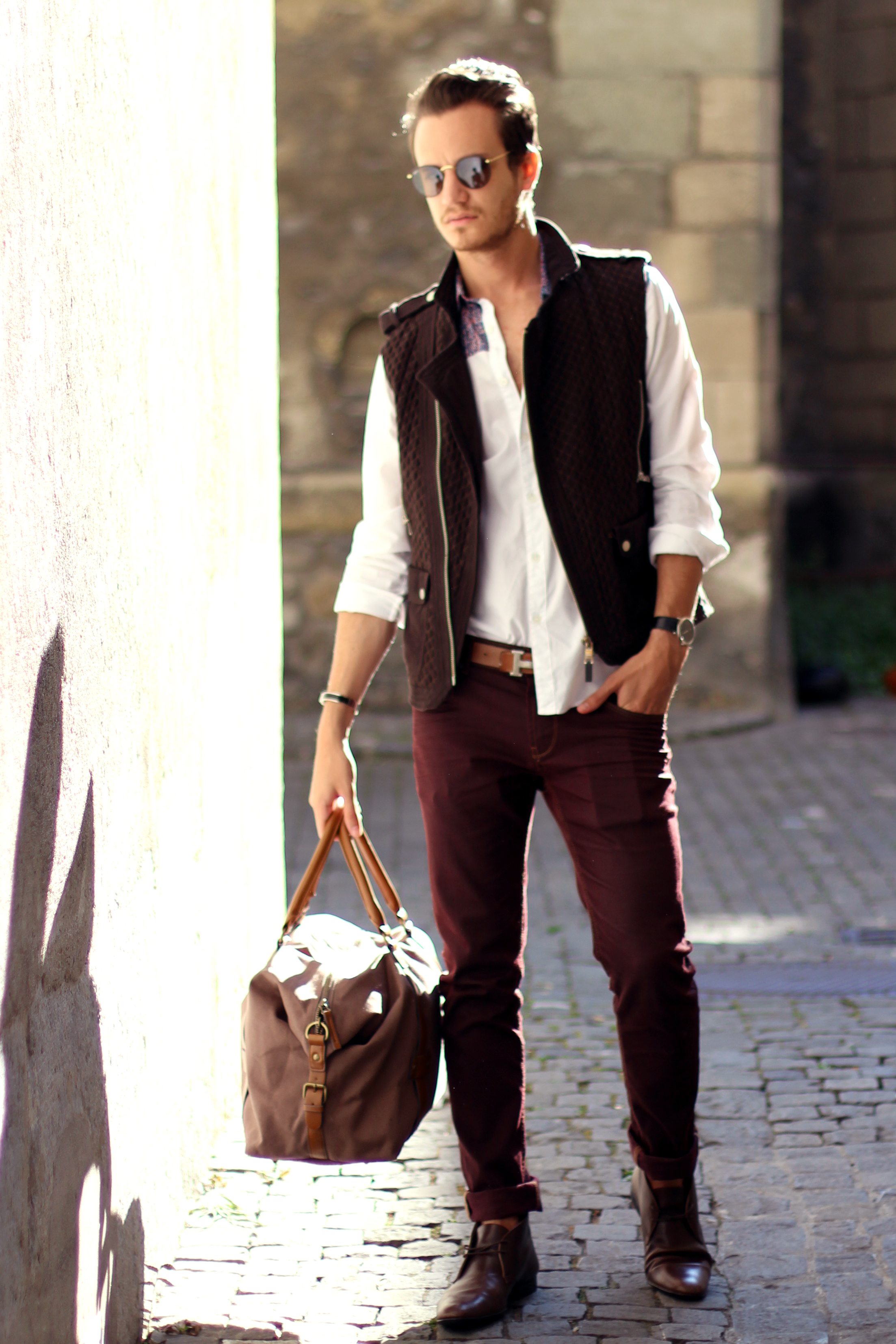I paired these zara burgundy jeans (similar here) with a brown cotton quilted vest, also by Zara, from a few years ago. The print on the white shirt echoes the color of the trousers while these Hermès leather boots and Hermès belt (find the same buckle I’m wearing here) match the vest.