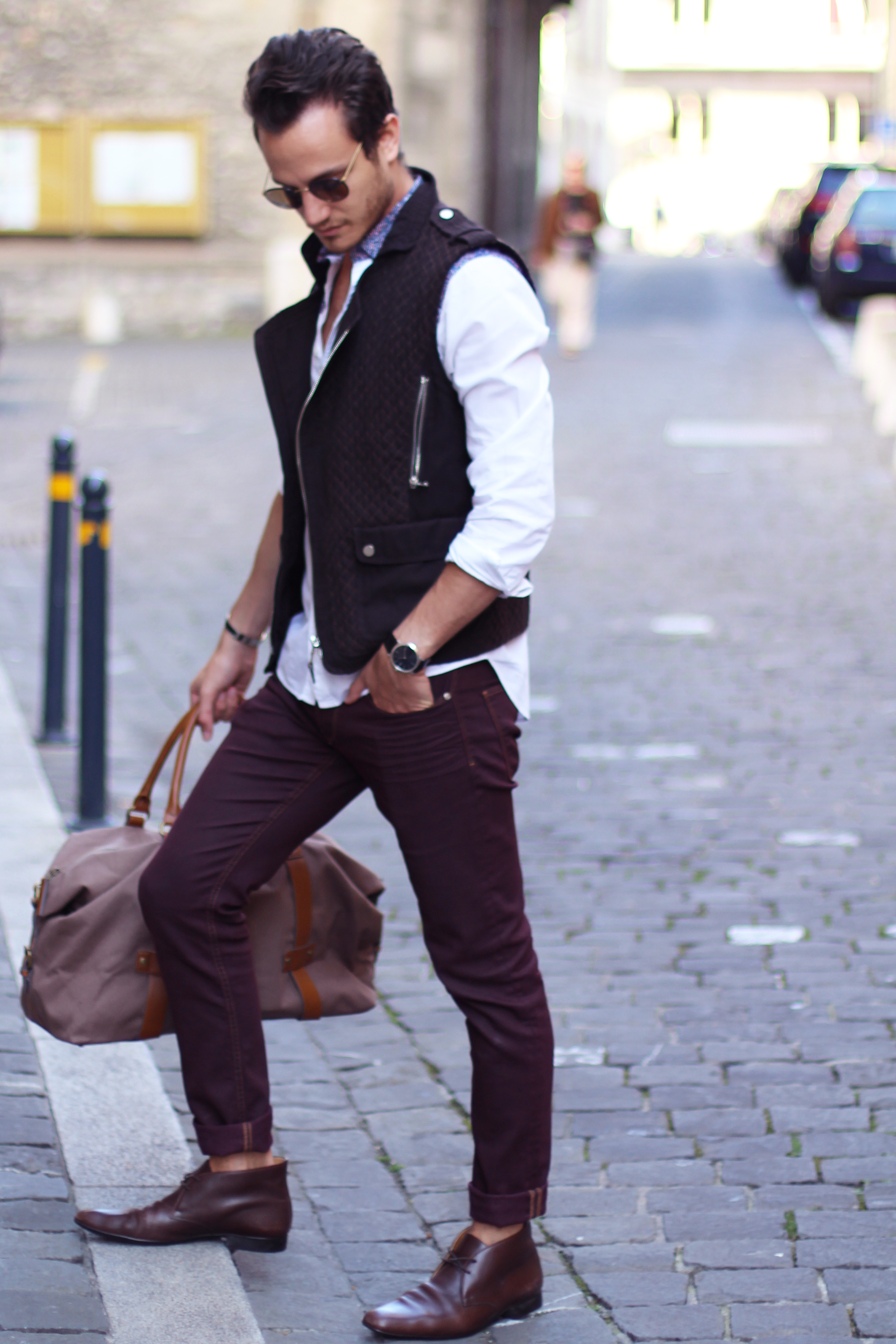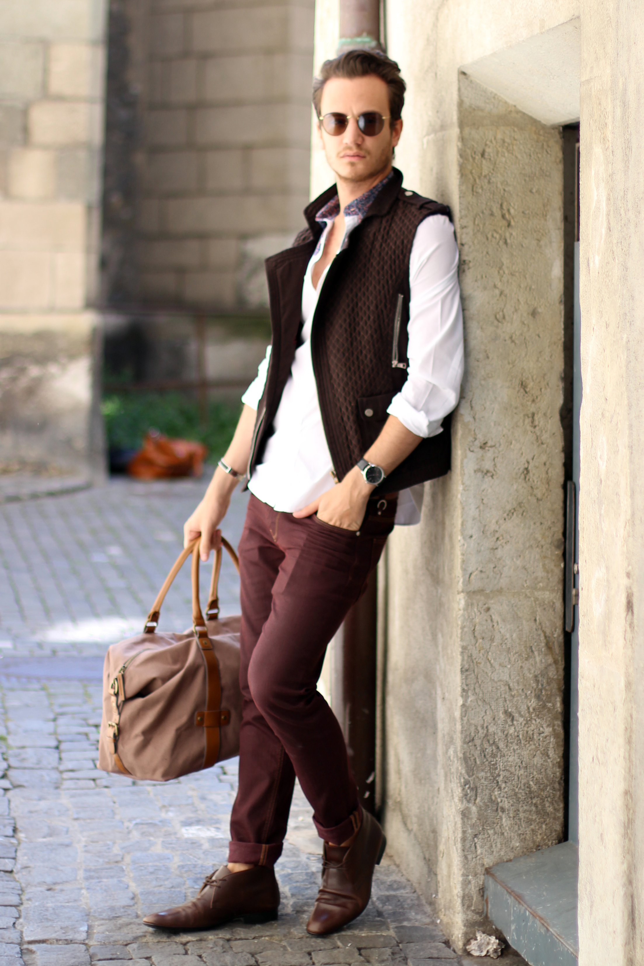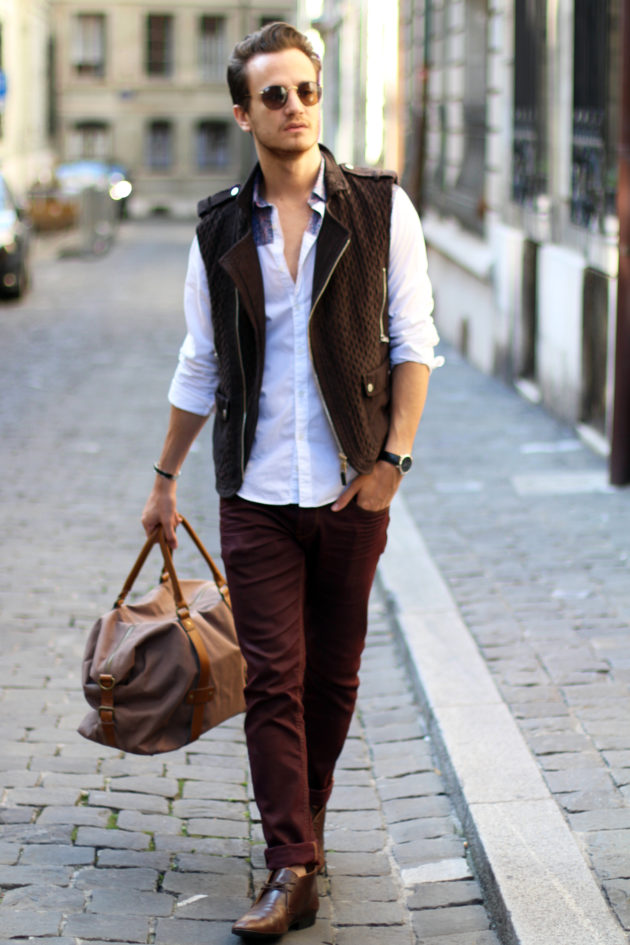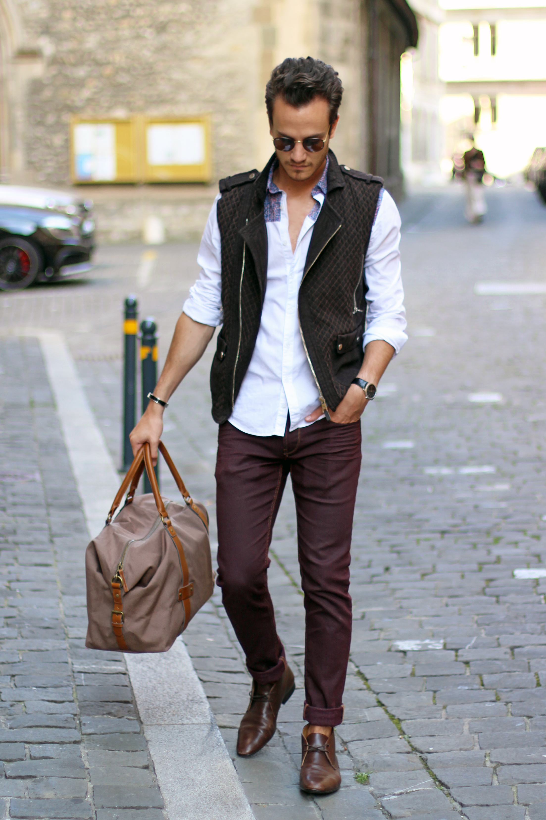 I paired these zara burgundy jeans (similar here) with a brown cotton quilted vest, also by Zara, from a few years ago. The print on the white shirt echoes the color of the trousers while these Hermès leather boots and Hermès belt (find the same buckle I’m wearing here) match the vest.