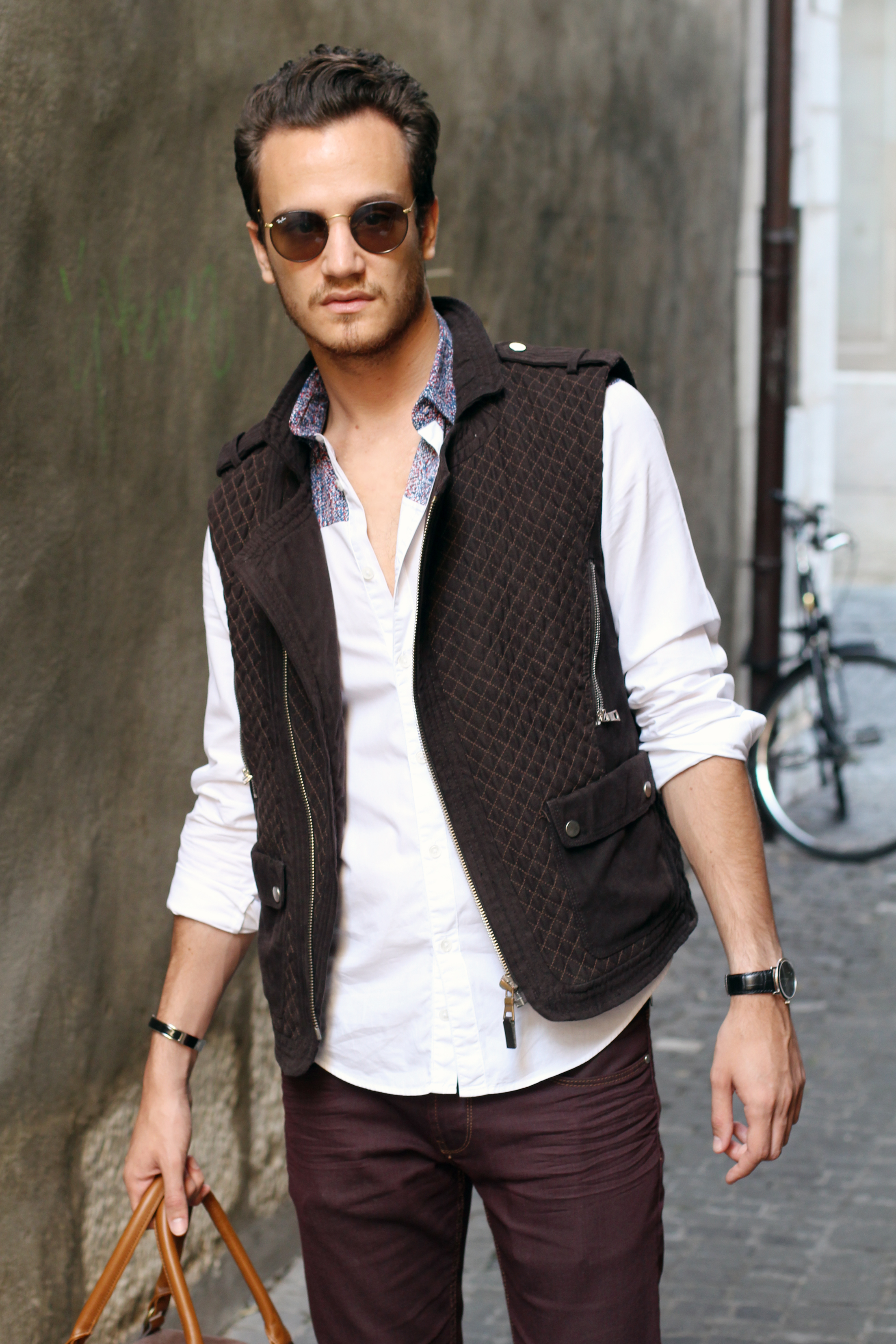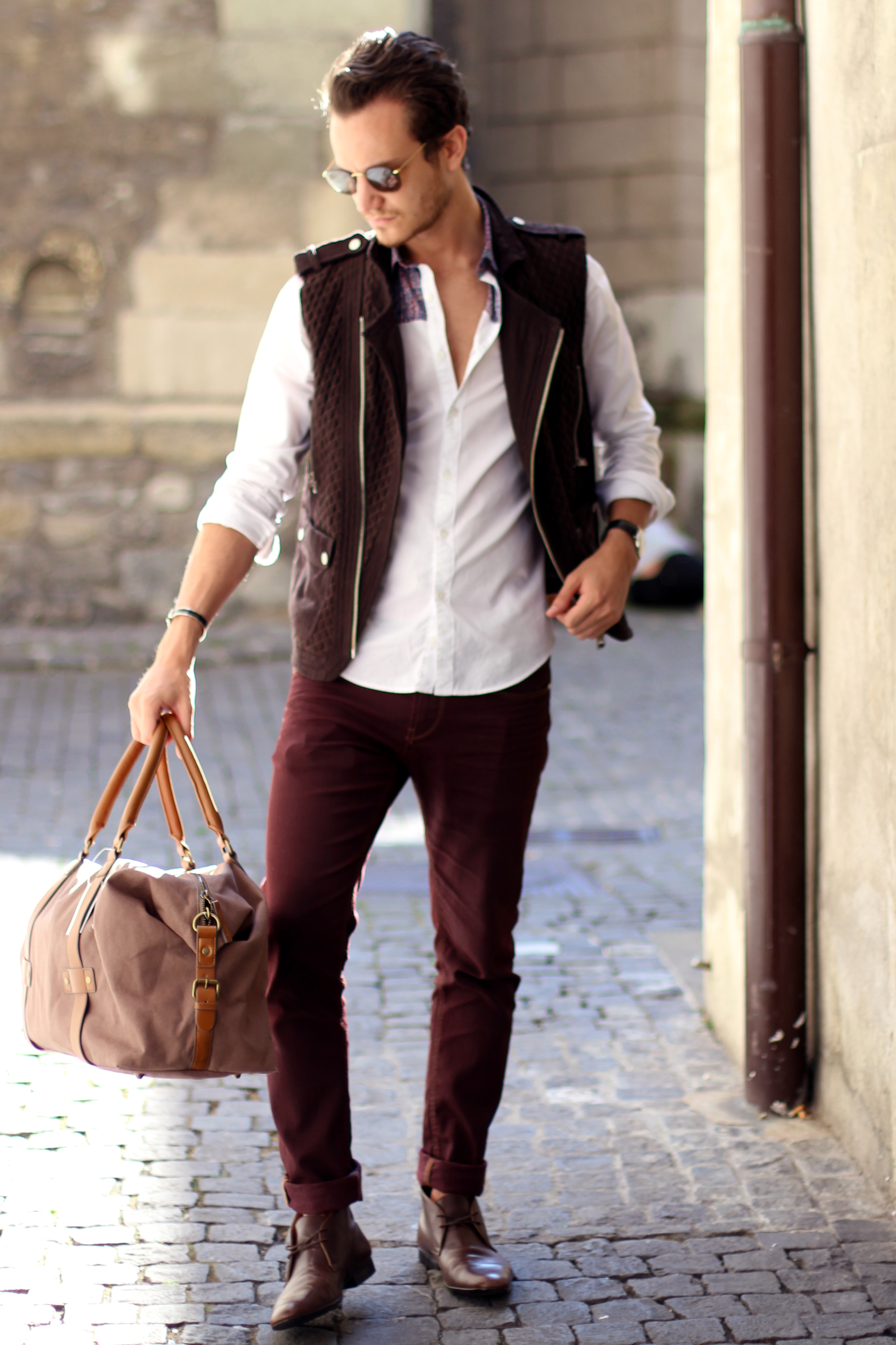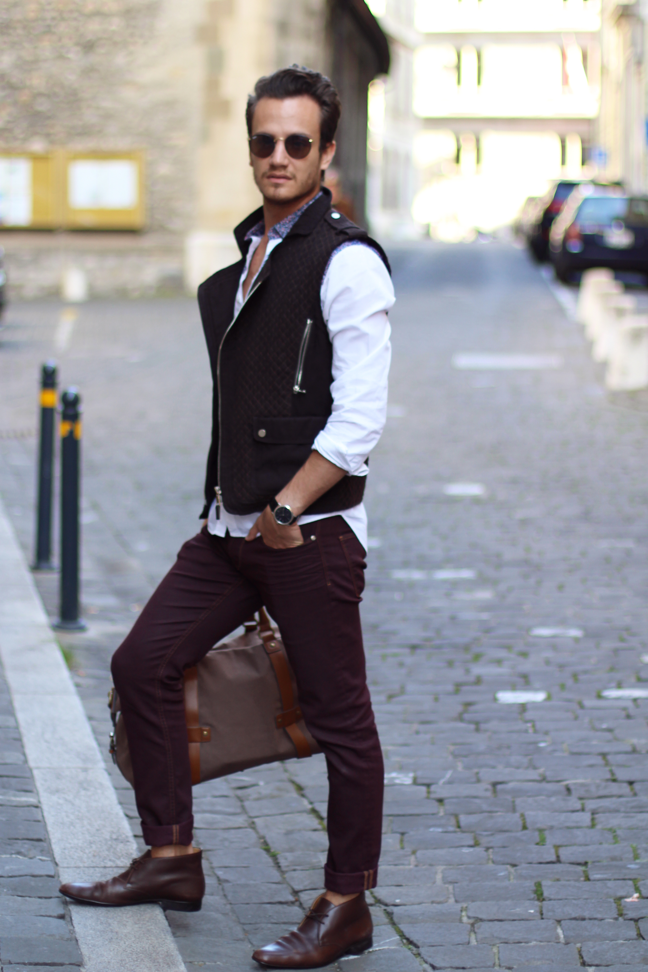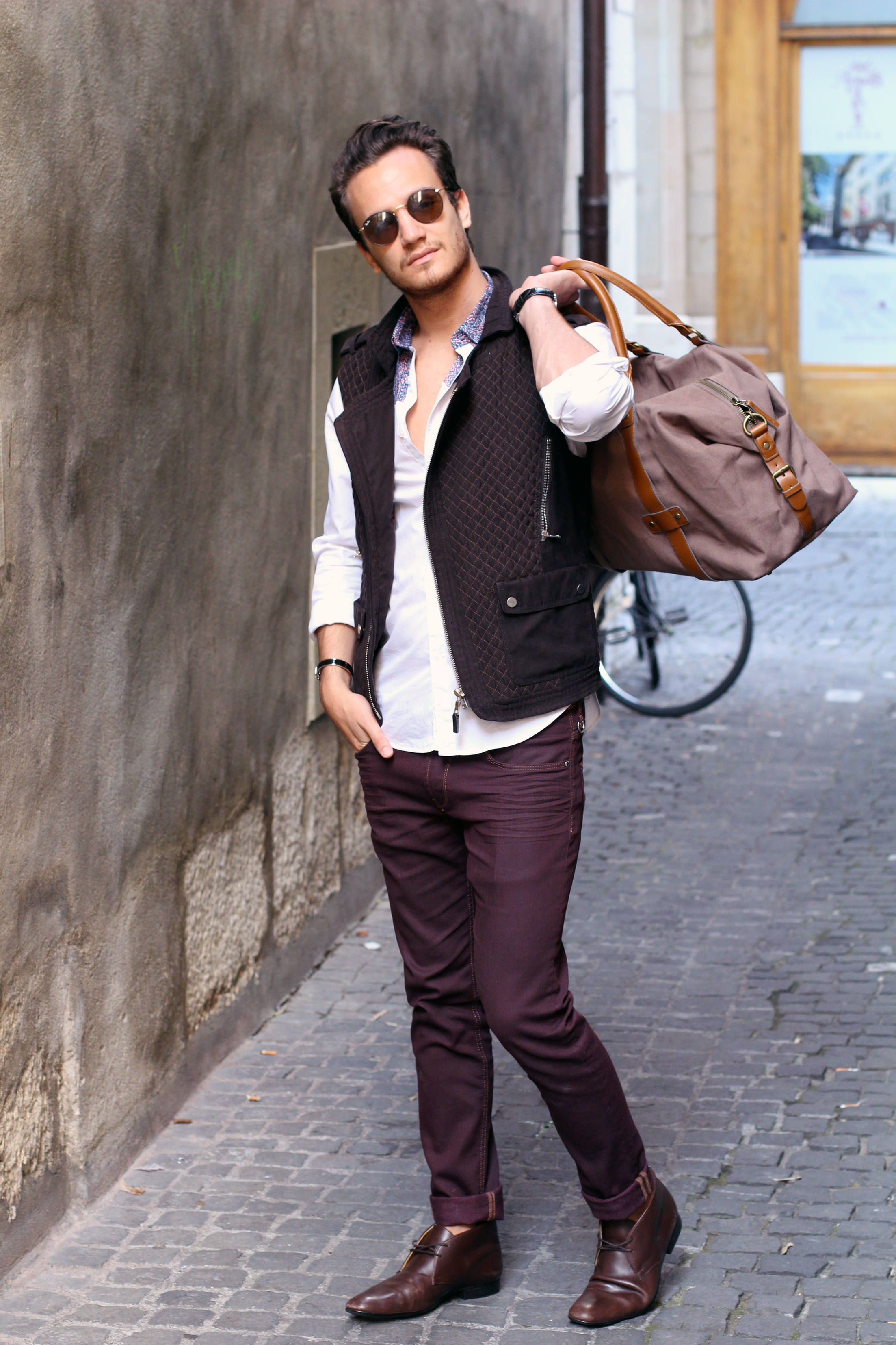 I paired these zara burgundy jeans (similar here) with a brown cotton quilted vest, also by Zara, from a few years ago. The print on the white shirt echoes the color of the trousers while these Hermès leather boots and Hermès belt (find the same buckle I’m wearing here) match the vest.