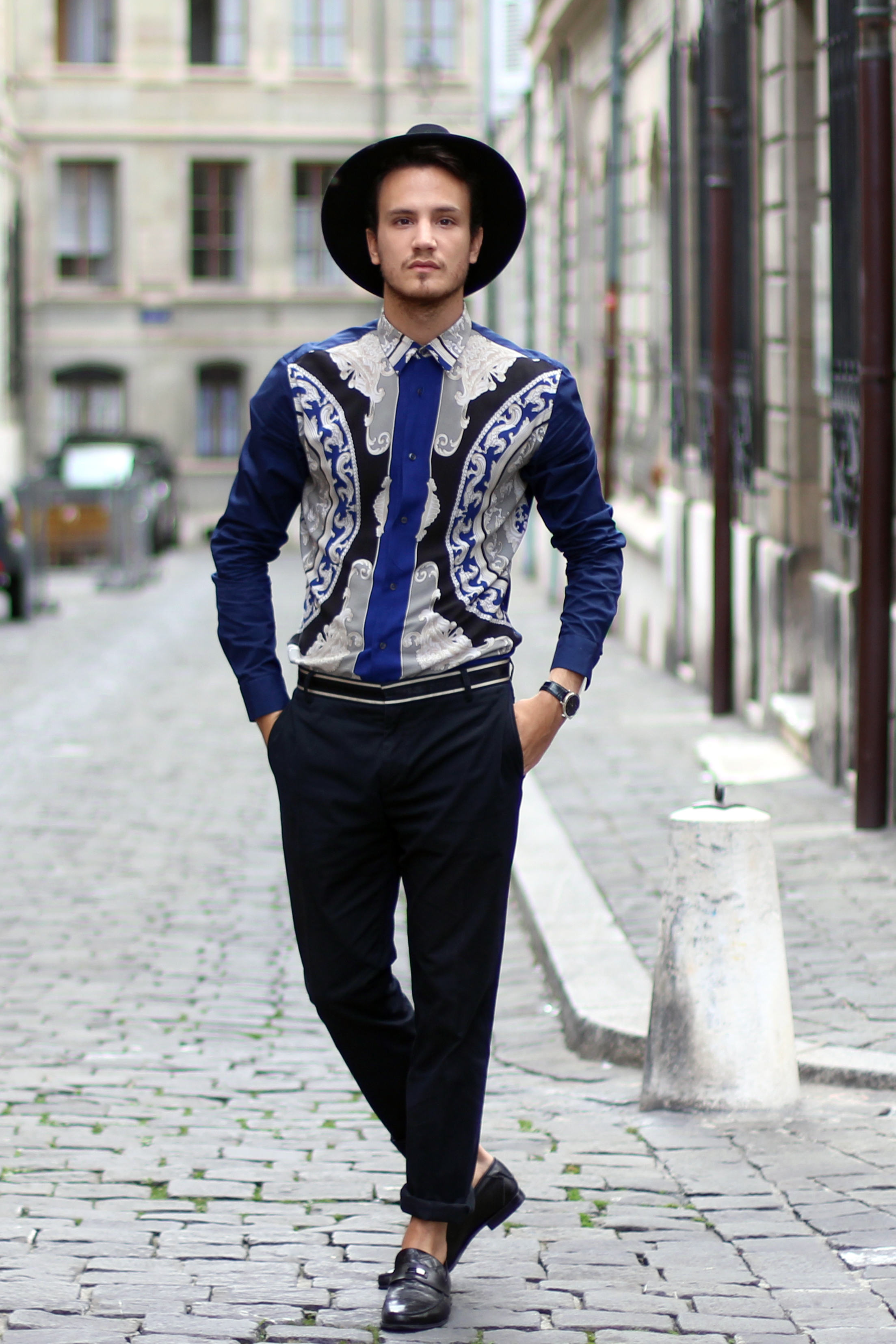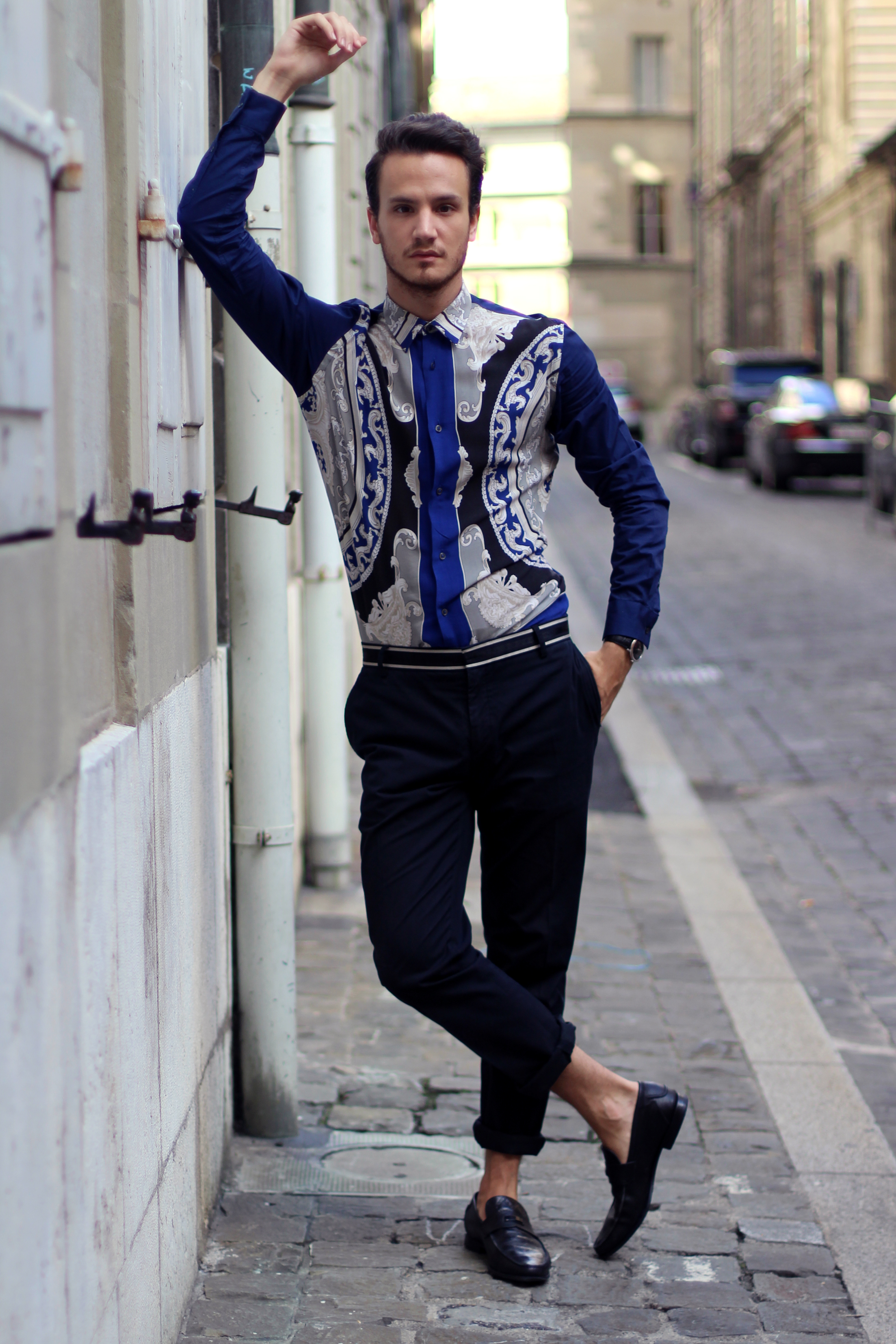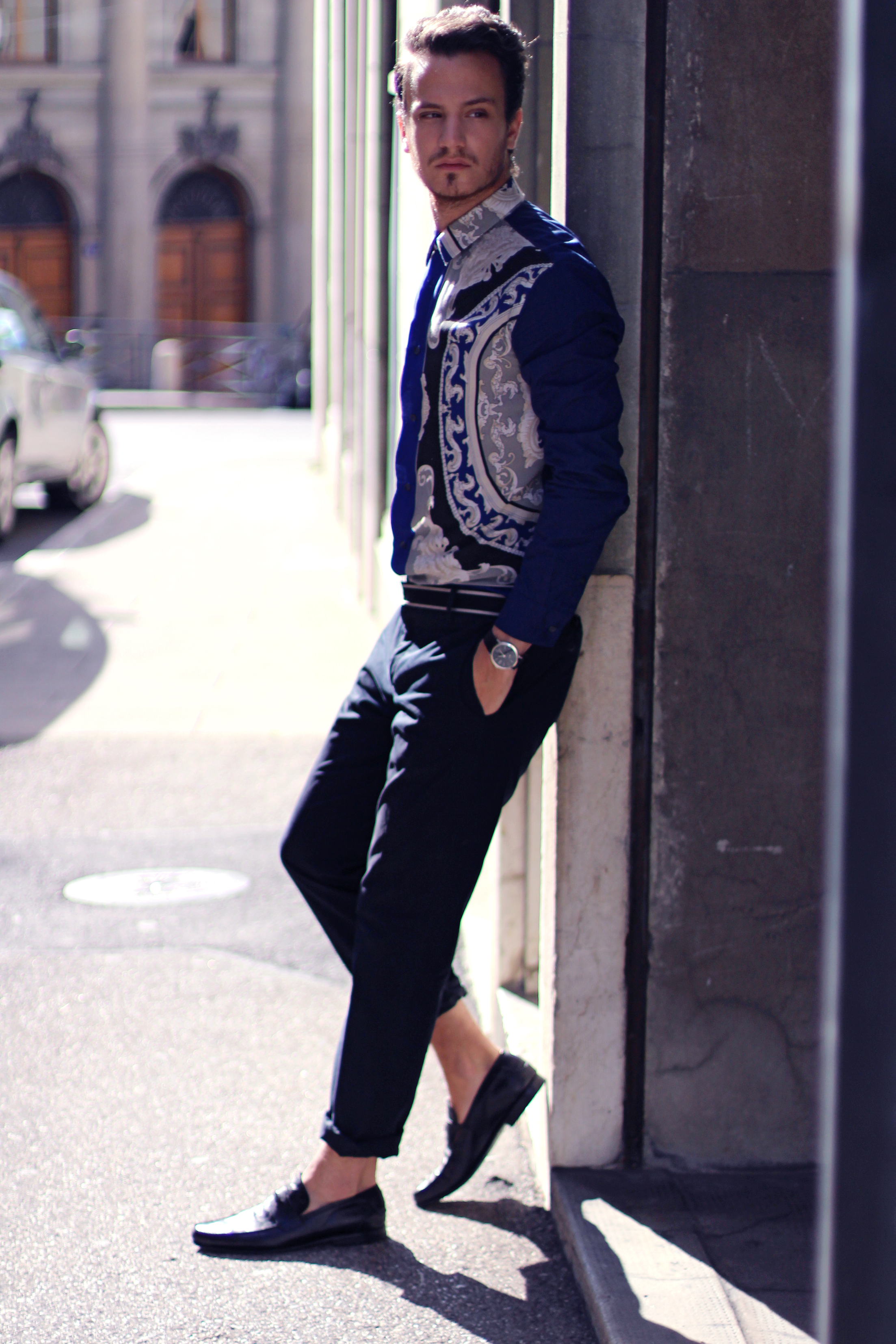 I paired this shirt with navy blue Paul&Joe trousers with a nice contrasting band around the waist. Finally I accessorized the look with Versace Collection loafers .
