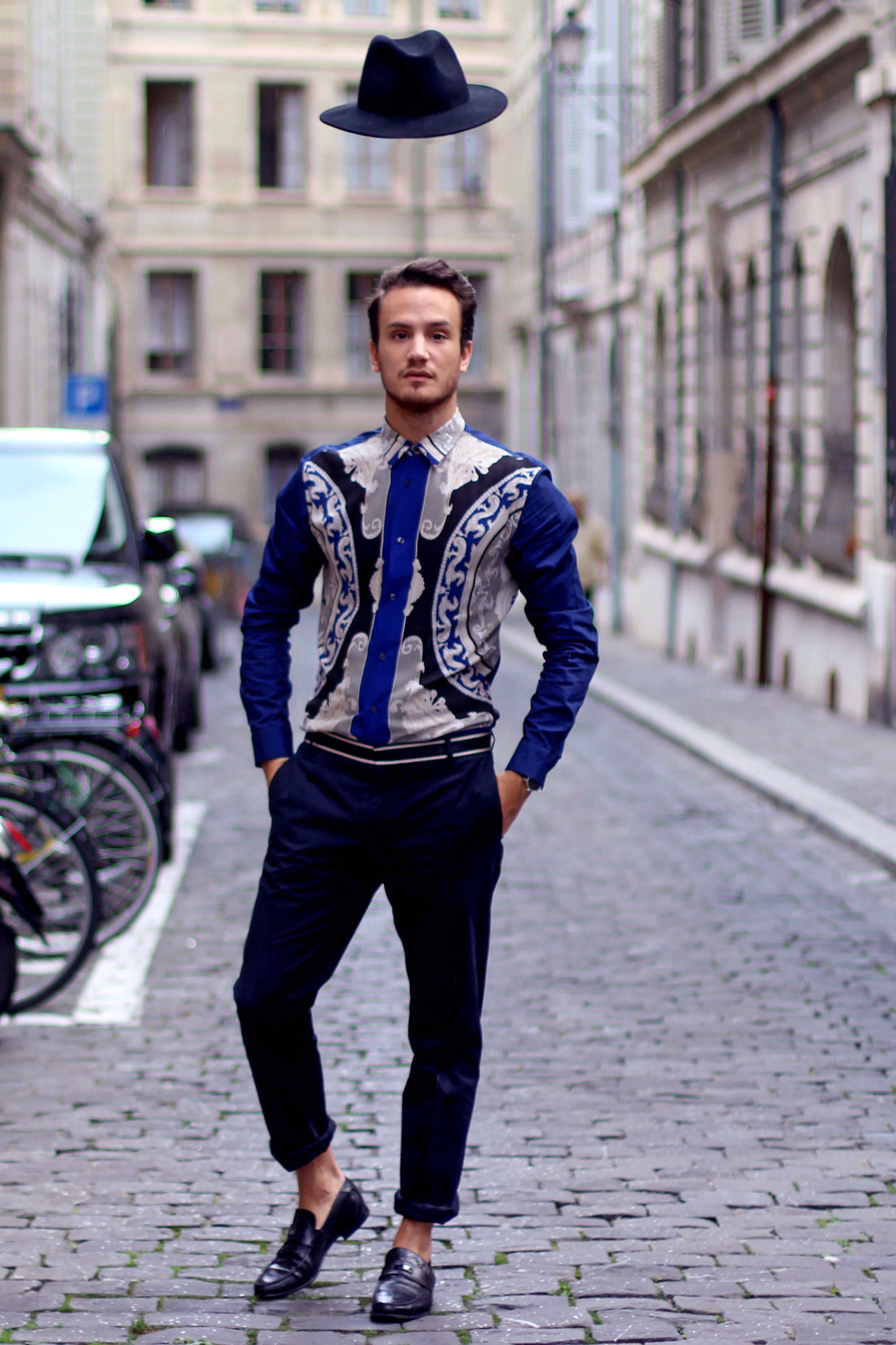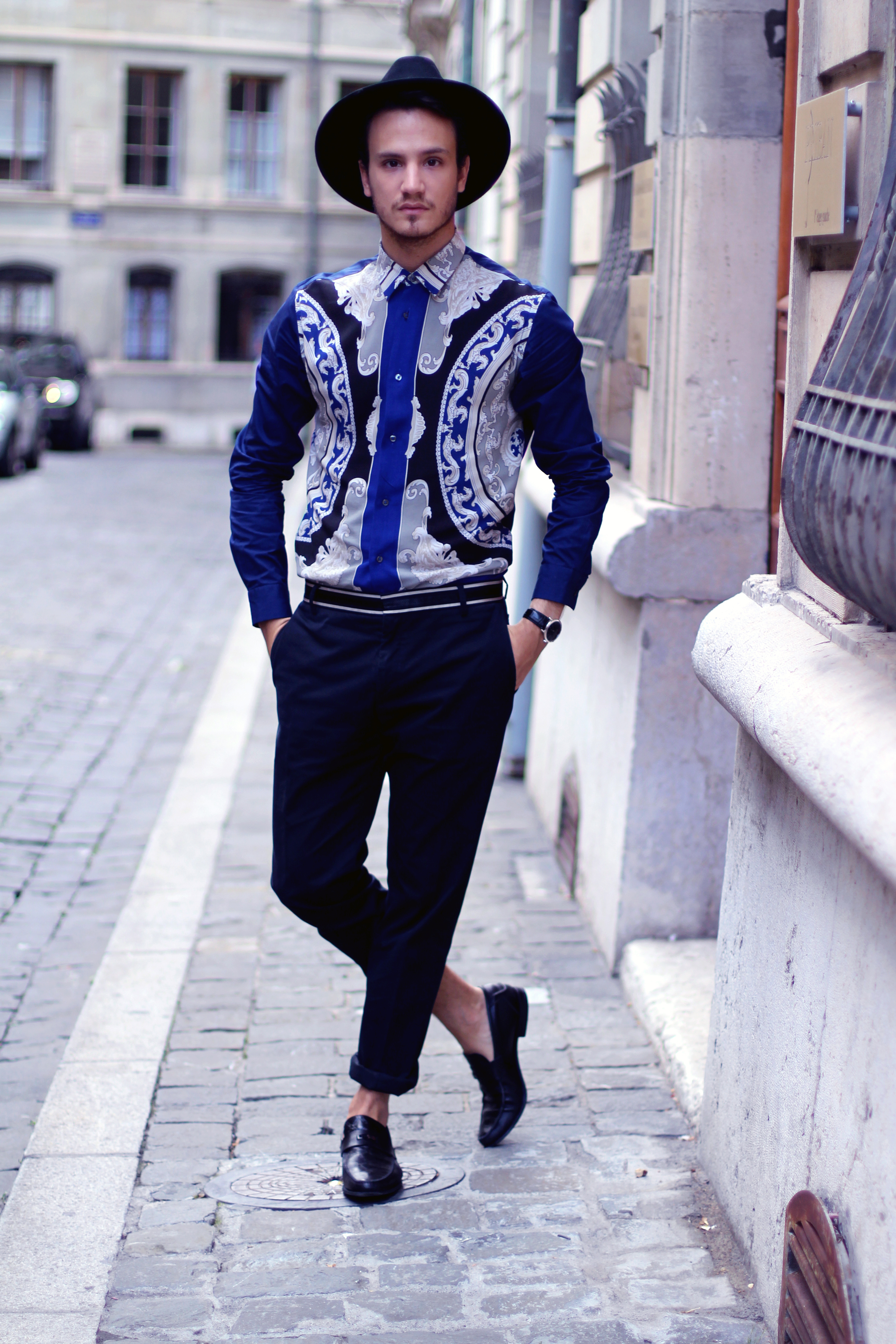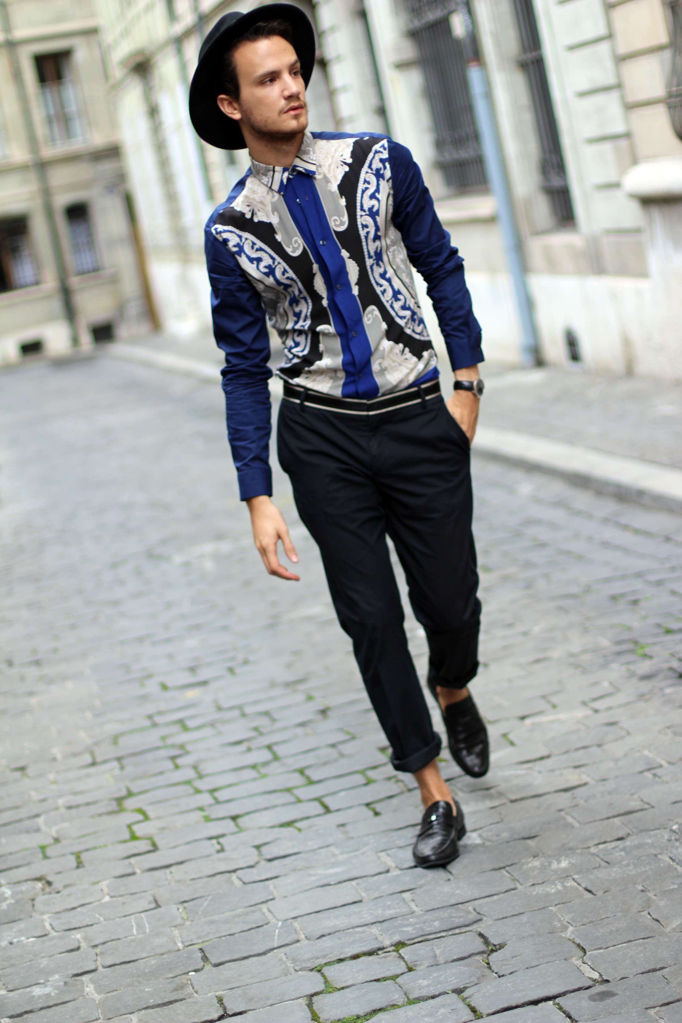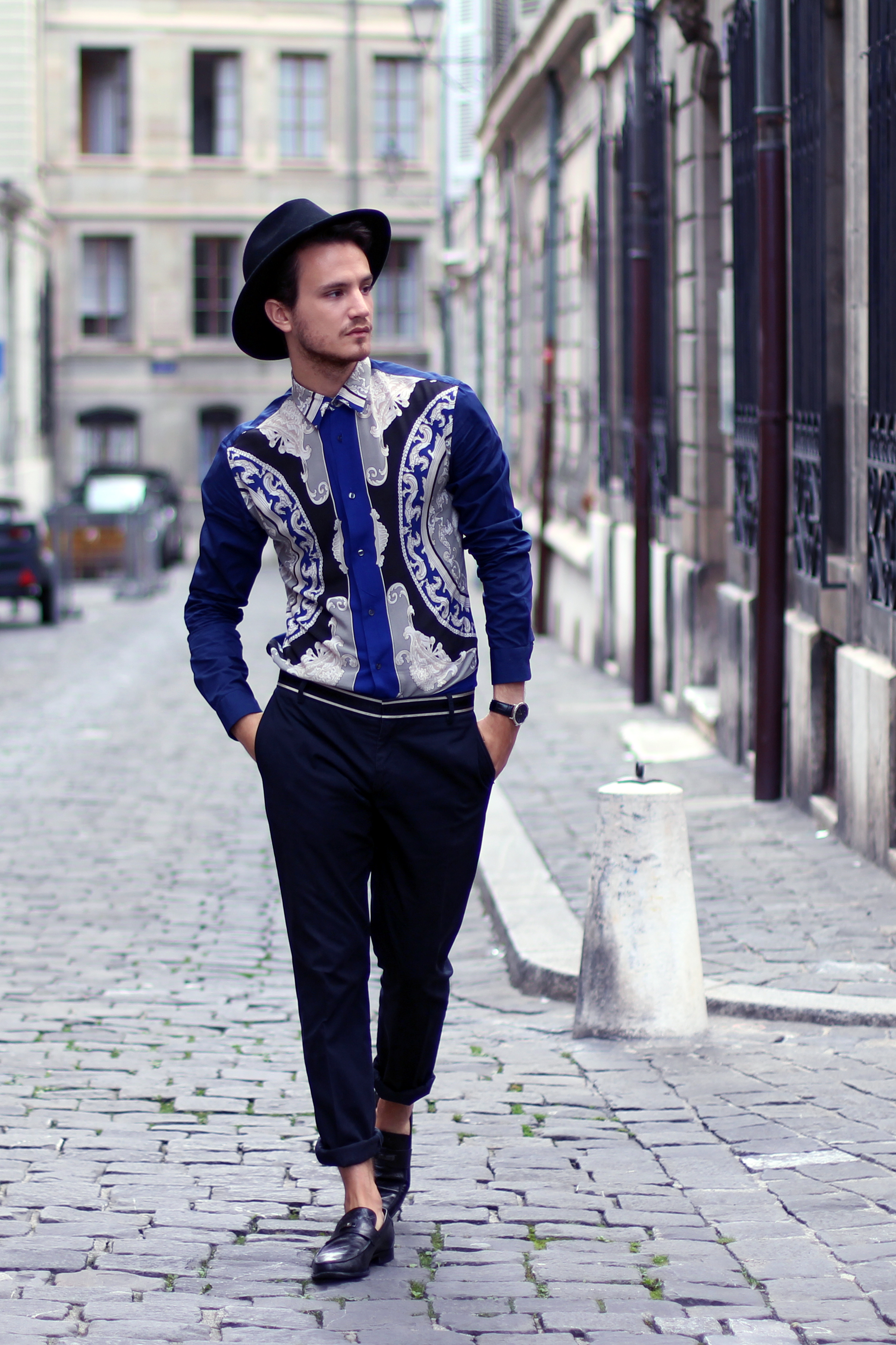I paired this shirt with navy blue Paul&Joe trousers with a nice contrasting band around the waist. Finally I accessorized the look with Versace Collection loafers .