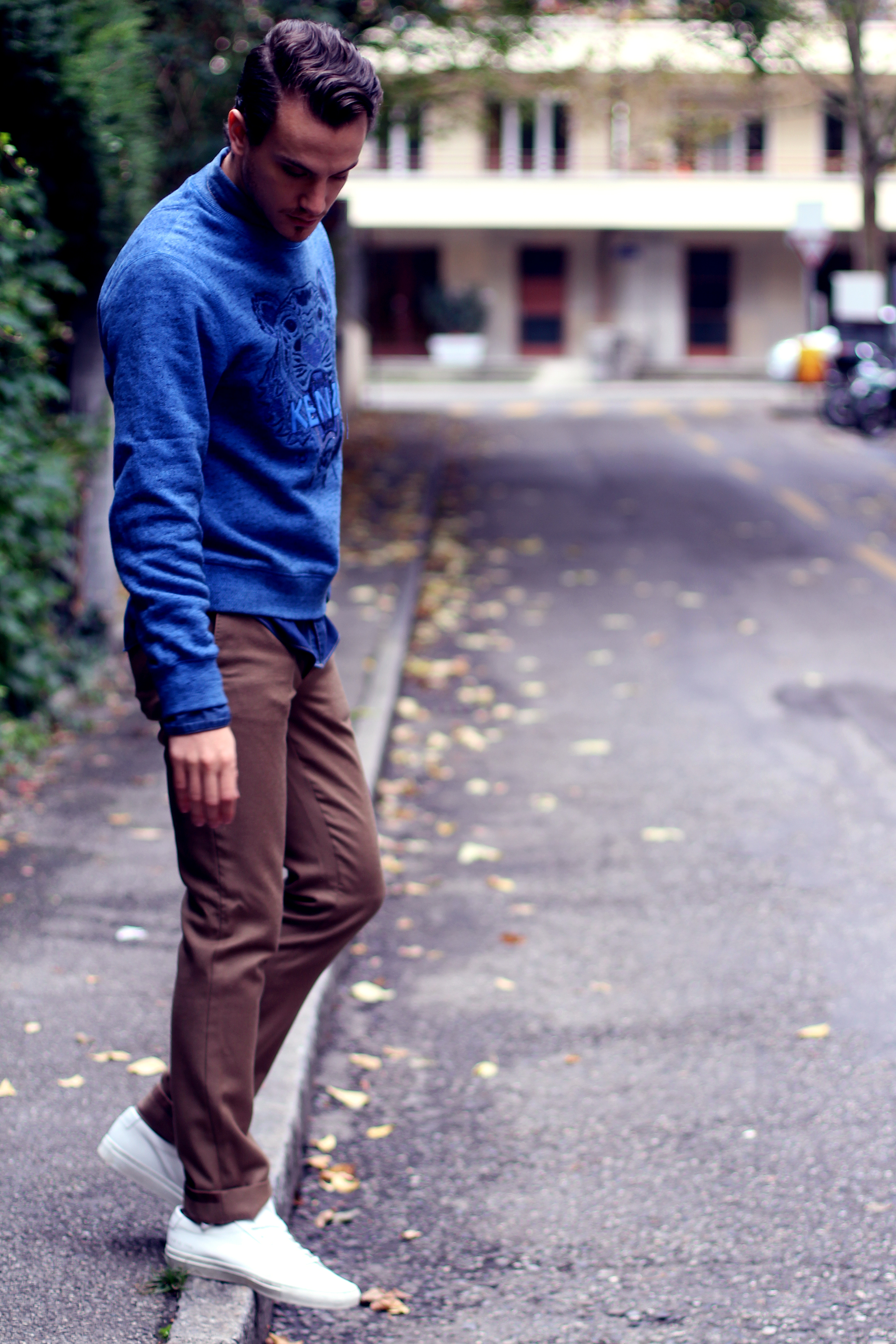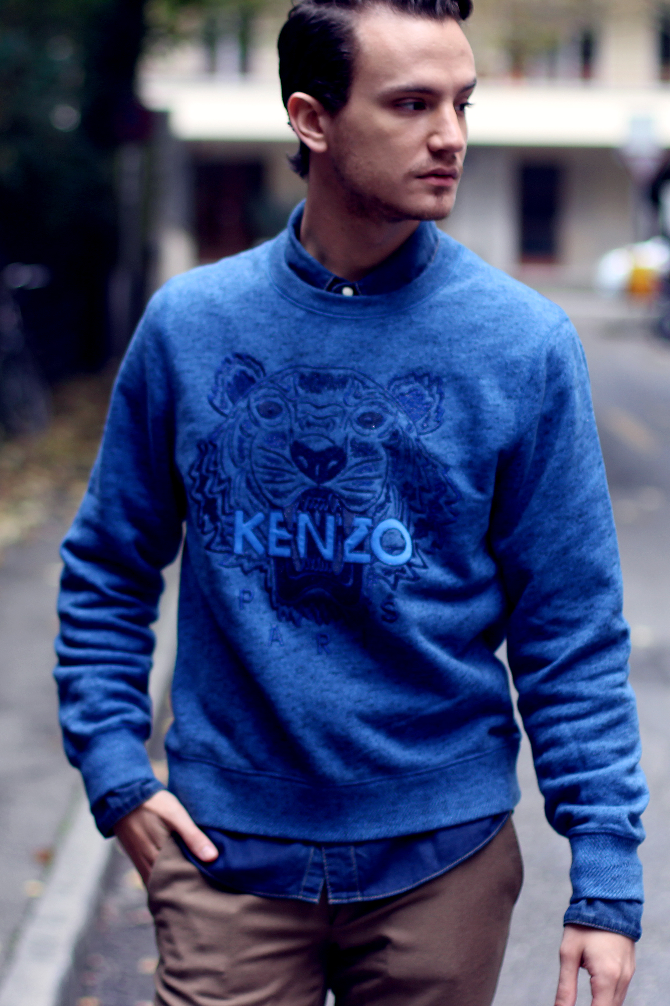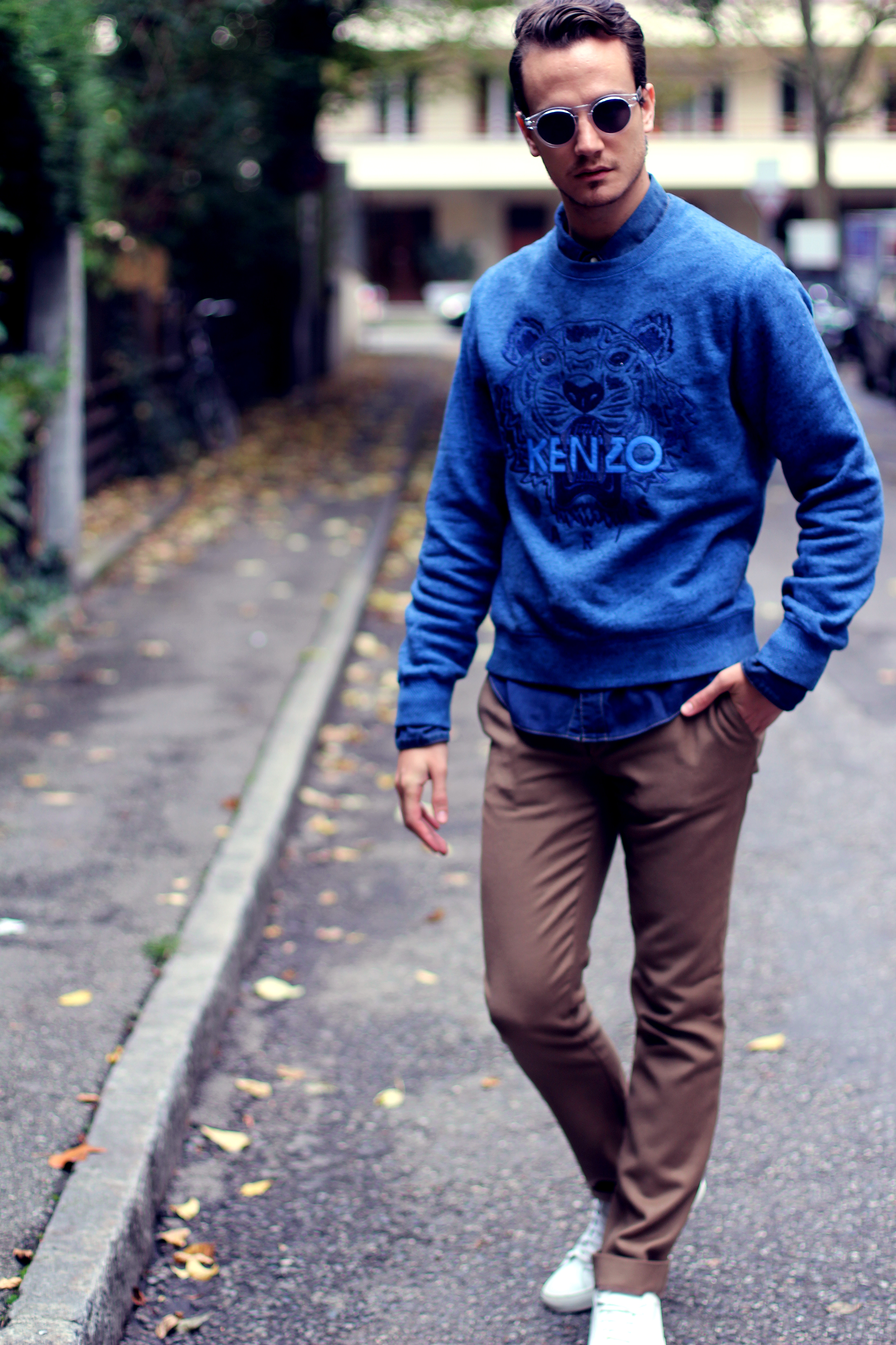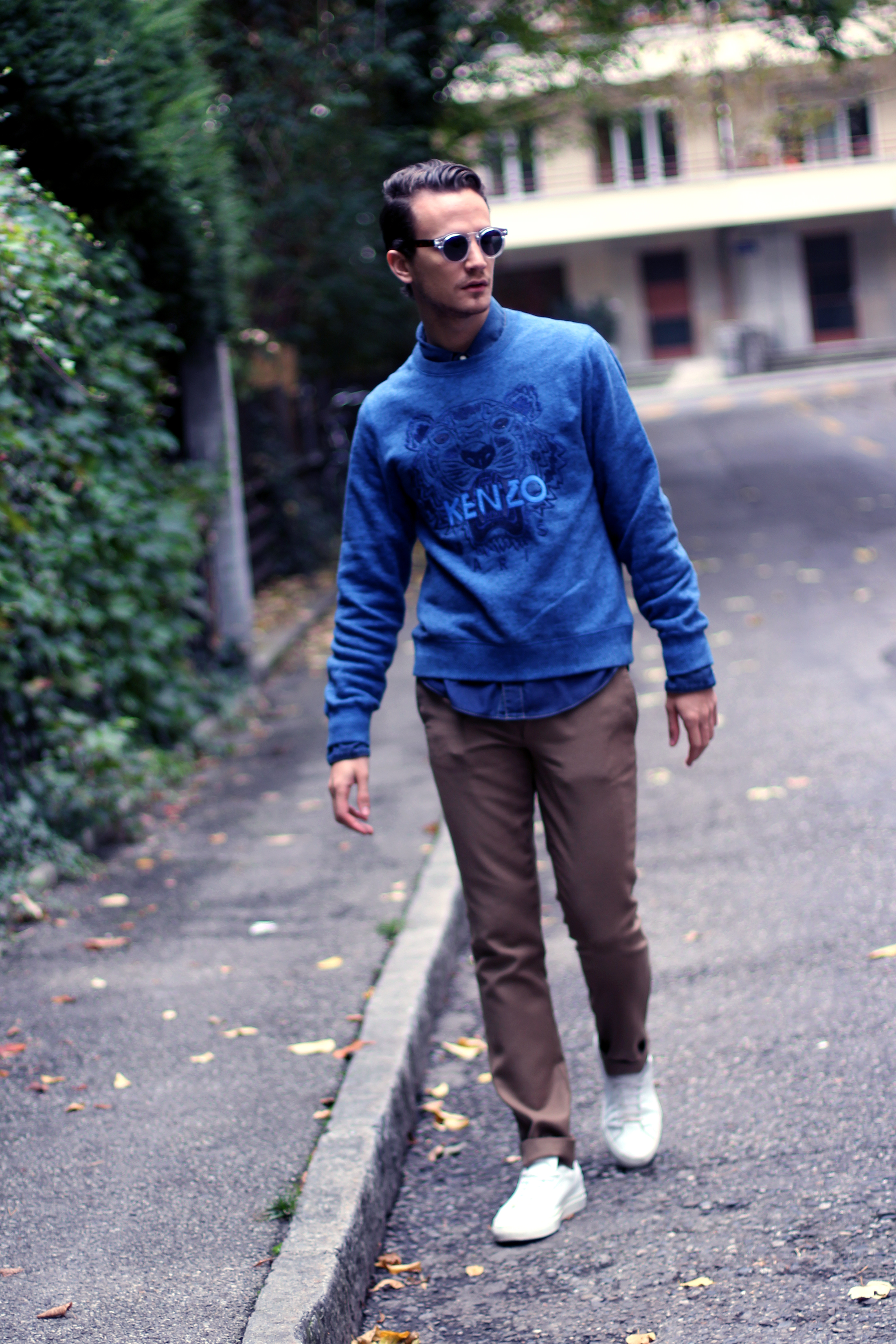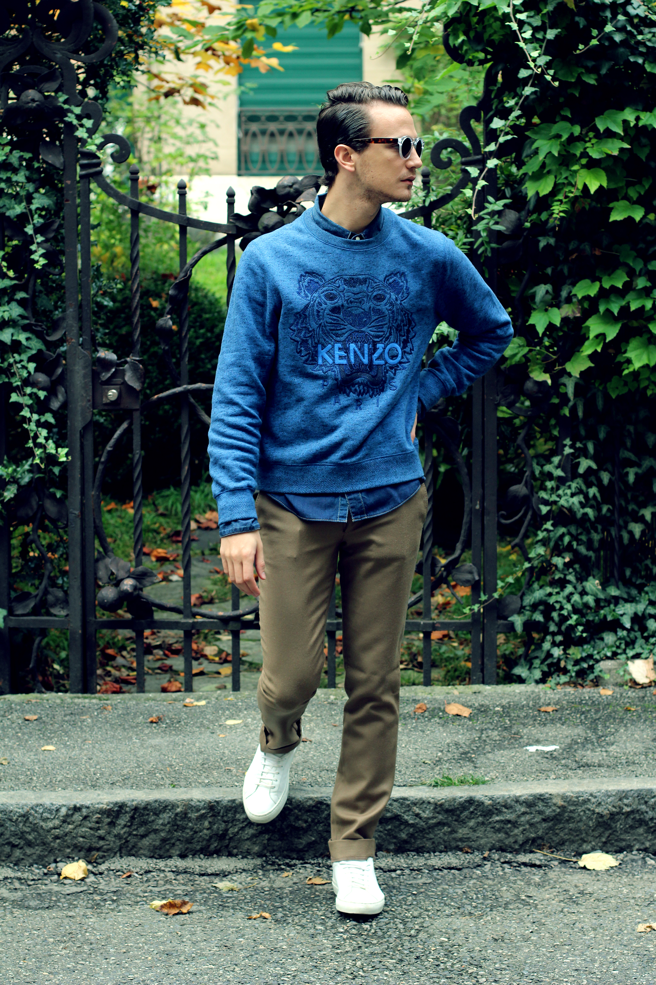 Such as the Kenzo Tiger sweater I’m wearing in todays’ look.I paired it with camel trousers, layered it on top of a denim shirt, and wore Common Projects sneakers.
