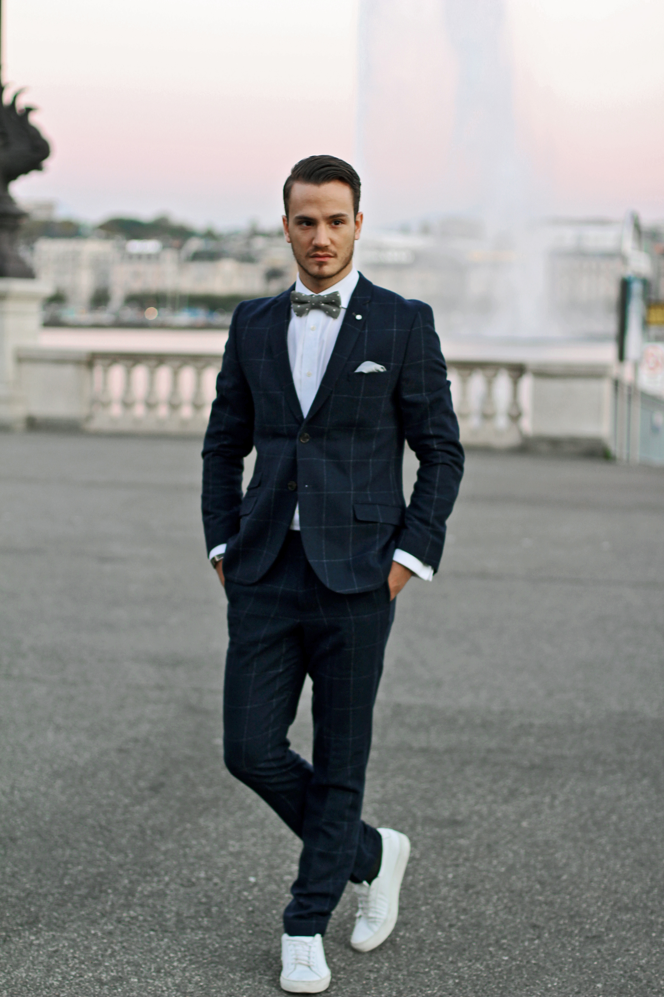 I found this large check suit and polka-dots bow tie at H&M. I completed the look with a grey satin pocketsquare. I gave the outfit a contemporary touch by wearing the suit with chich white sneakers, by Common Projects.
