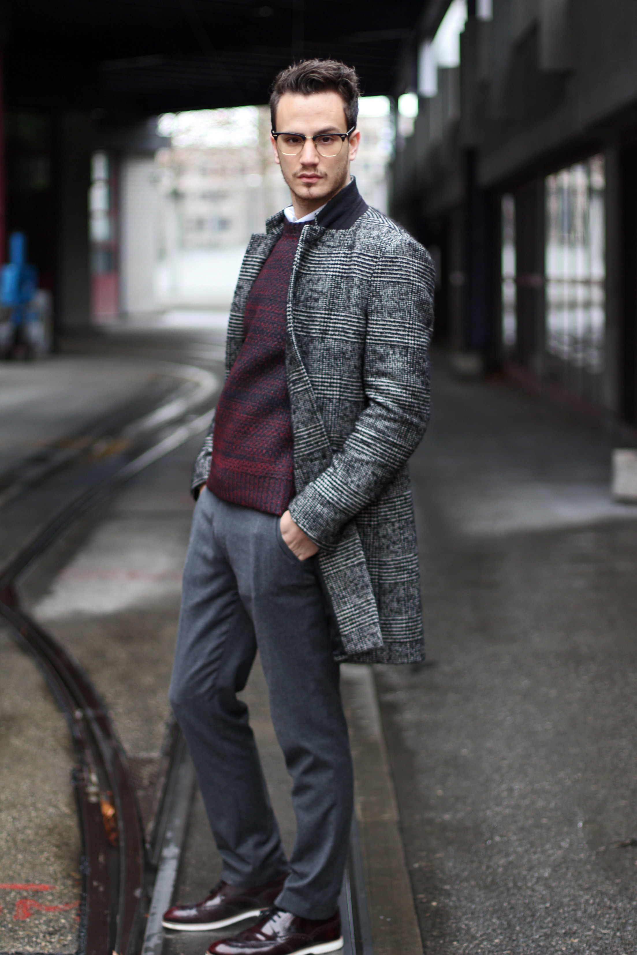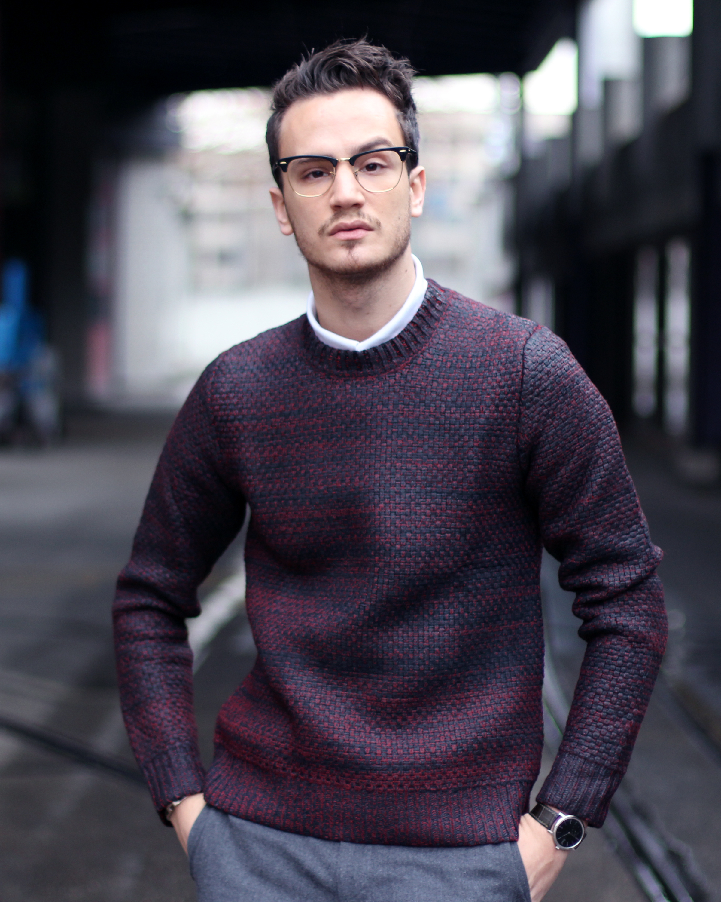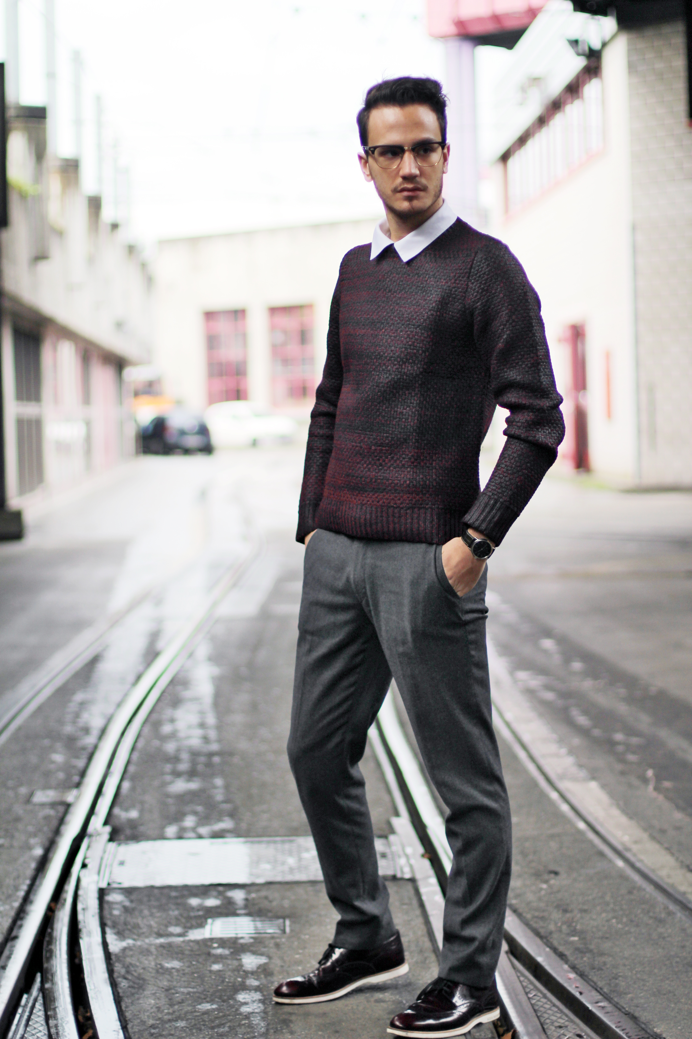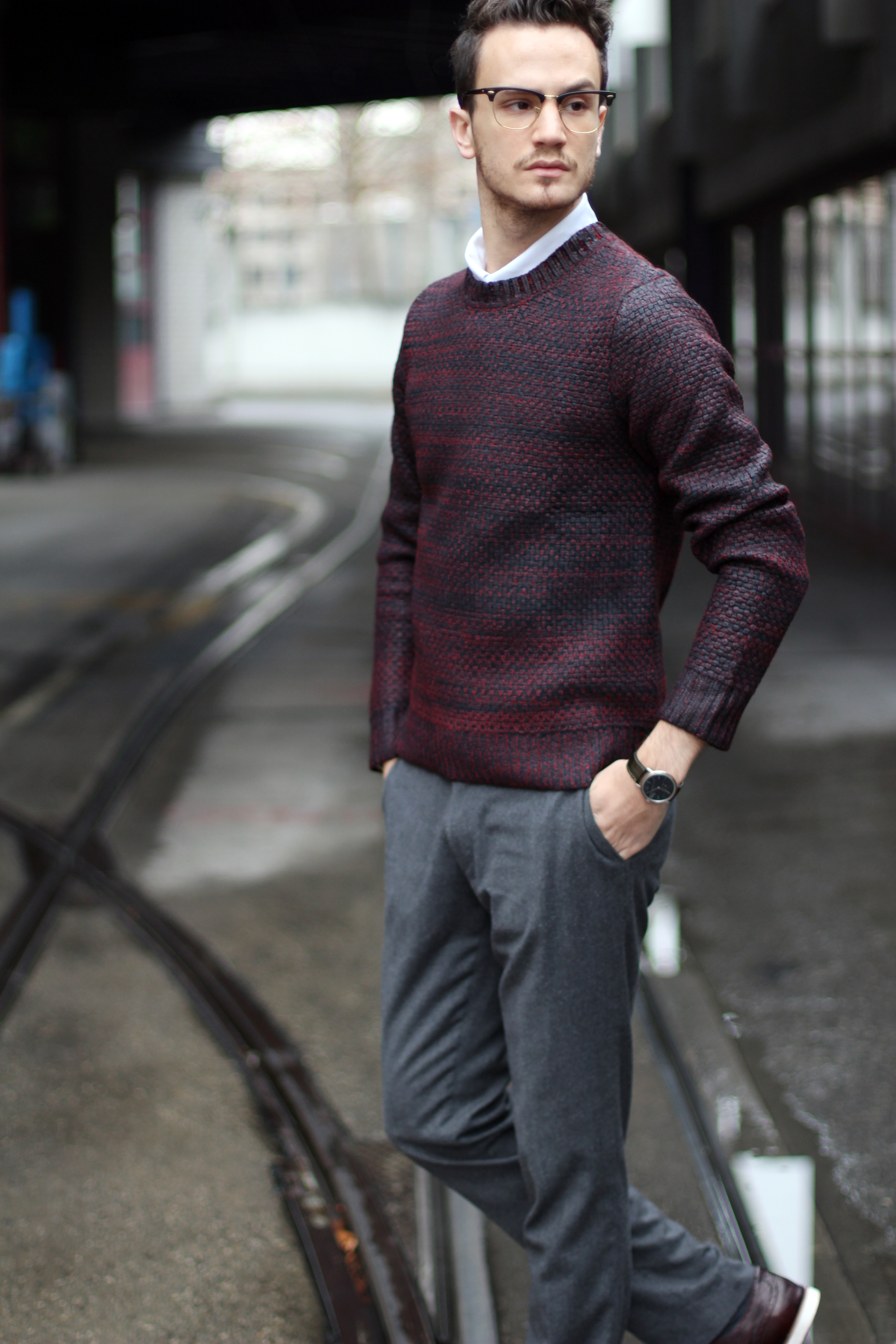 For my first look, I also paired the sweater with grey wool trousers, a white polo and burgundy derbies.