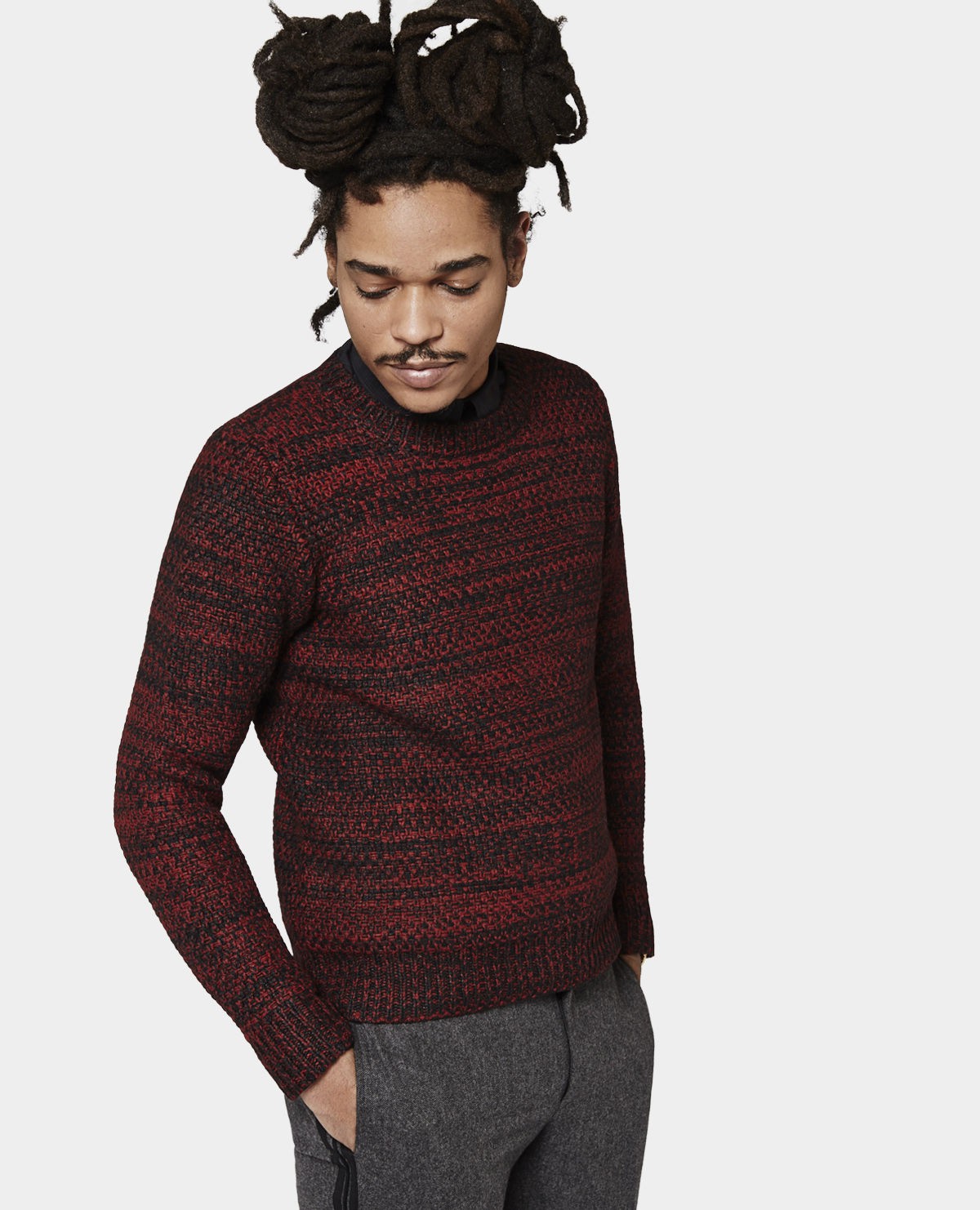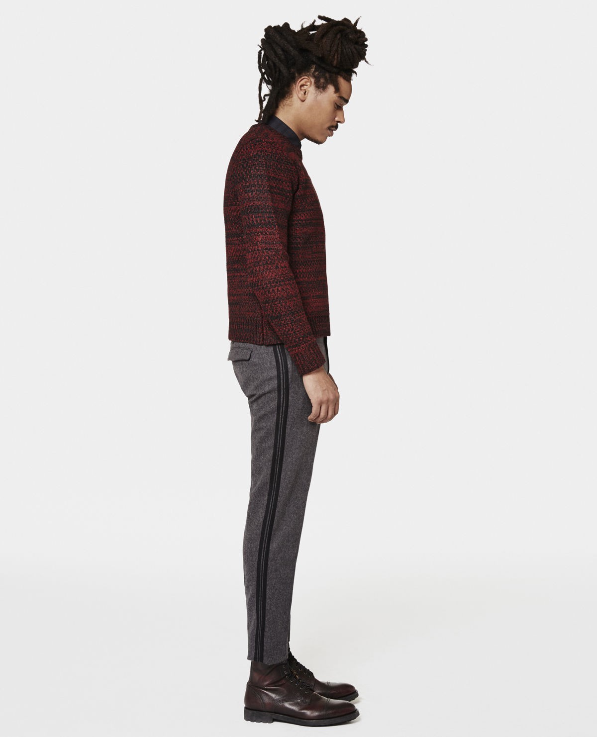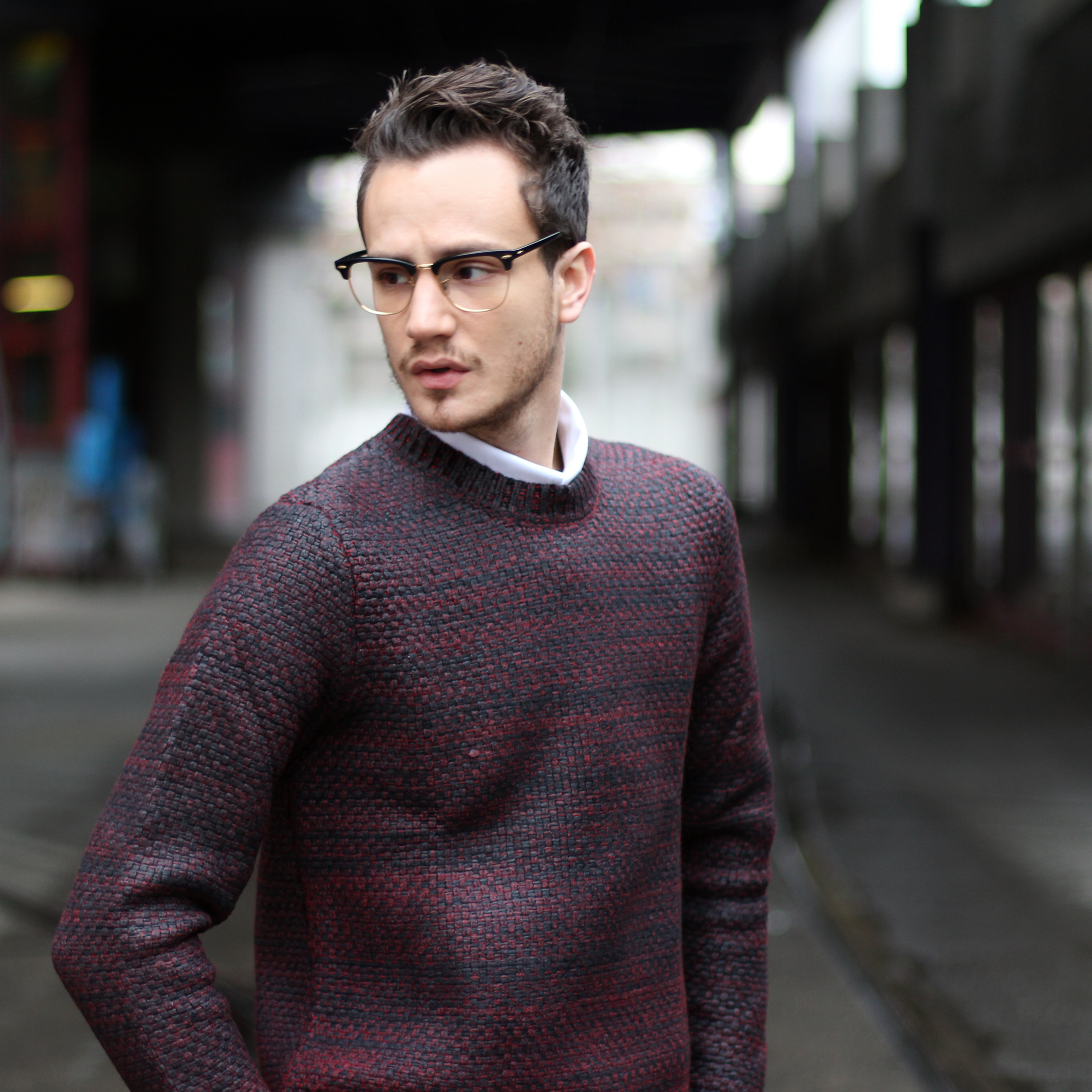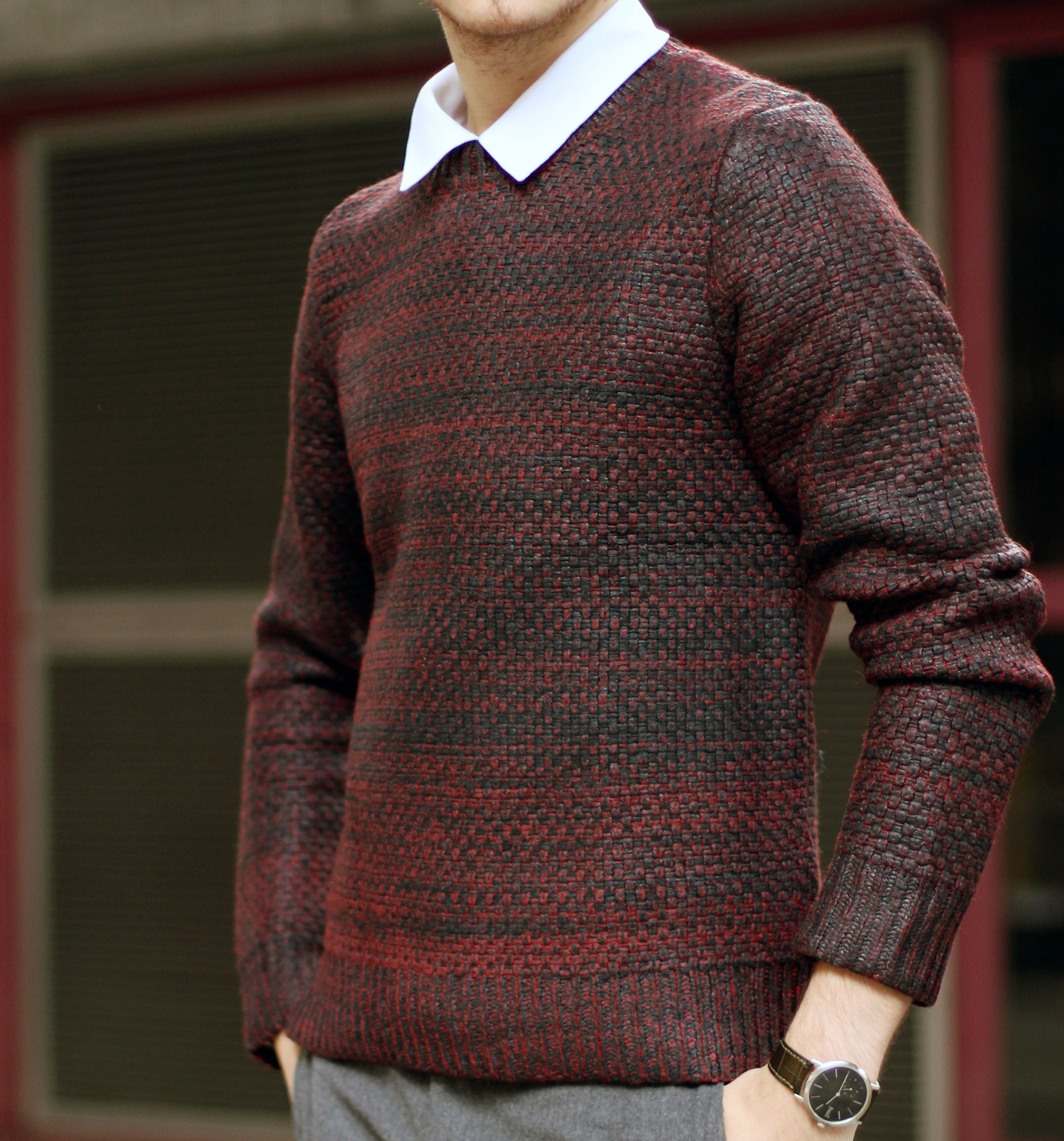 For my first look, I also paired the sweater with grey wool trousers, a white polo and burgundy derbies.