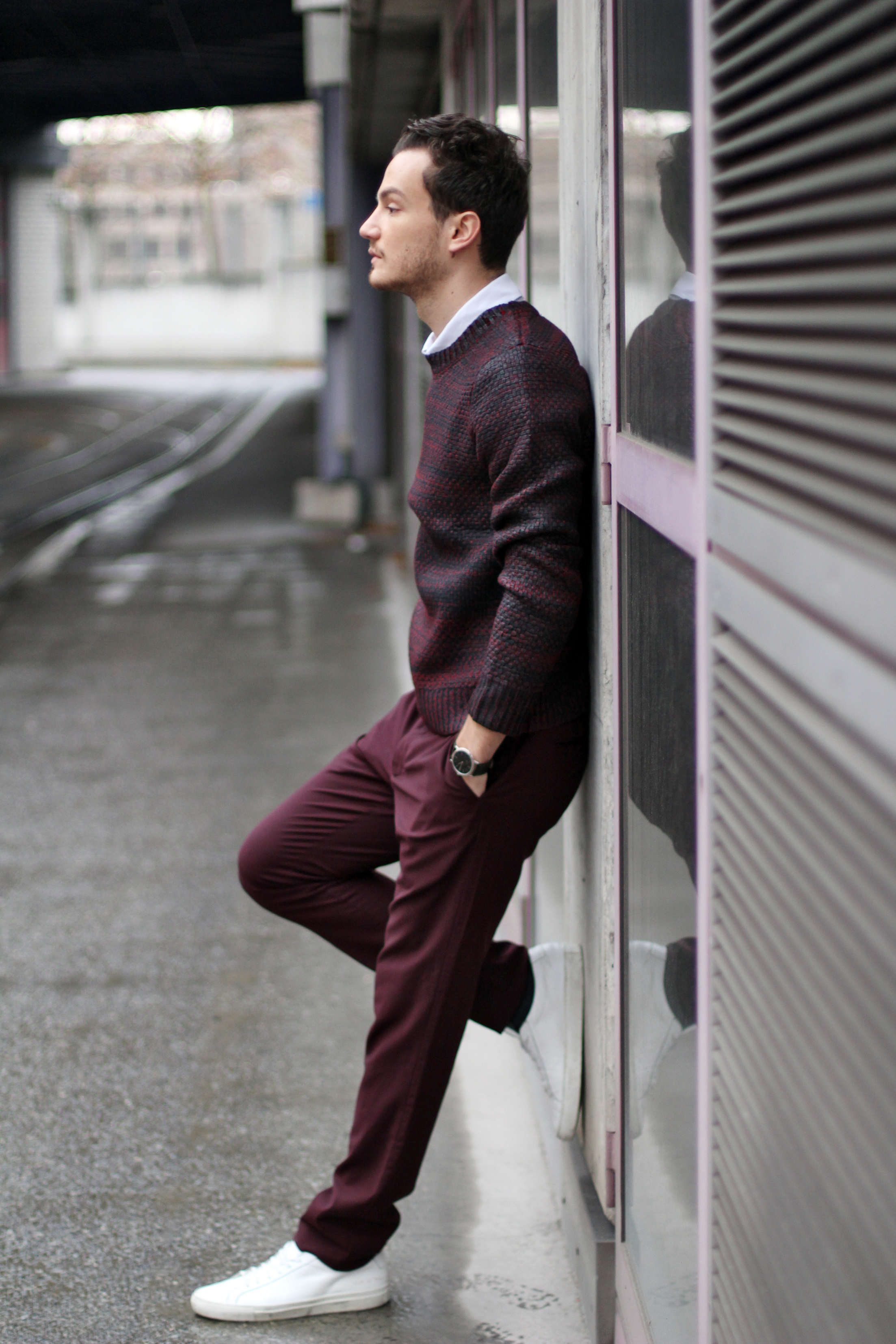 I paired the sweater with Burgundy Zara trousers and white Common projects sneakers, for a more urban feel.