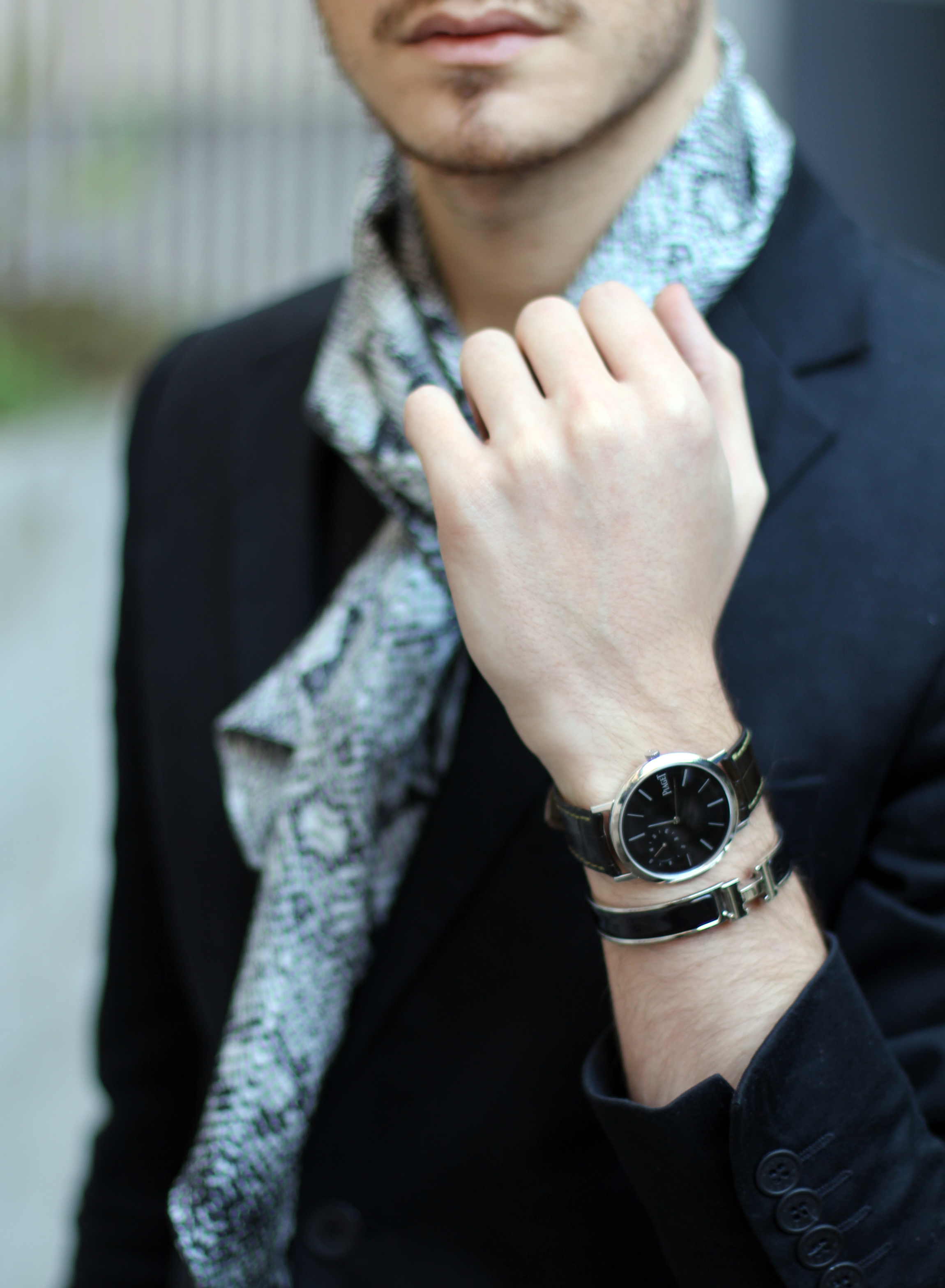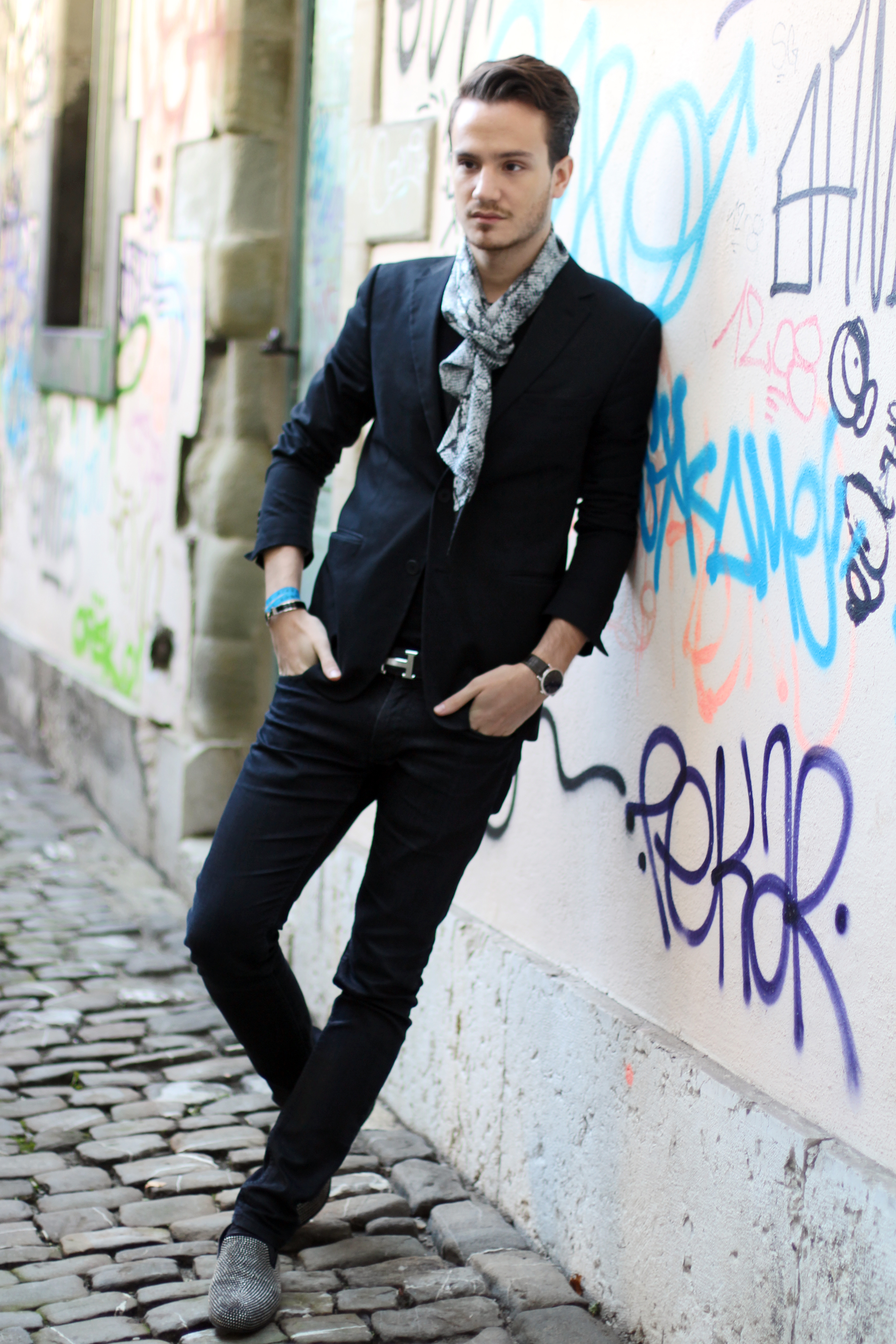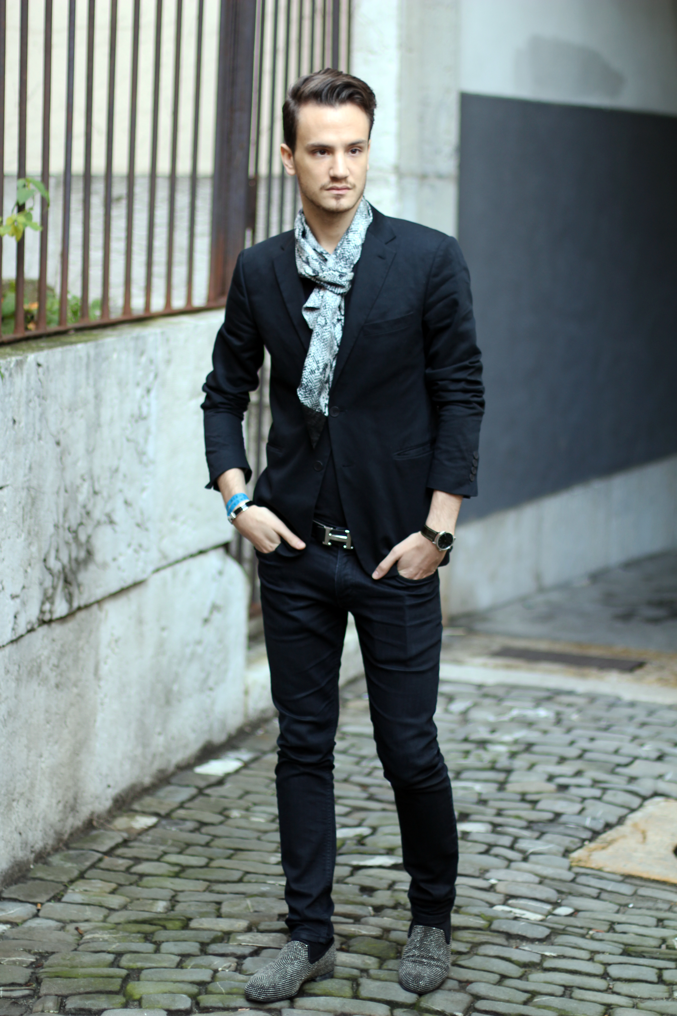 “Casual-chic-ing” in all black with sophisticated details, thanks to this faux-python The Kooples scarf and Jimmy Choo studded loafers
