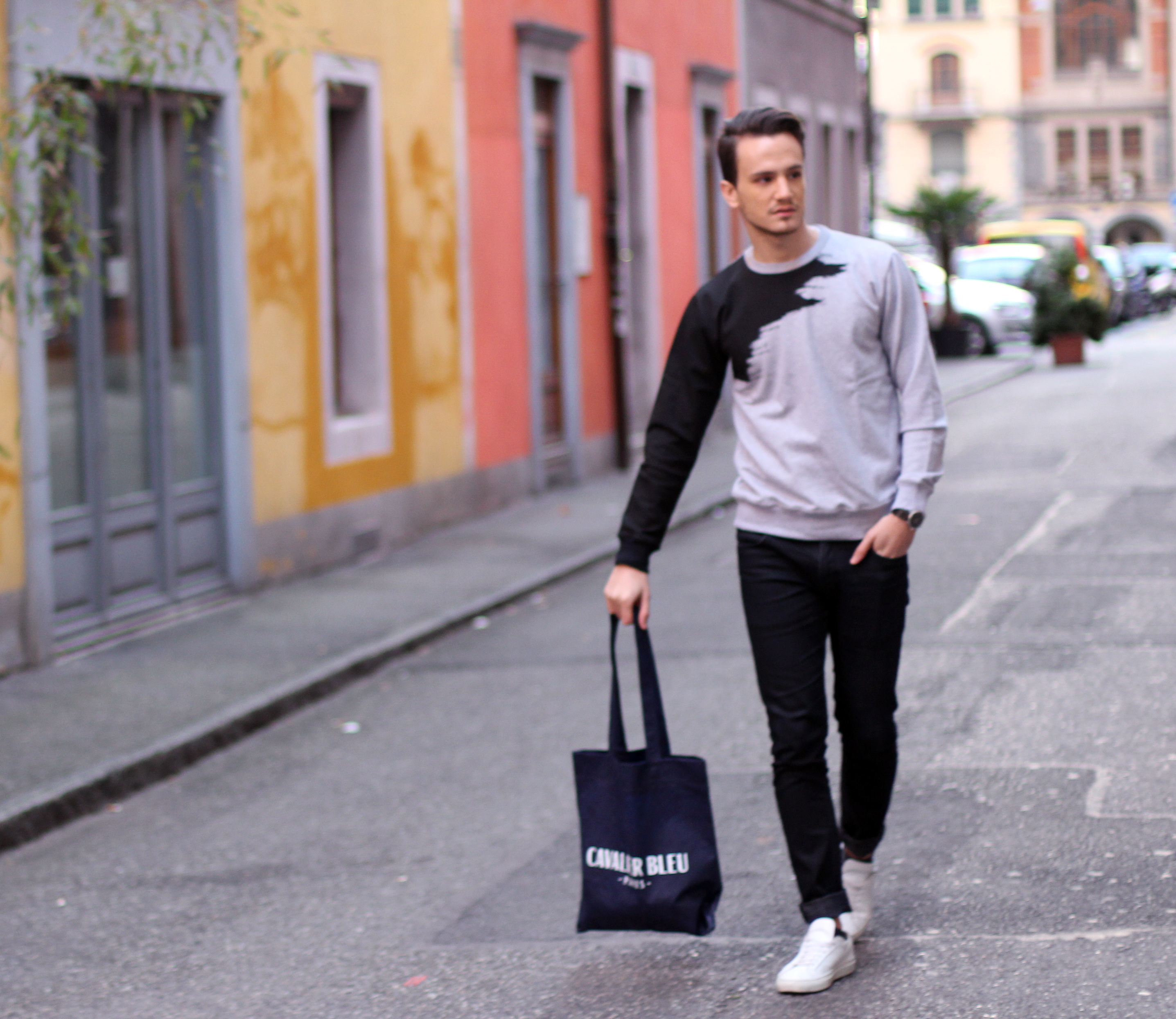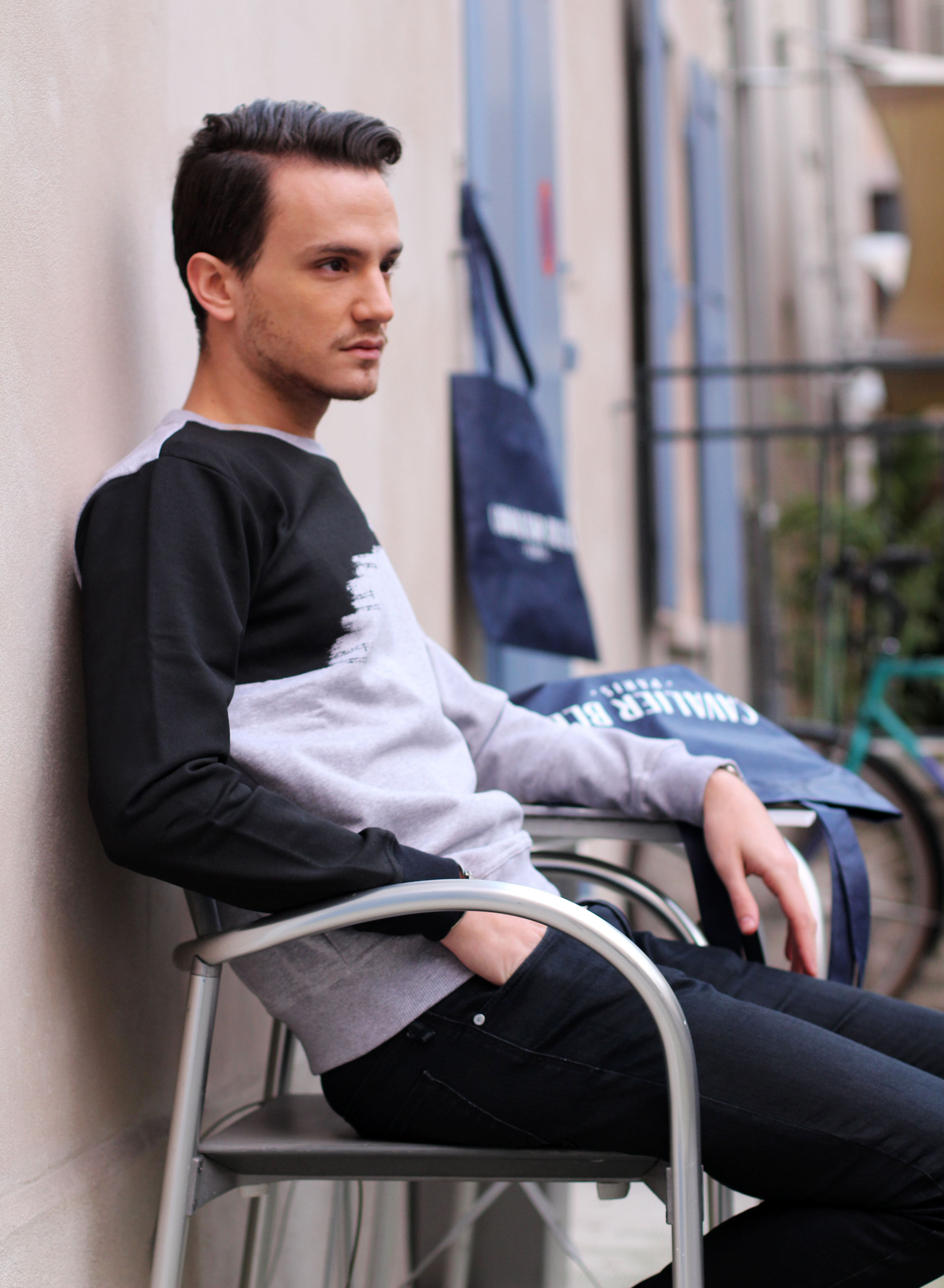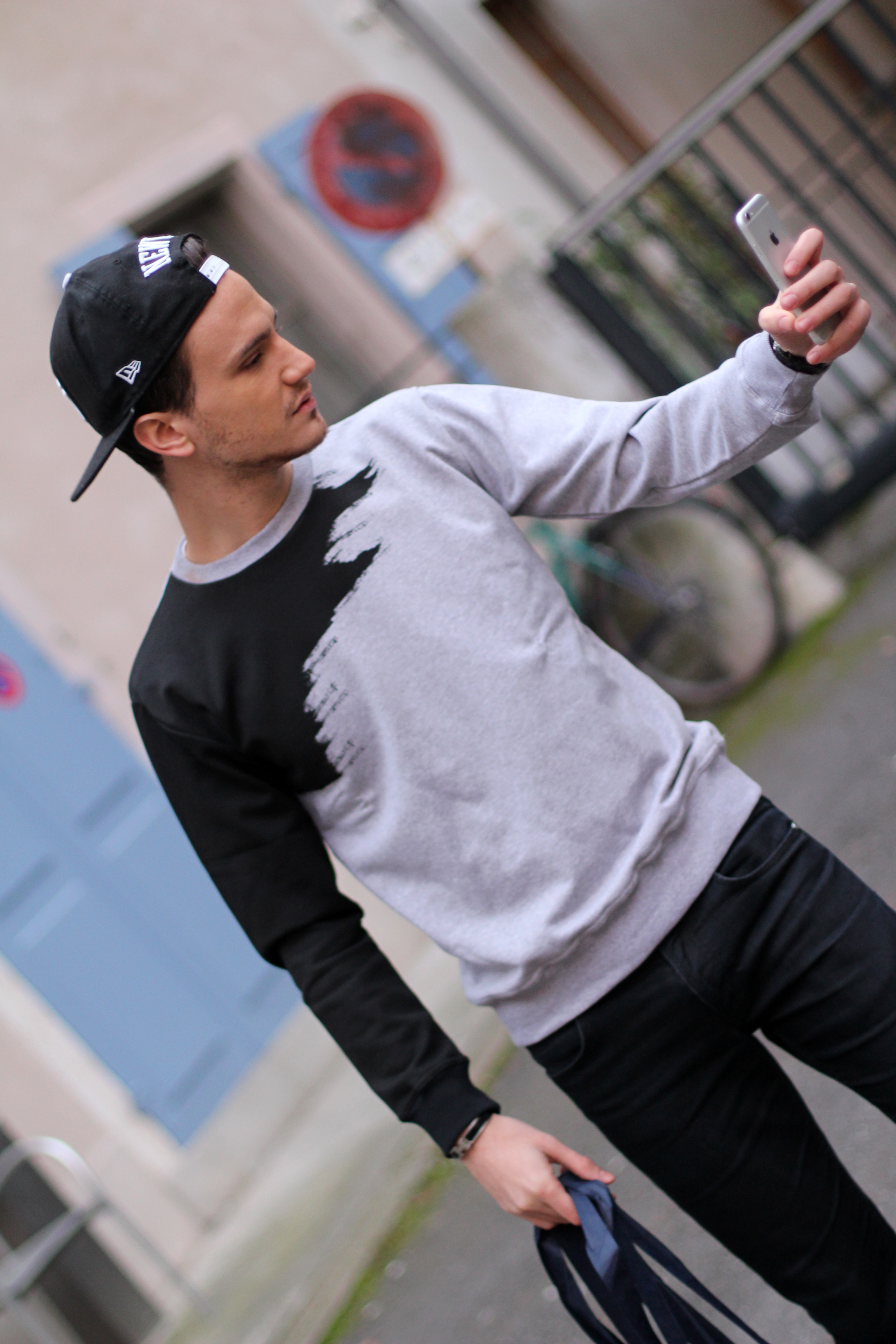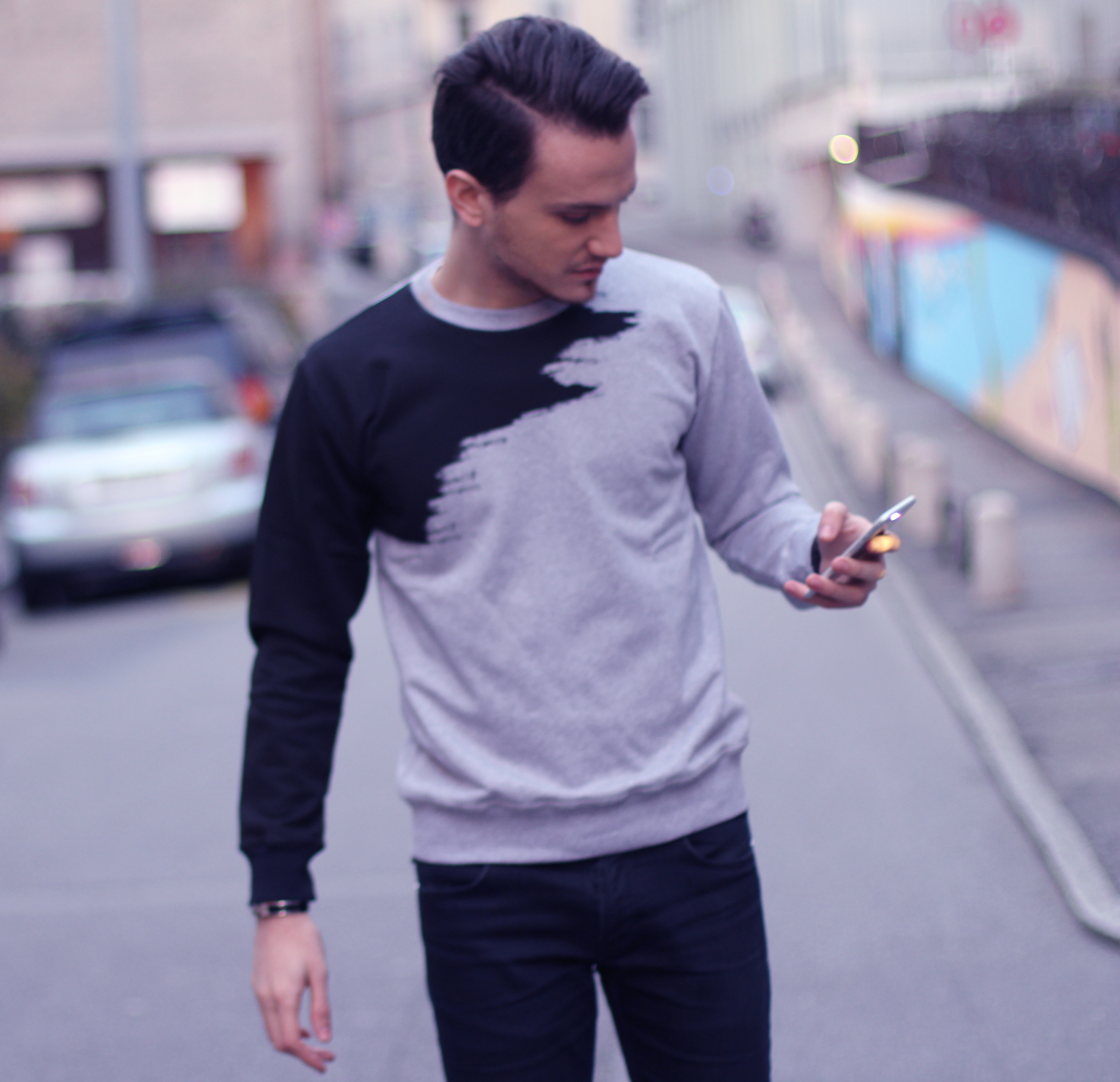 Lorsqu’il m’a fallu choisir une pièce autour de laquelle créer un look, j’ai immédiatement été attiré par ce sweatshirt au motif graphique. On dirait réellement qu’il a été peint. Il a été très facile de lui donner un look urban – casual street, en l’associant à un jeans foncé et des baskets blanches très minimalistes.