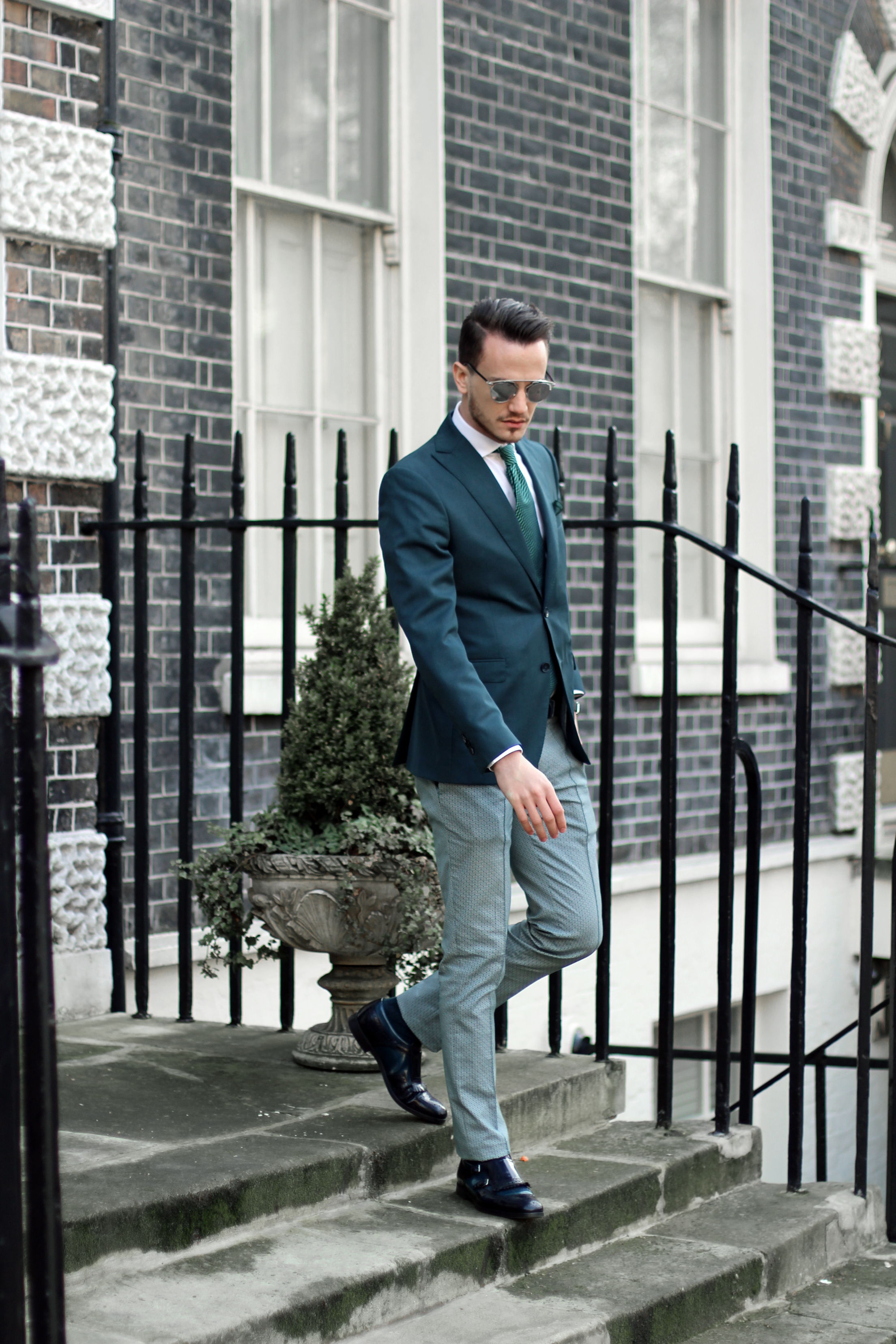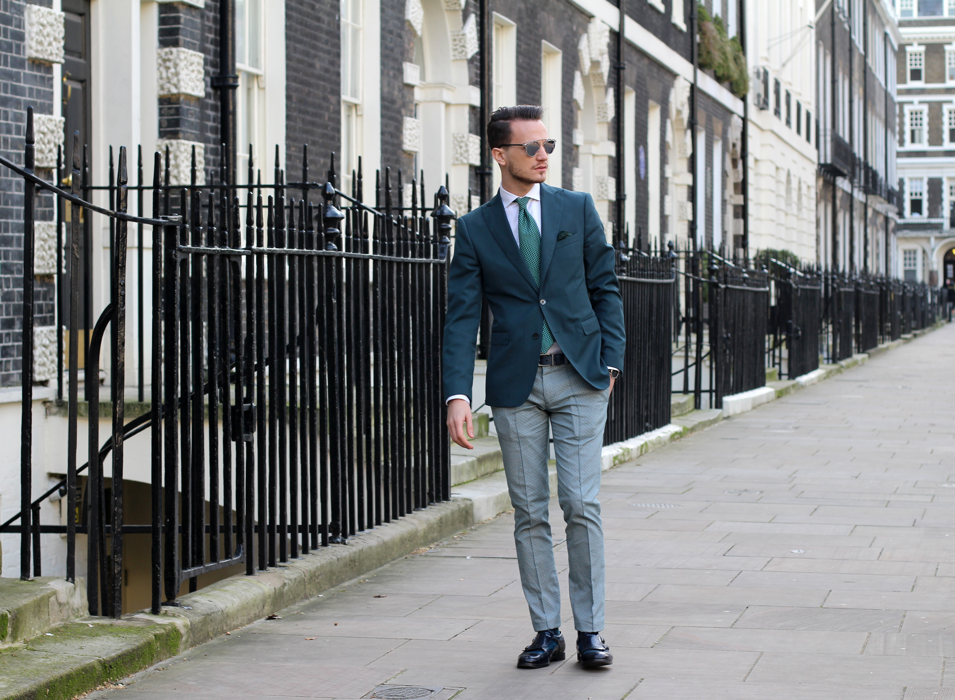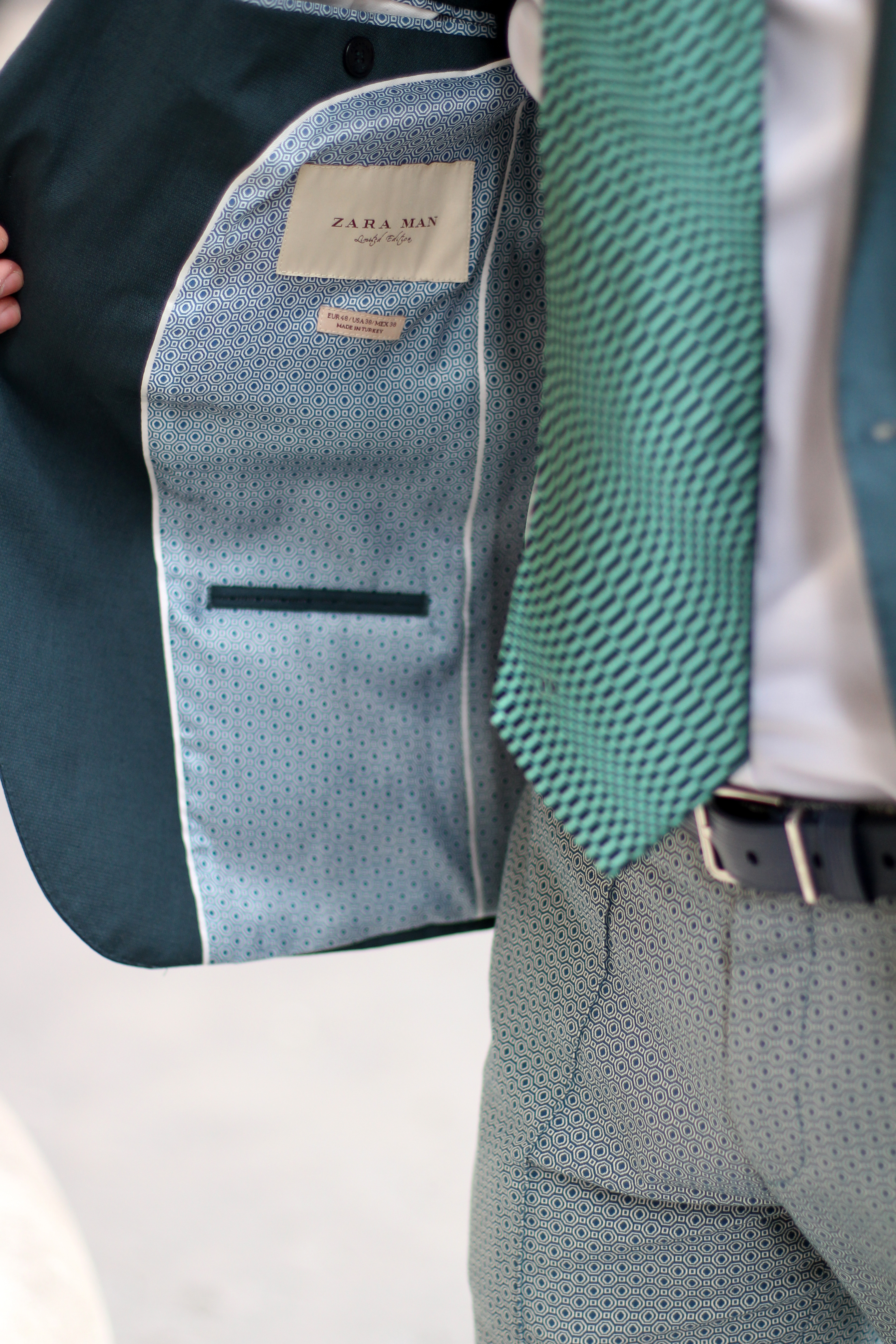 I played with shades of emerald and turquoise with a sophisticated look thanks to accessories and print trousers.