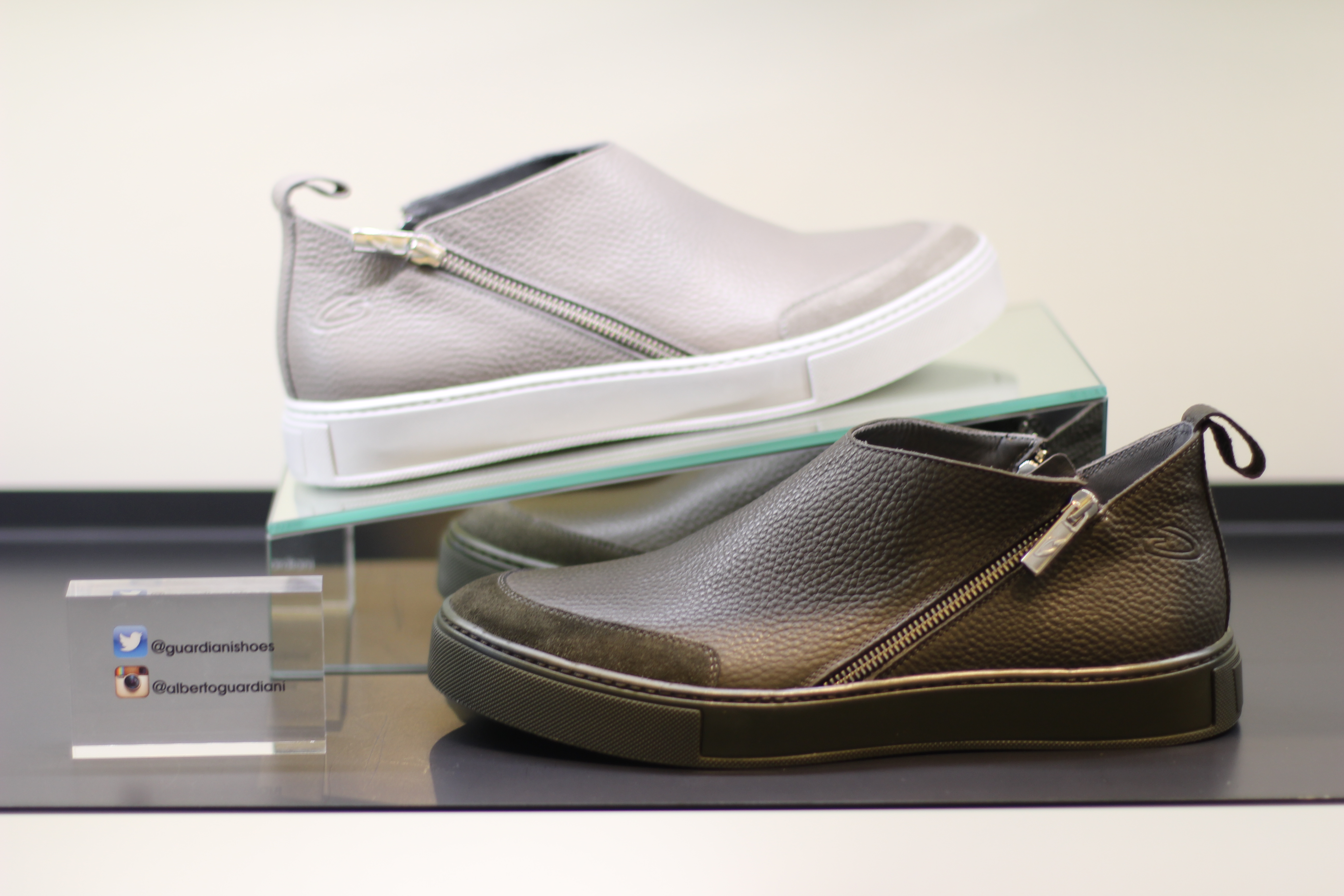 The TUDOR slip-ons in kaki or “forest green” color were a great example of what the brand stands for today: quality, craftsmanship and understanding of what a modern stylish man needs in his shoe wardrobe. Grained leather and suede for the chic details, large white sole for a clean touch, and a side zipper for a trendy touch.