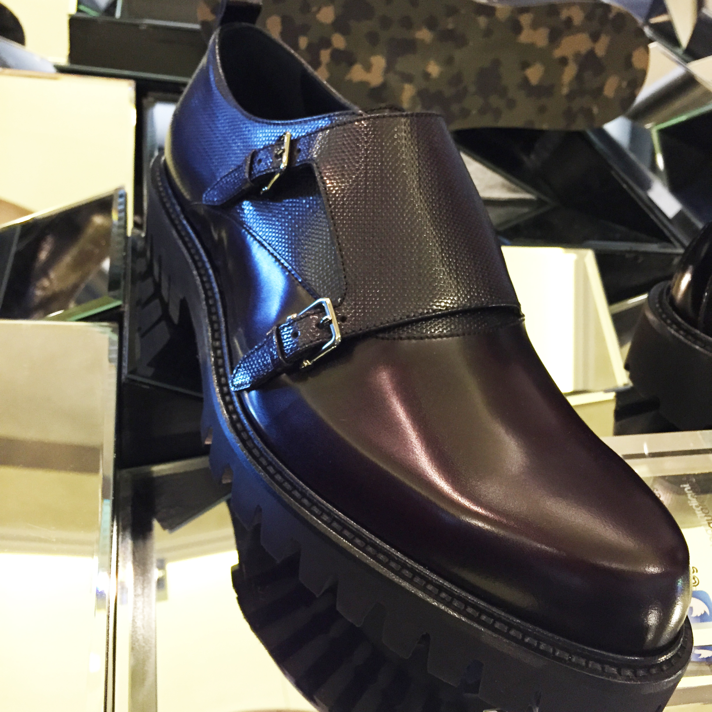The classic Italian shoe maker divided its Milanese showroom in two spaces to present its new collection .The first room introduced visitors to classic shoes, (derbies, brogues, boots or slippers) but under a british influence and reworked with innovative fabrics such as neoprene. The second room took it to the streets, with a line of luxury sneakers adorned with punchy details, such as flashy colors, studs or metallic bars.
