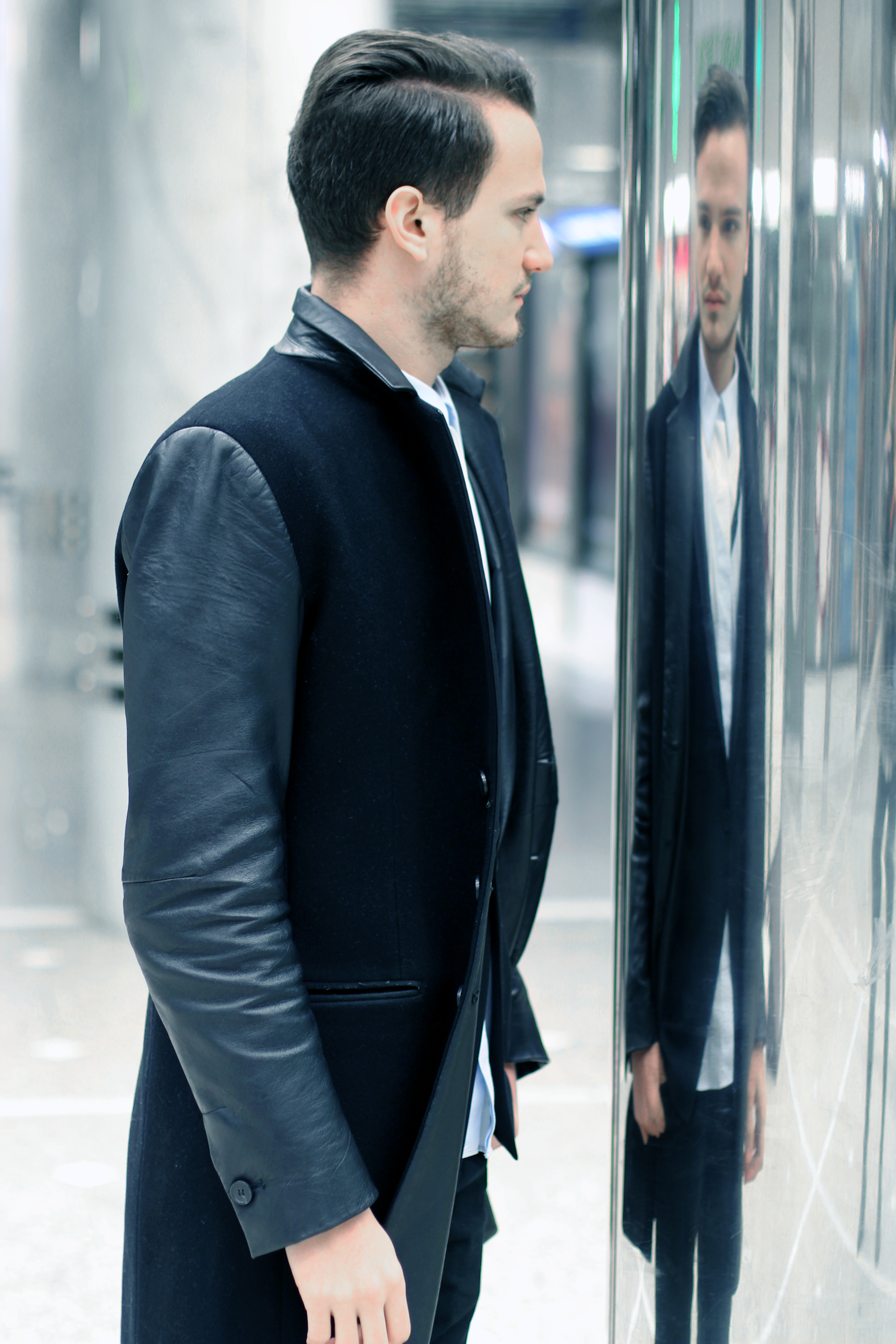 This look is about futuristic / graphic design, and upgrading an all black outfit with intricate details, such as leather details on the coat or zips on the jeans.