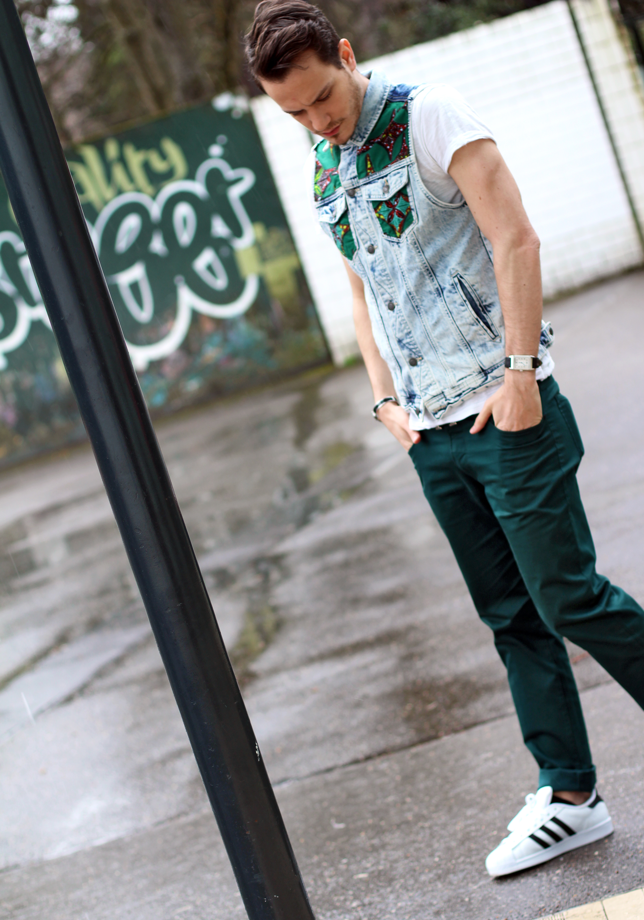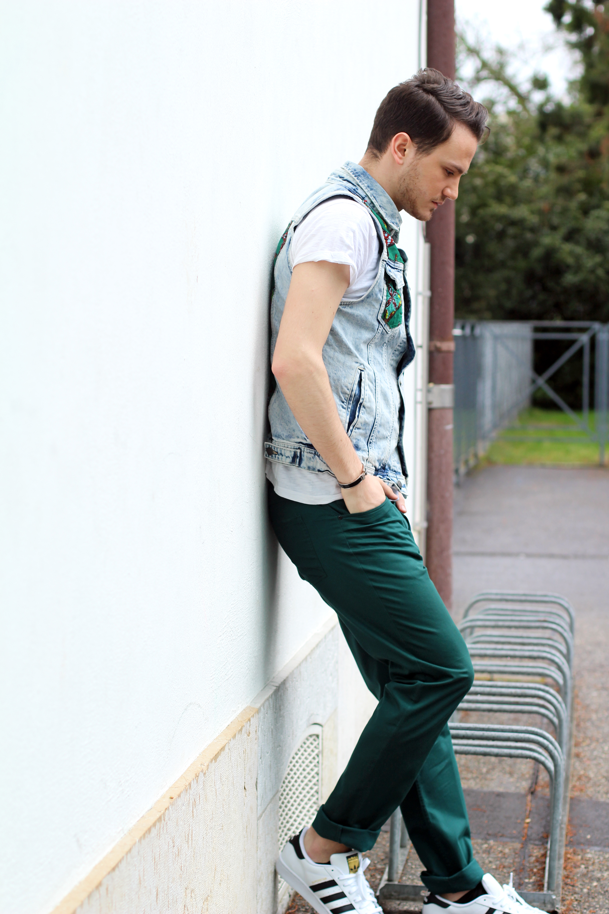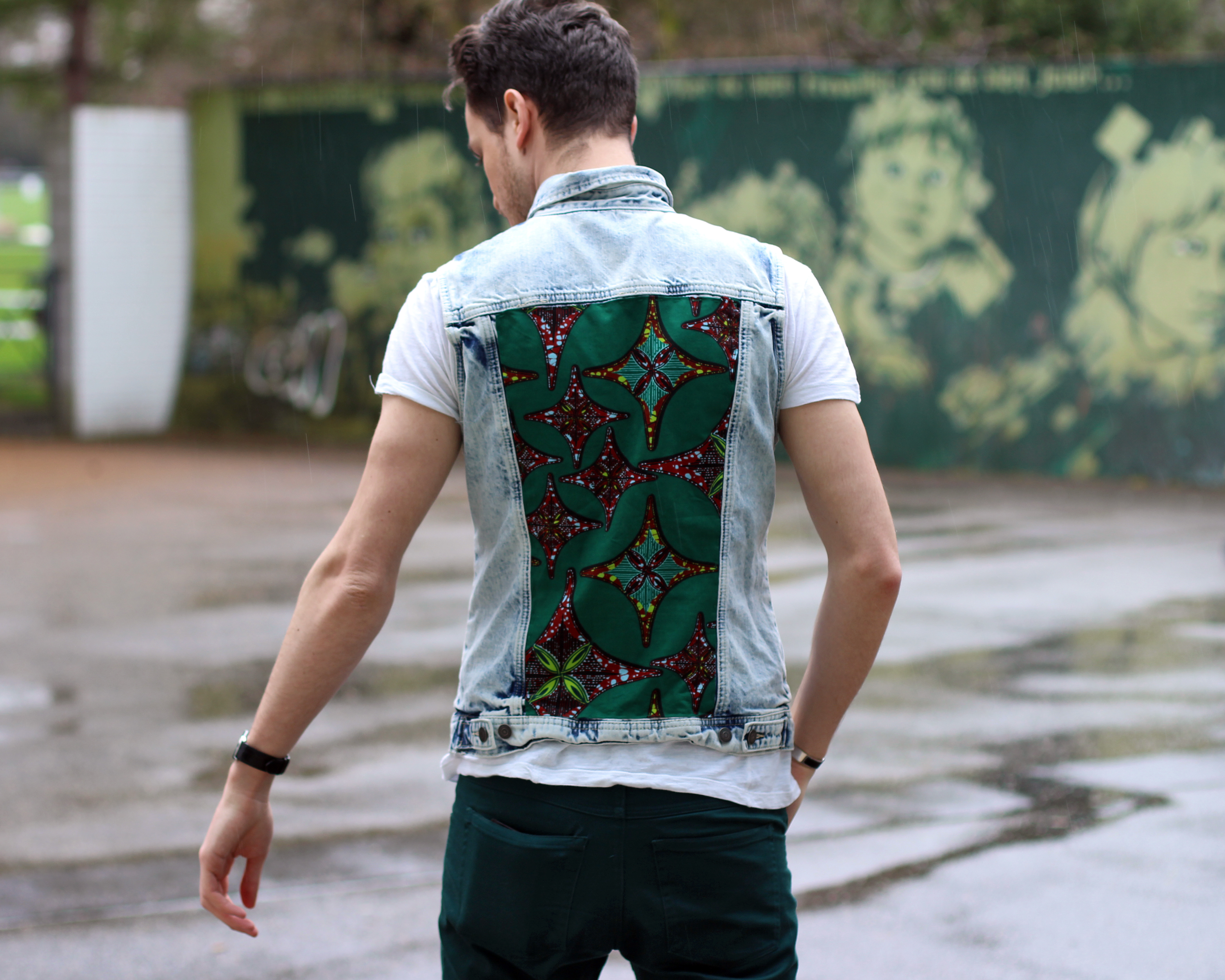 Nothing could be more trendy right now that a denim vest, and adding a touch of african print is the perfect way to make it look very original. The colorful print also gives many styling possibilities. I created this casual look with green trousers, a simple off white t shirt and some classic Adidas Superstar sneakers .