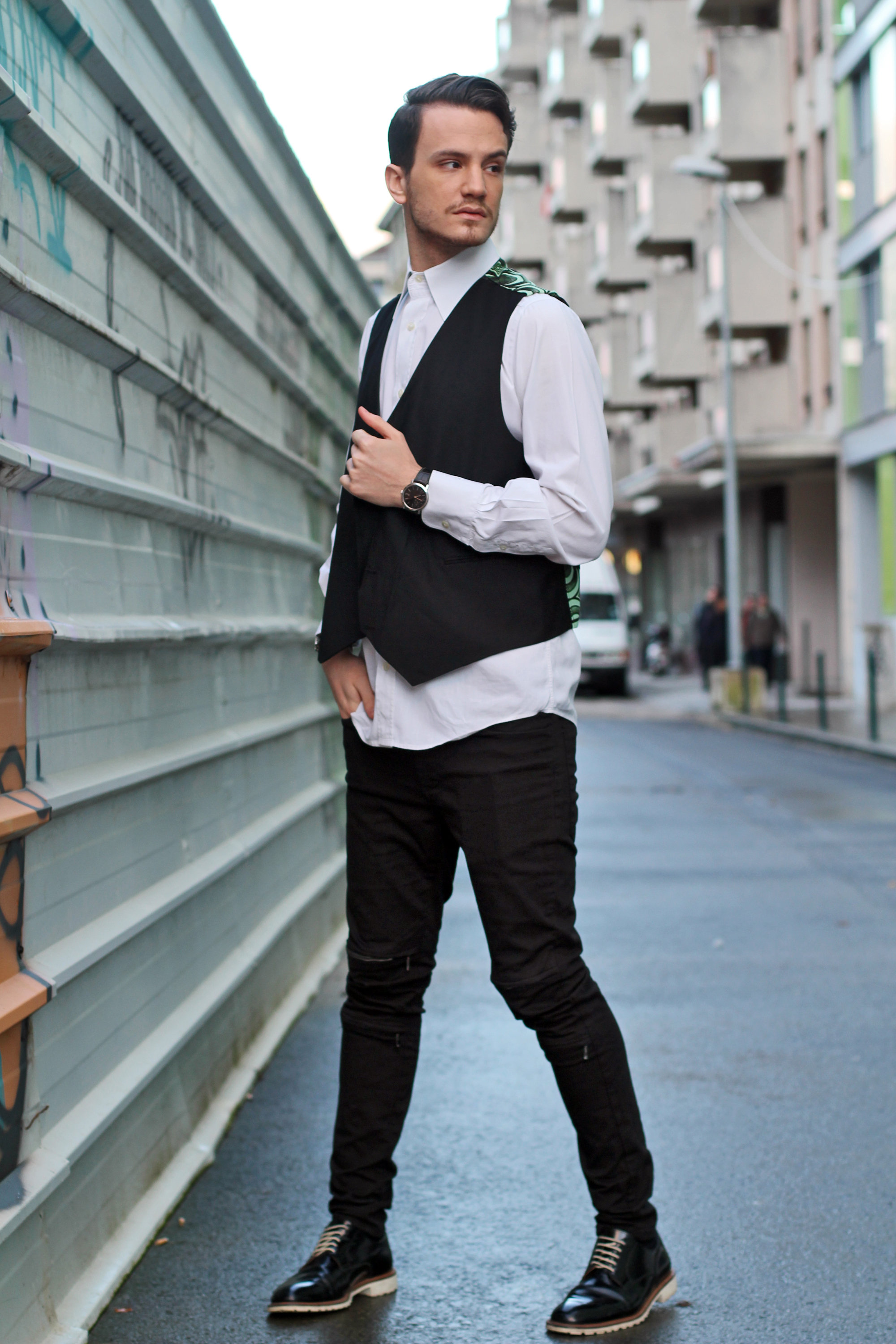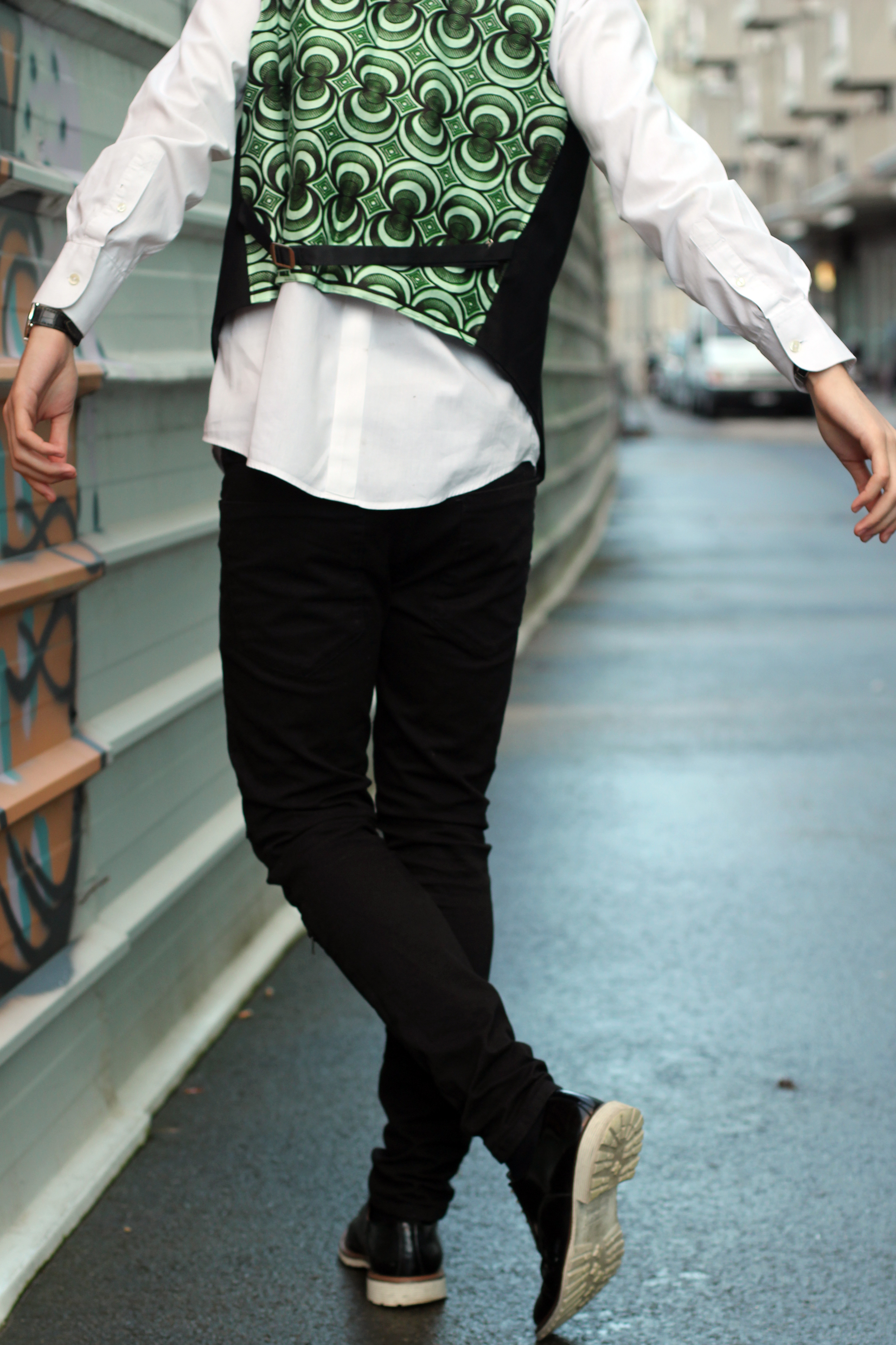 The TINA concept can be applied to all kinds of clothes. To showcase that, I picked a very different piece: a classic black suit vest, with a beautiful print all over its back.