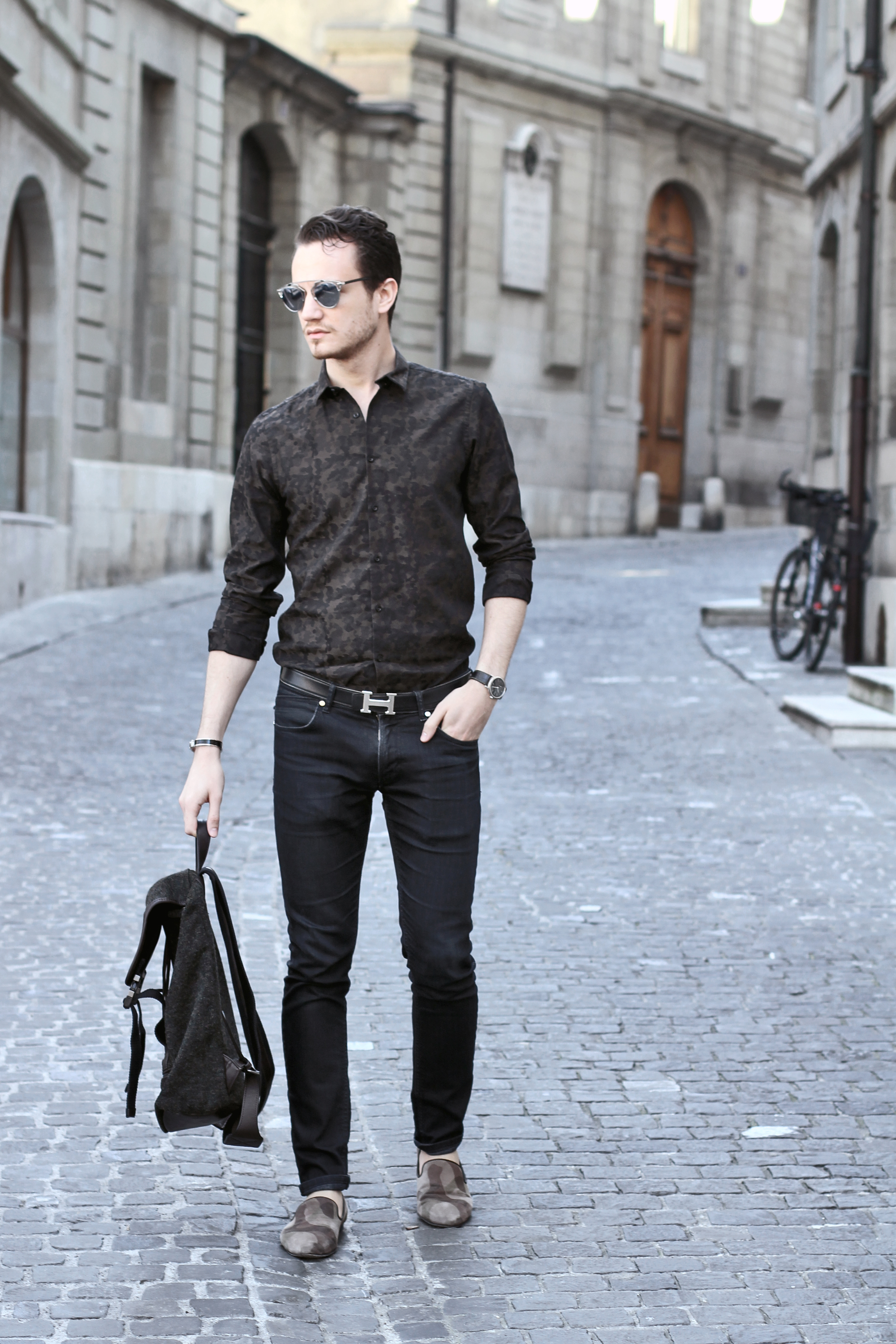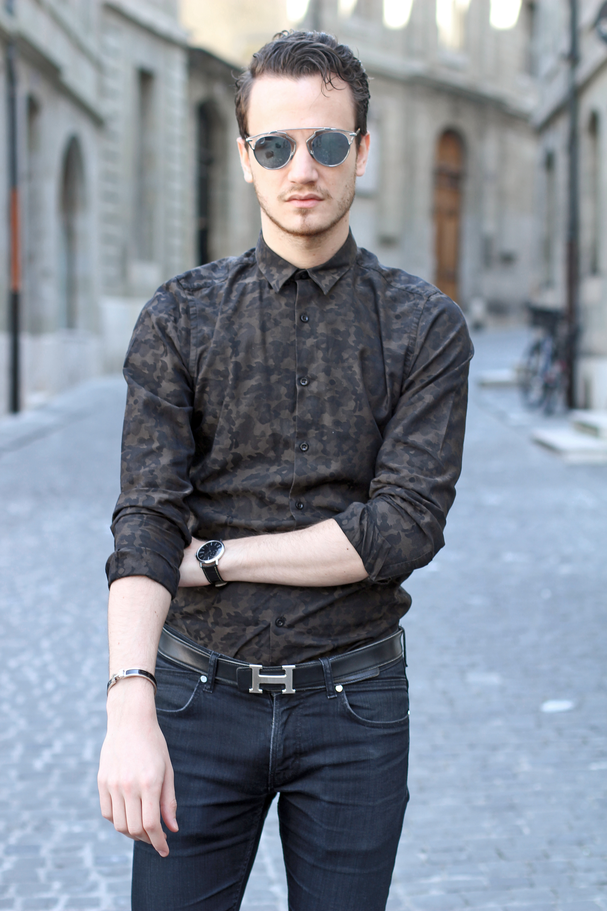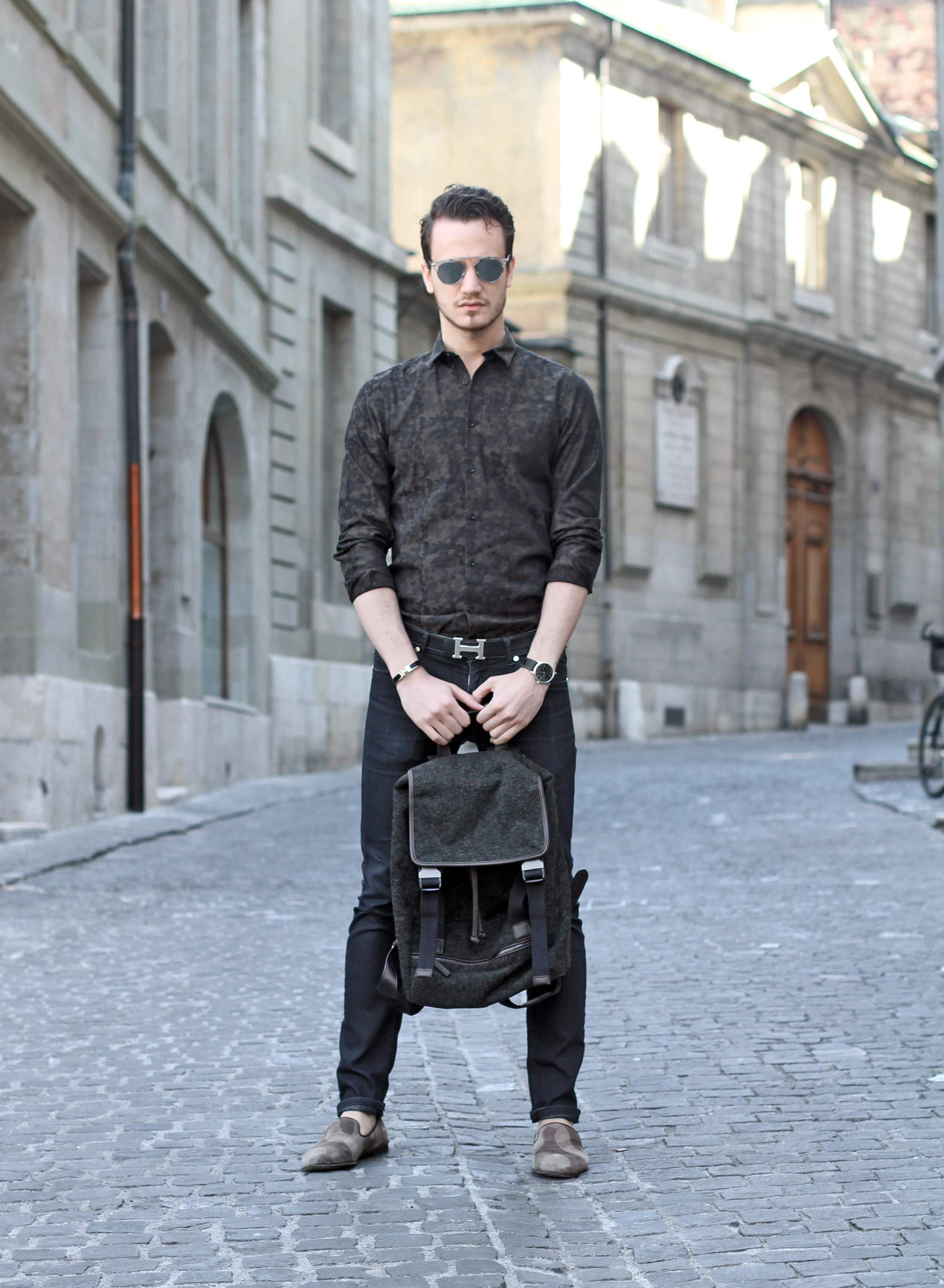Today’s #ootd – outfit of the day- is camouflage inspired, thanks to a print shirt and matching loafers, around a pair of used dark jeans.