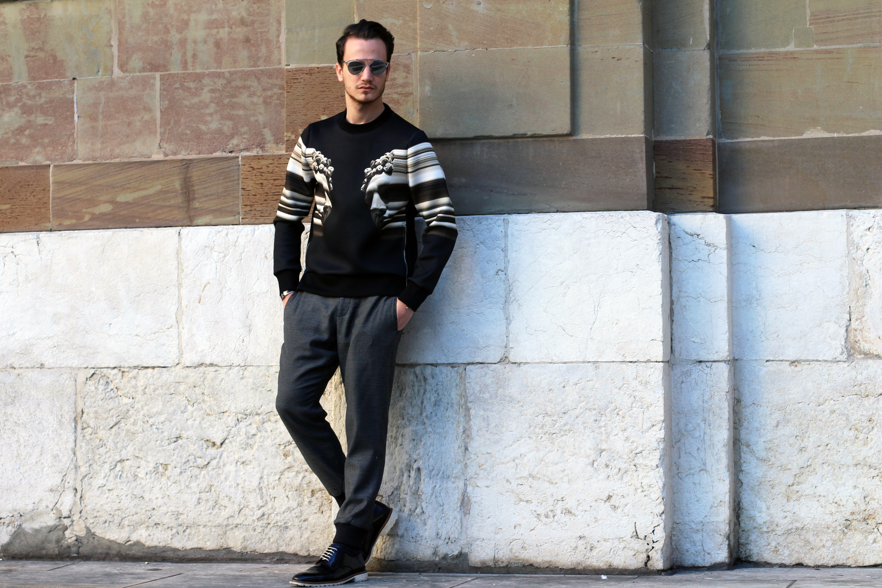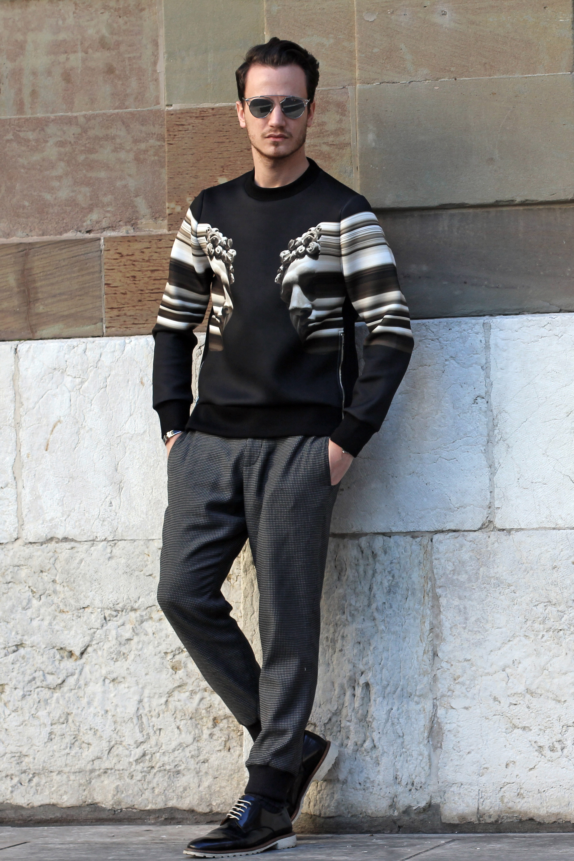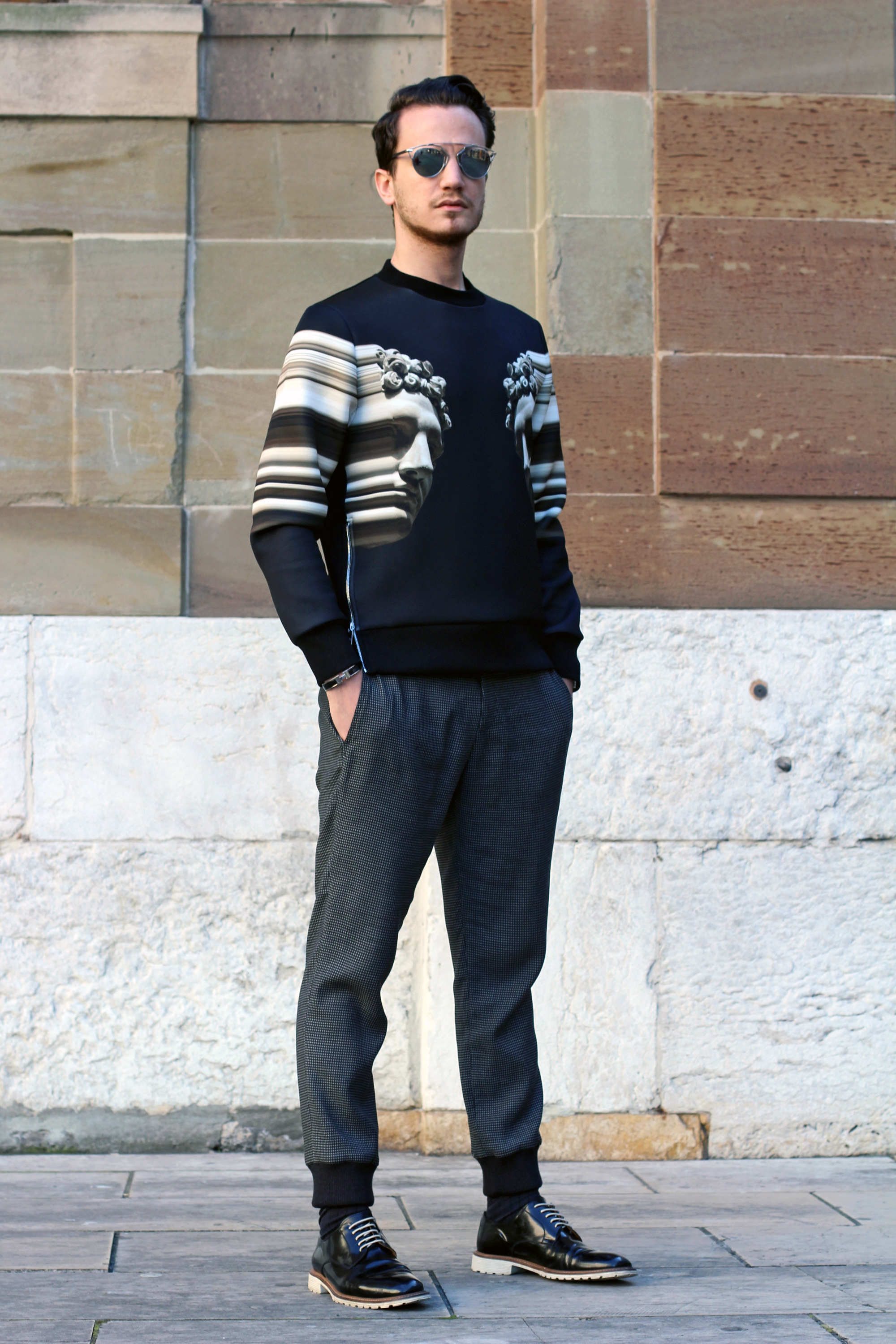 I’m wearing an exceptional new Neil Barrett sweater featuring digitally printed and modified Greco-Roman imagery.