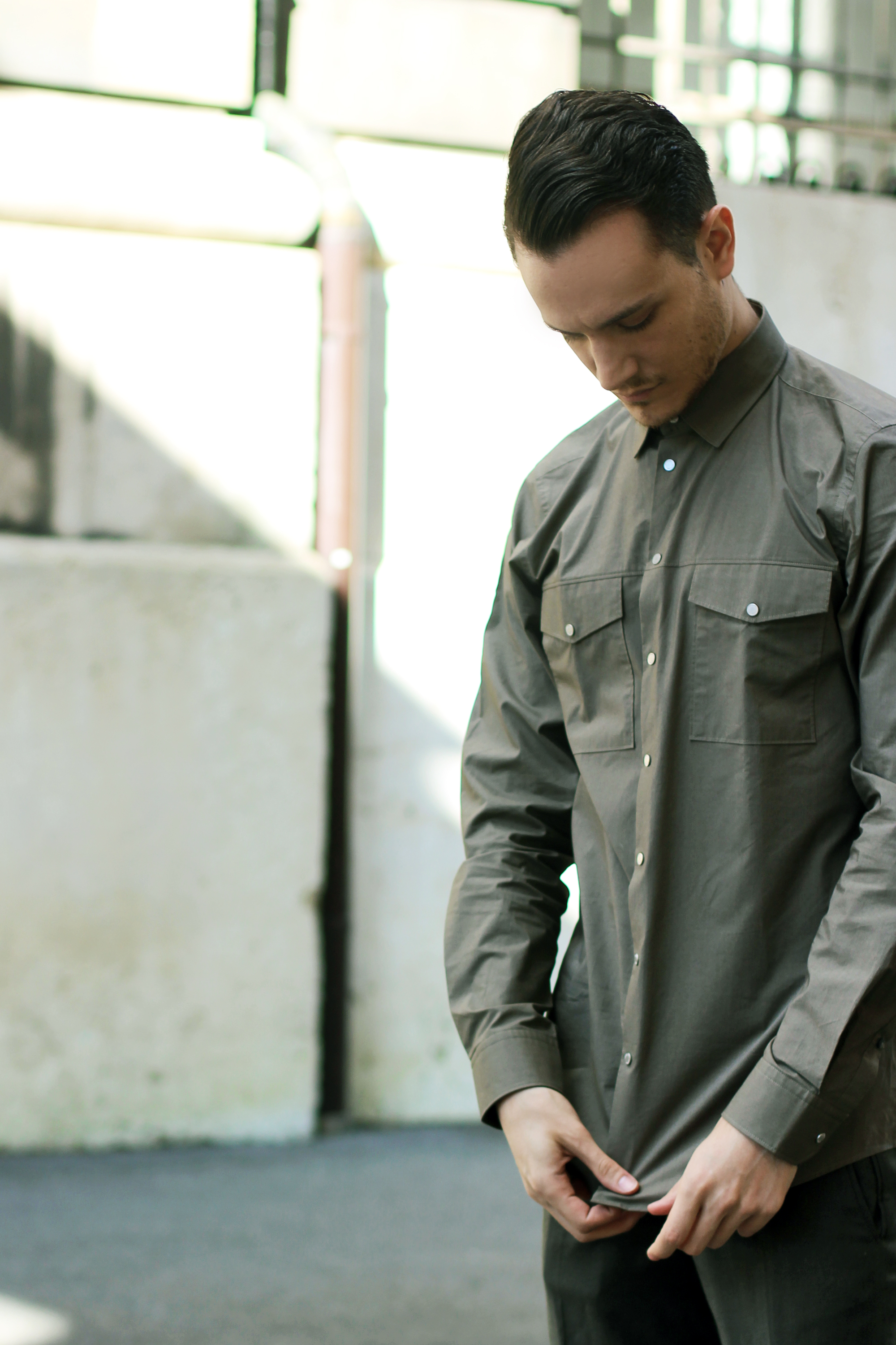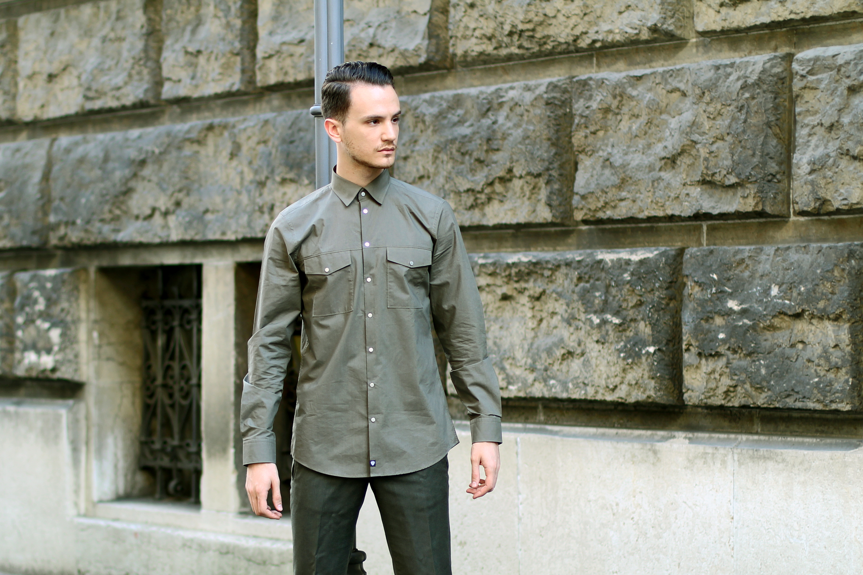 I’m a fan of monochromatic looks. It was therefore very easy to style this kaki shirt from the Strellson Premium line. Dress it up or down: it’s slim fit cut makes it possible to wear inside pants or out. Under a suit, its pressure buttons will give your look a contemporary stylish touch. Pair it with matching chinos and minimal sneakers for an off-work casual-chic look.