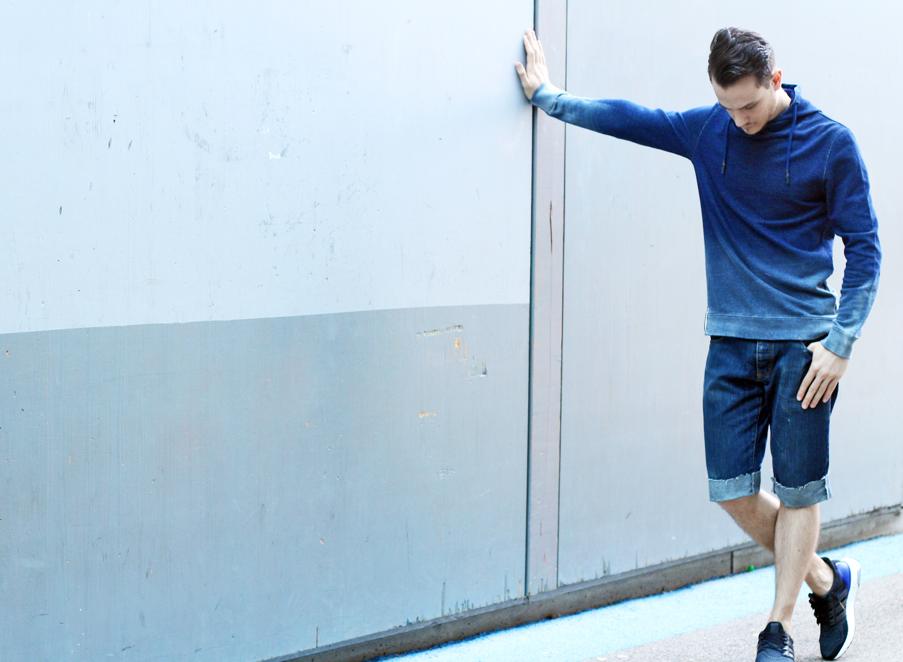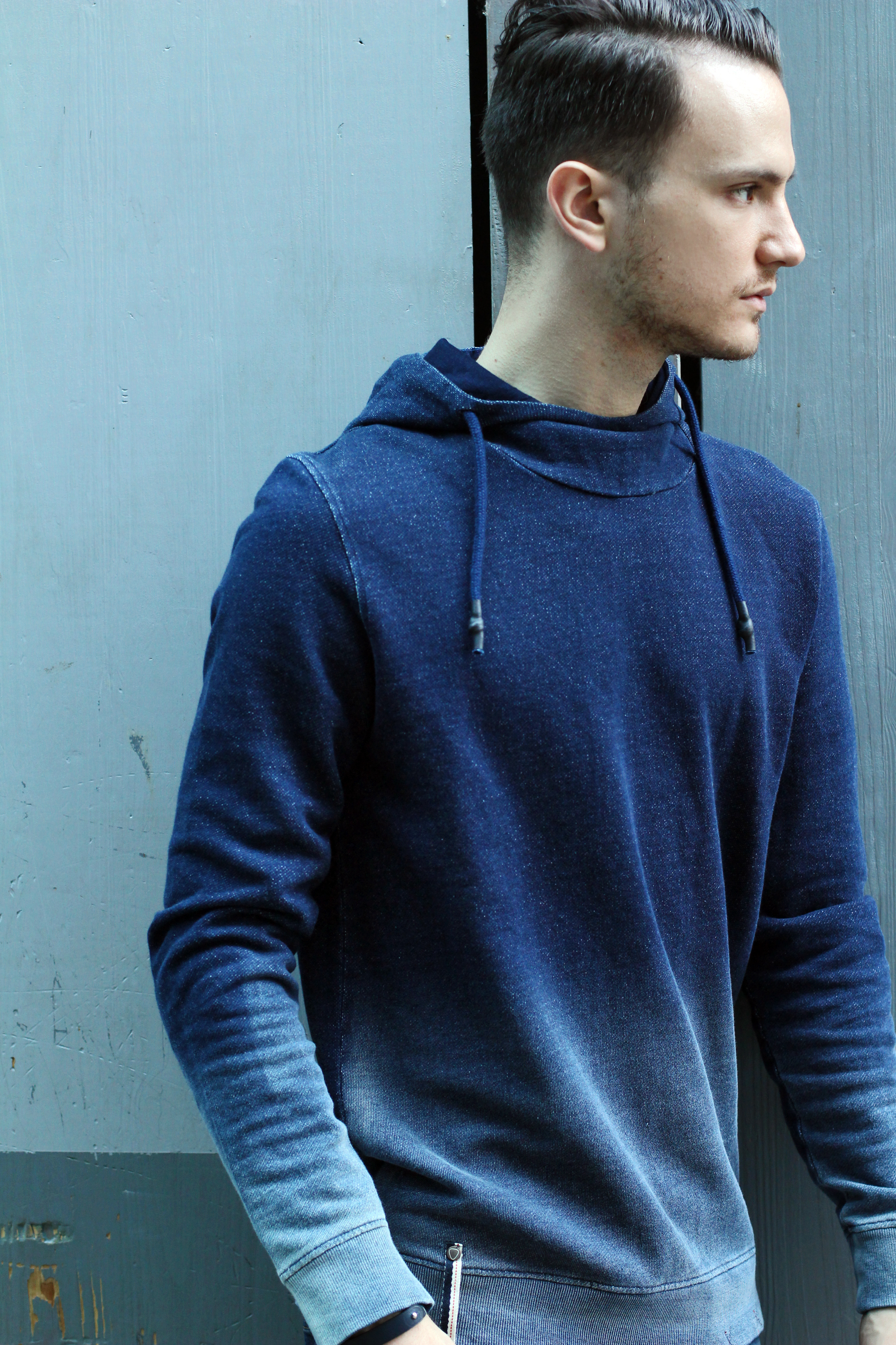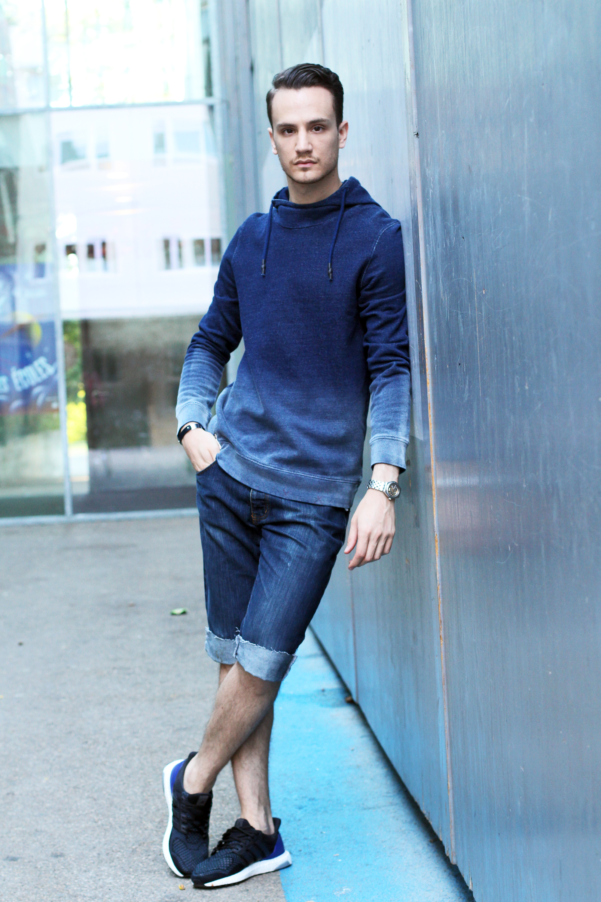 This third and last look is centered around the Strellson “Shin” sweatshirt. Its indigo-blue dégradé makes it very eyecatching. Its fading colors seem to reflect light as you move. Perfect combination with denim short or jeans, it makes it easy to look cool and comfortable.