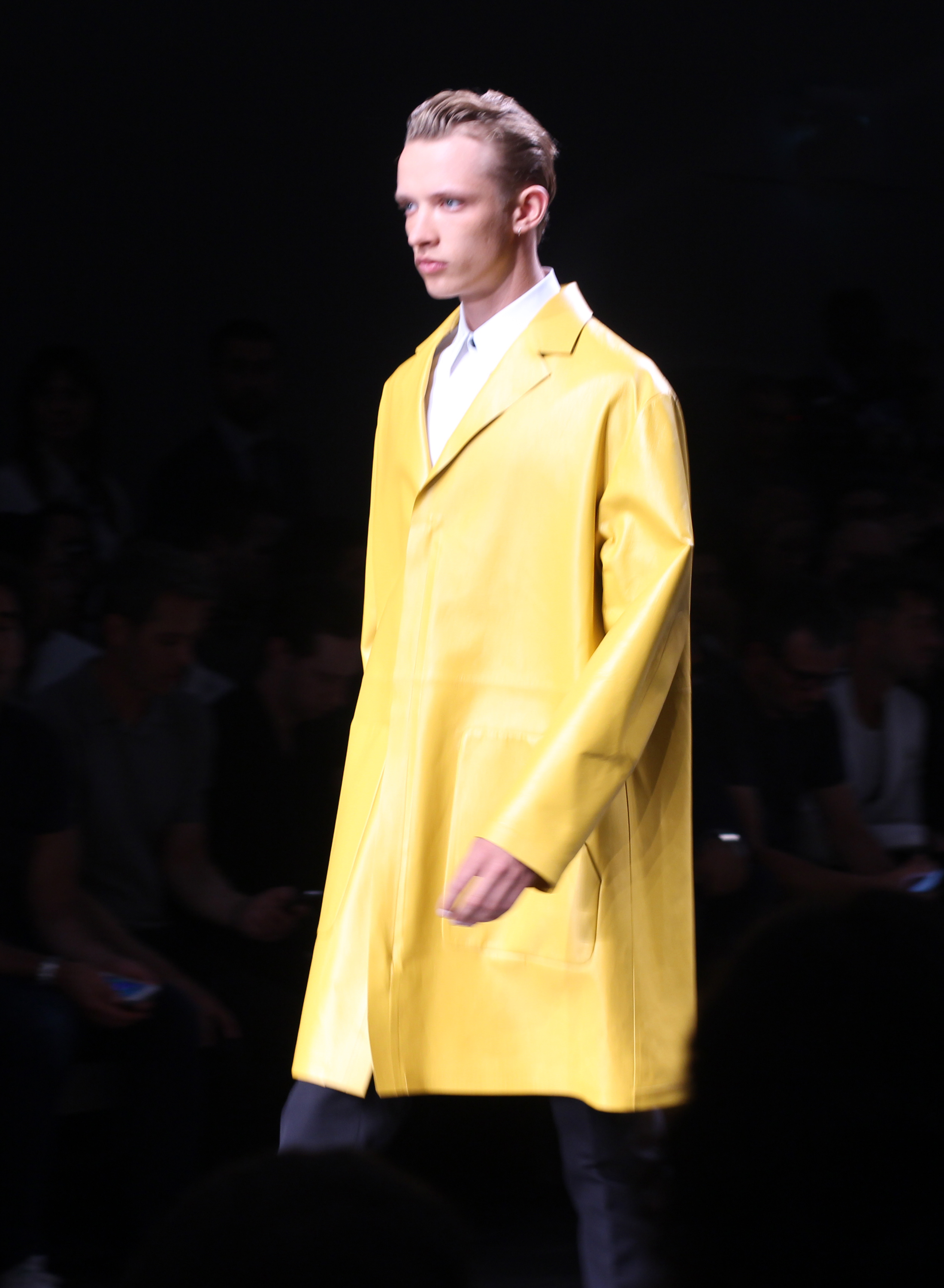 Another set of luxury sportswear looks, and suddenly you’re blinded by a luminous yellow leather coat taking center stage. The leather, in all colors, is very light and almost “liquid”.
