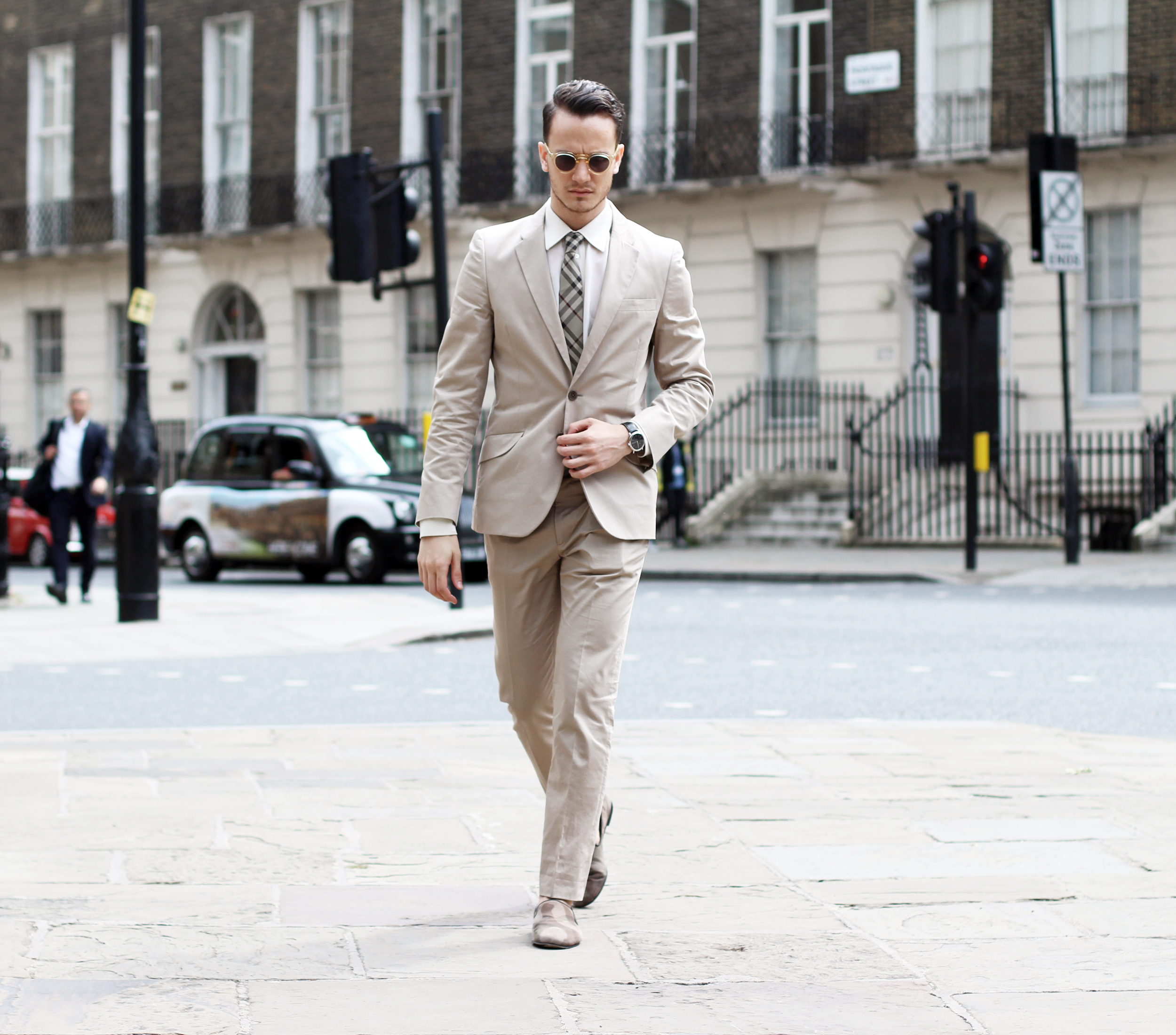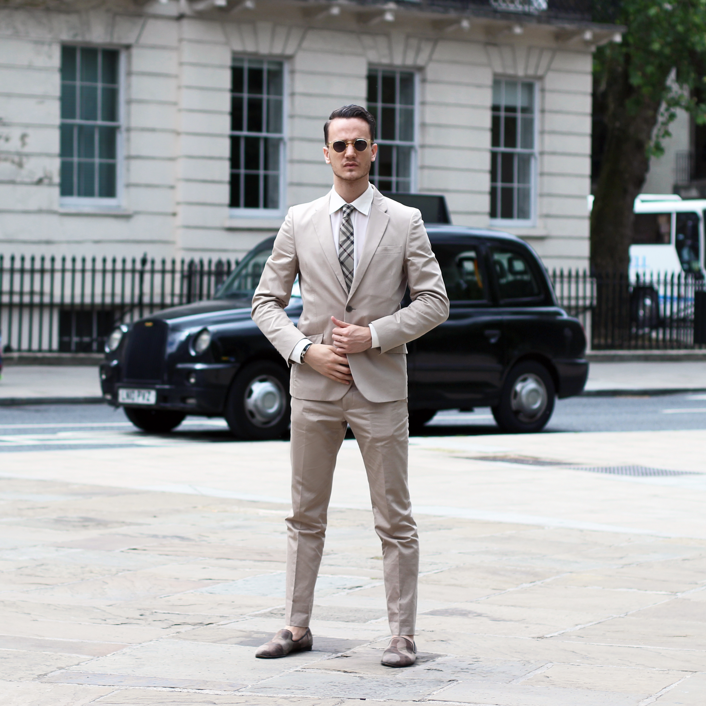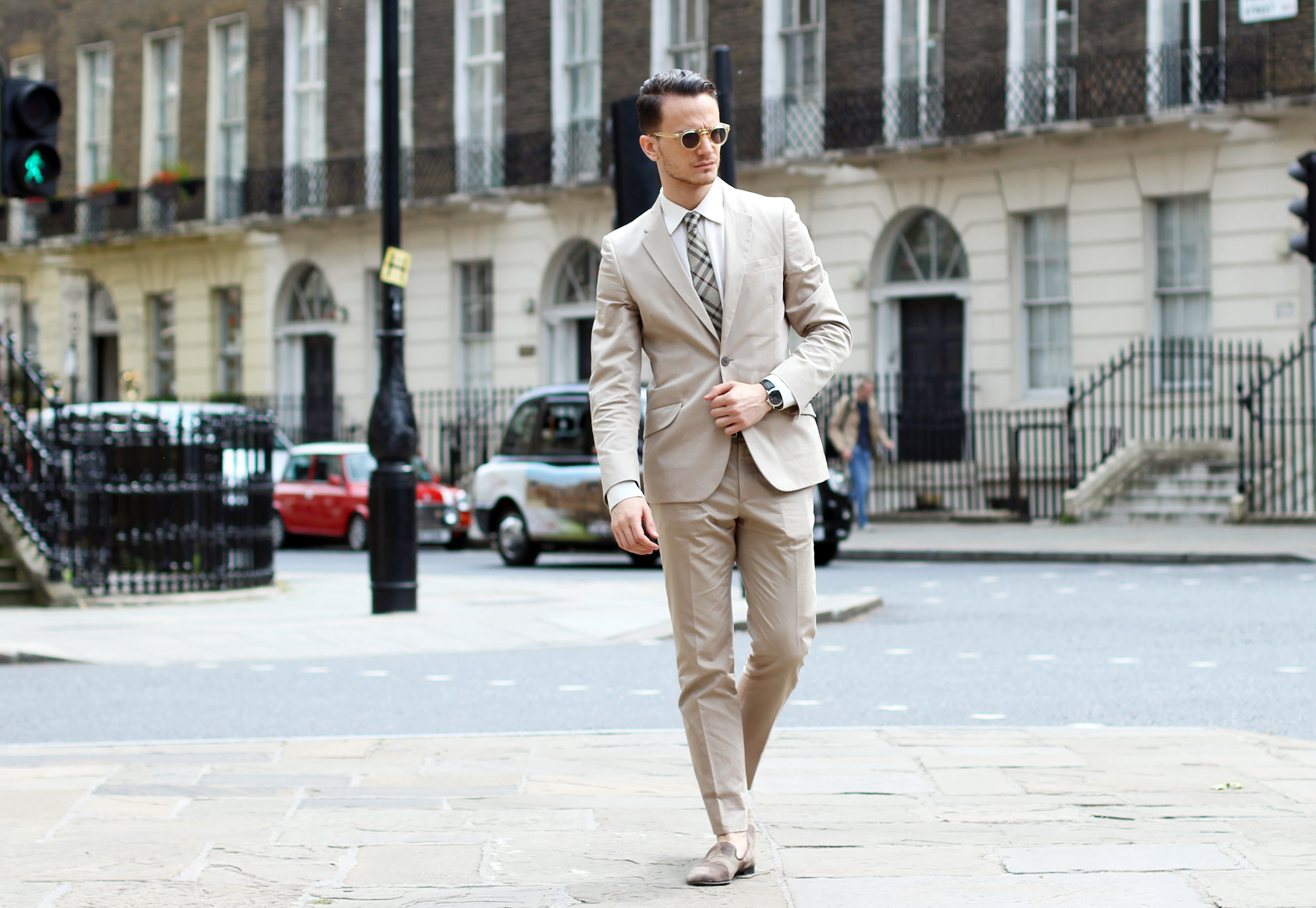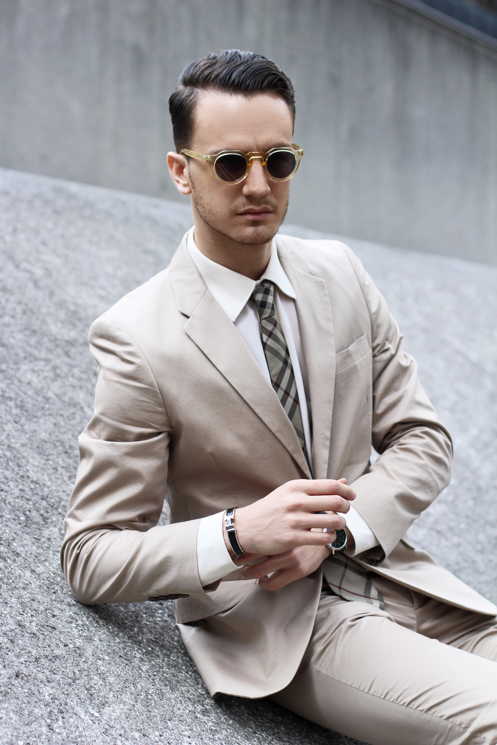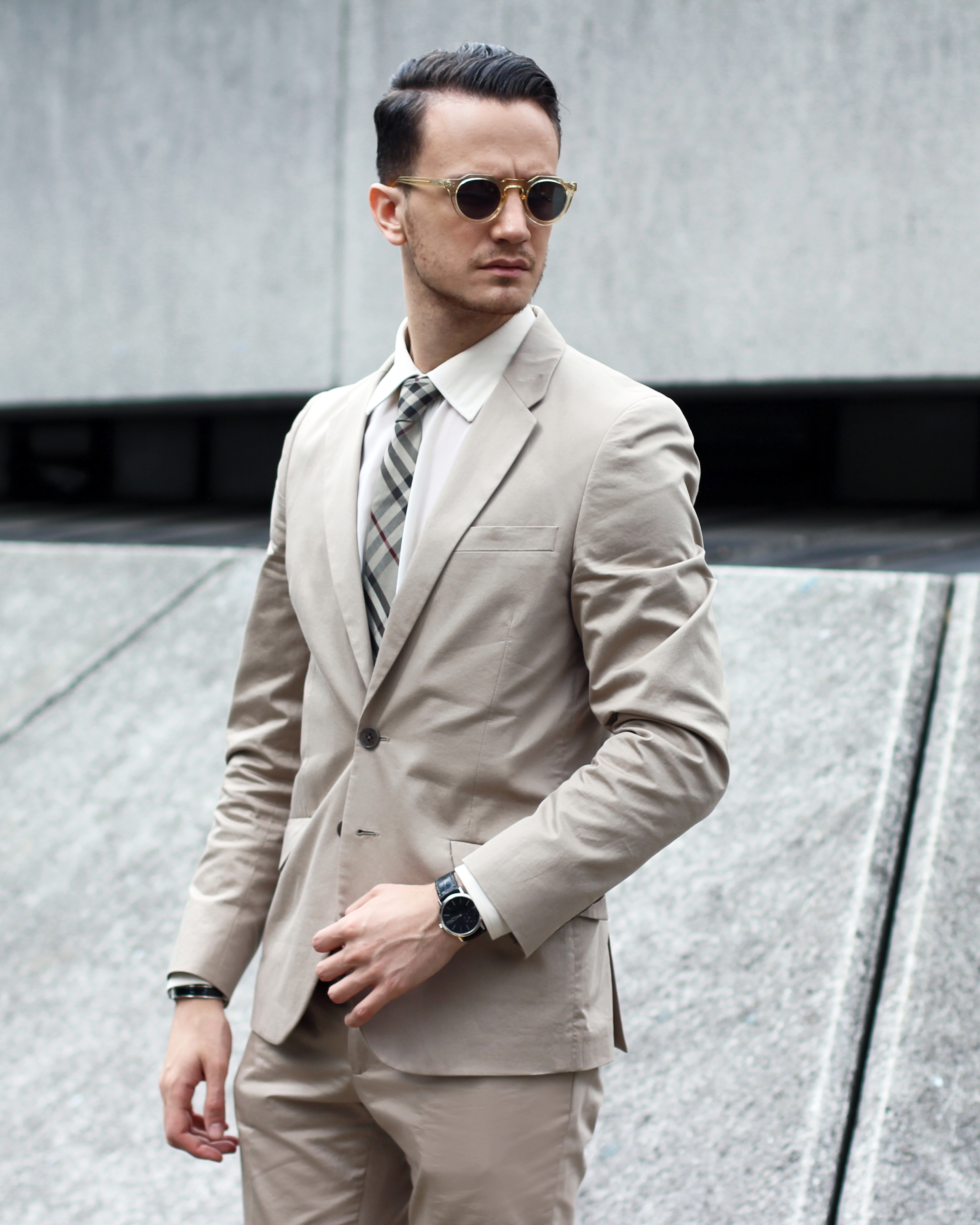 I went for a cream Paul Smith suit, with a matching silk shirt and Giuseppe Zanotti camo loafers. I accessorized the look with Lesca Lunetier Vintage eyeglasses and, of course, a beige Burberry classic check tie.
