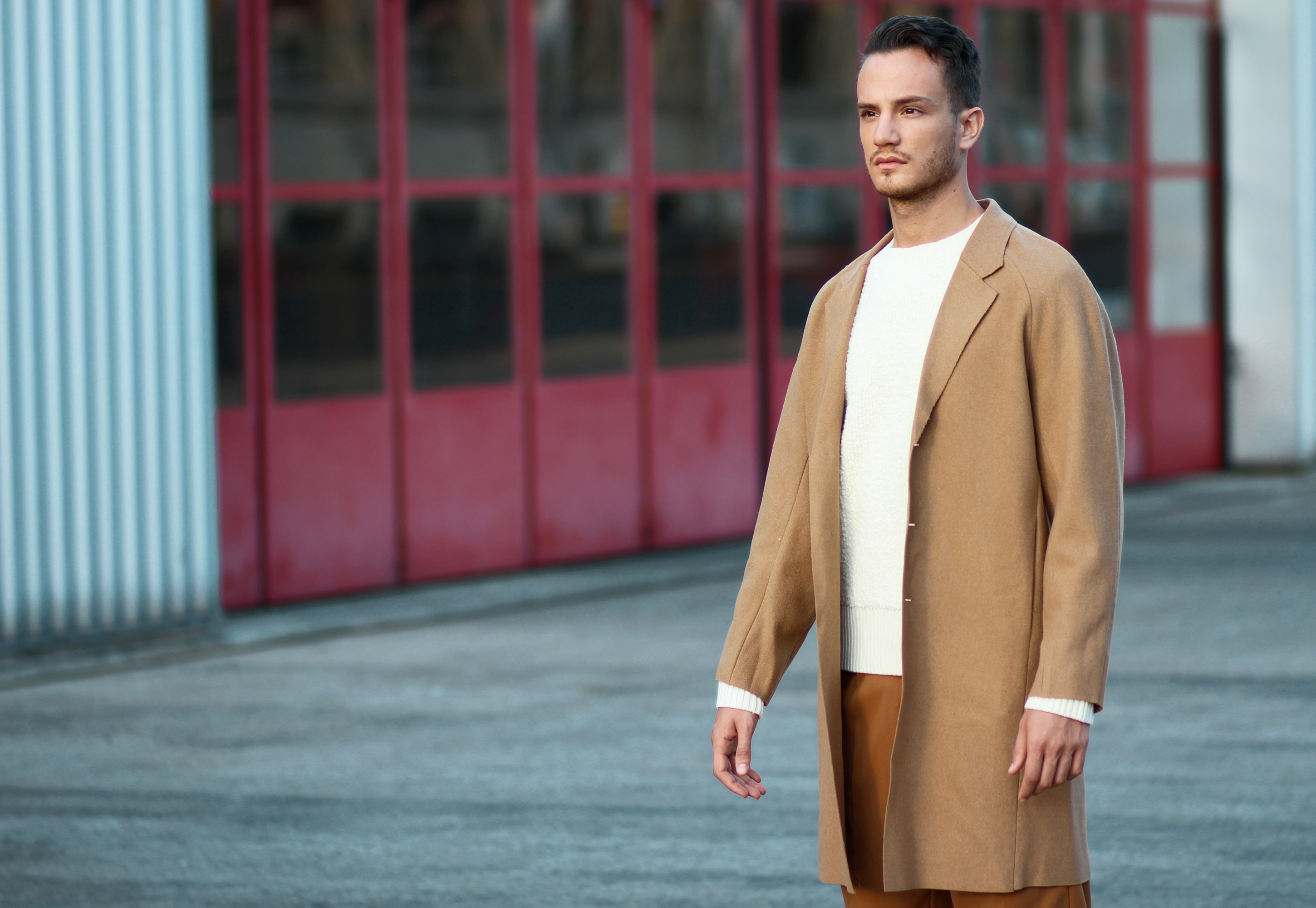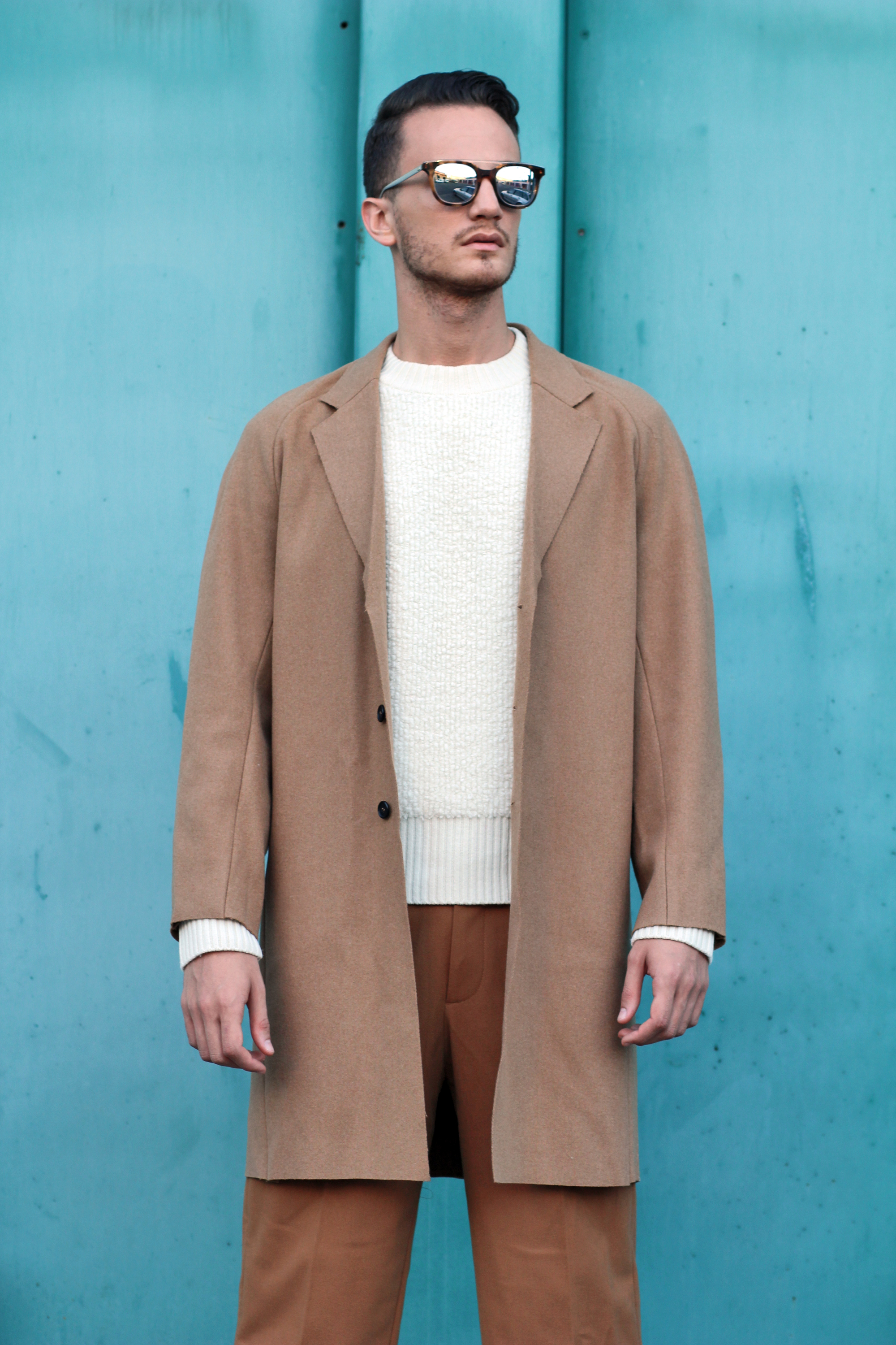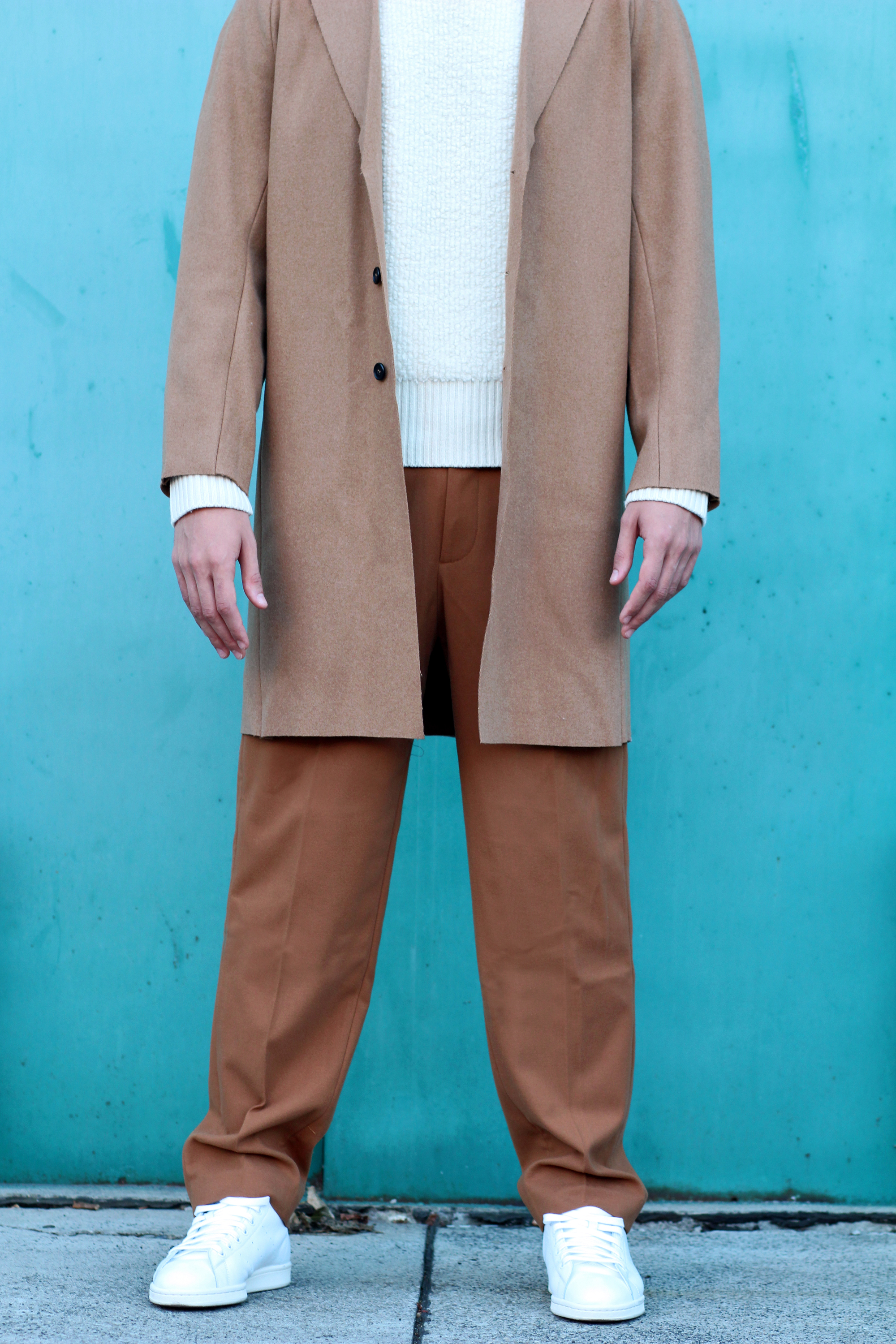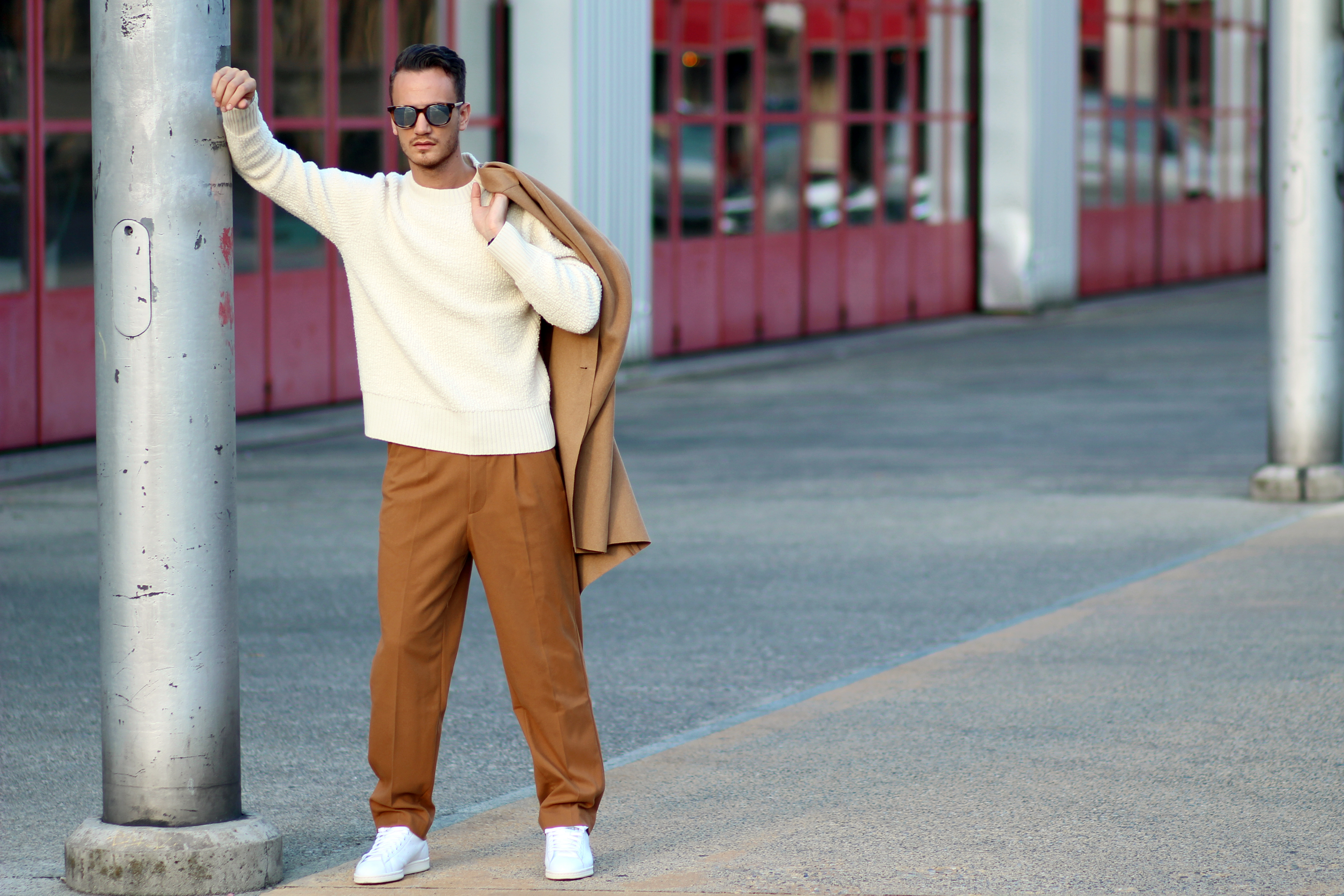 The camel overcoat is very thin, therefore perfectly complements the thickness of the sweater. Light and warm at the same time, the comfort that comes with wearing baggy trousers once again freed my movements while shooting.