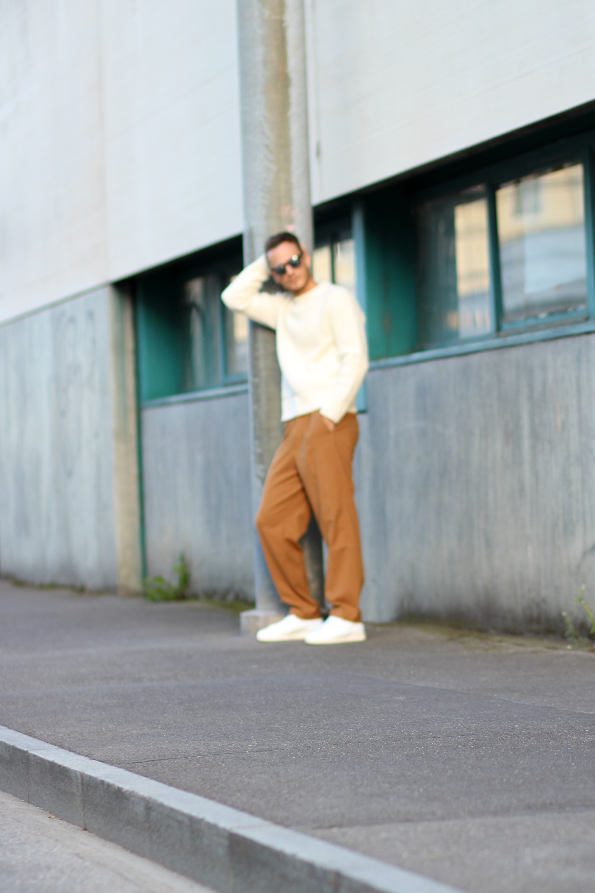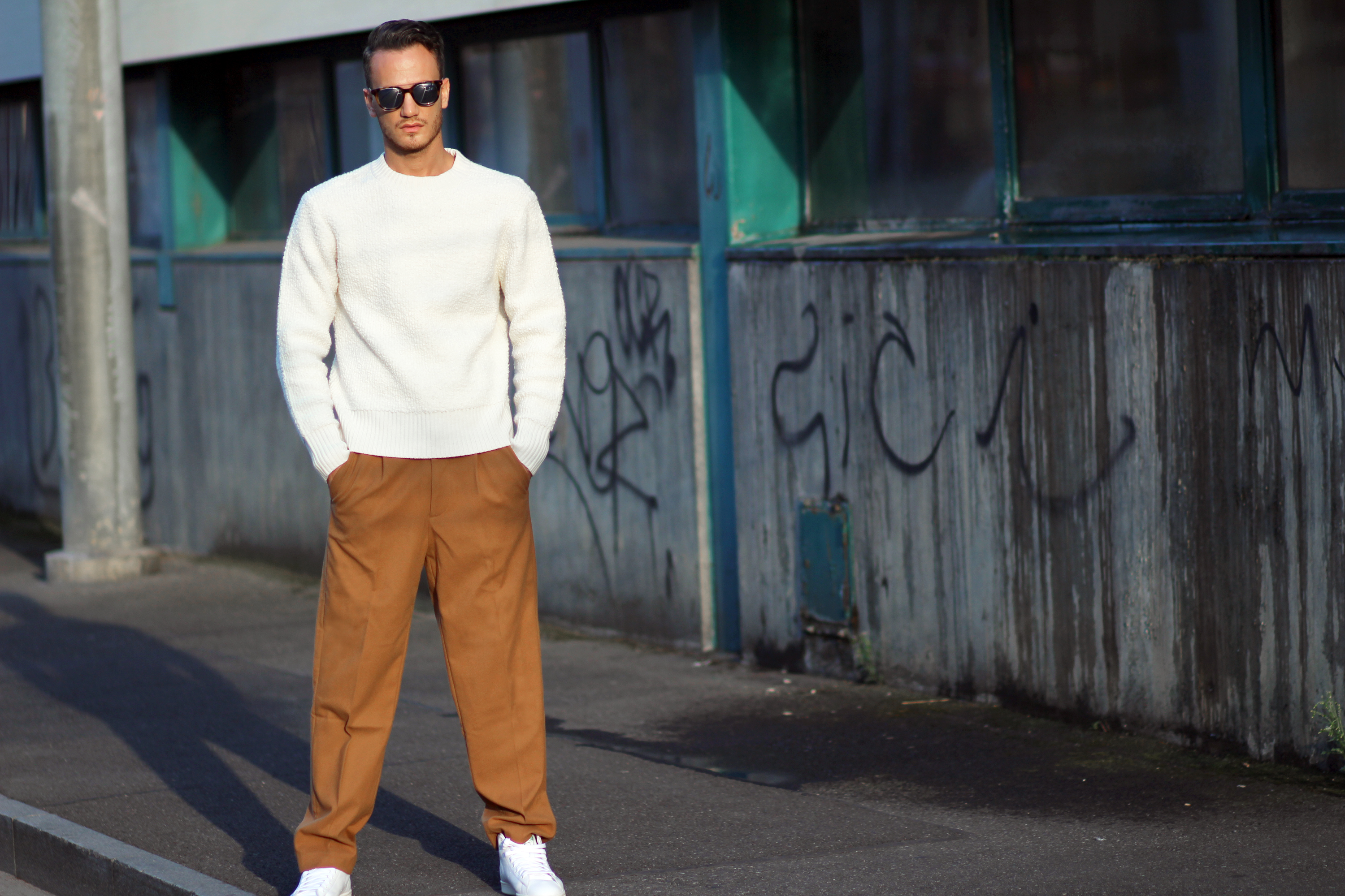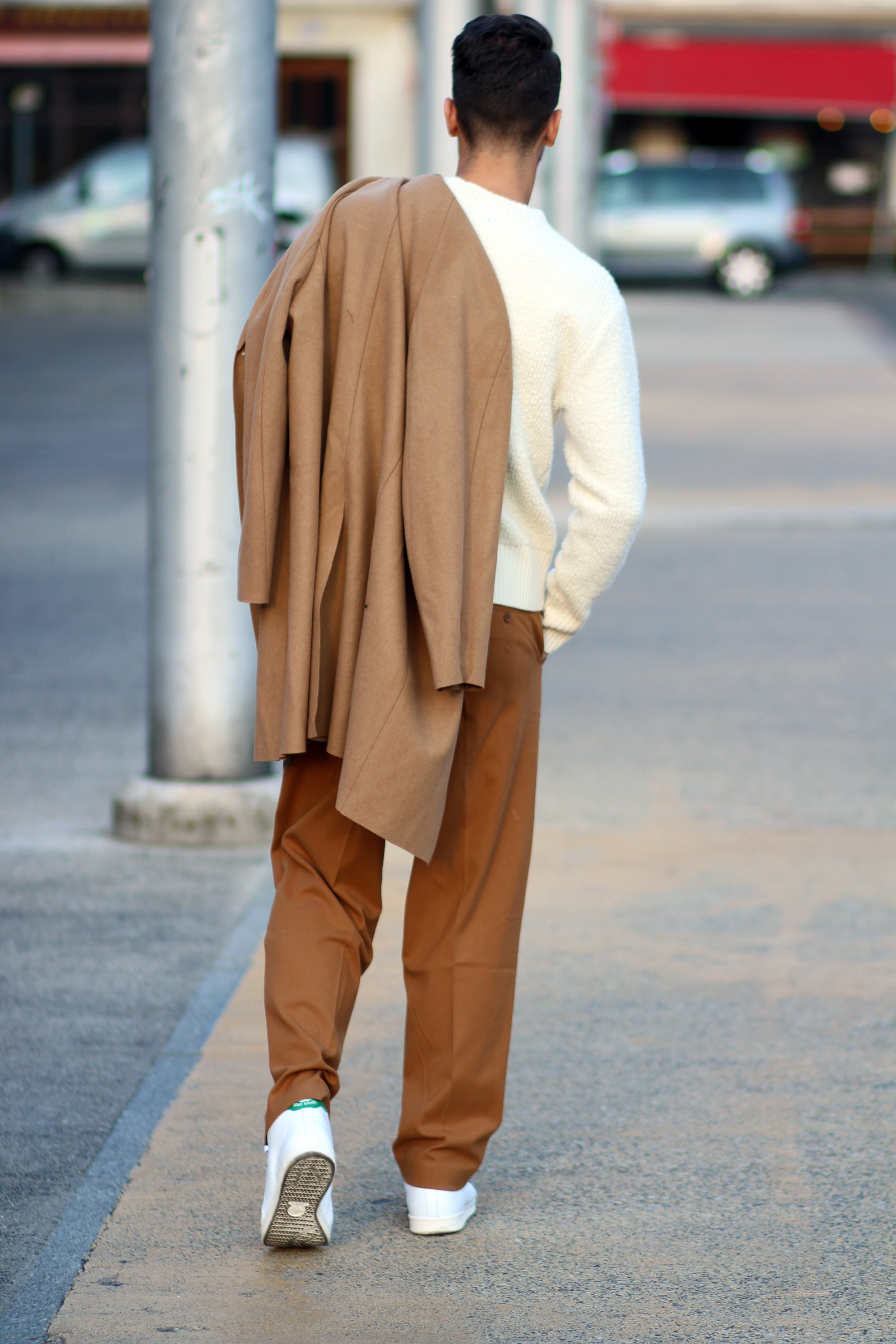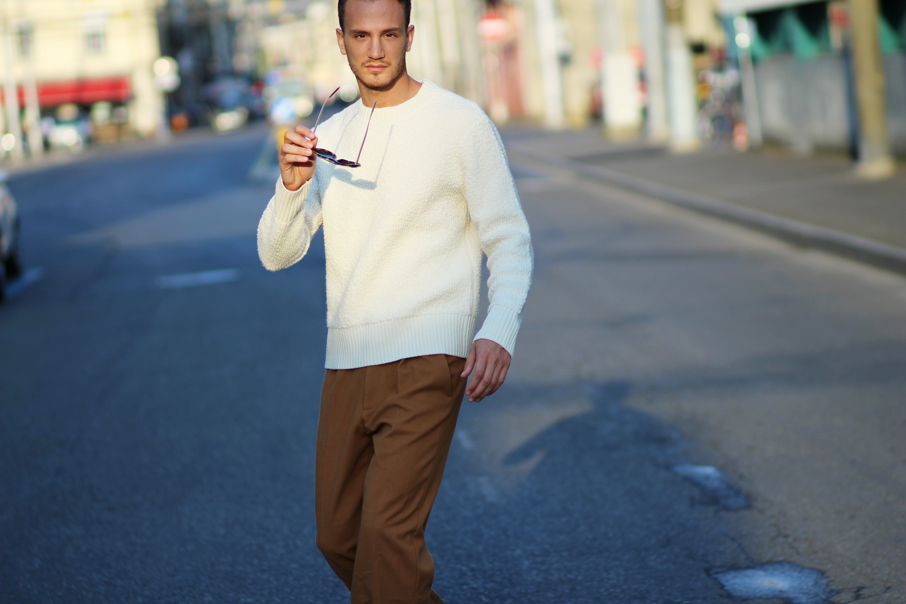 The camel overcoat is very thin, therefore perfectly complements the thickness of the sweater. Light and warm at the same time, the comfort that comes with wearing baggy trousers once again freed my movements while shooting.