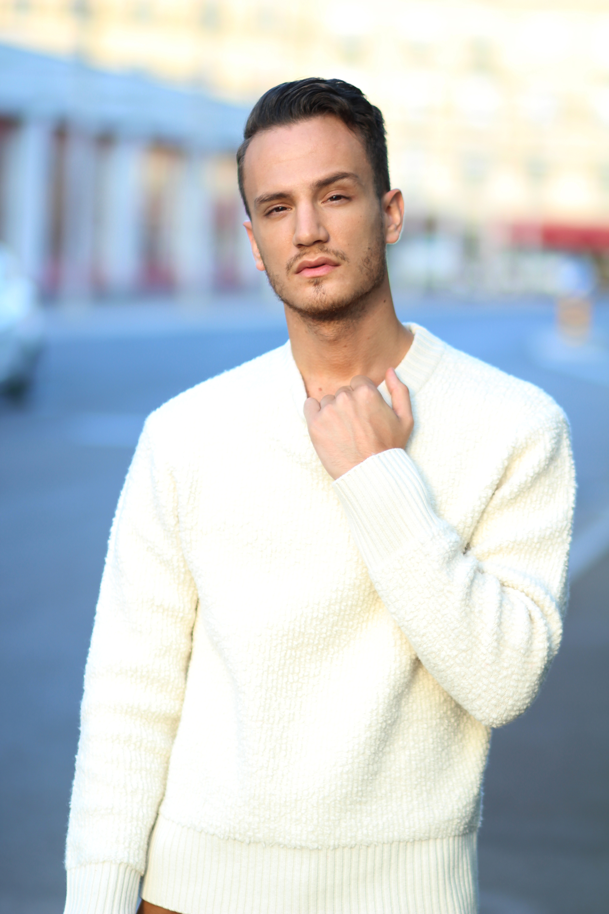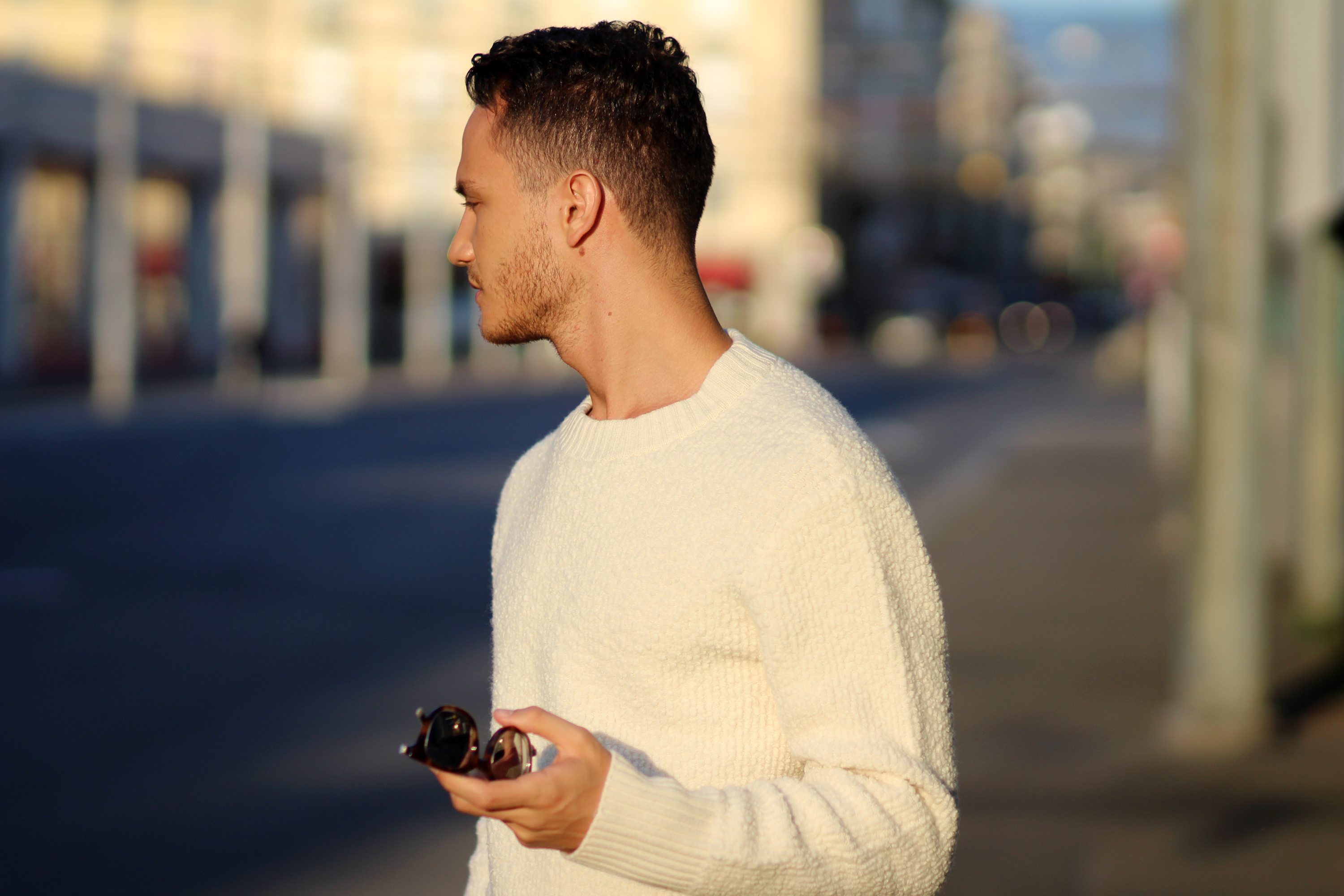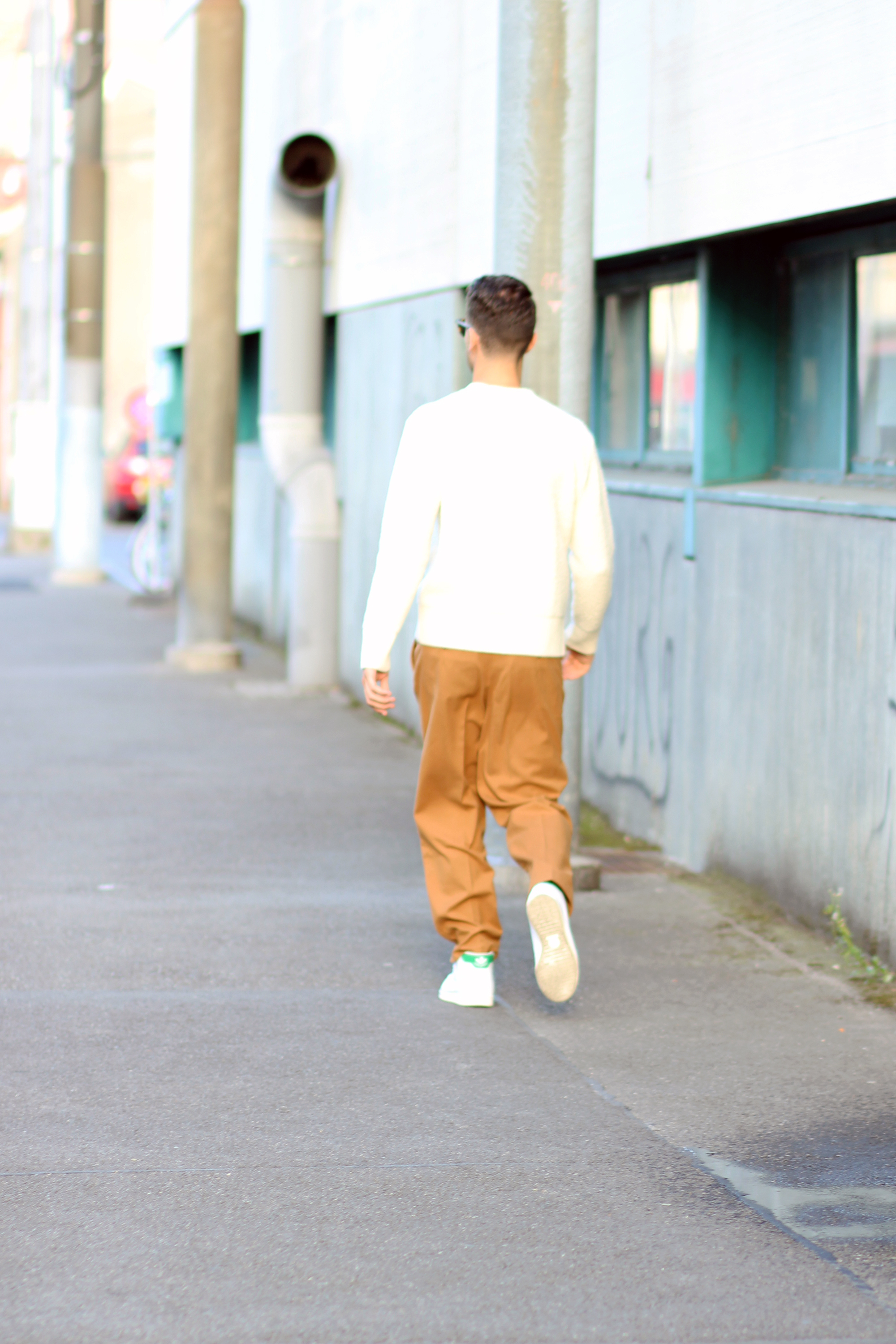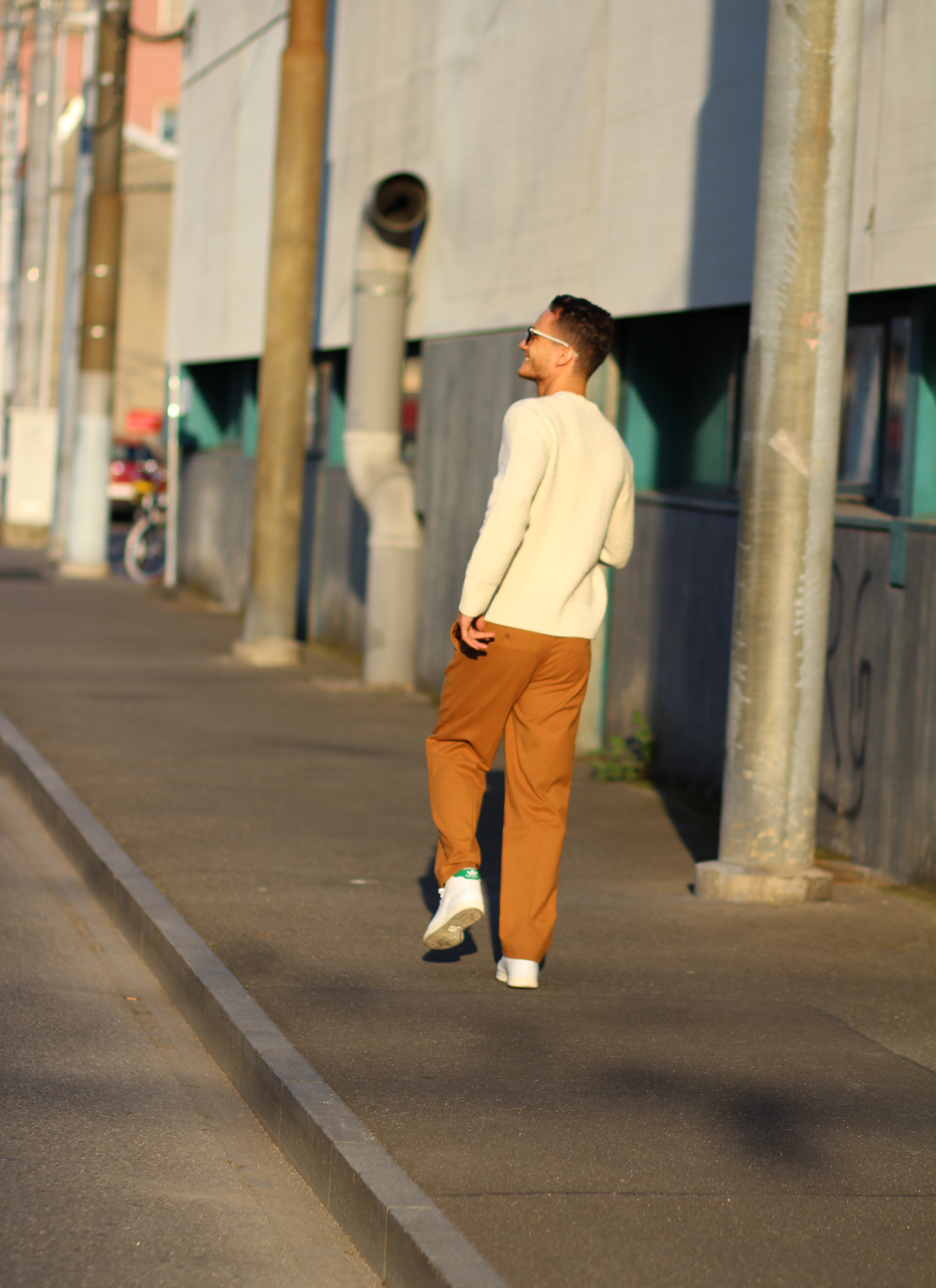 The camel overcoat is very thin, therefore perfectly complements the thickness of the sweater. Light and warm at the same time, the comfort that comes with wearing baggy trousers once again freed my movements while shooting.
