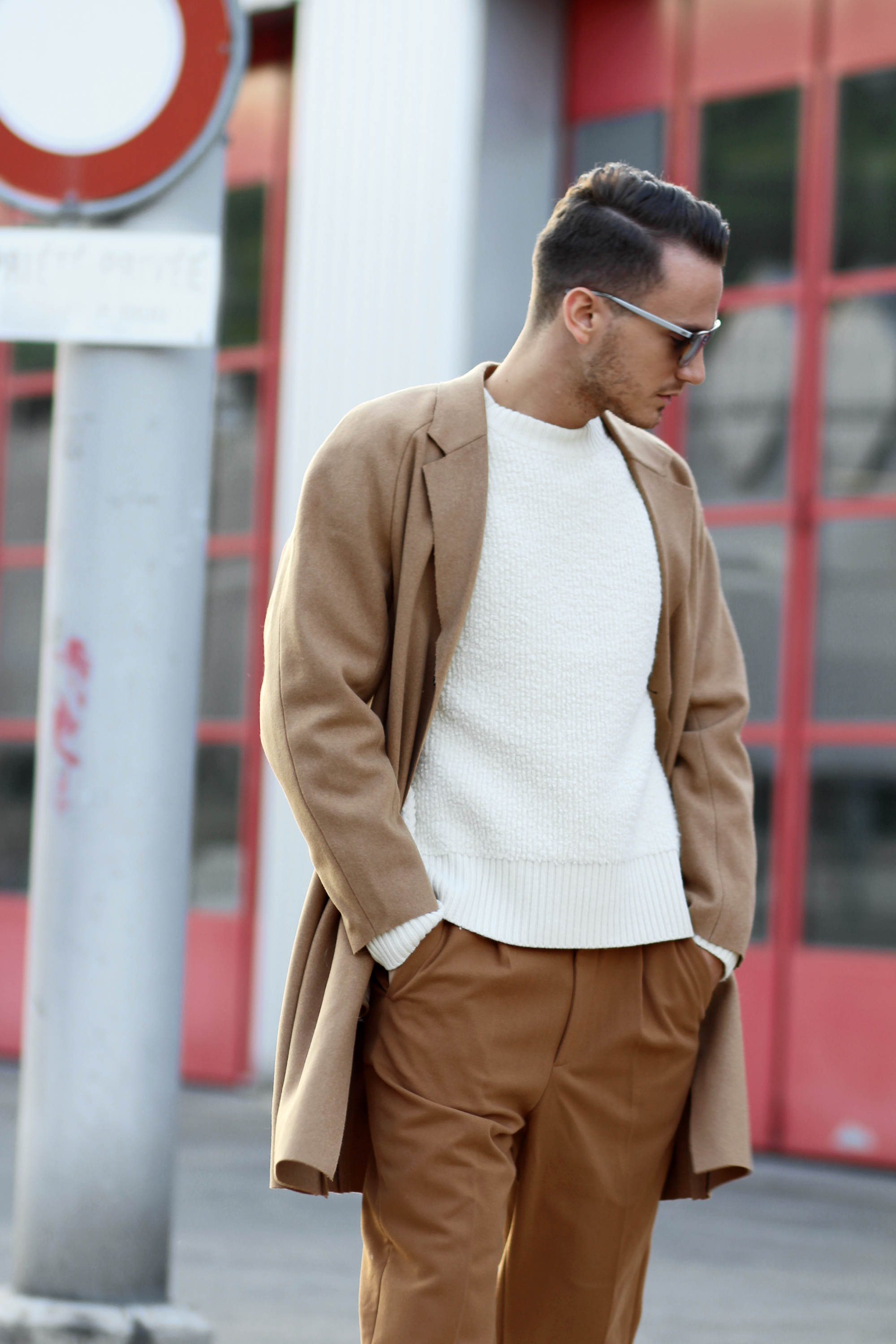As mentioned in the first part of this editorial, the new H&M collection is all about loose silhouettes, with long overcoats and modernized baggy pants, wide but still adjusted at the ankles. I am all about monochromatic looks and for this new look I played with a camel-cream color palette.